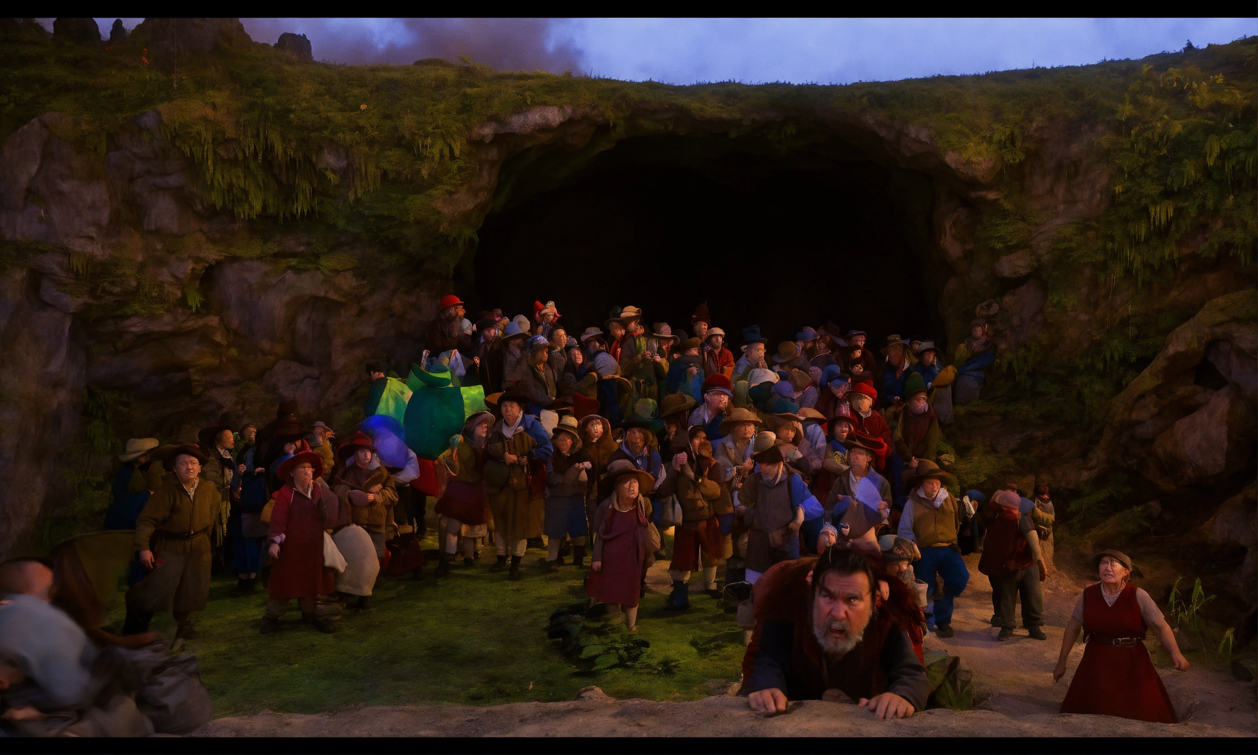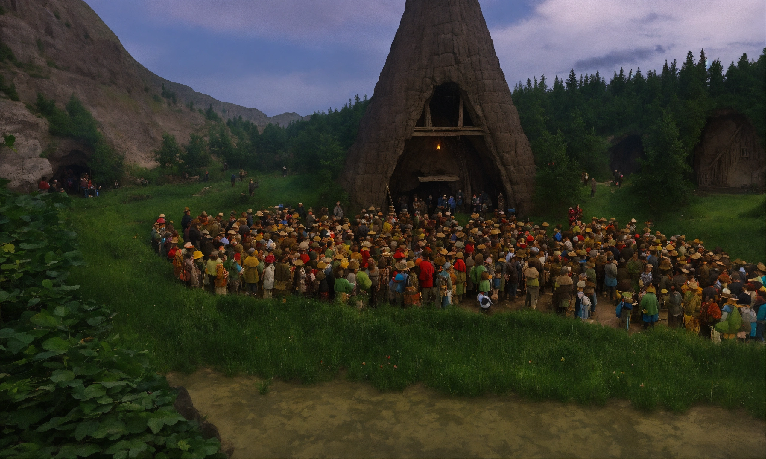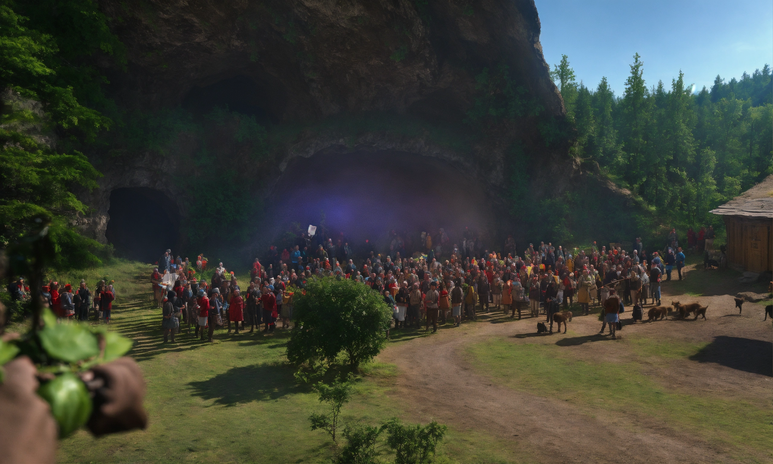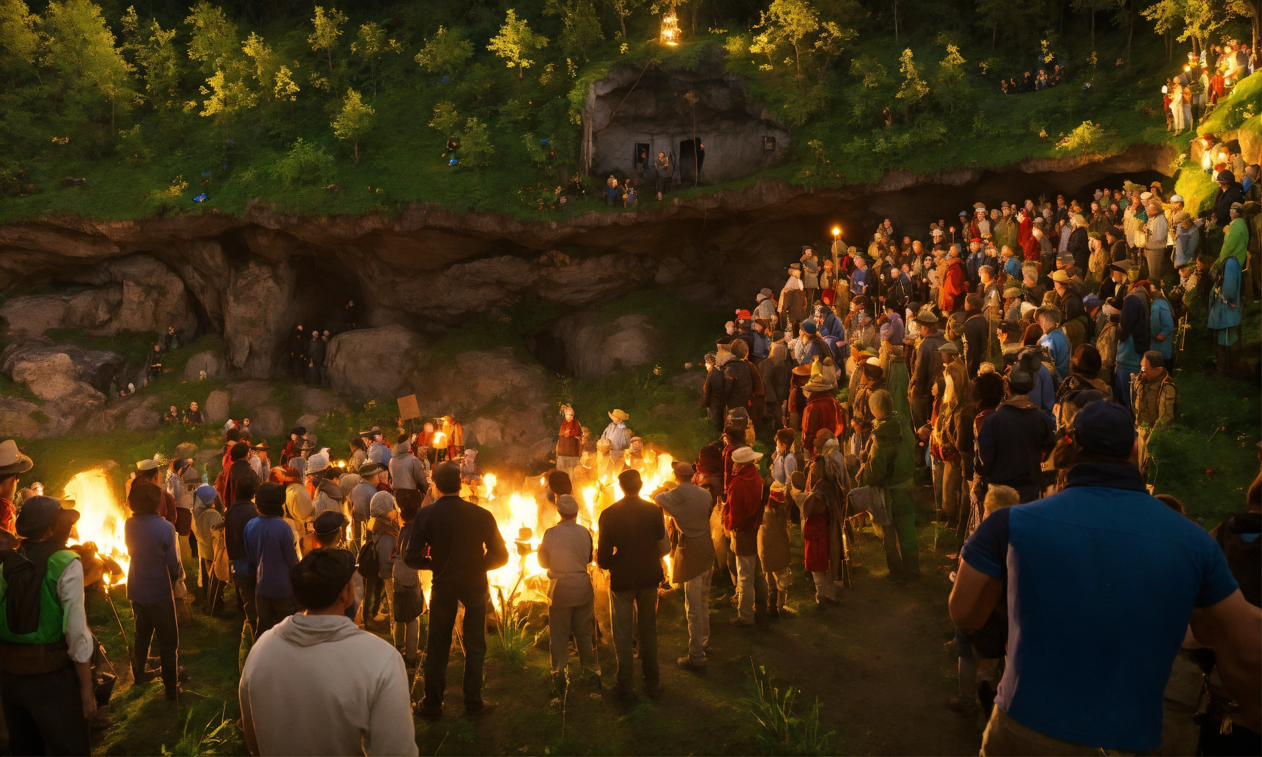 An angry crowd of canadian villagers gathered outside of a cave in the woods