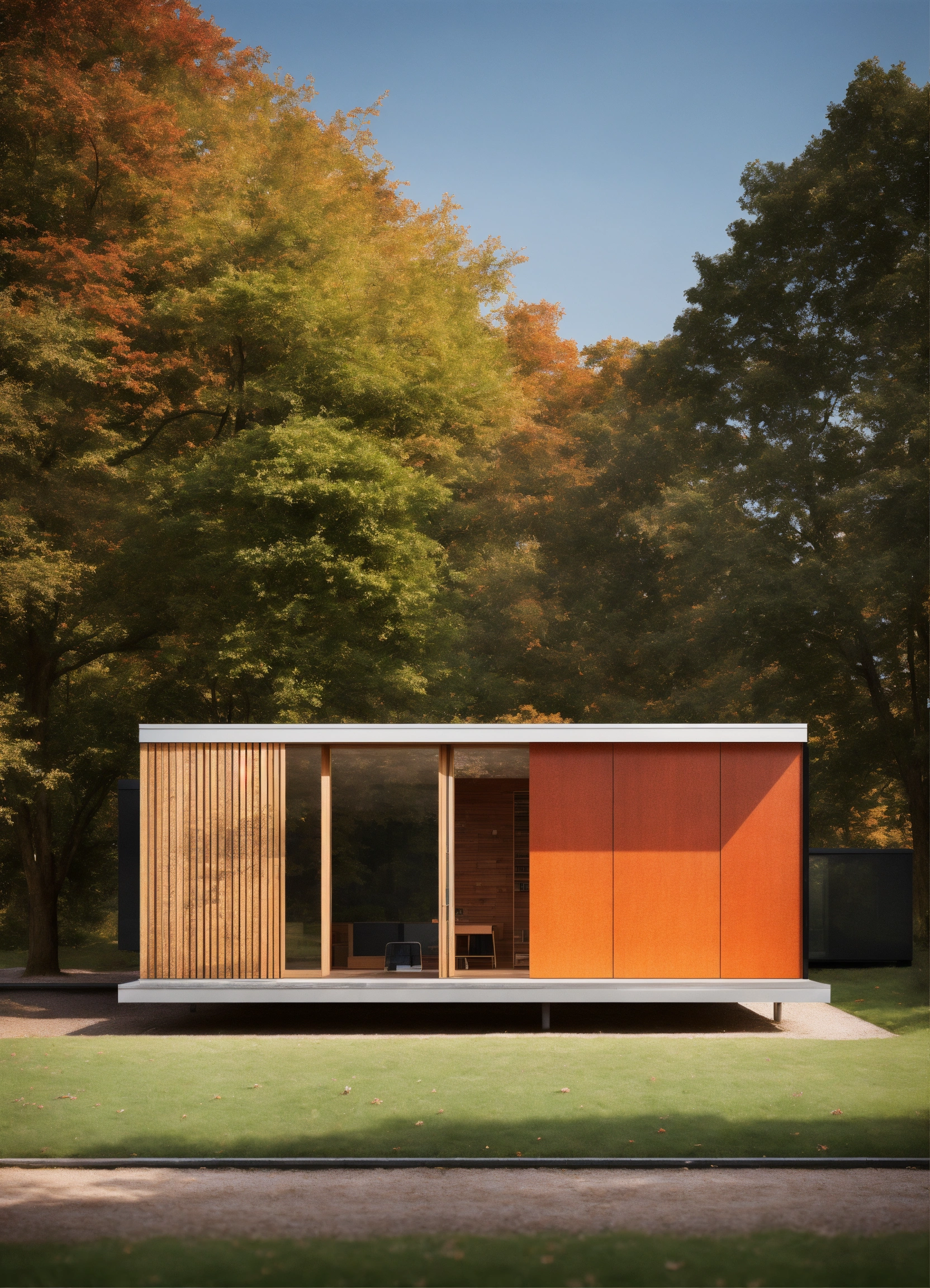 Mies van der rohe minimalist colorful plastic and wood house photorealistic from the front