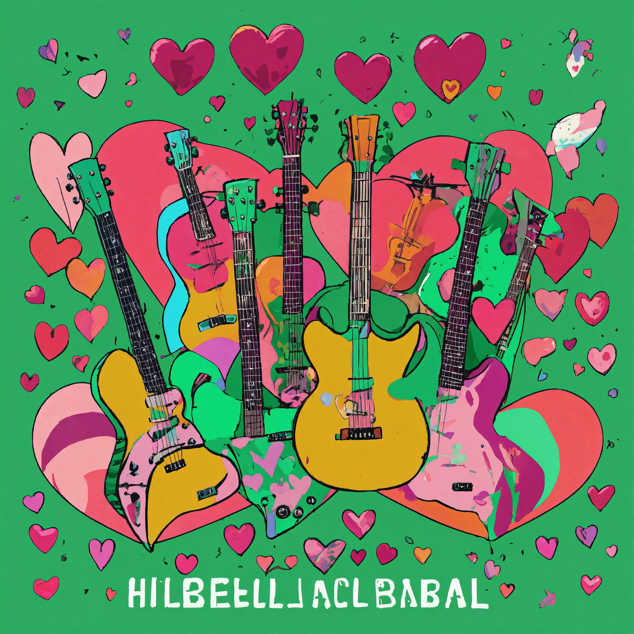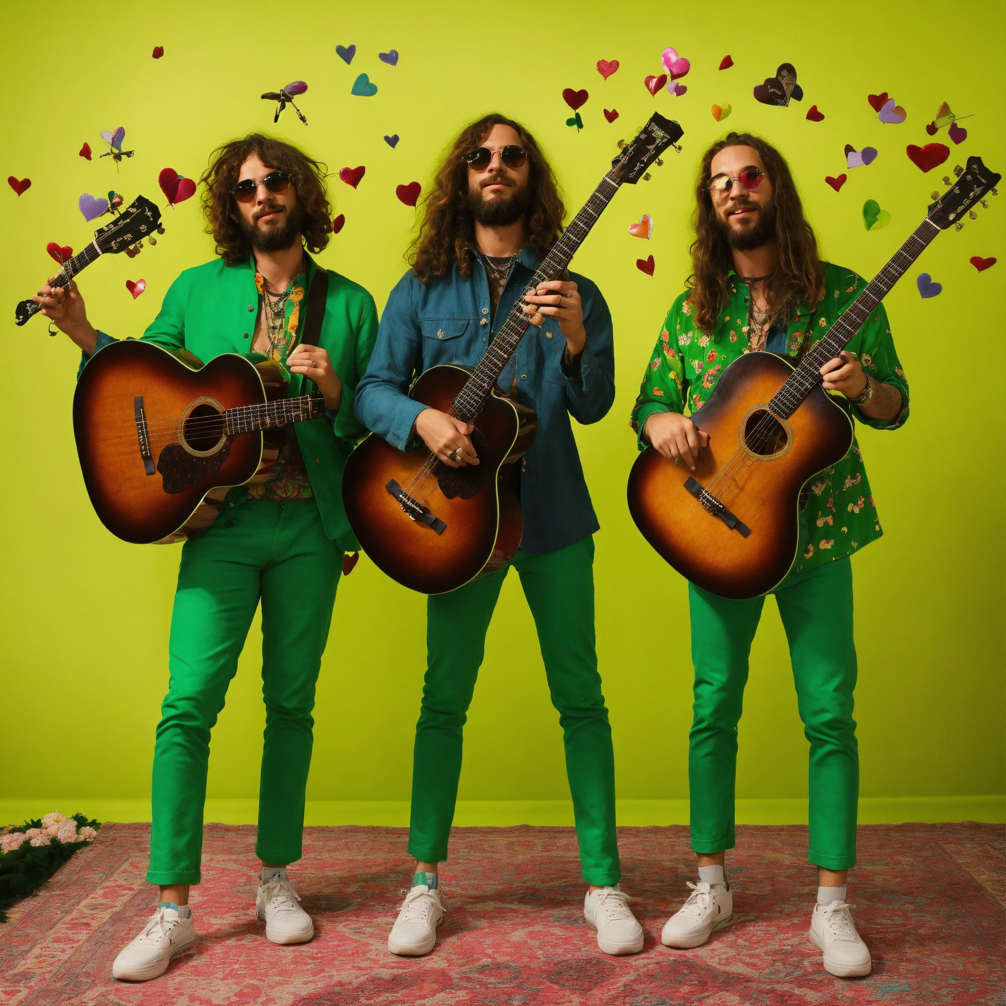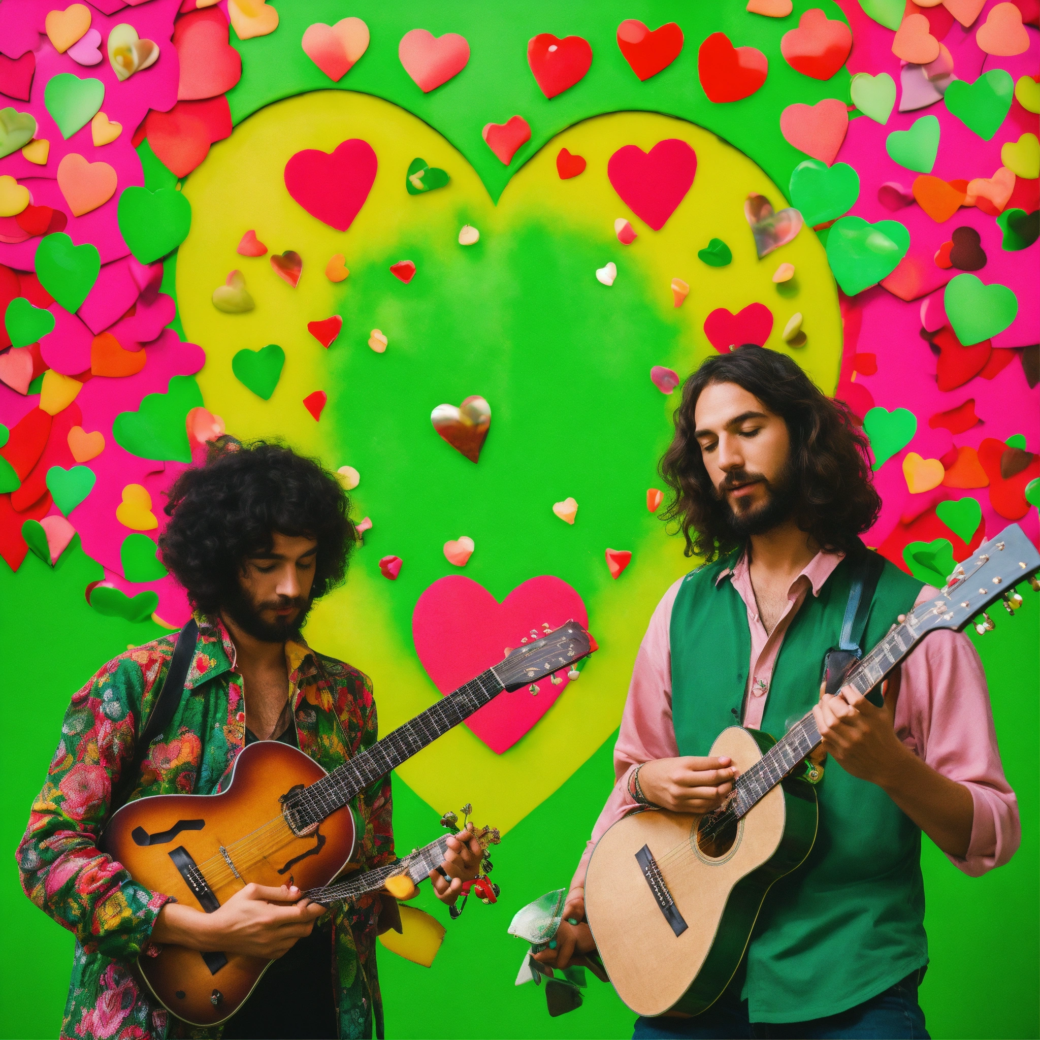 A square instagram post with musicians holding heart shaped guitars having hearts fly out of their heads with the background green colours #468c5c, #f5c24f and #f2e5ba 70s psycadellic hippy