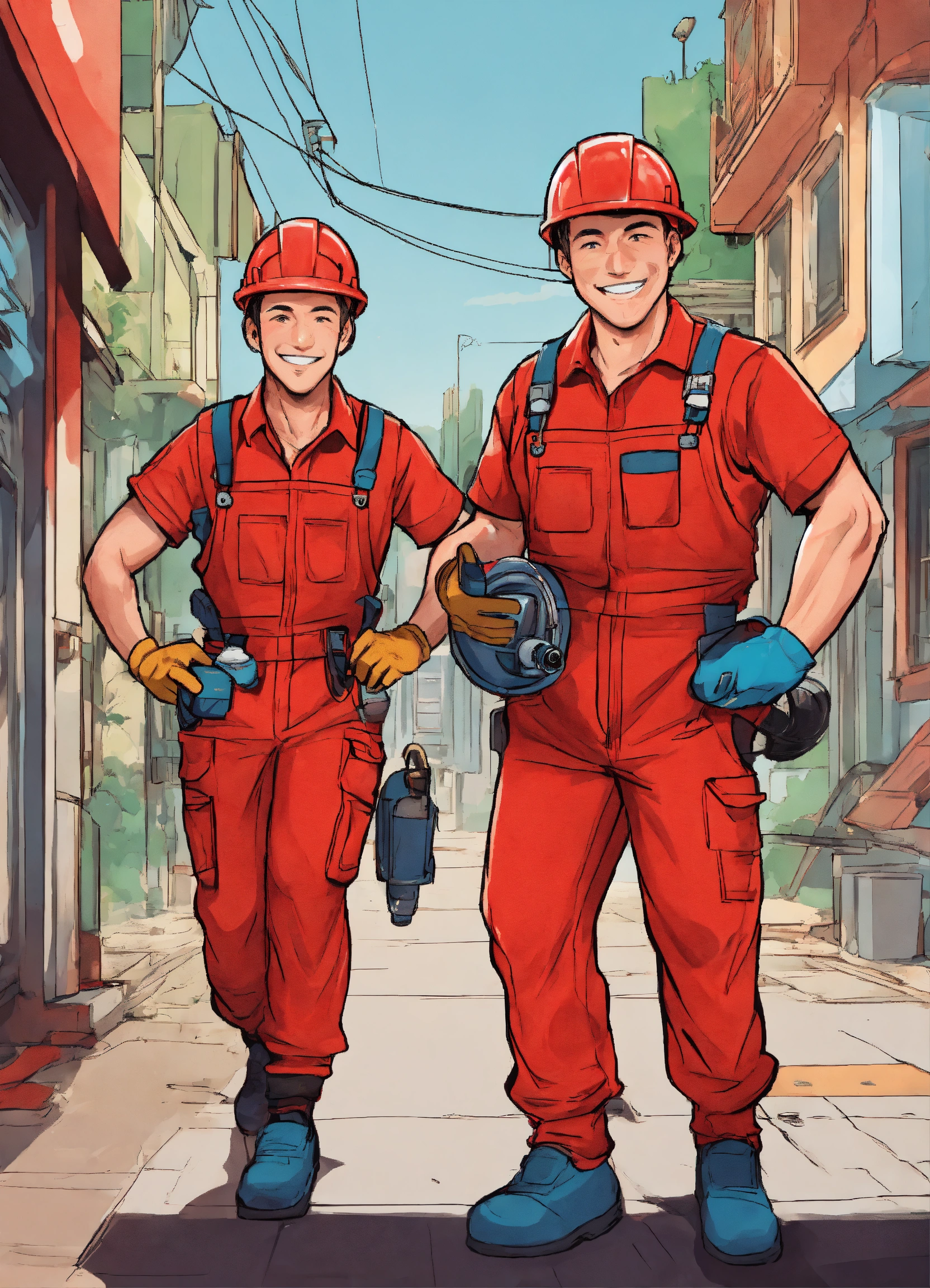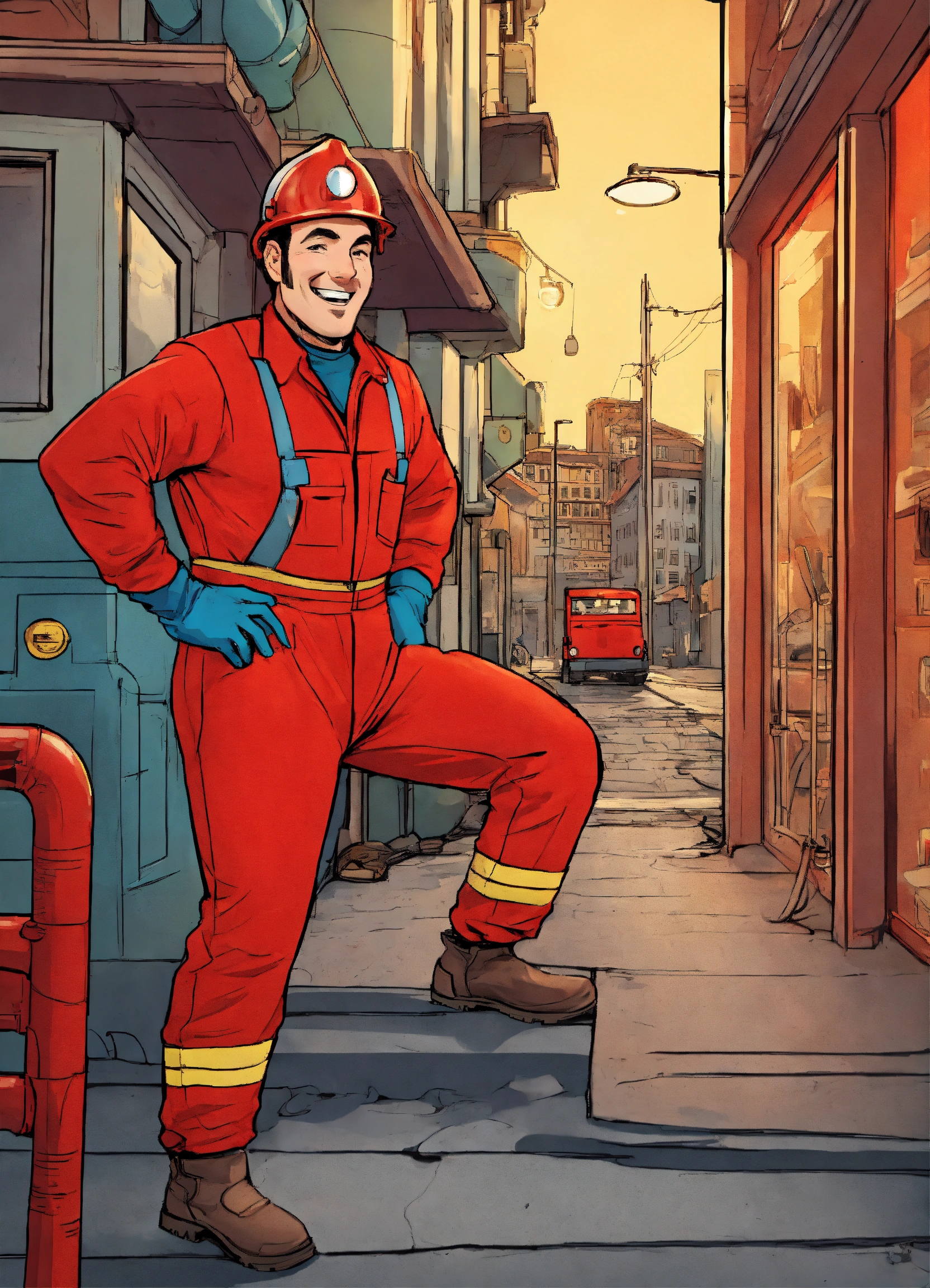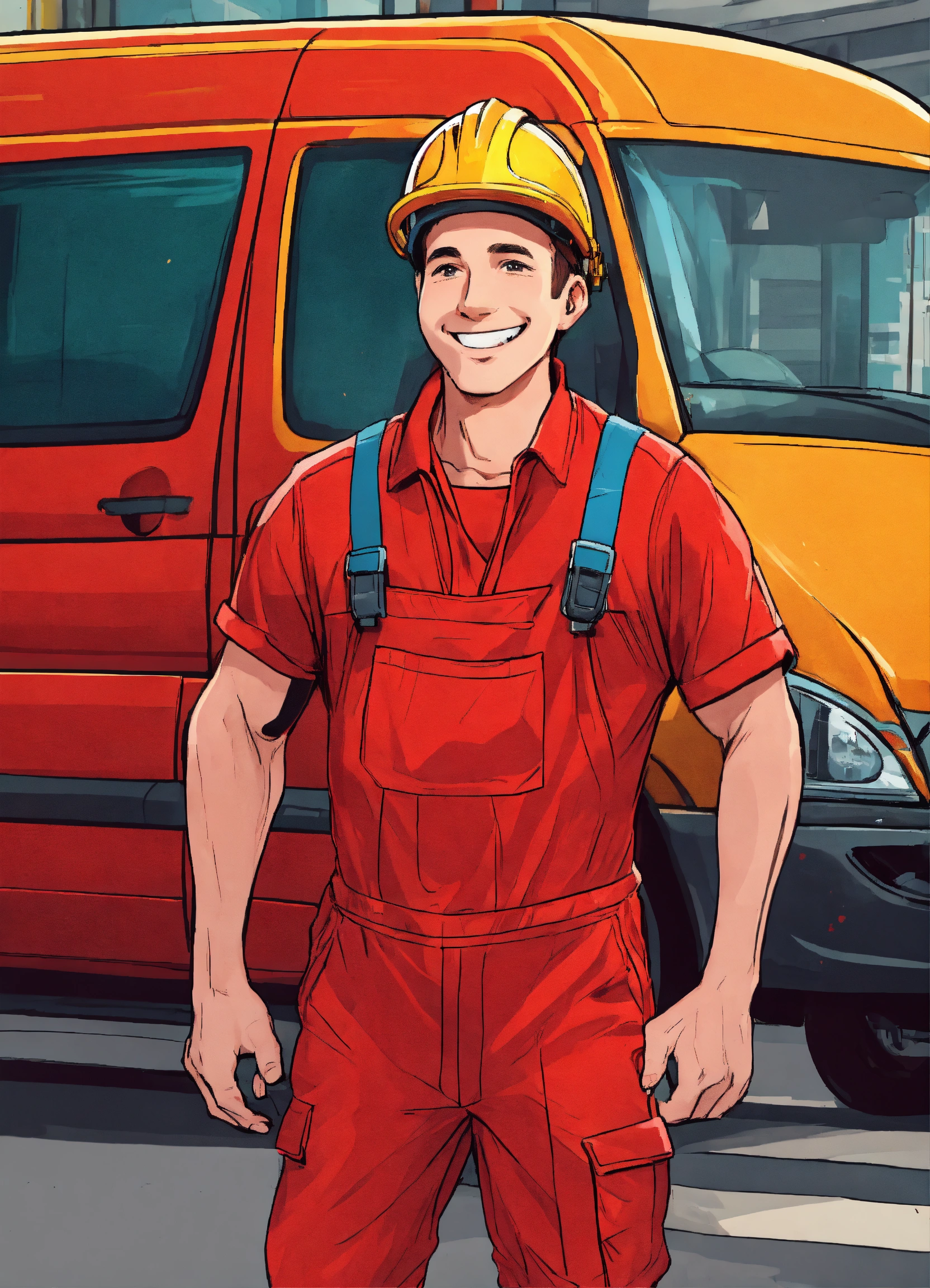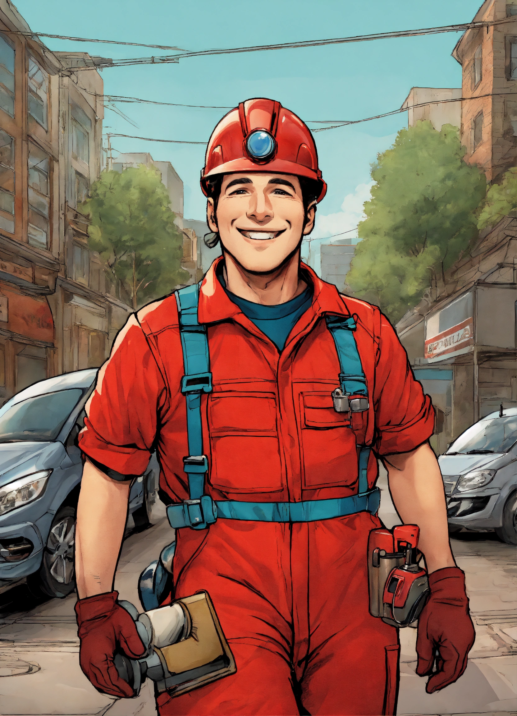 A plumber in a red overall outfit and a red hard helm is smiling and very happy at the street with a sprinter behind him, comic style
