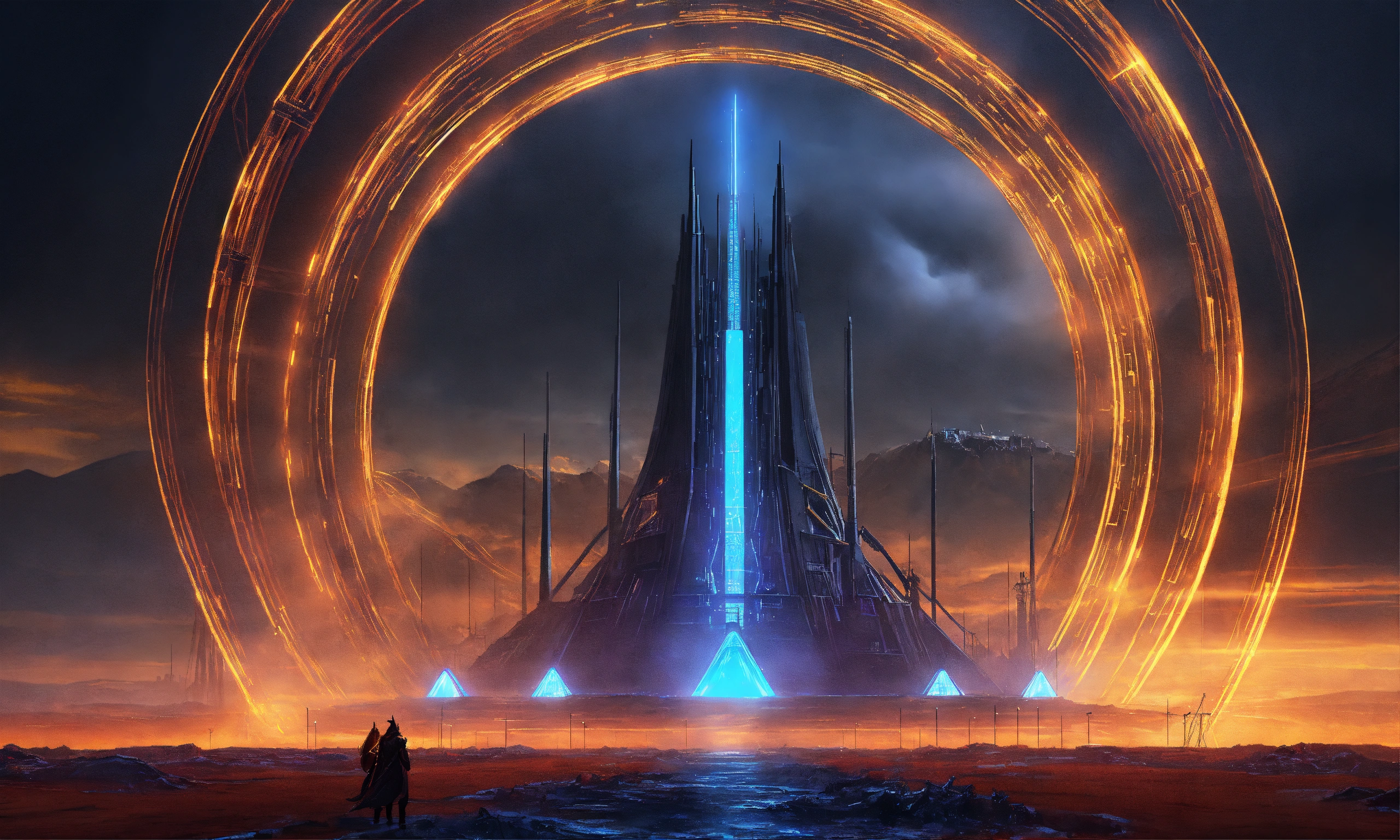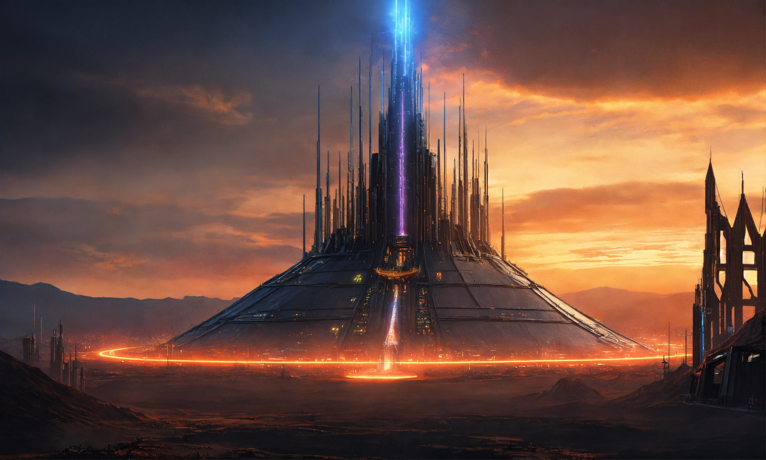 Dark alien tower of sauron seen from a distance is a towering fortress with digital circuit lines going up the structure with energy field blasting through the top to create a dome force field, digital hologram, tron, looks like music equipment with meter bridges, speakers, and transmission towers sound wave, in the middle of a wasteland, 8k realistic, pixar, disney, sci-fi