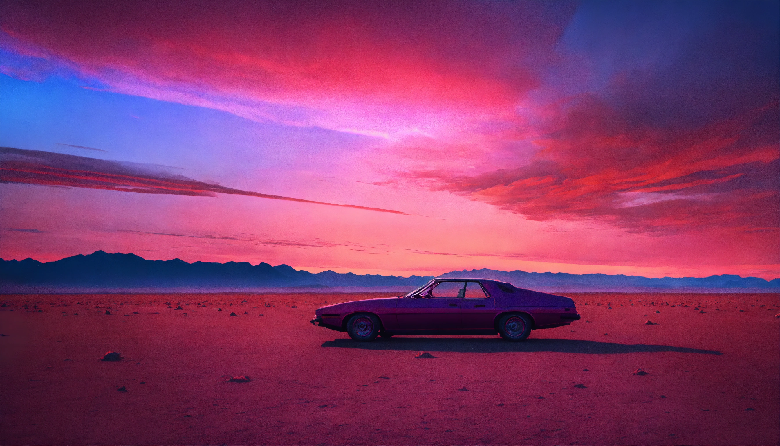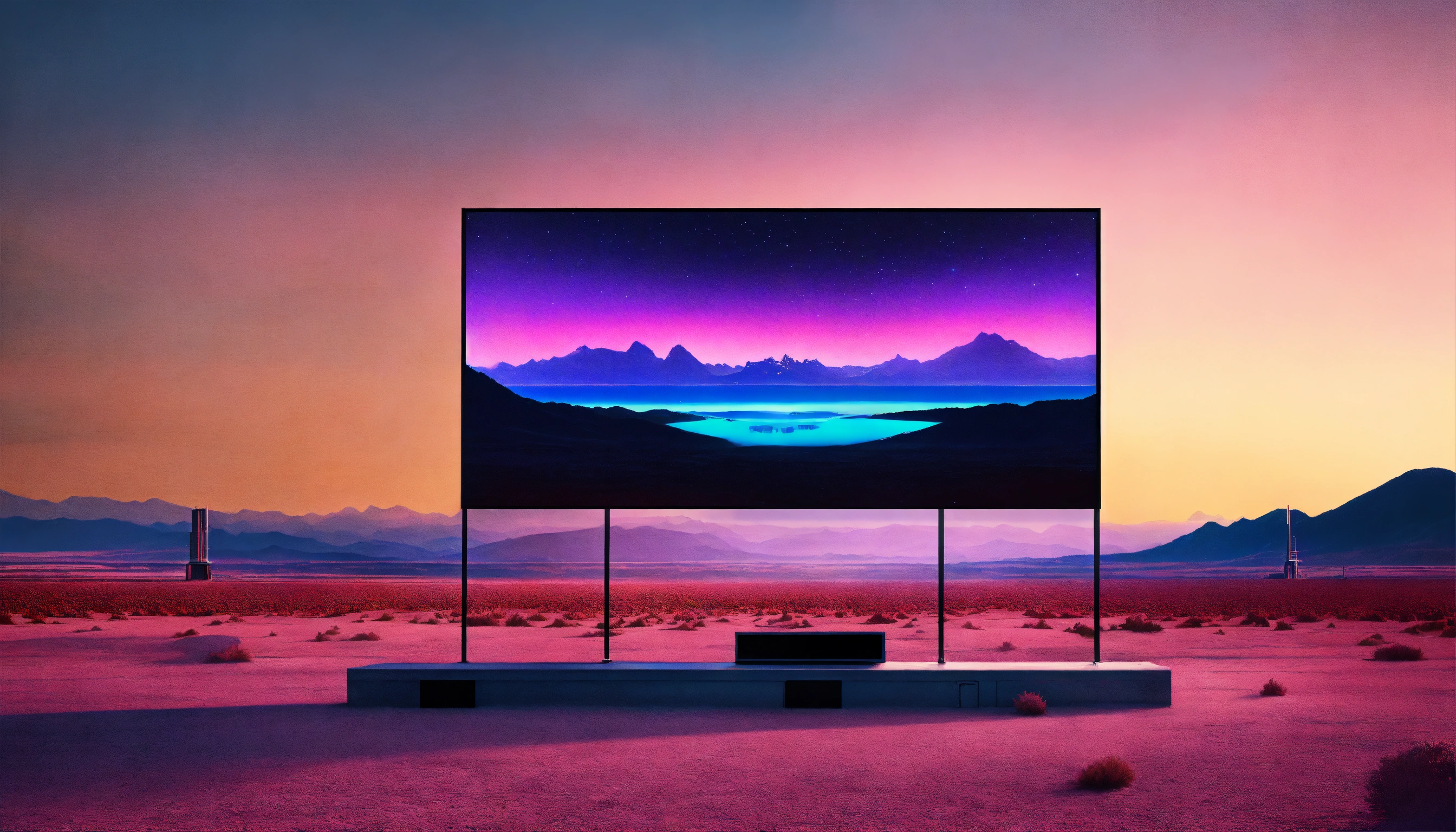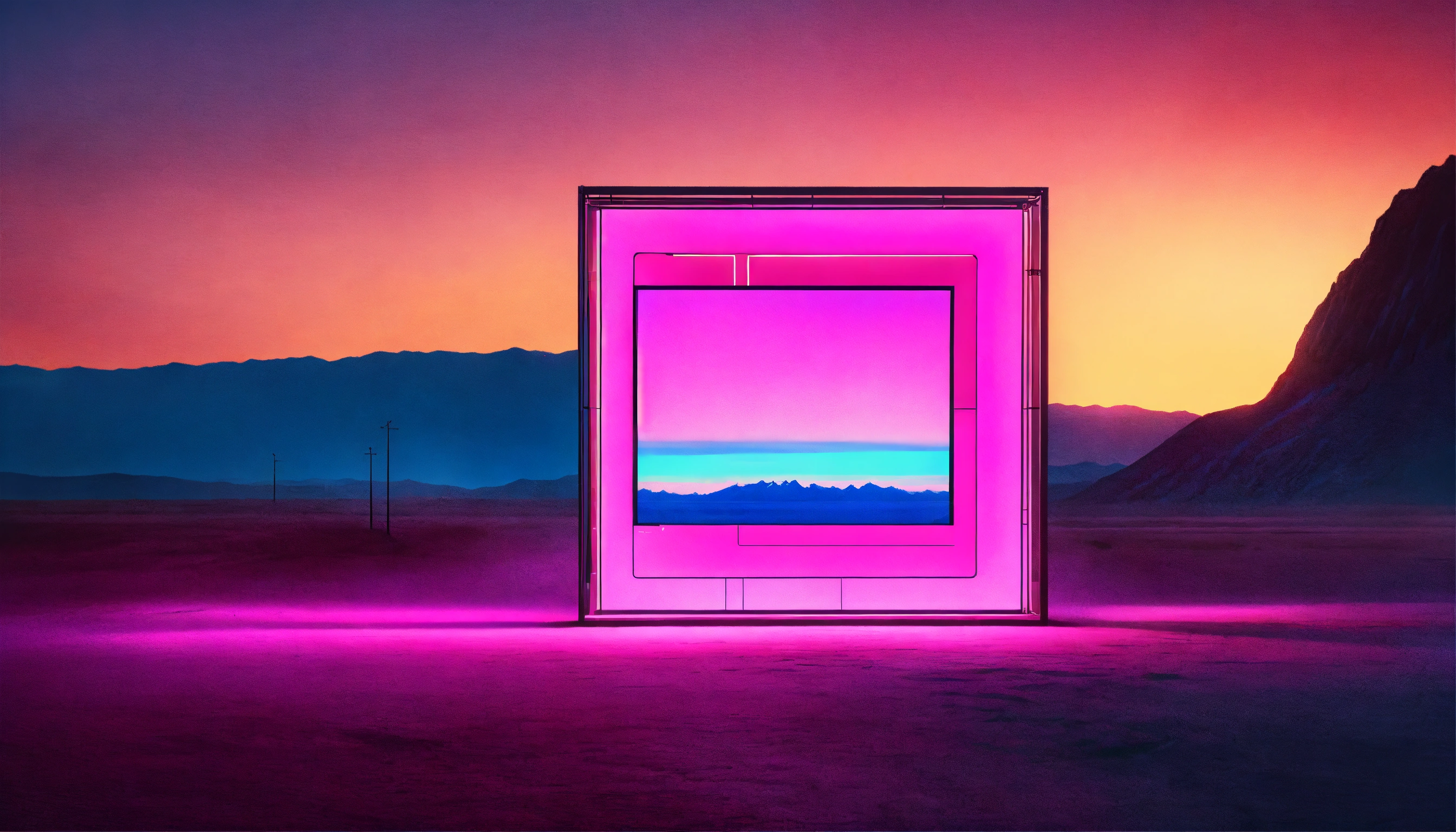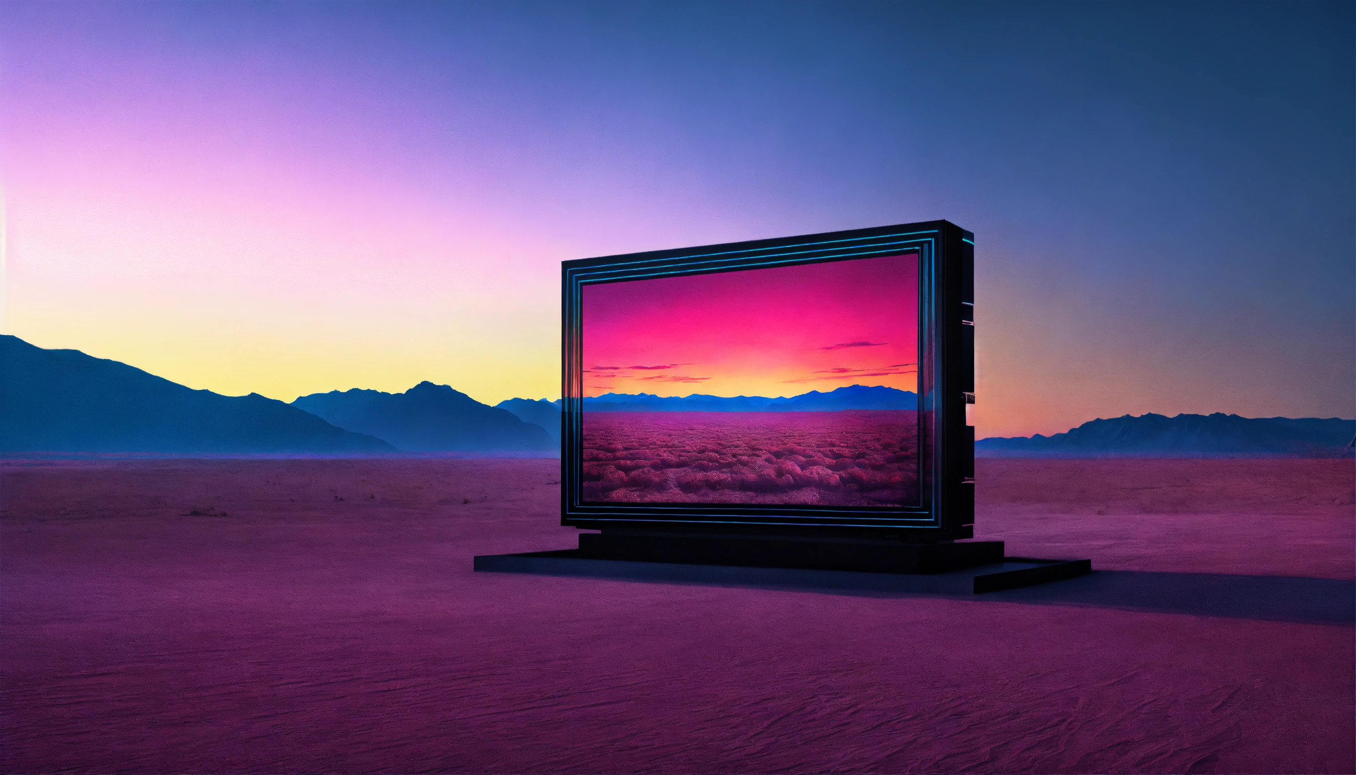 A beautiful, sharp focus, massive square led display in the middle of black rock desert. it is twilight. wide angle. vaporwave ombre rendering. outrun style. by chris moore. by edward hopper. beeple colors. ambient occlusion. digital matte painting. metropolis filmic.