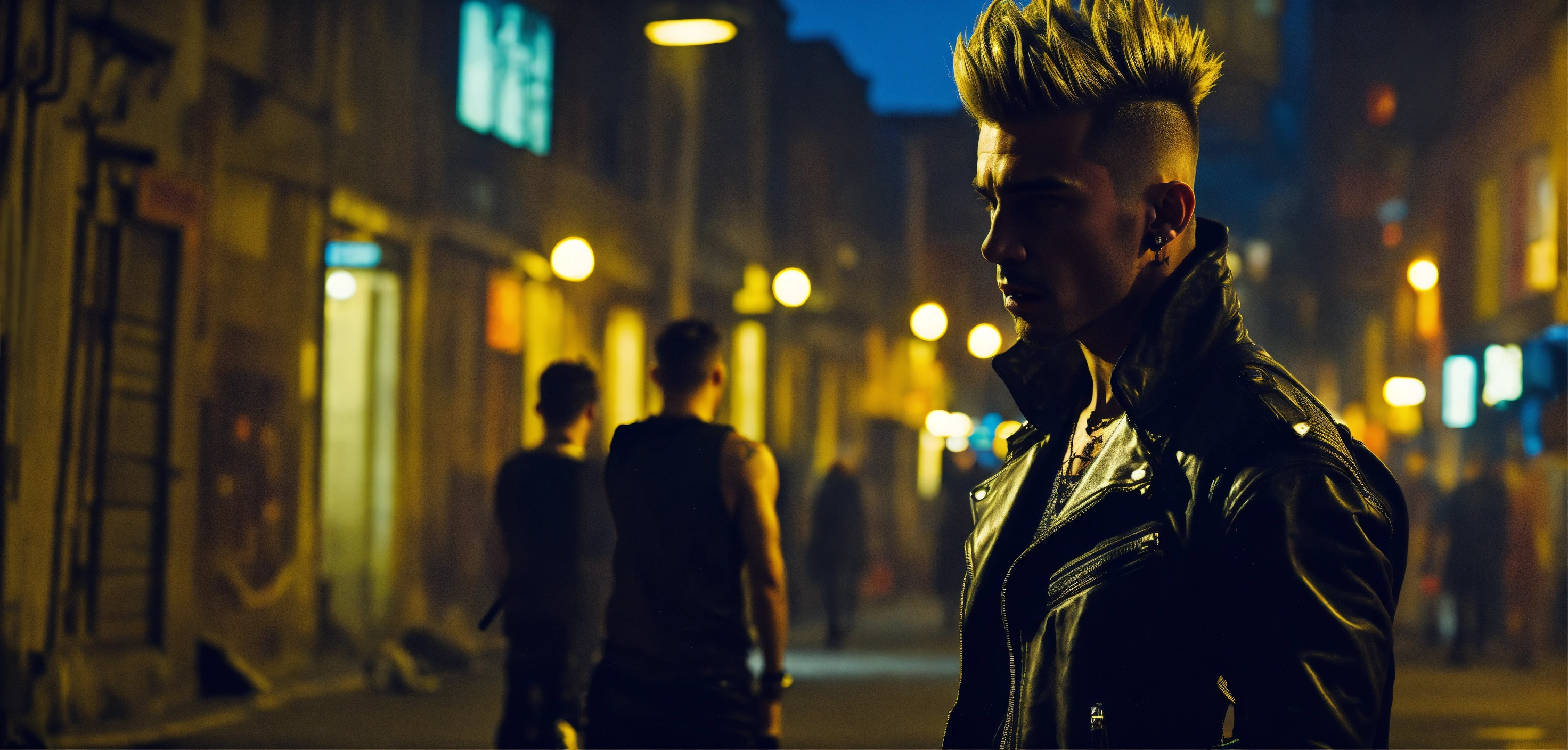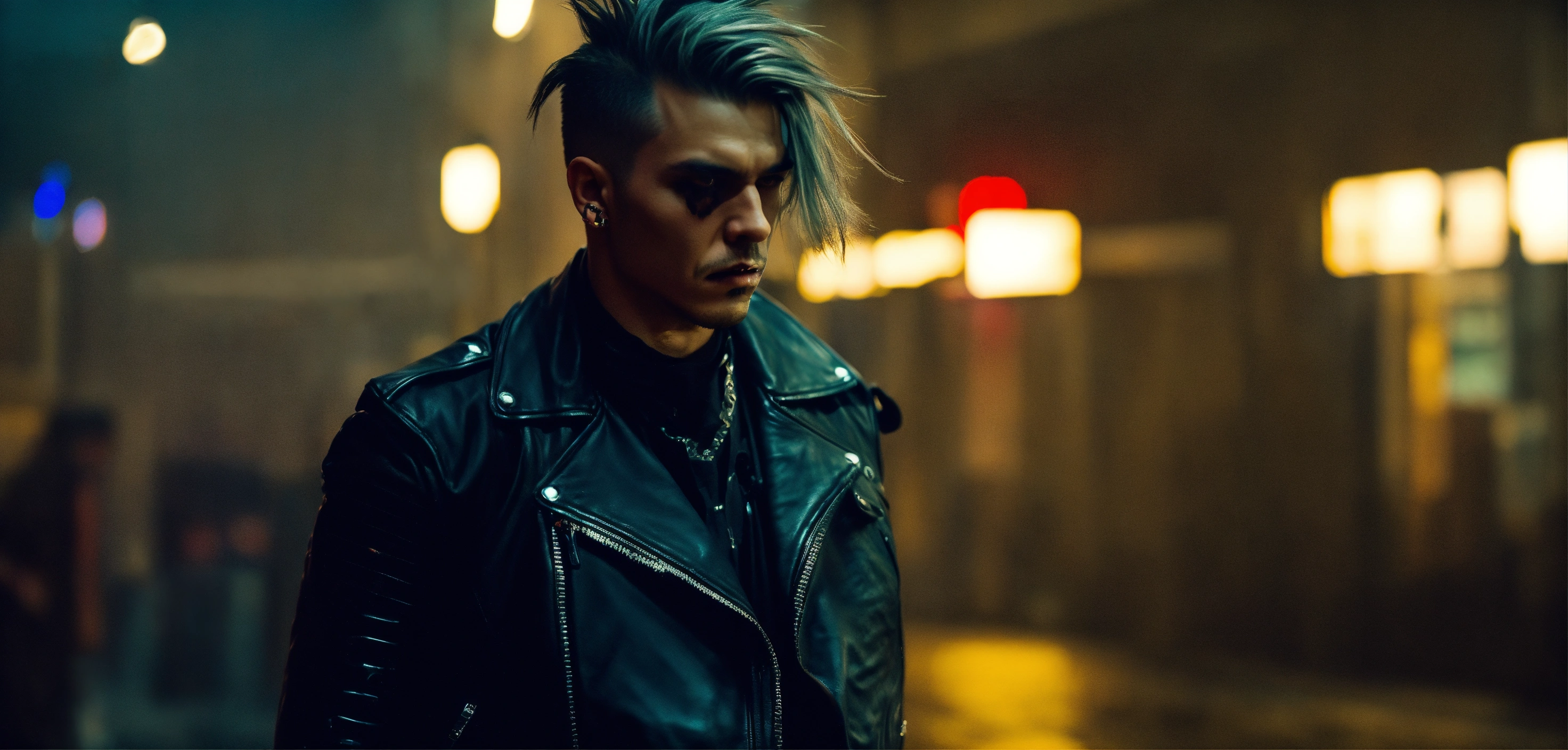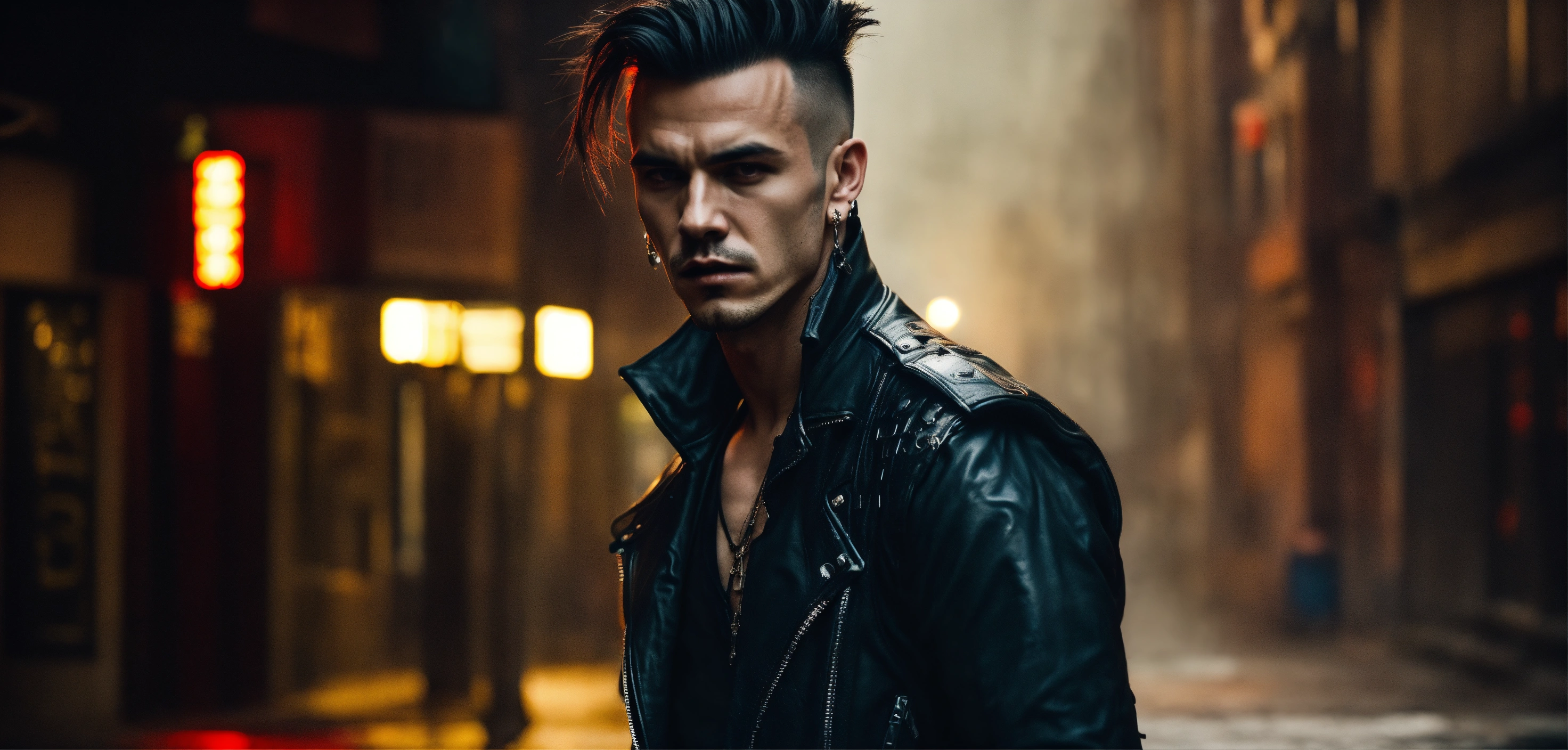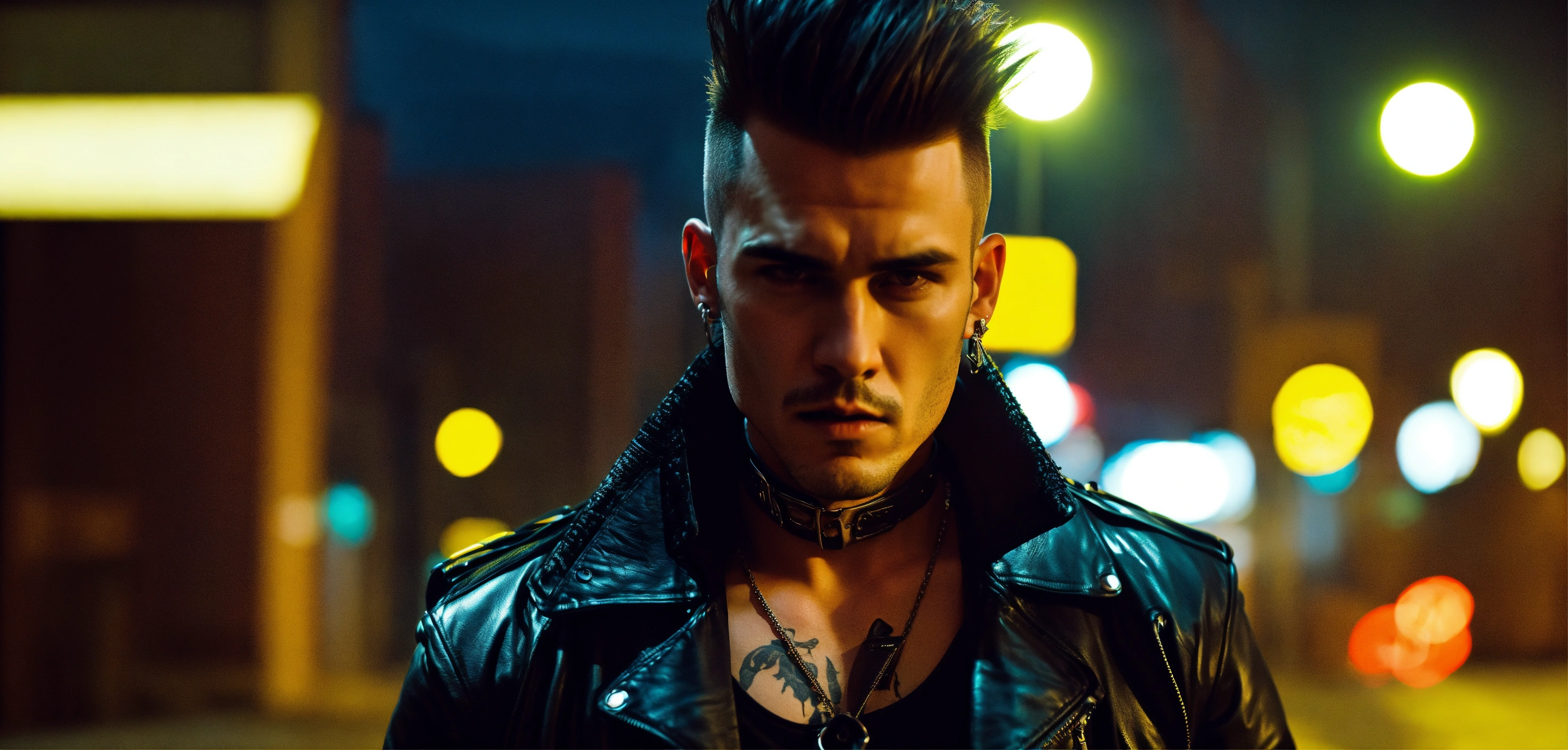 Cinematic look, male punk, leathr biker vest, undercut hairstyle, urban city street by night, haze, underworld vampire movie style