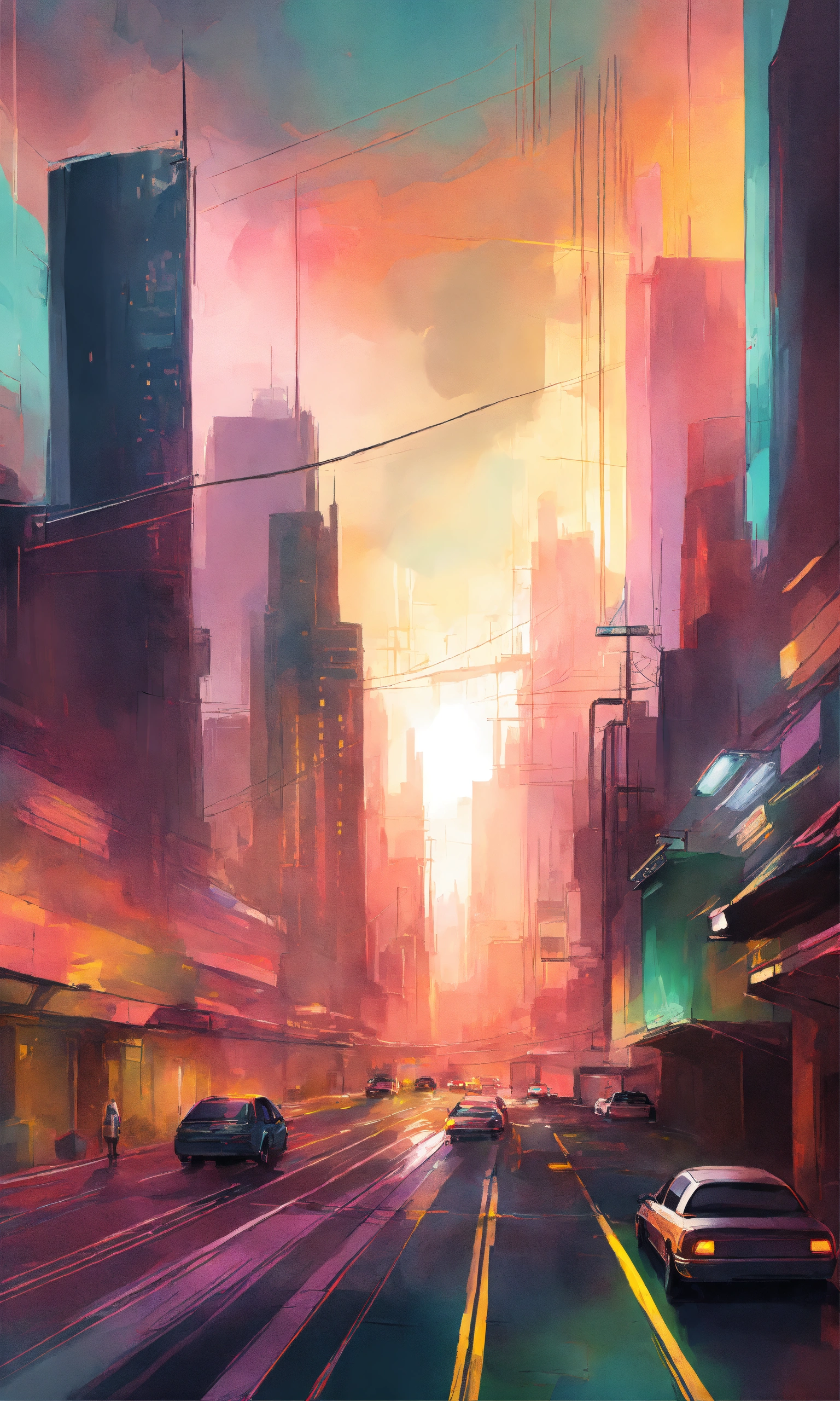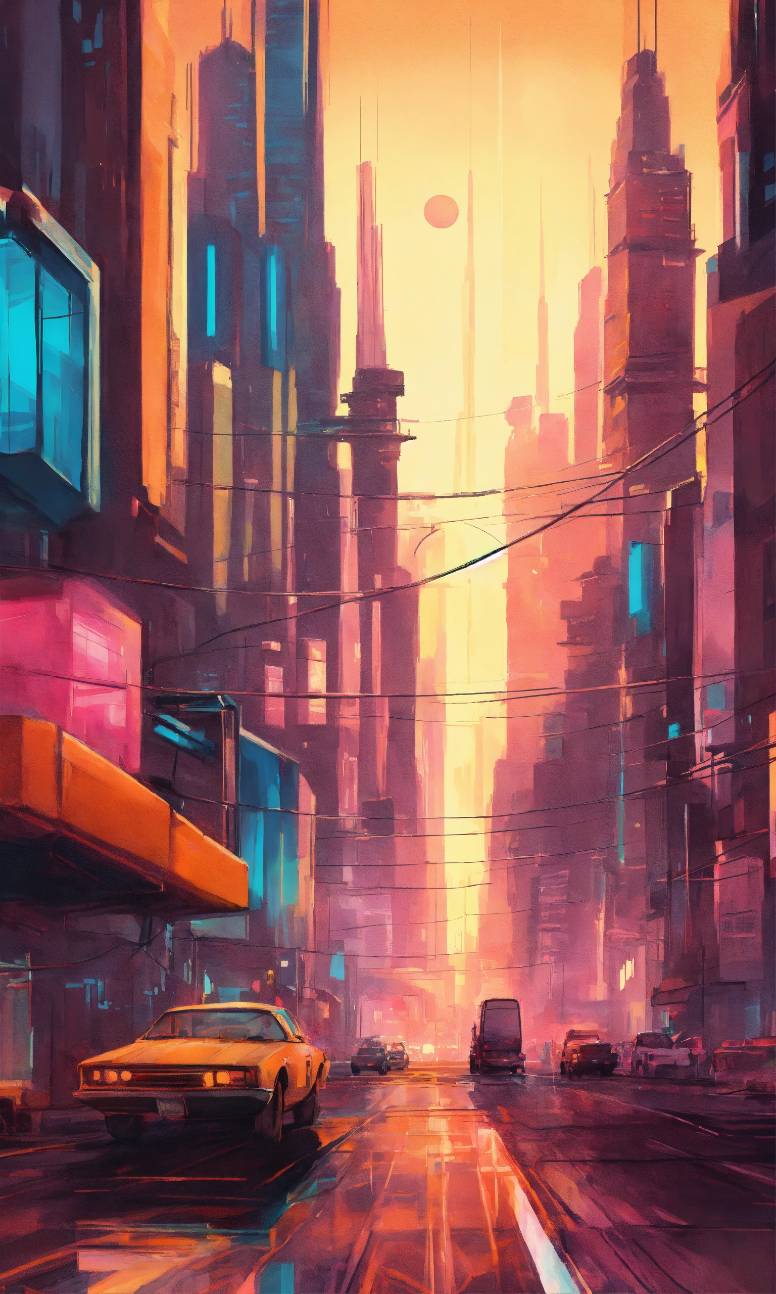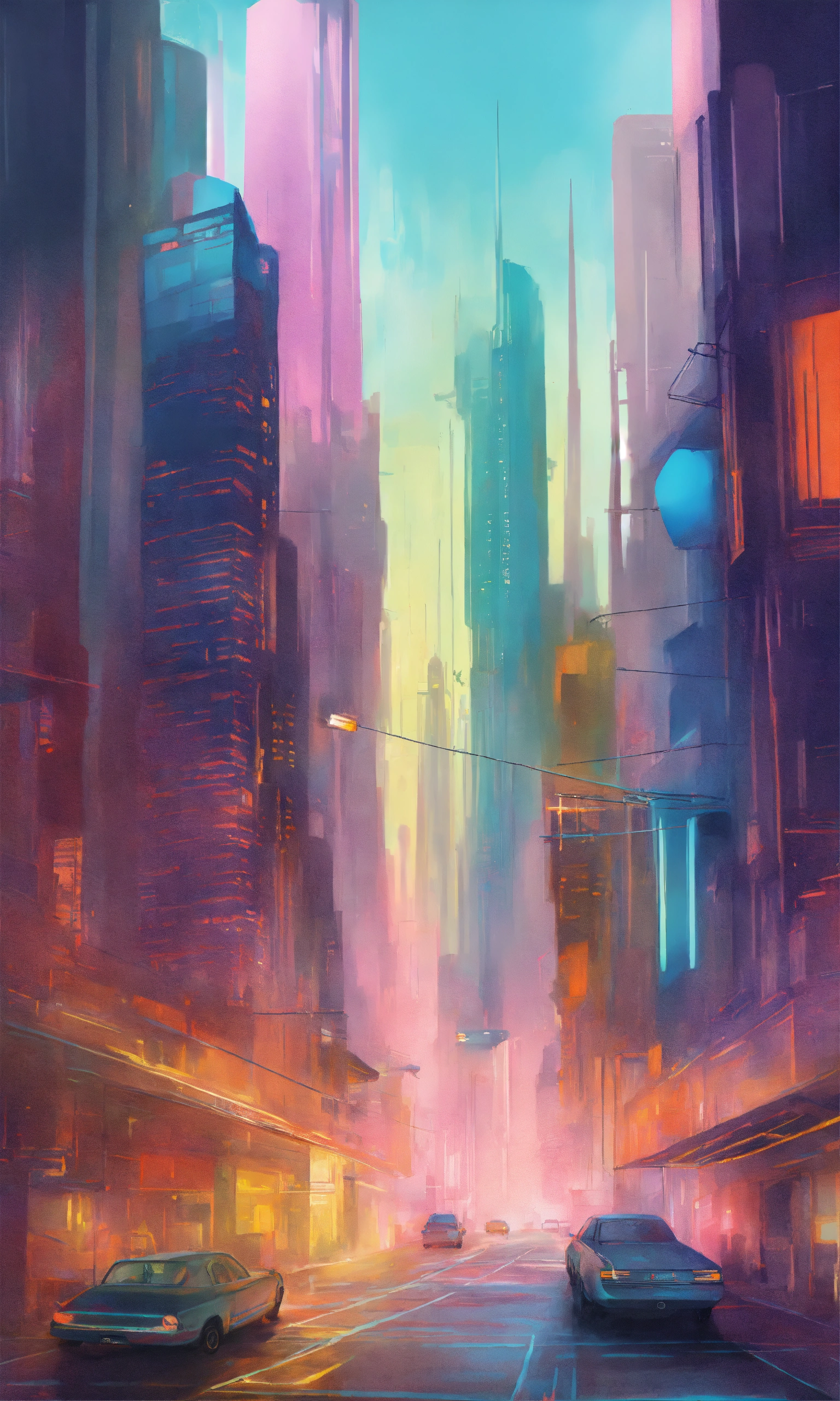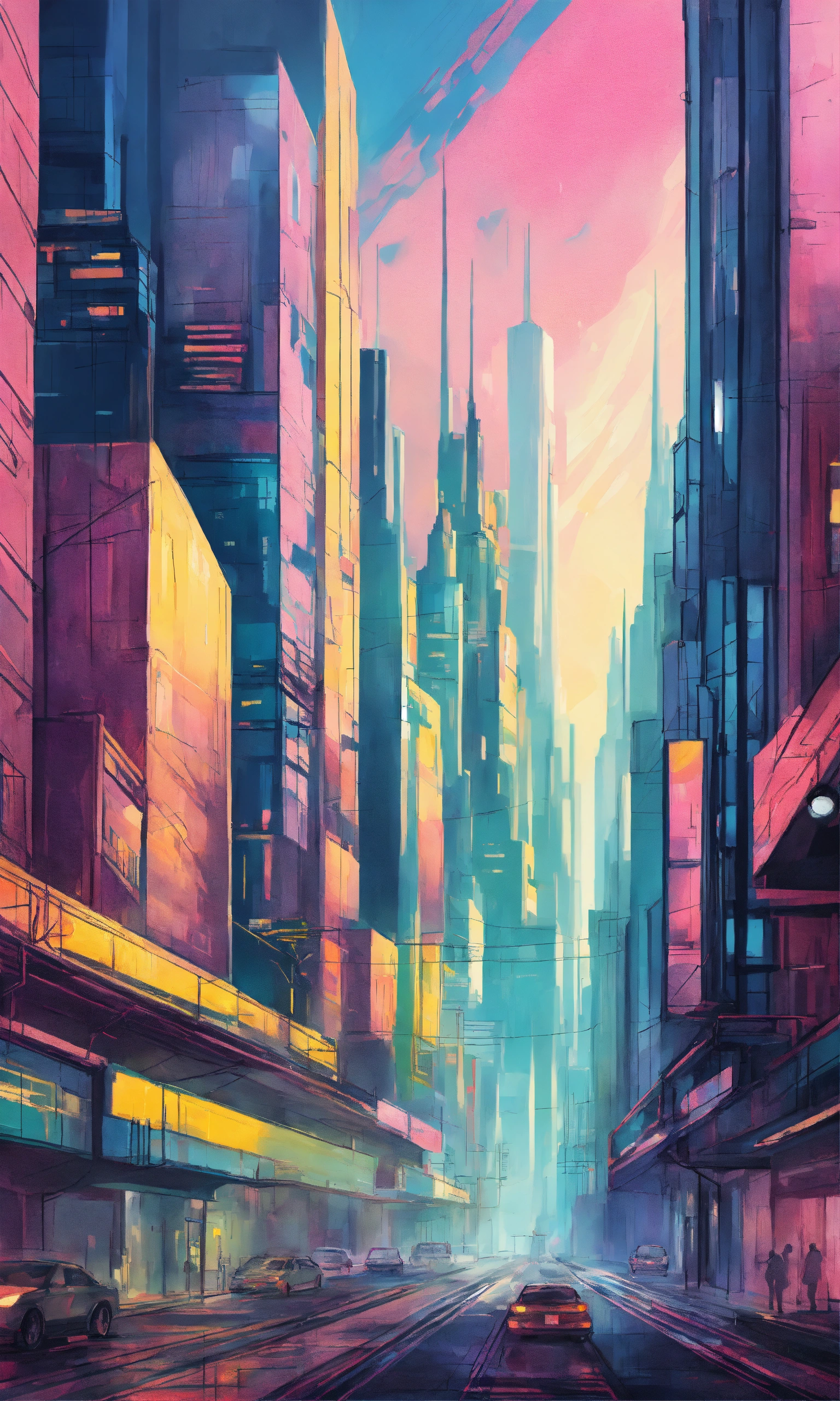Create a vector pencil sketch of the futuristic and dystopian urban cityscape using pastels, inspired by abstract expressionism.