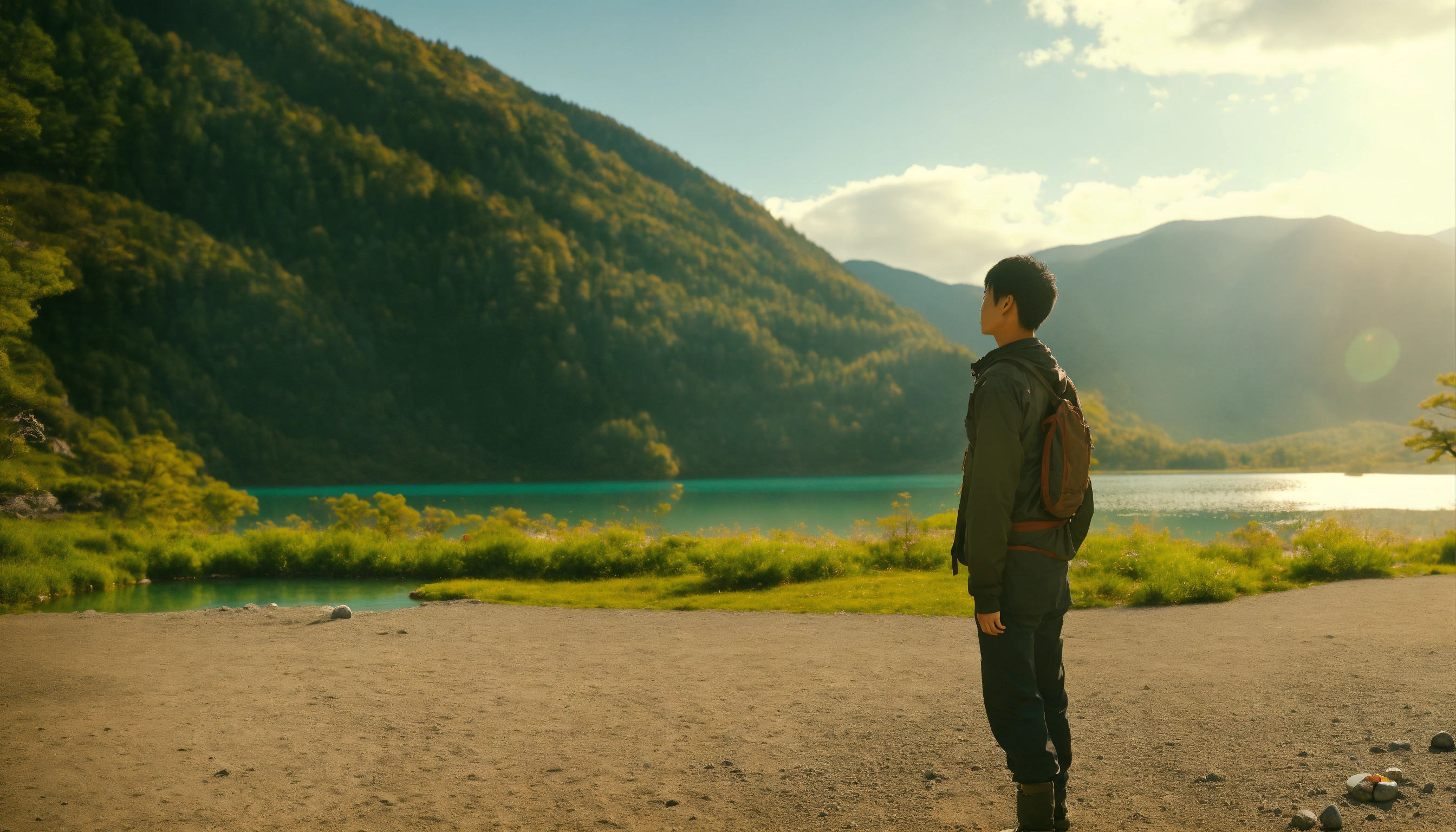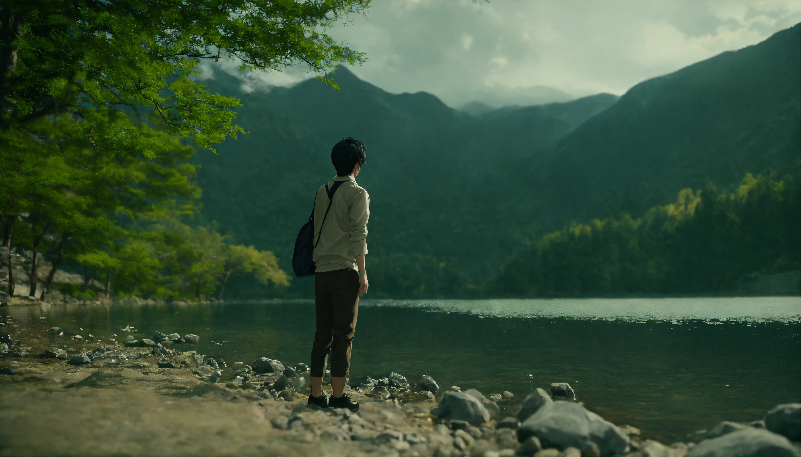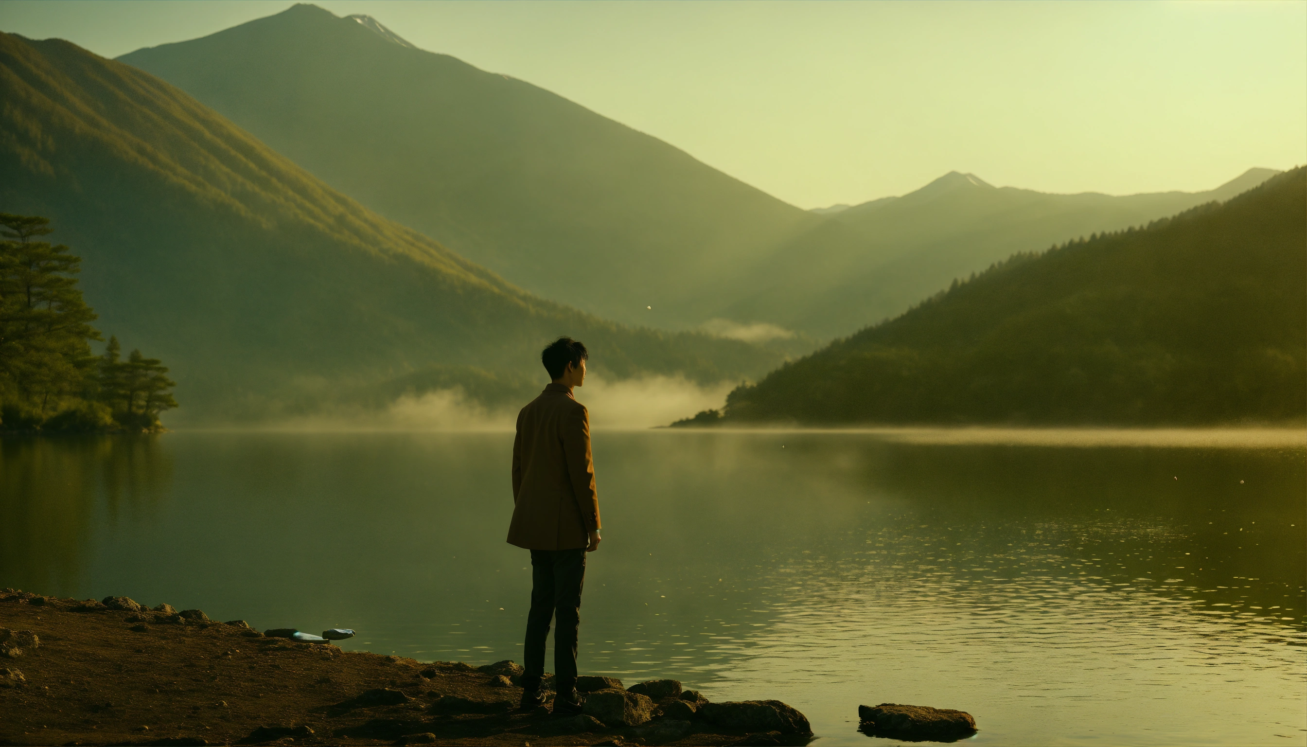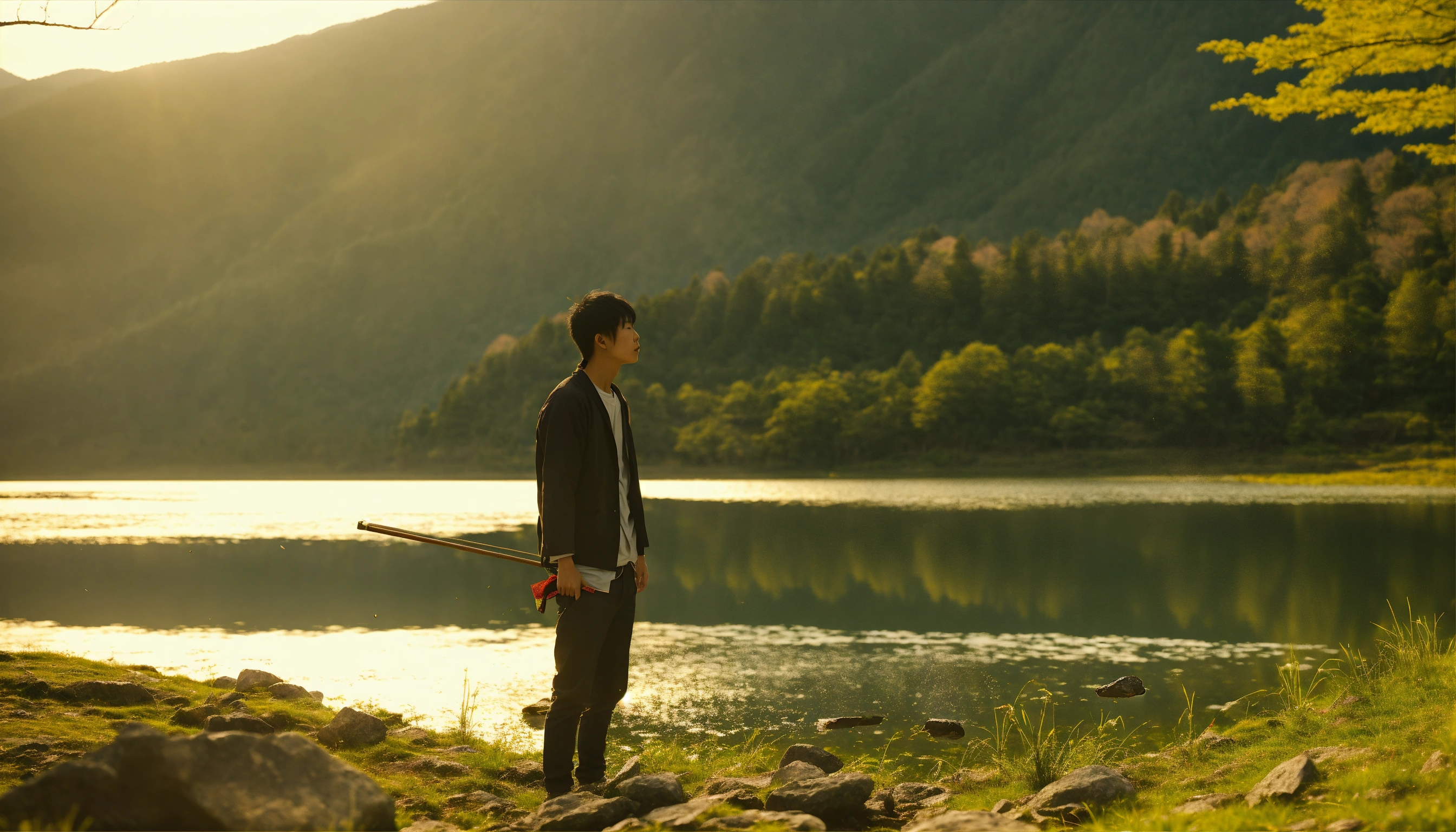 Young japanese man named masaru stands near a beautiful lake in the mountains, and throws a small stone into the lake. high quality, 8k, cinematic.