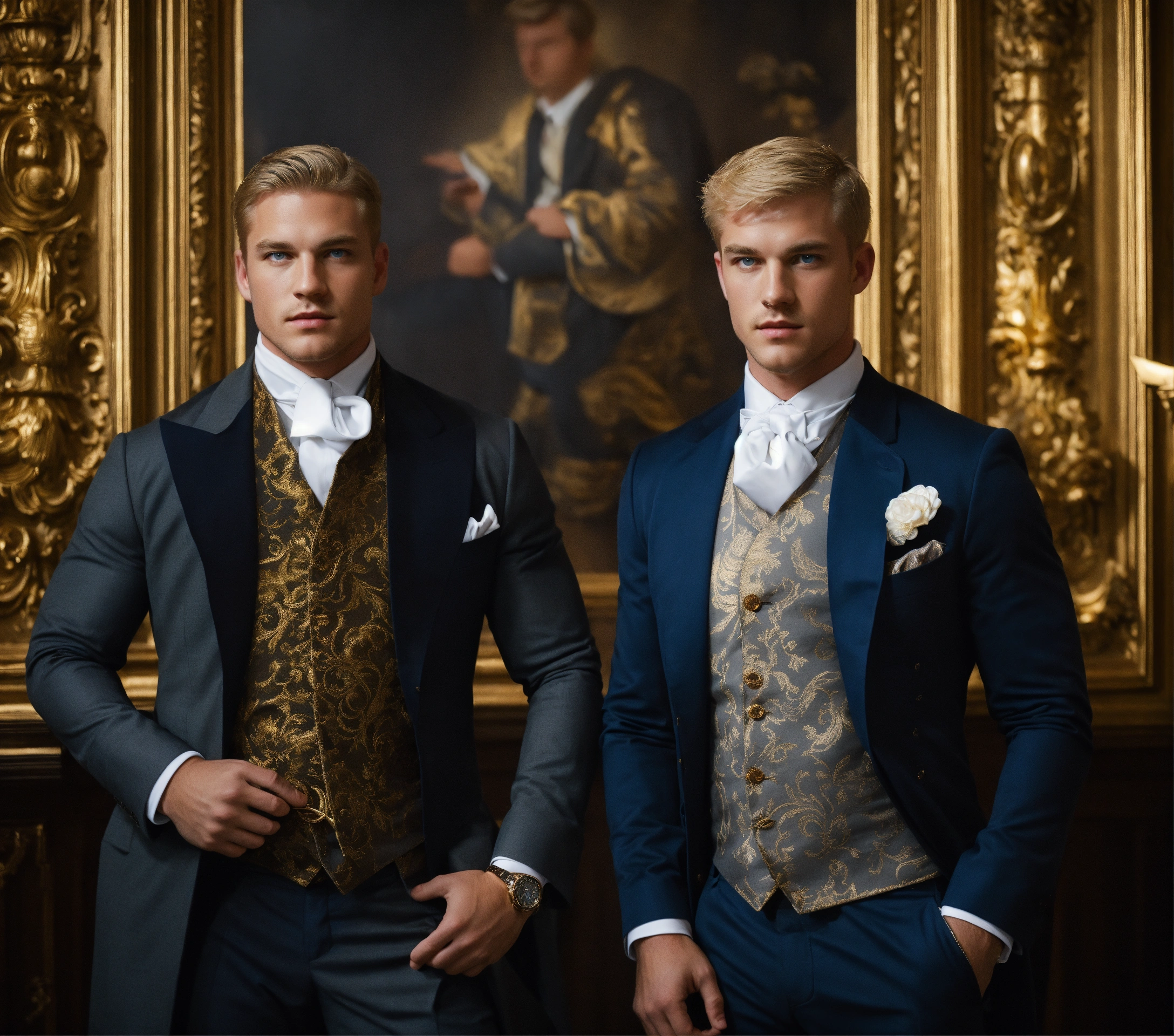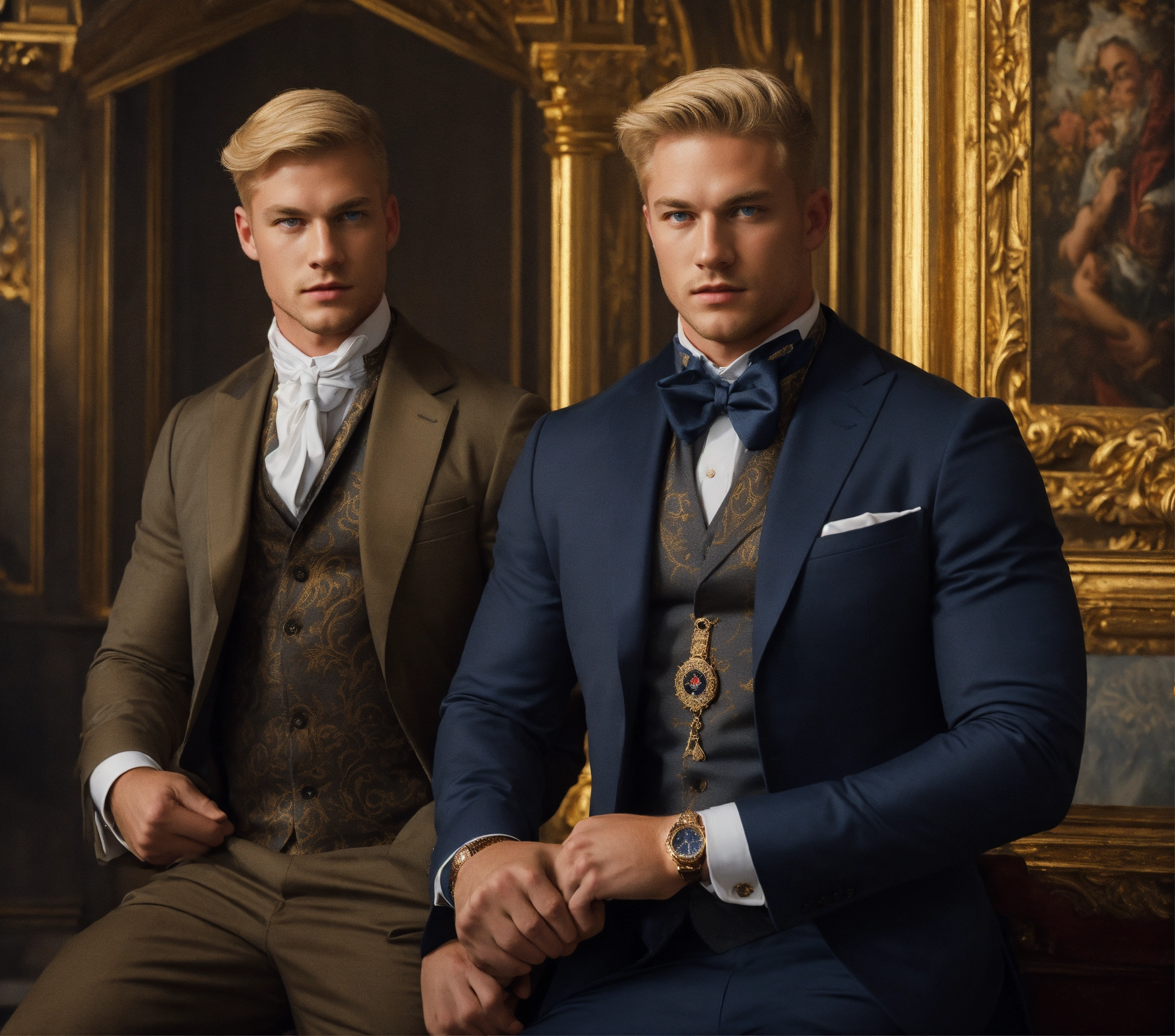 Two muscled gentlemen in dark grey vested suit, club tie, short blonde hair, blue eyes, golden watch, attending a baroque concert