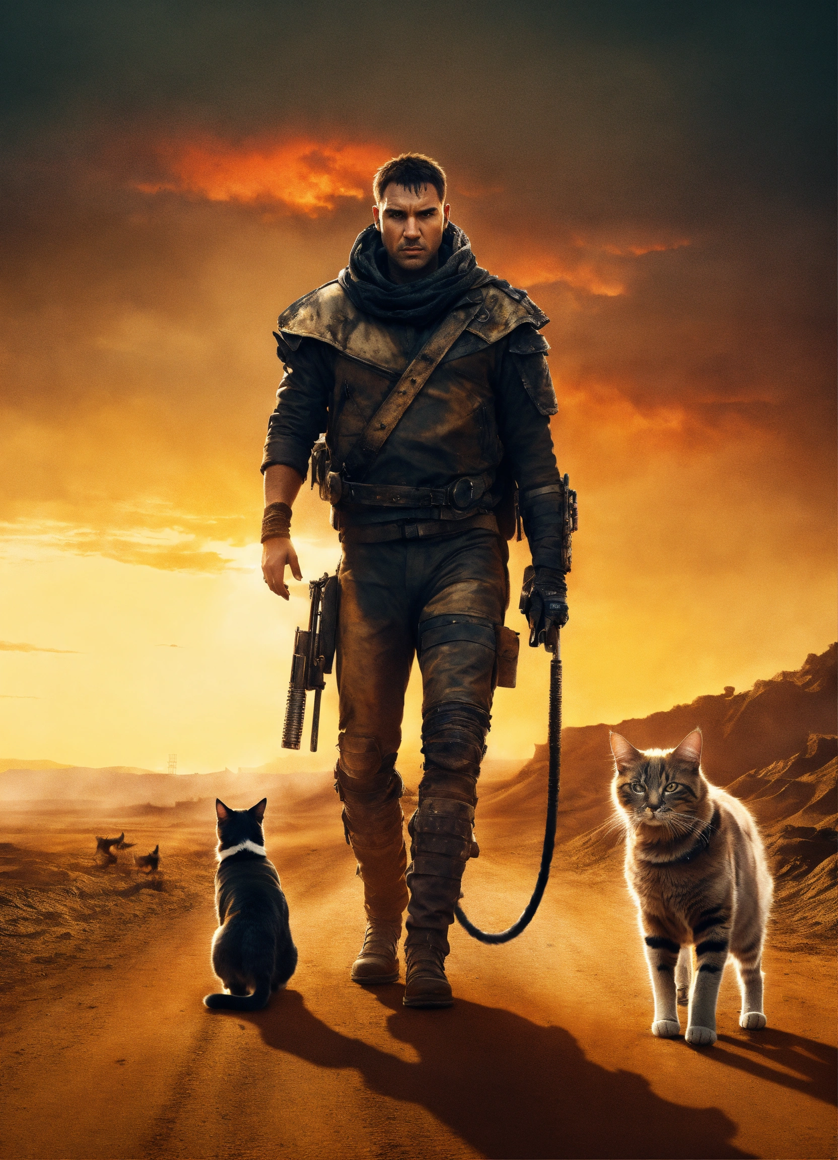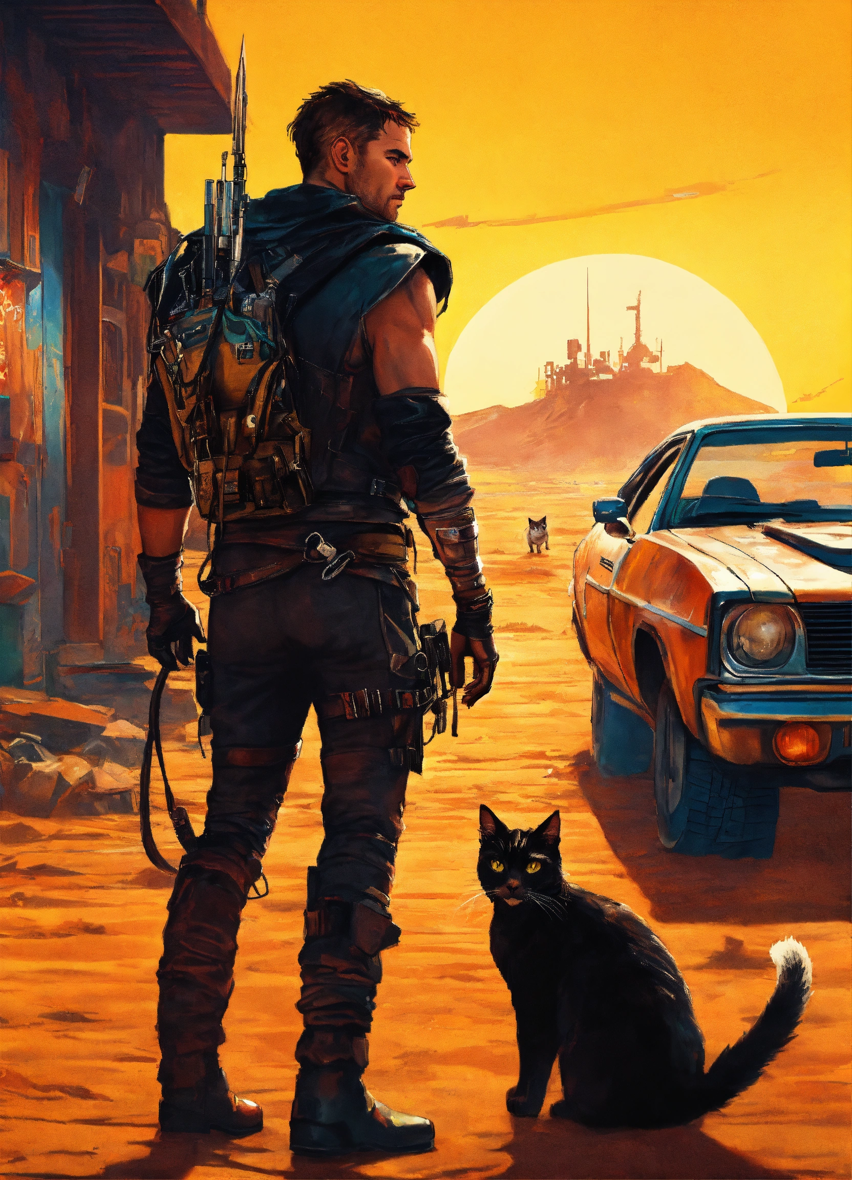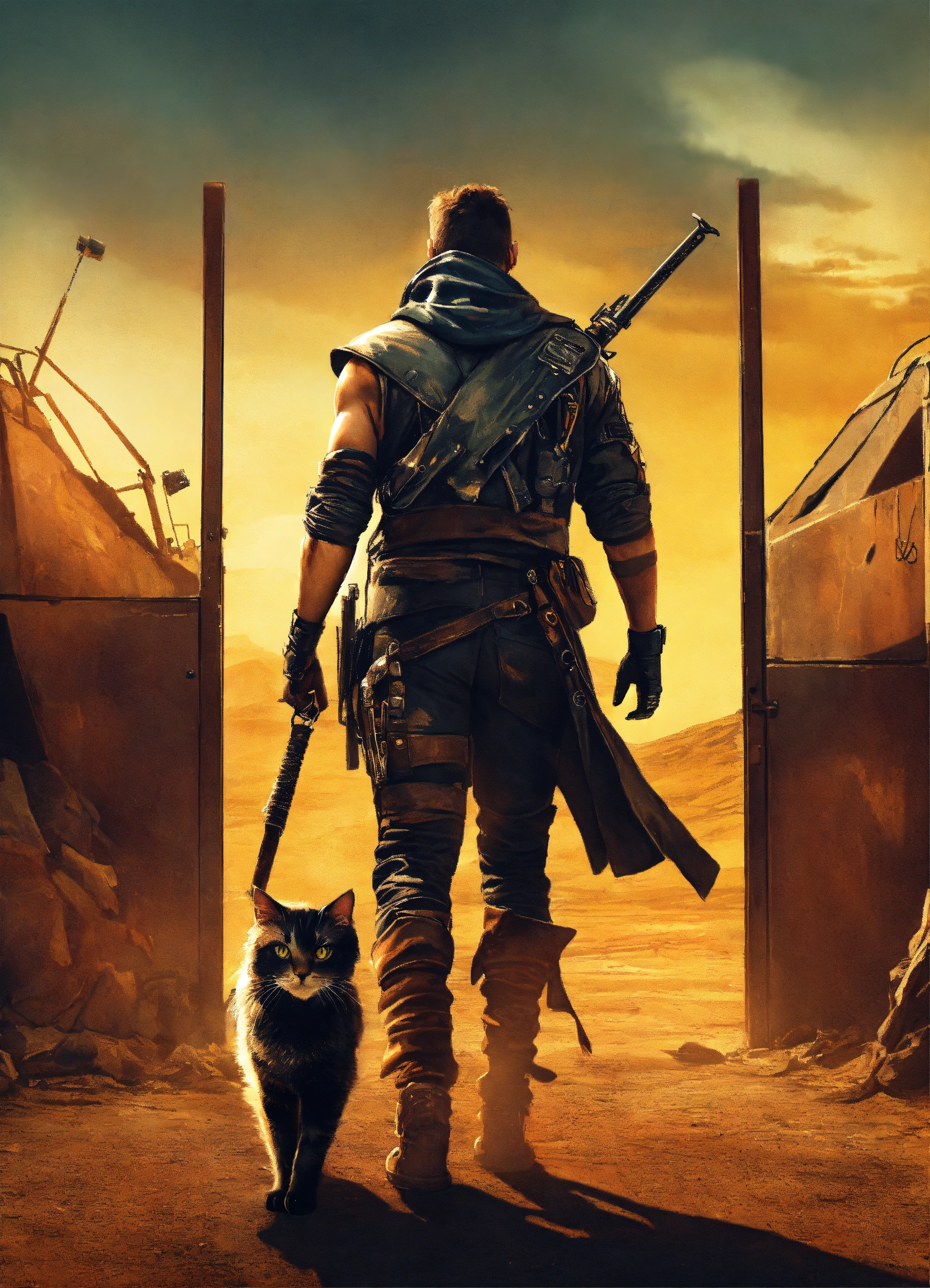 Brutal men in mad max jacket with his cat walking to the door in the middle of the niverse