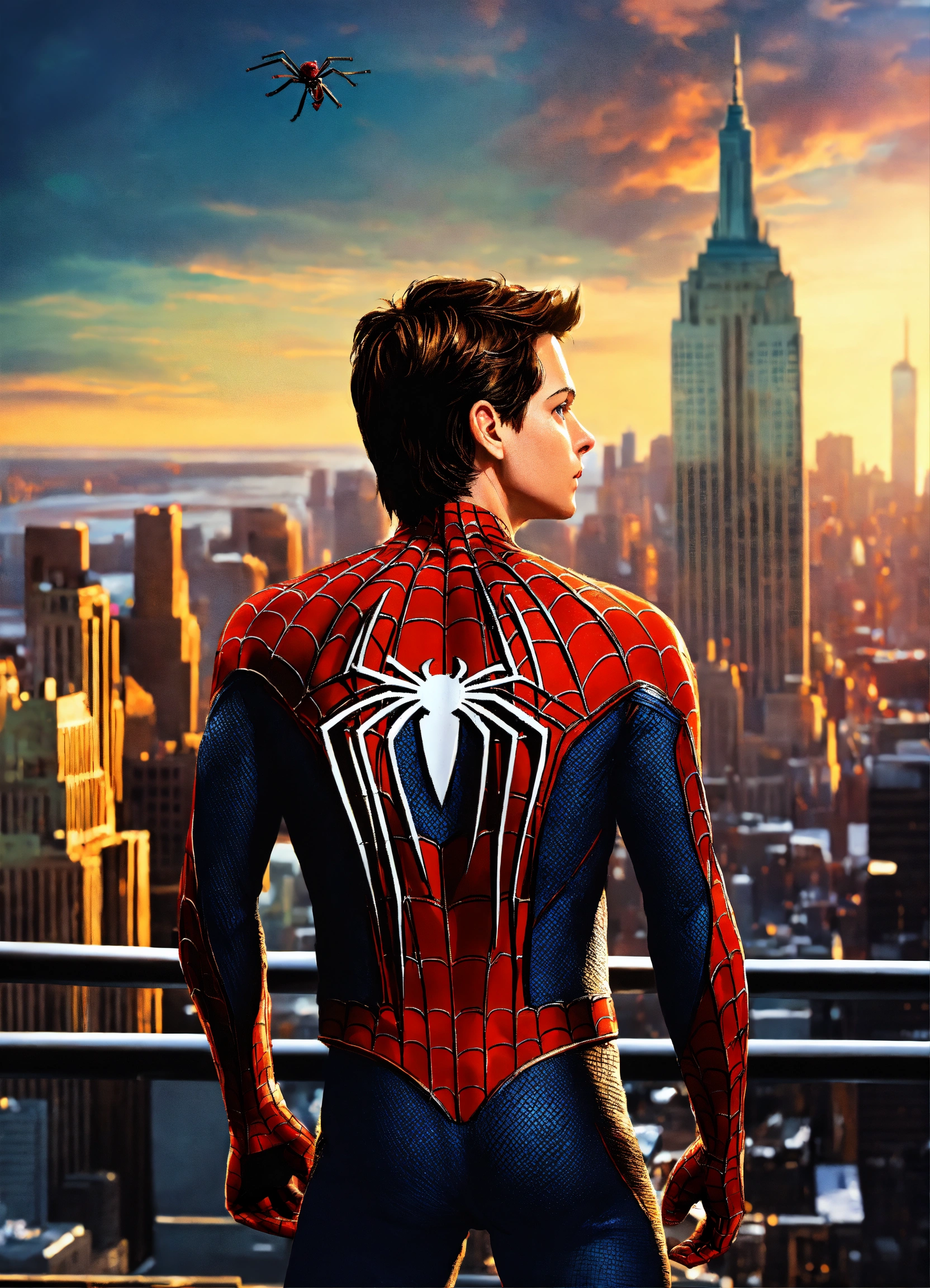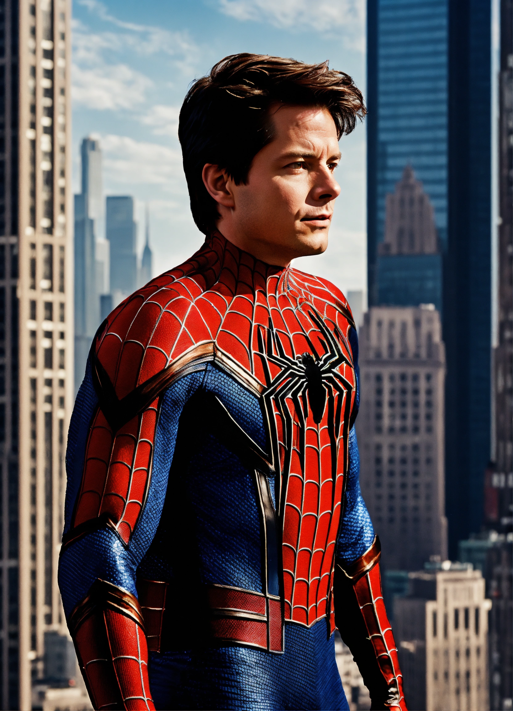Michael j. fox is peter parker, dressed with spider-man suit, new york by a skyscraper in background, 8k resolution, photorealism, highly detailed, epic shot