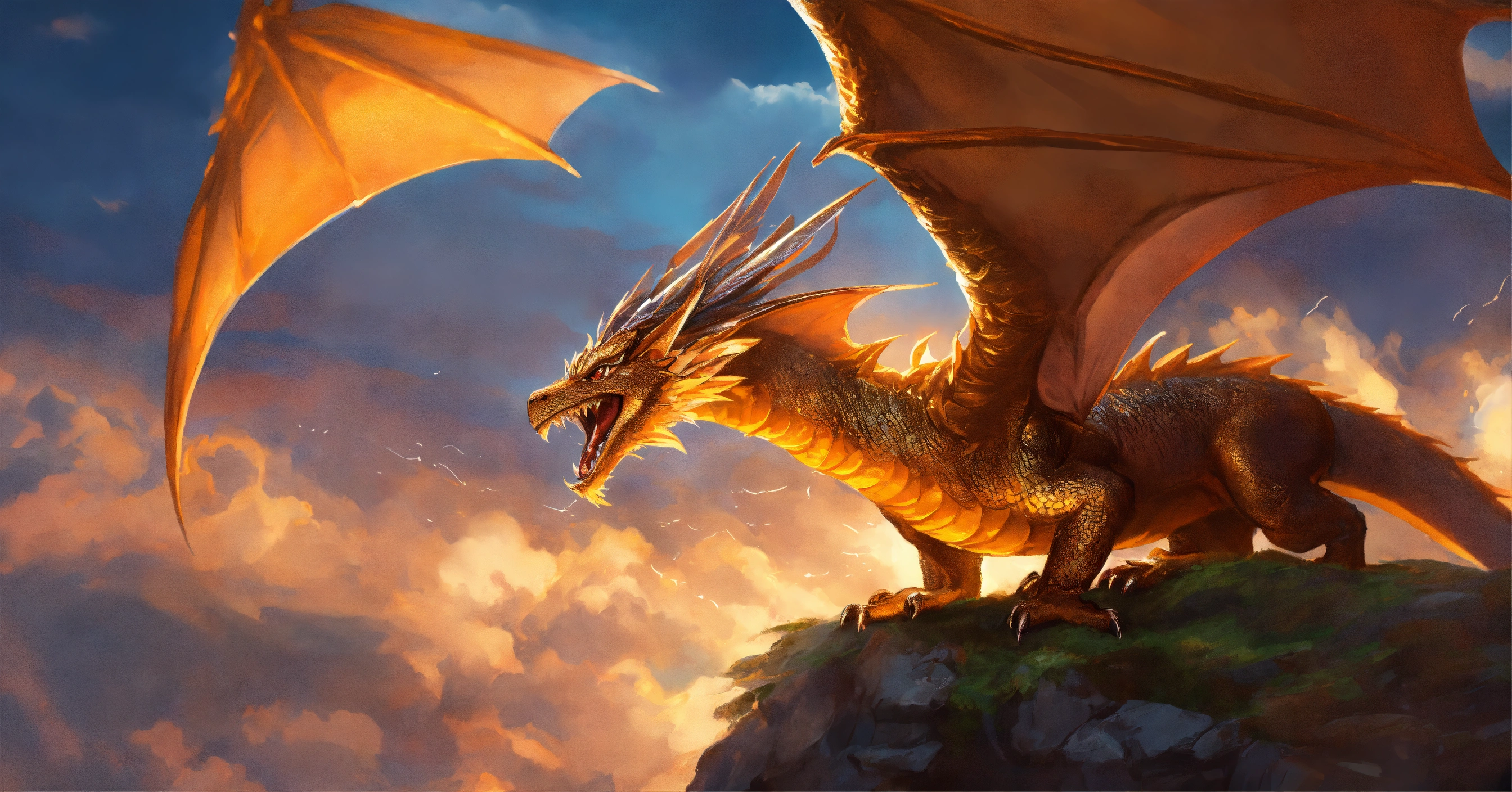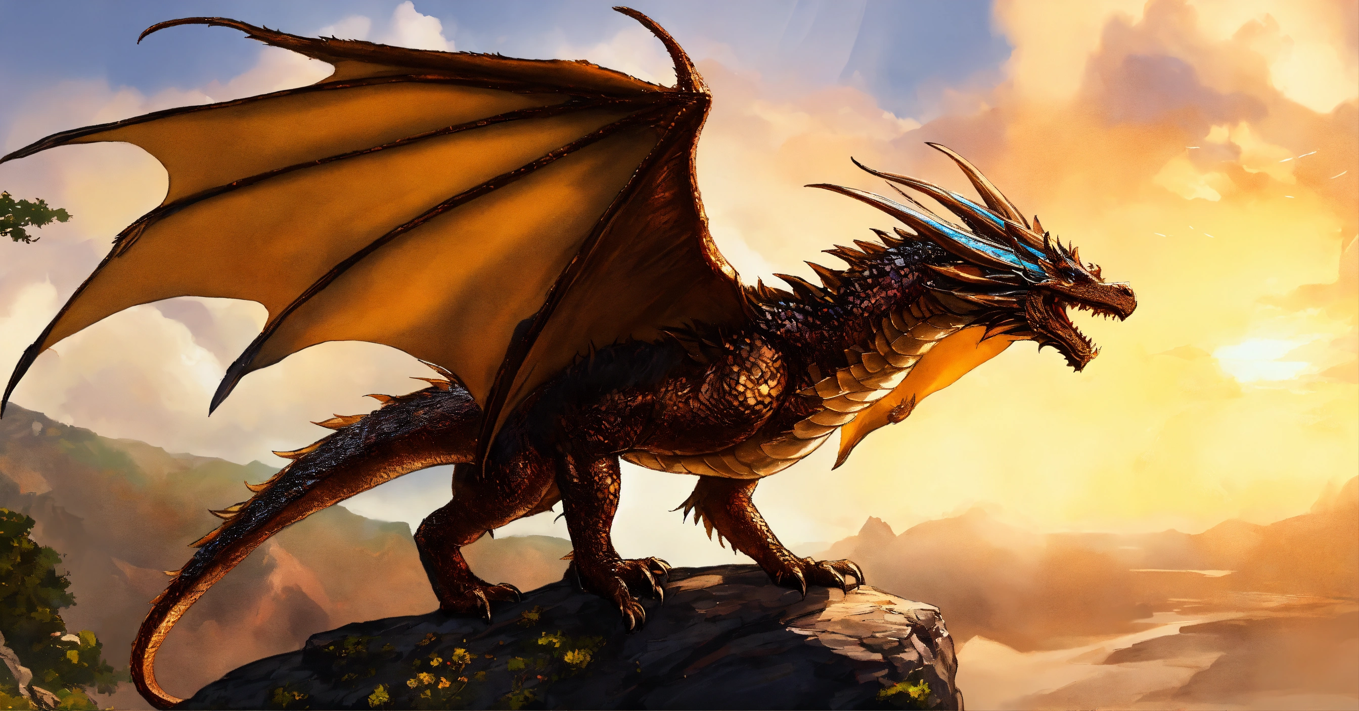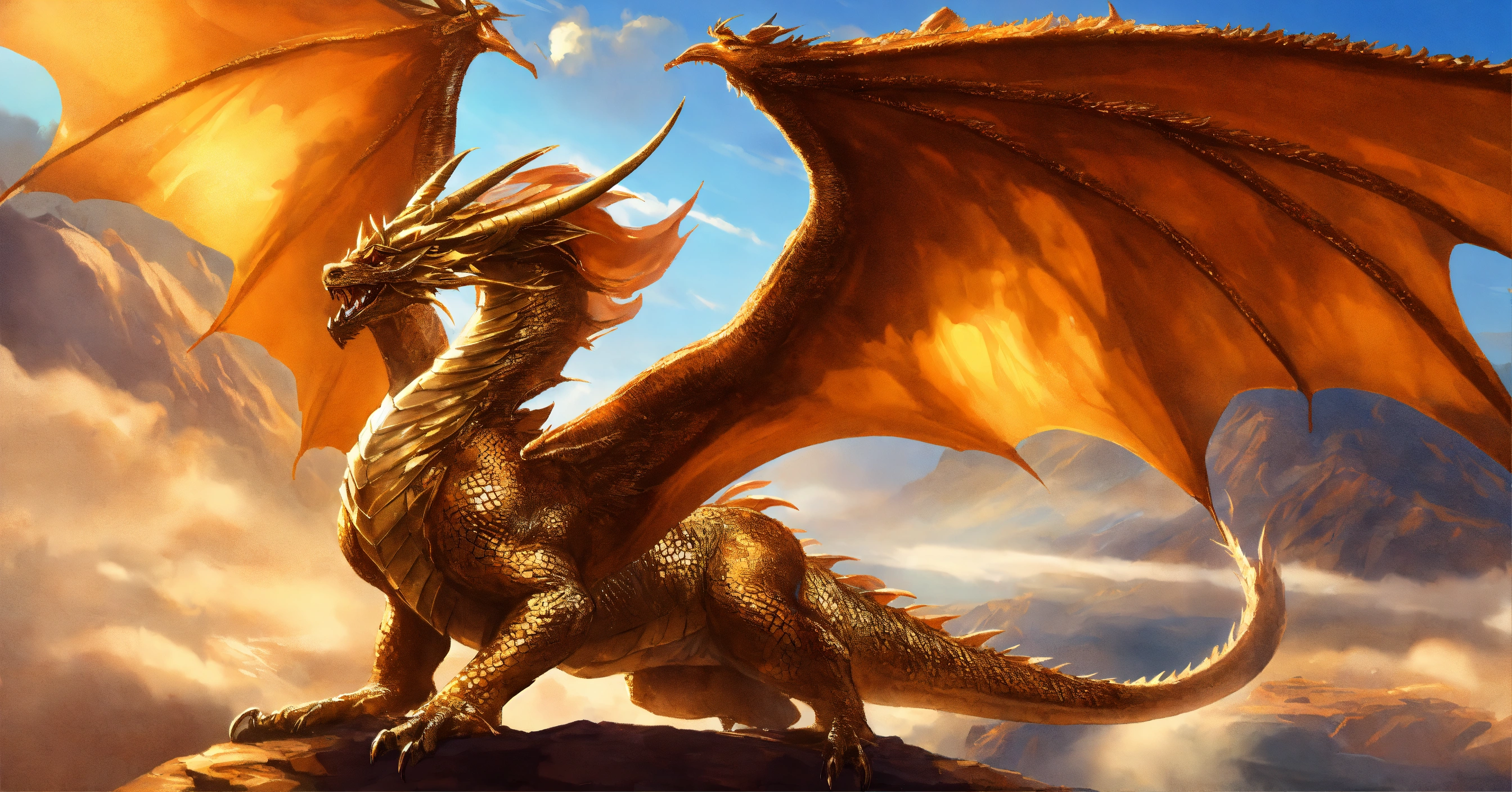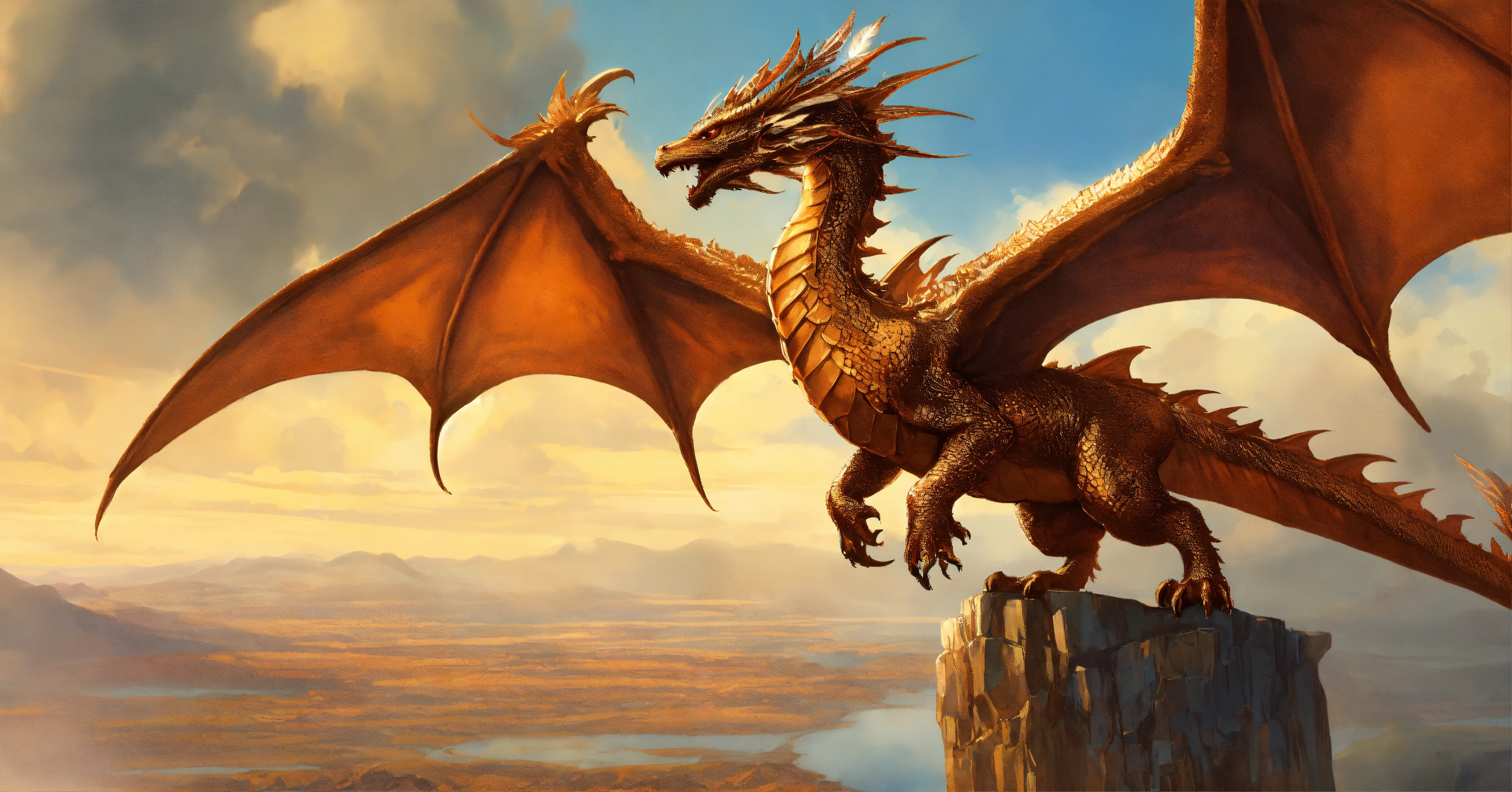 Fine art, delicate detail, beauty, i imagine a shiny copper dragon that can fly. his skin is smooth and luminous, like shining copper. his head has small horns. his wings are long and elegant, with feathers that provide impressive strength in the air. the dragon is very agile and fast and can navigate the sky with grace and elegance. he is a magical and powerful being, and the sight of him in the sky is impressive, dungeons and dragons style, trending on artstation, graphic novel art