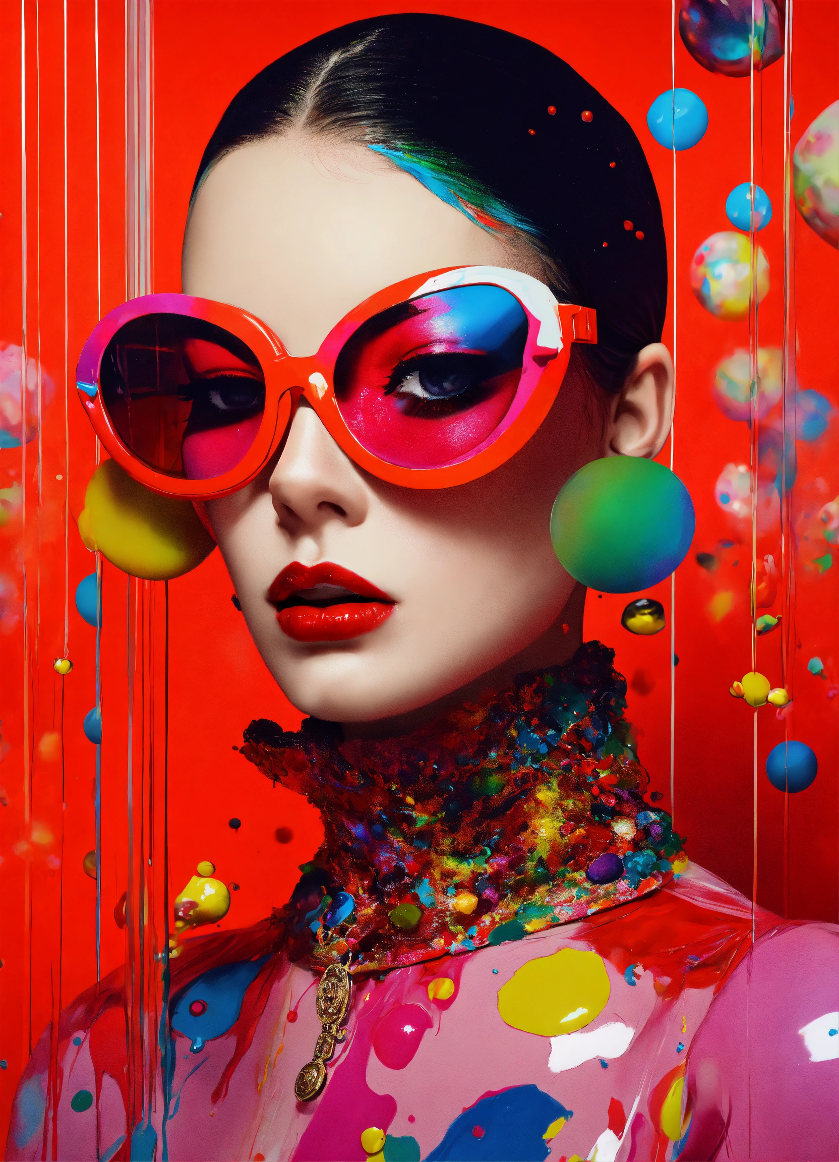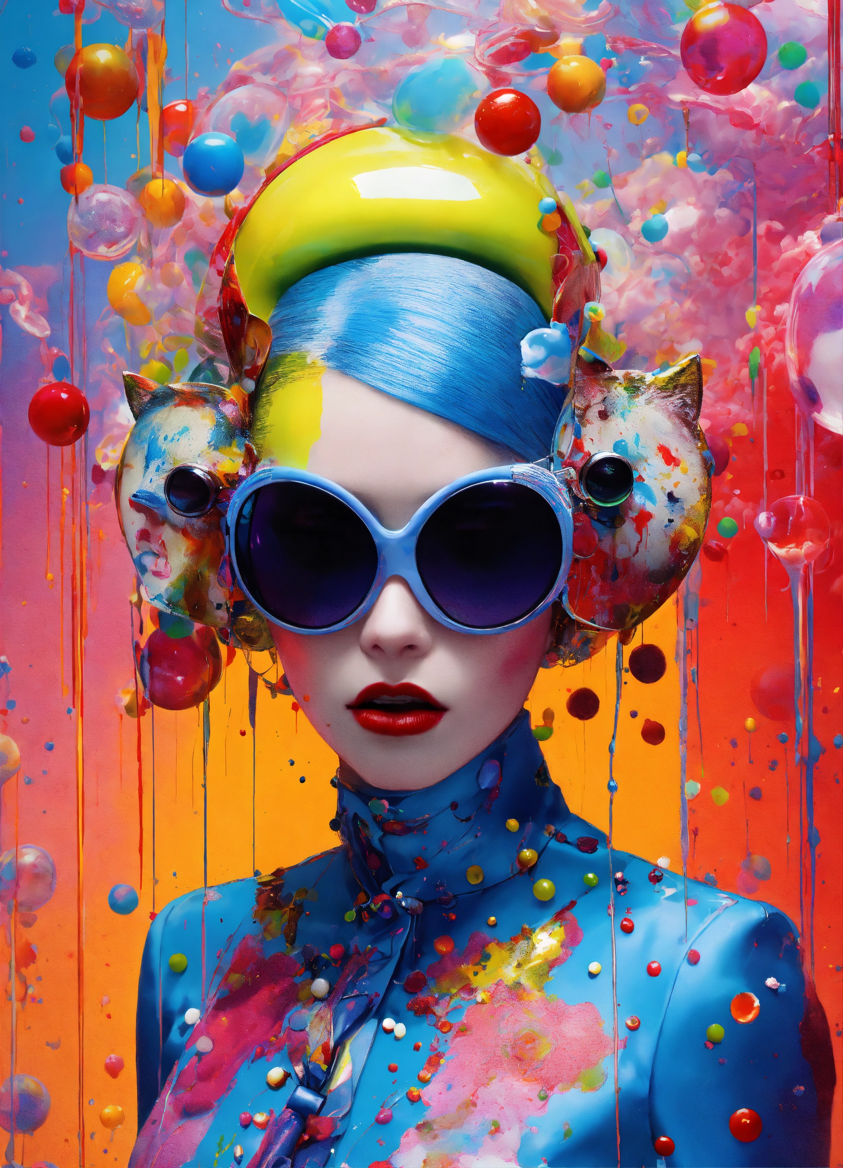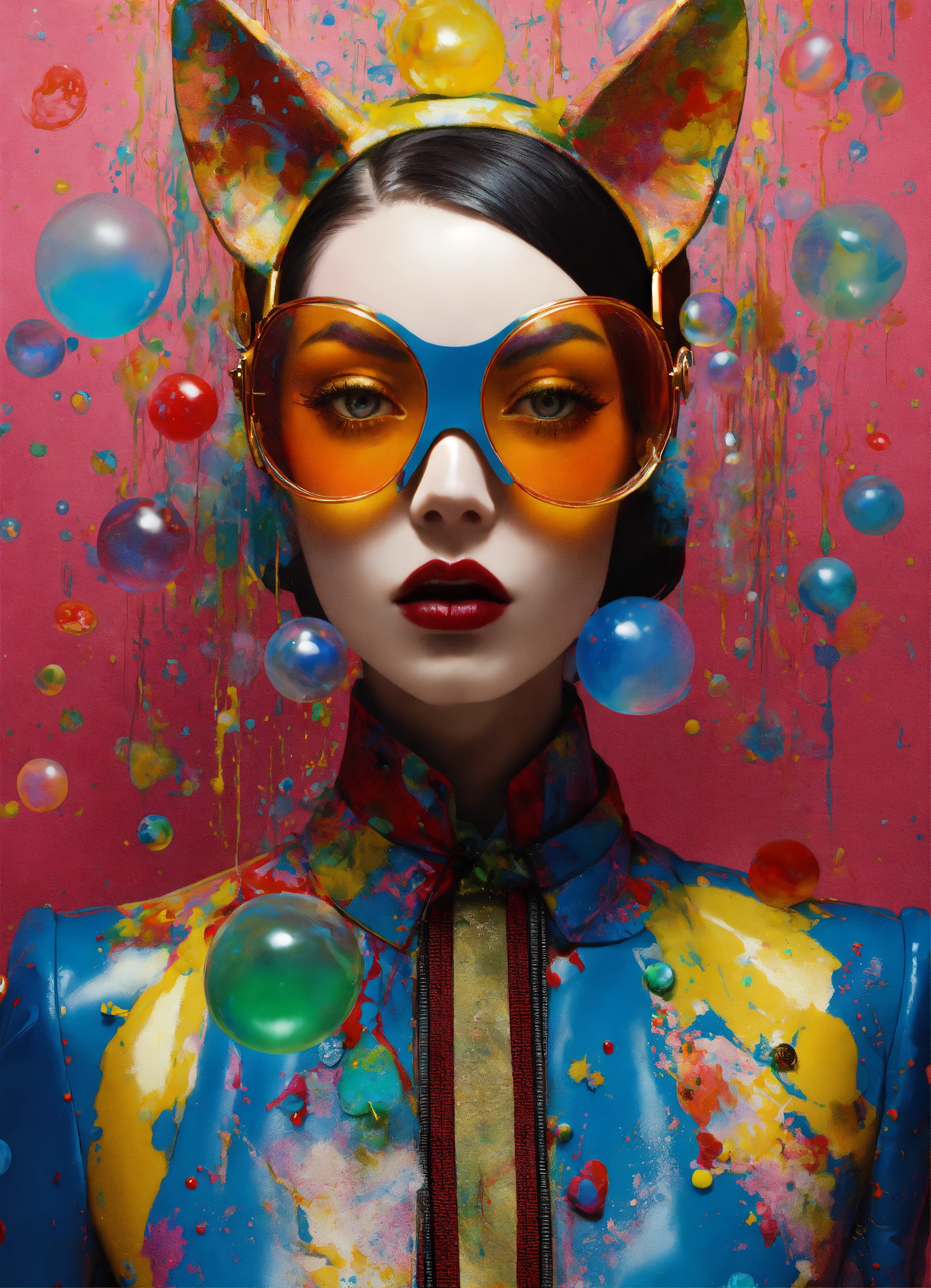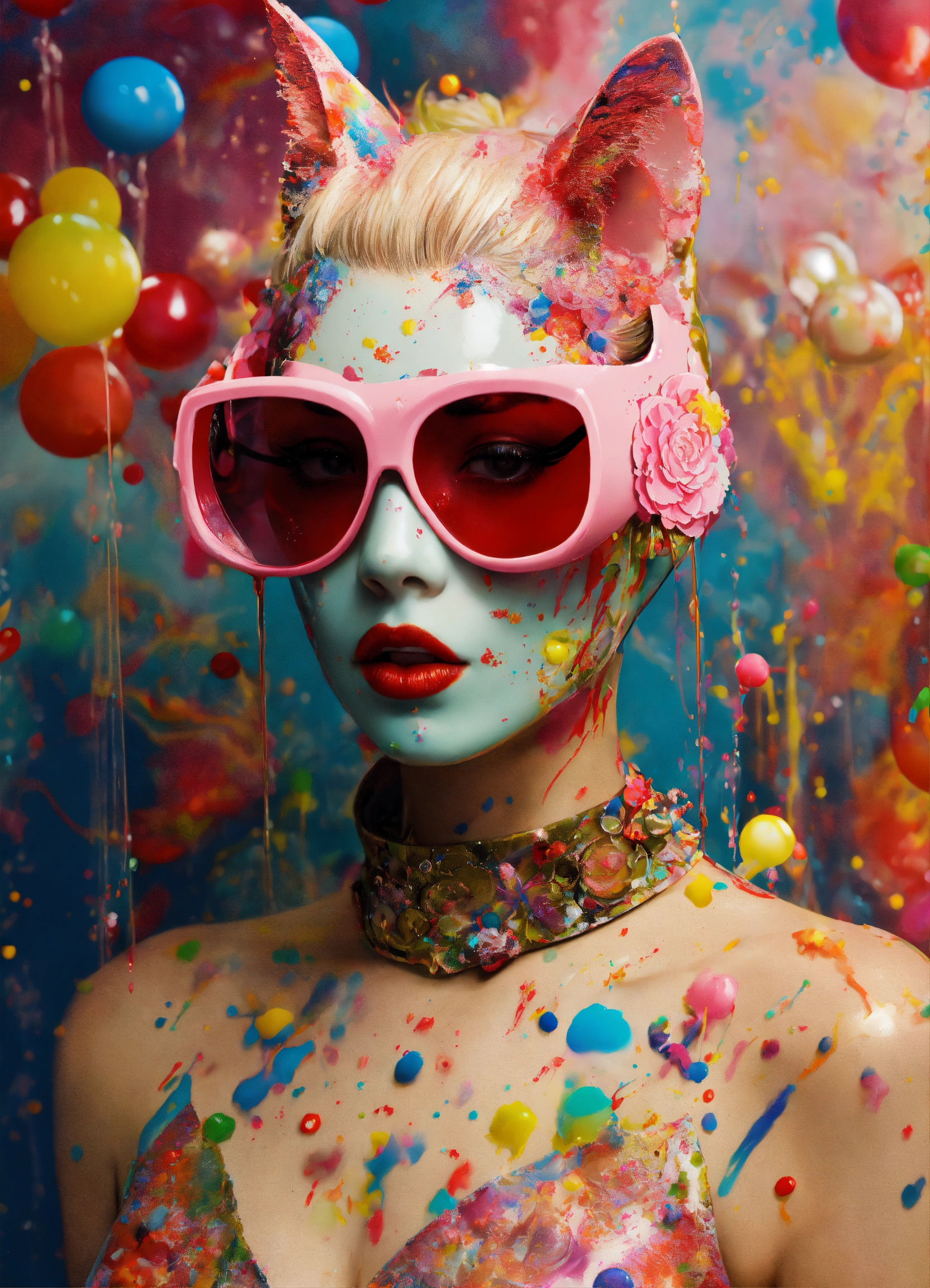 Front portrait photography, transparent porcelain cat woman mask, and k7 tapes total mess of full of paint splatter multicolor exploding bubbles dripping, pop gucci air hostess with sunglasses, an attractive, 80 degree view, art by sergio lopez, natalie shau, james jean and salvador dali