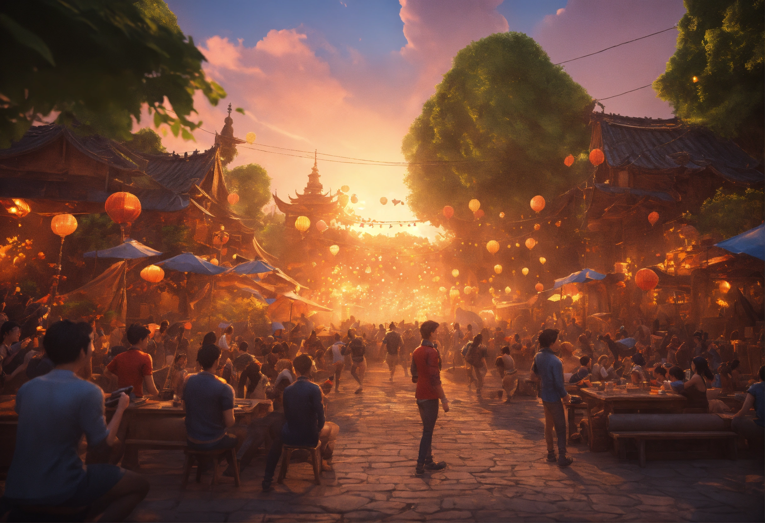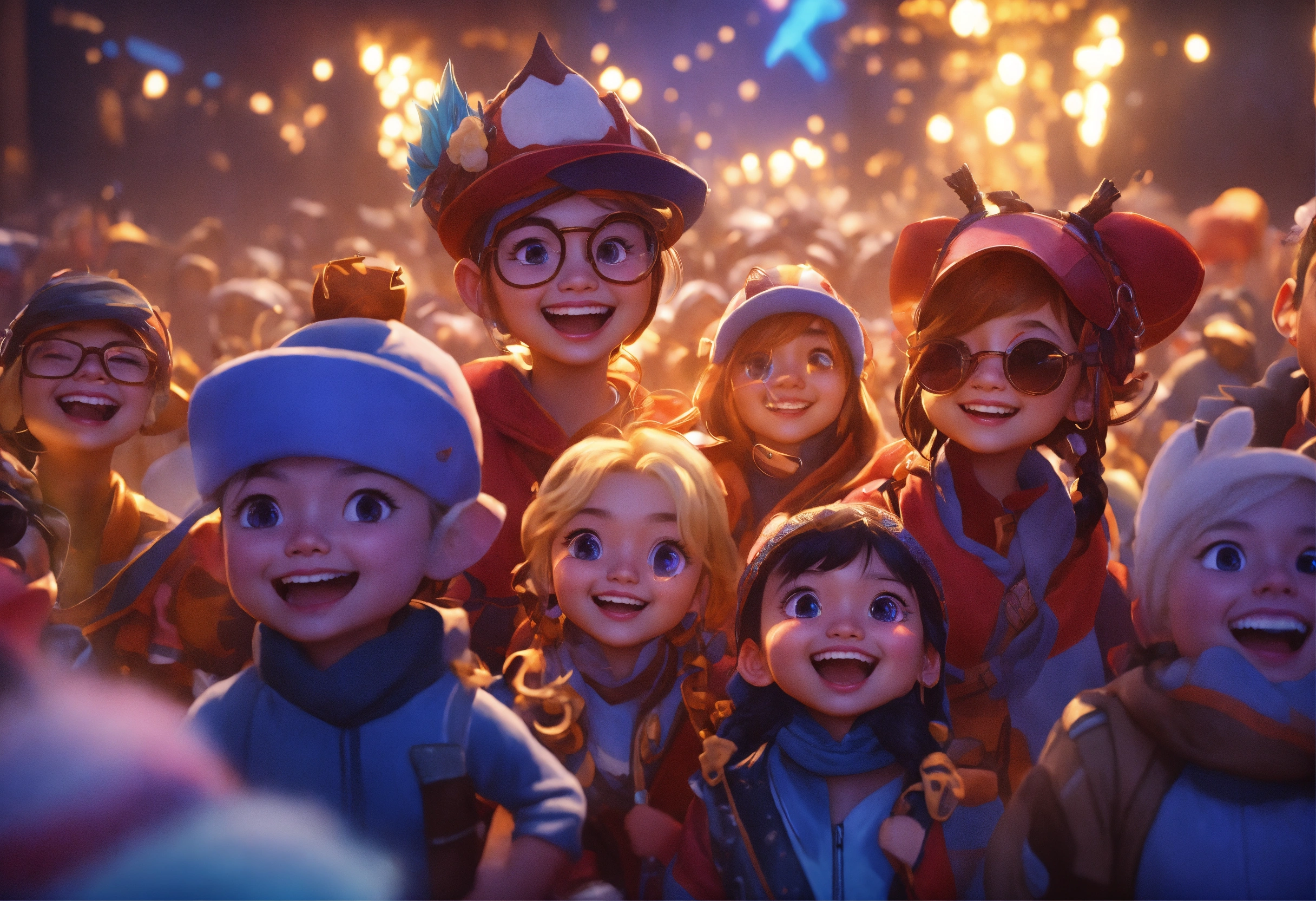 A highly detailed league of legend illustration of happy faces of fans in front of us by huyy nguyen, by cj xander, by jennifer wuestling, by diep duong van, by huyy nguyen, by grafit studio, volumetric lighting, 3d render, 4k resolution, trending on artstation, masterpiece, close up frame, cinematic shot, face to us, backlight sunset light