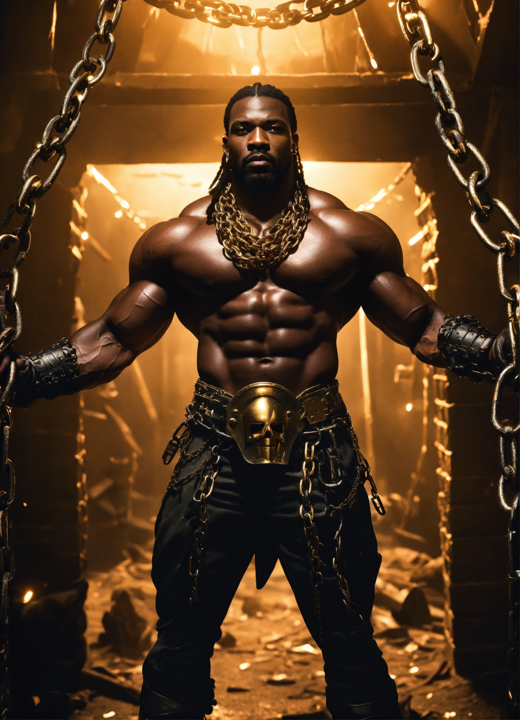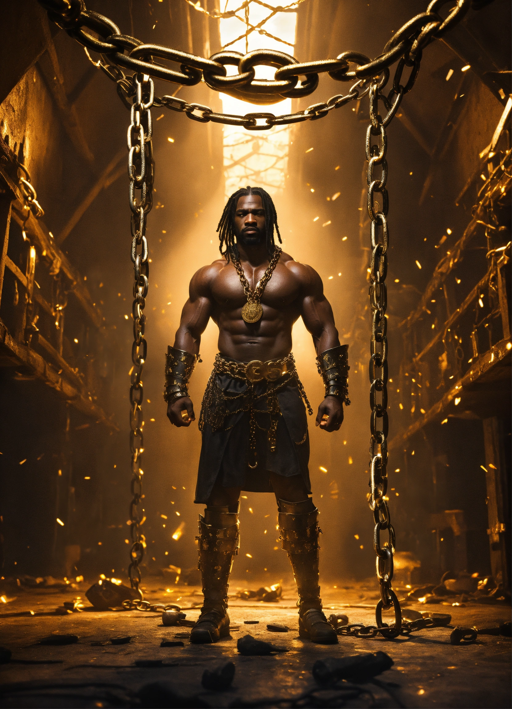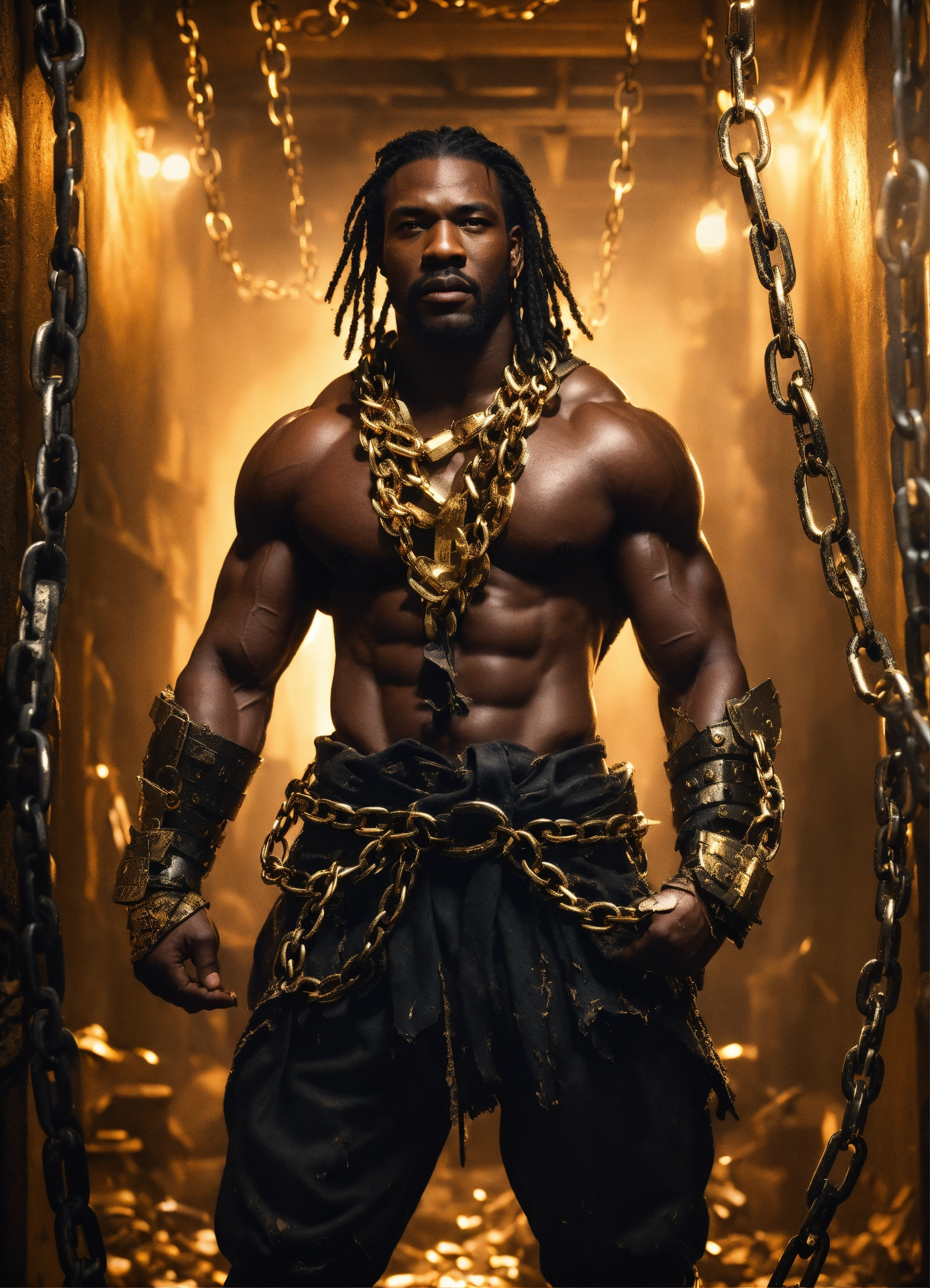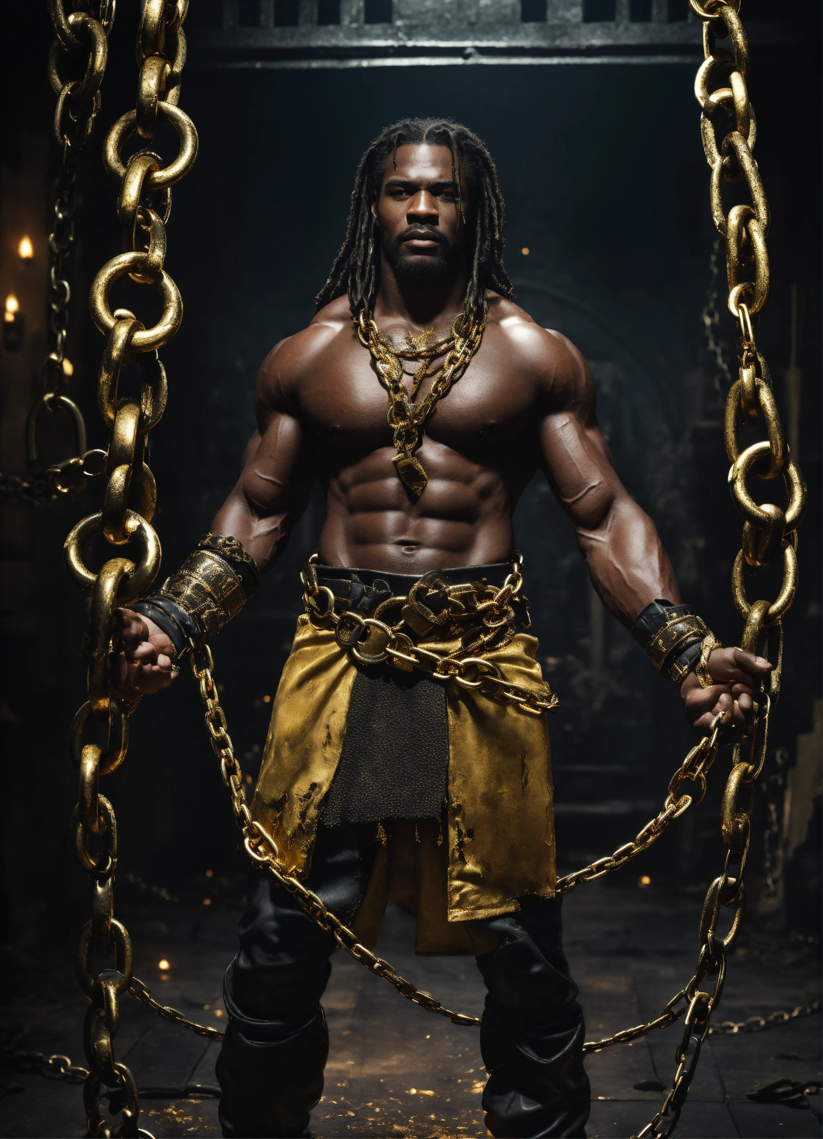 Full body strong huge muscular handsome black god chained by enemies chained to the ceiling of a dark dungeon hands chained above him, strong huge handsome black man with long braided hair, perfect face, muscular fully clothed in damaged gold battle armor, chained by enemies chained to the ceiling of a dark dungeon hands chained above him, high detail, realistic photo, high detail, digital painting, cinematic, stunning, hyper-realistic, sharp focus, high resolution 8k, insanely detailed