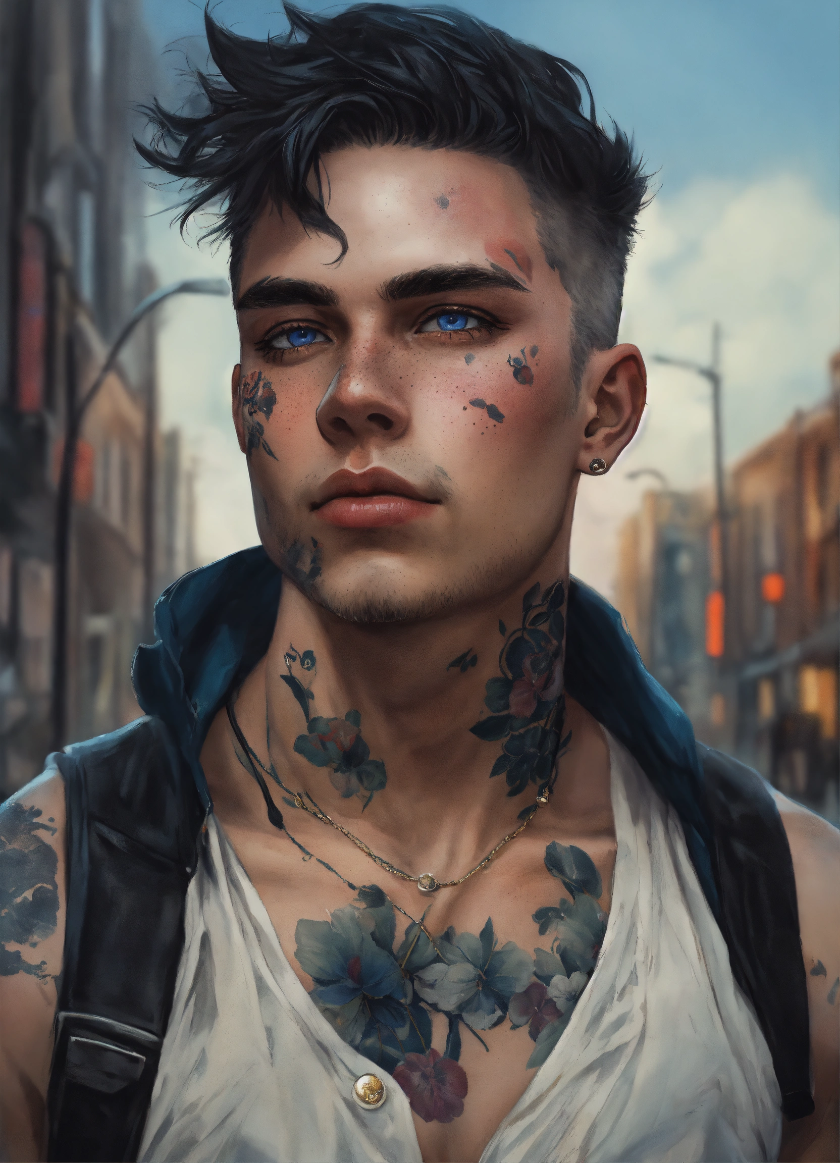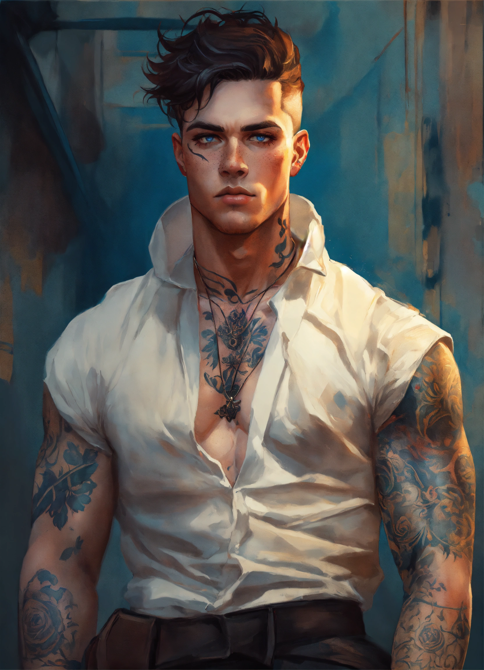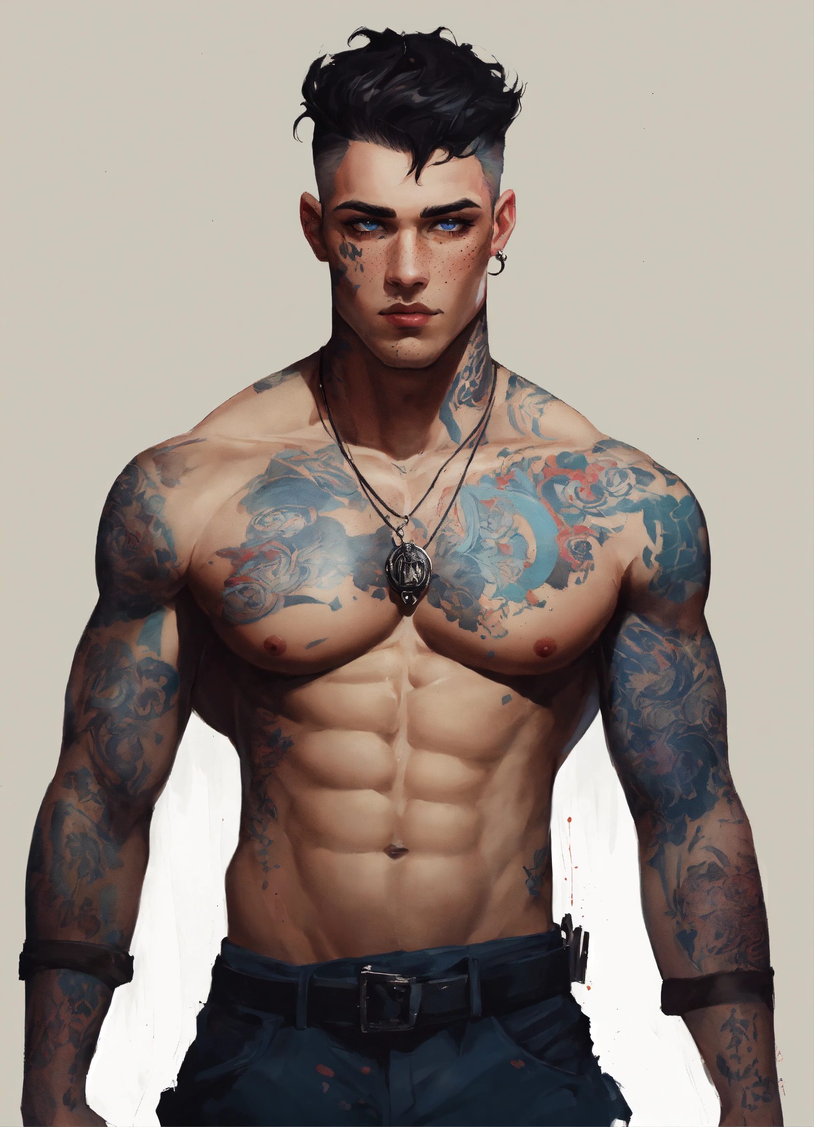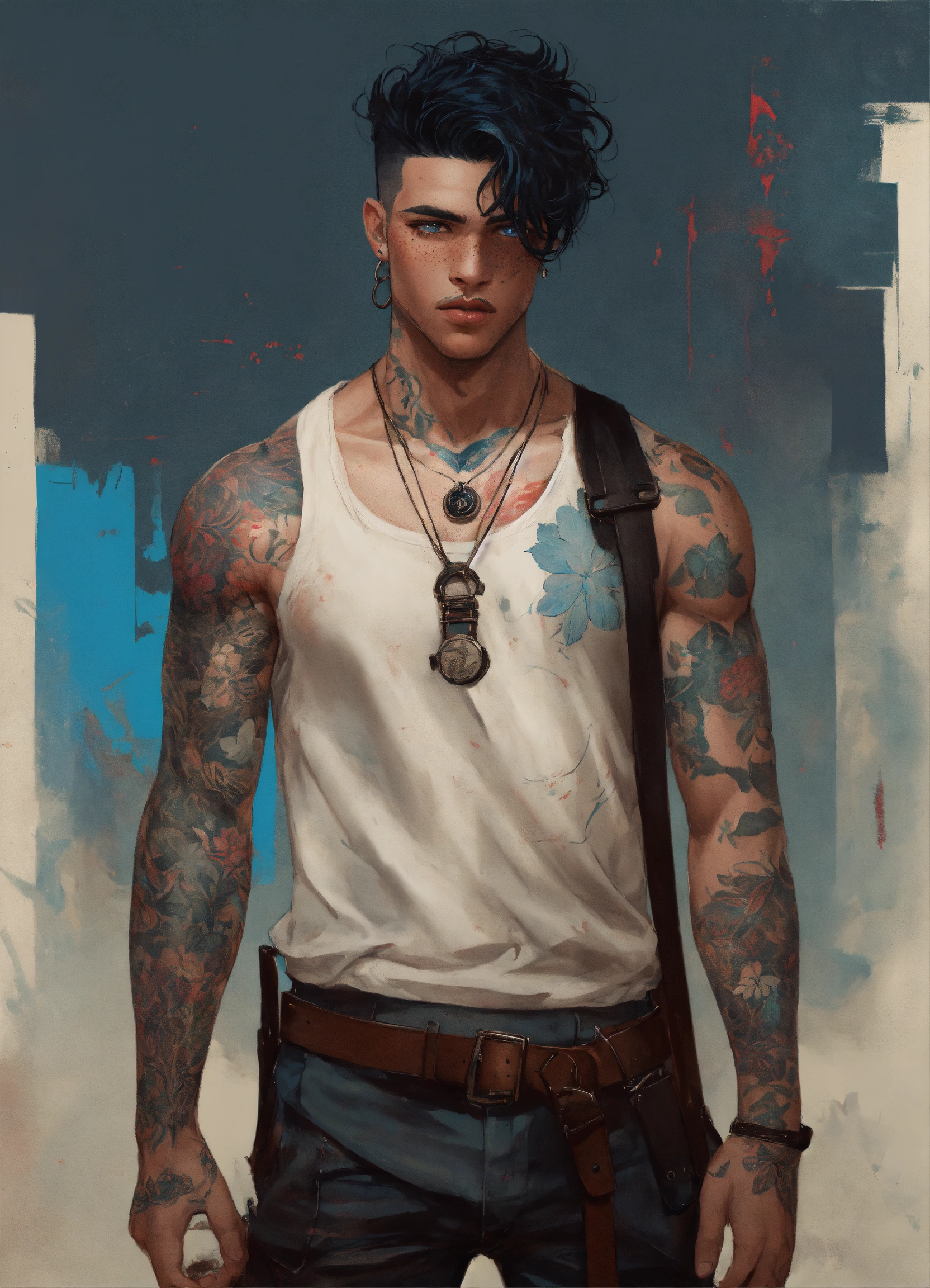 Highly detailed portrait of a 50's non binary, masculine, large, muscular, light skin, scarred, trans, mercenary, neck tattoo, white tunic, black trousers, black boots, blue eyes, smeared mascara, midnight hair, messy haircut, bandaged knuckles, freckles, full body shot, by artgerm, atey ghailan, greg rutkowski, kathe butcher, black color scheme