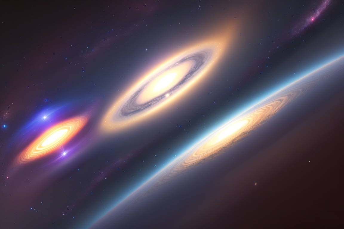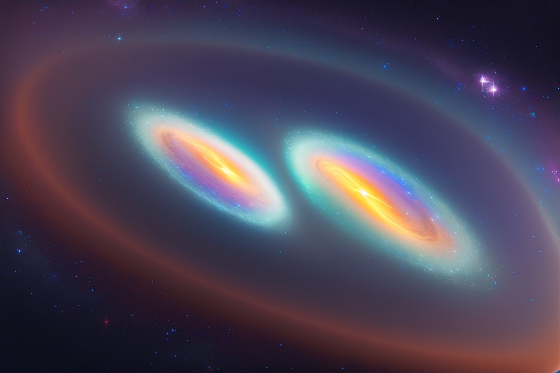 A visual representation of two galaxies, one larger and one smaller, gradually getting closer to each other.