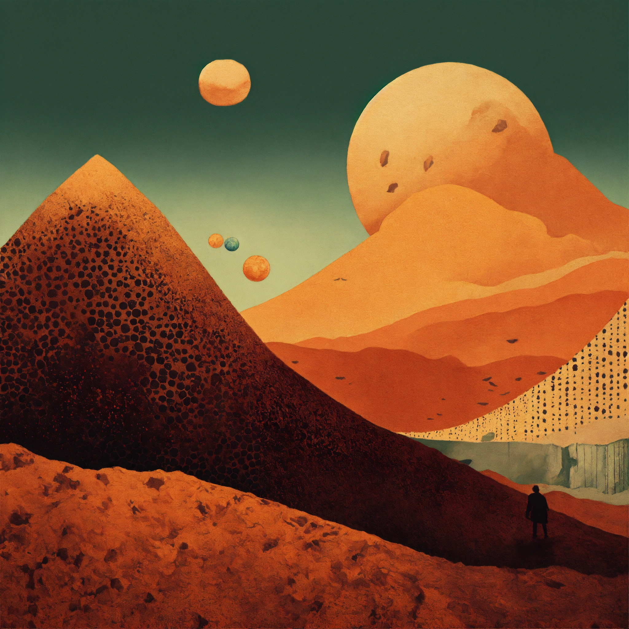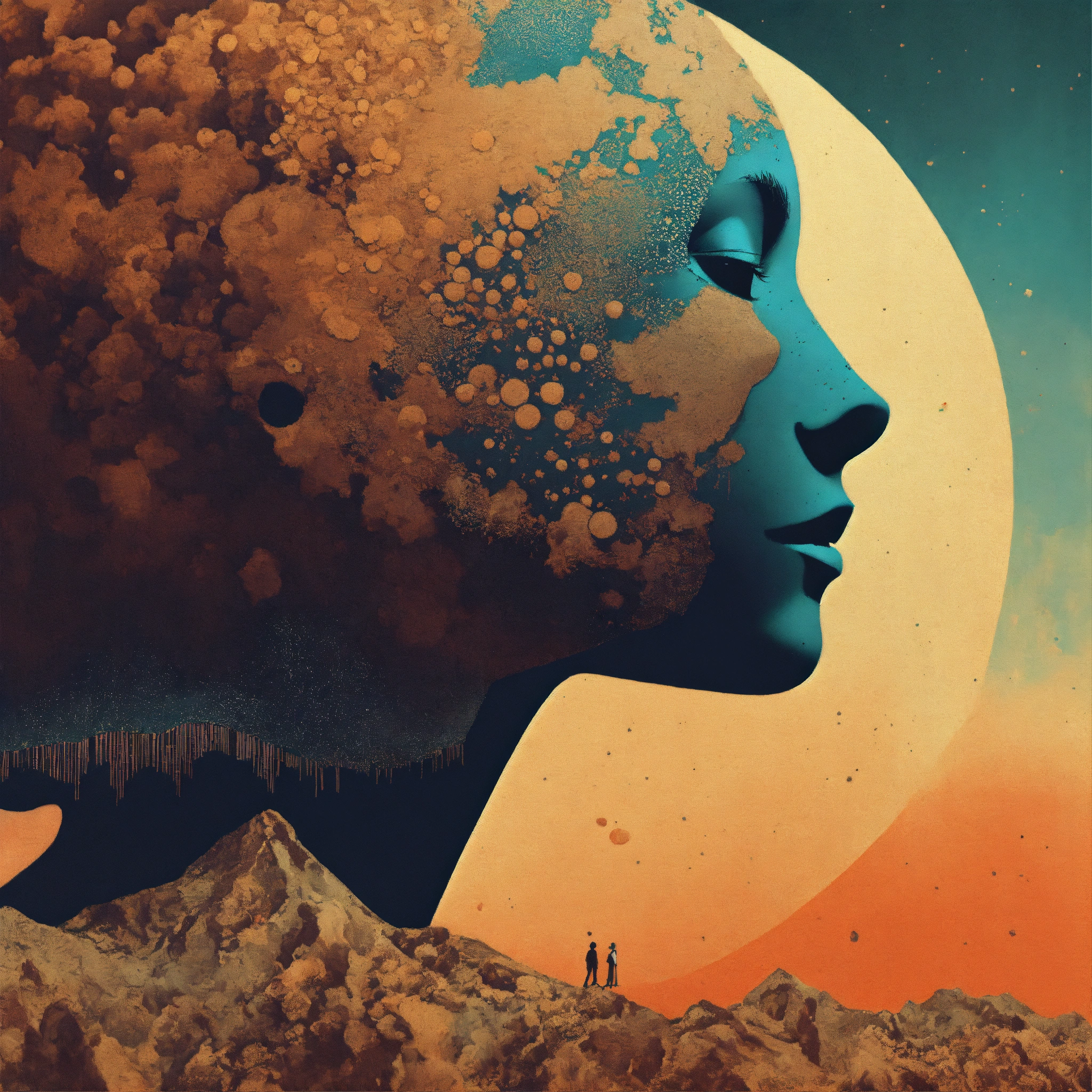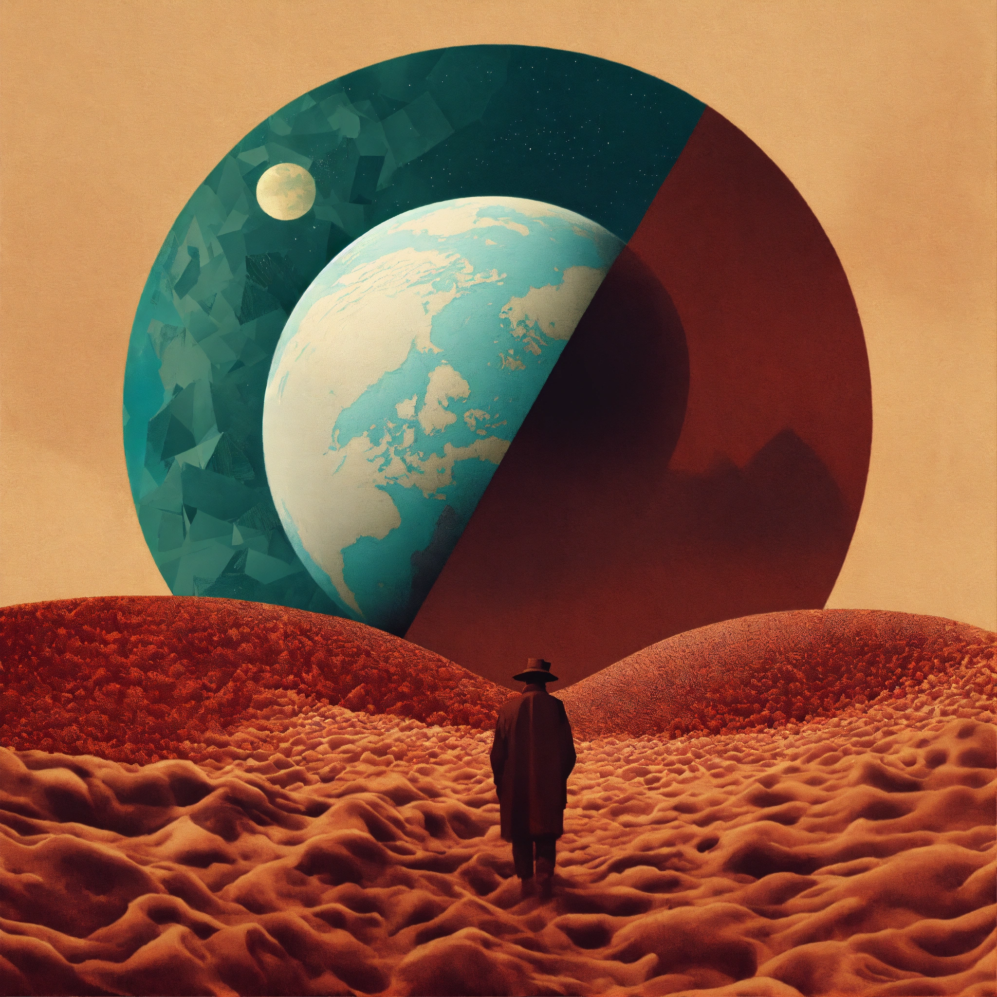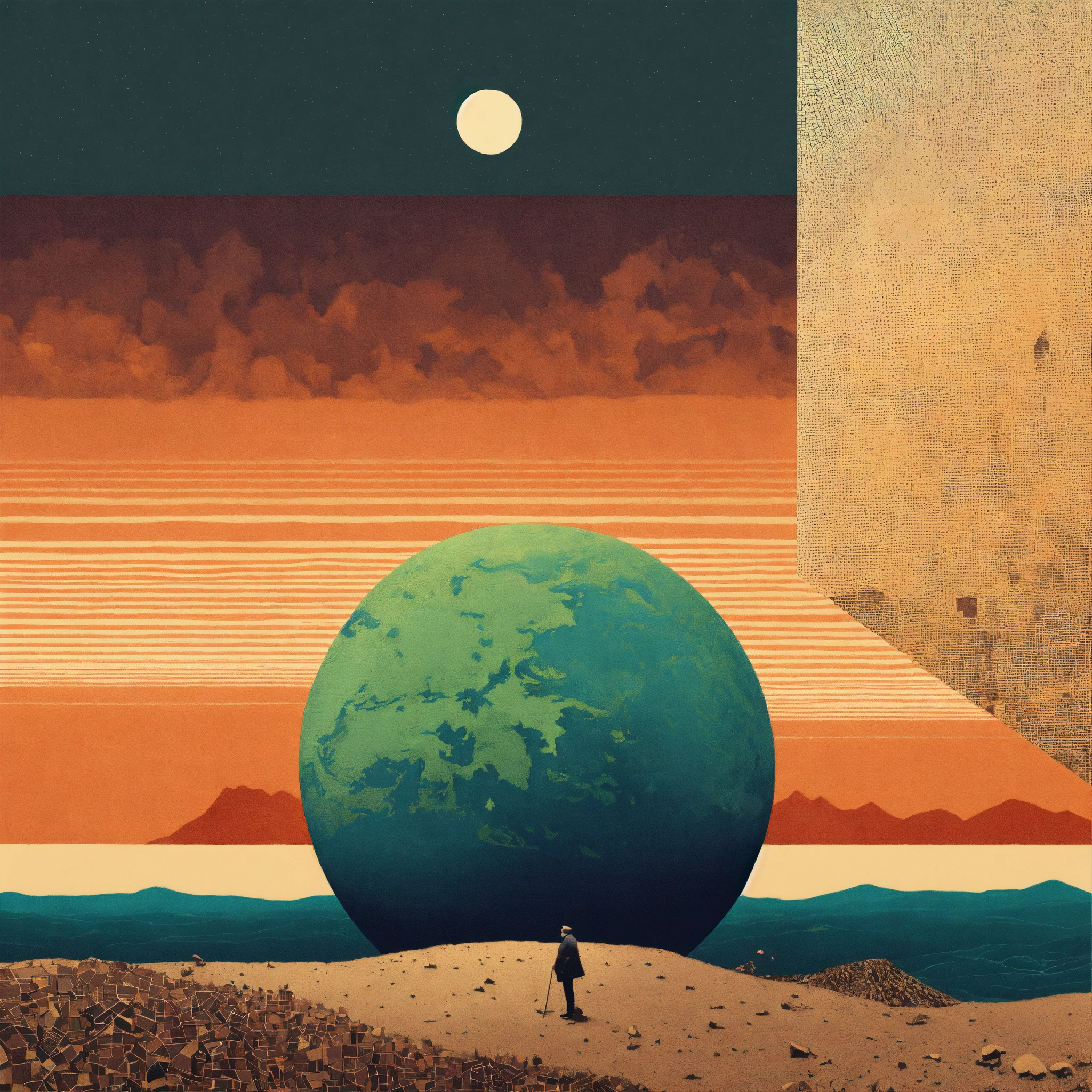 Earth profile + halftone pattern + editorial illustration of the memento morti + higly textured, genre defining mixed media collage painting + fringe absurdism + award winning halftone pattern illustration + simple flowing shapes + subtle shadows + paper texture + minimalist color scheme + inspired by zdzisław beksiński.