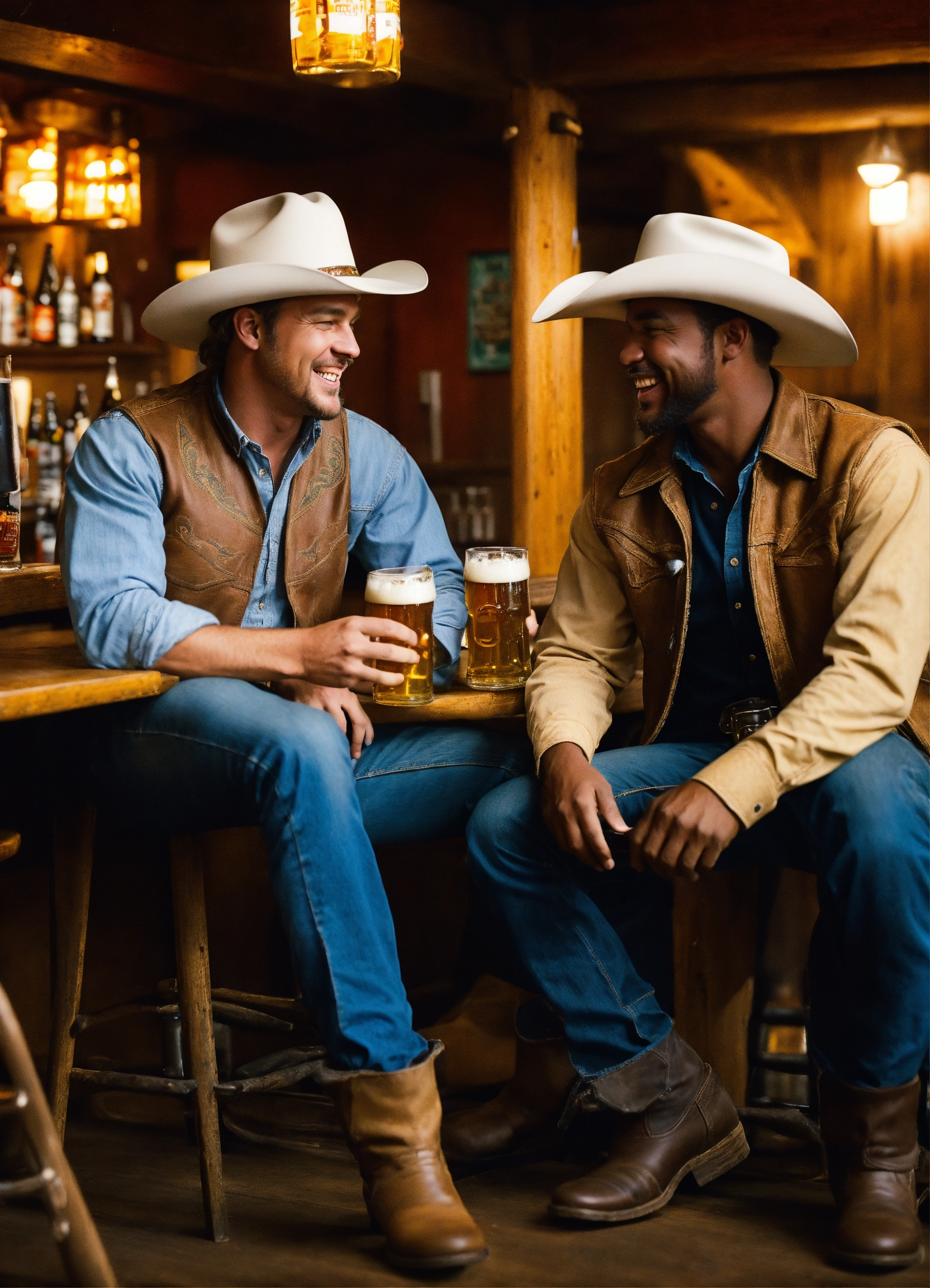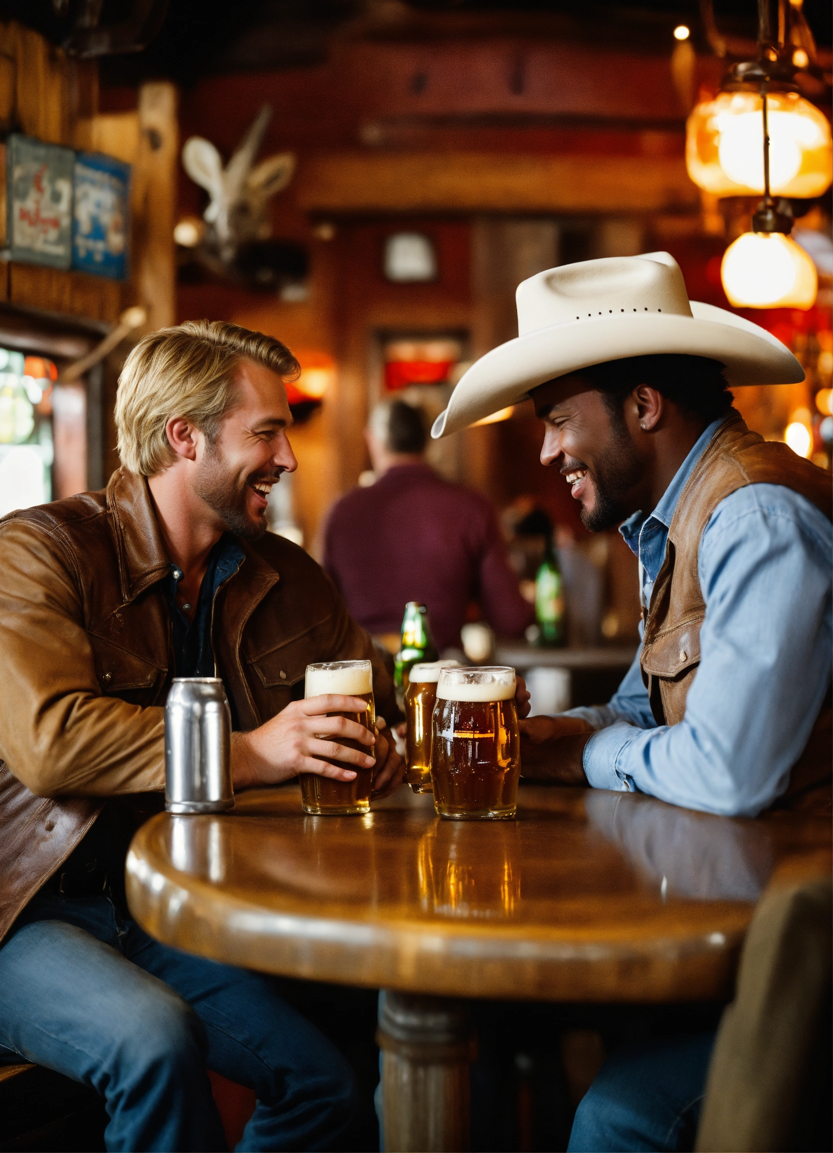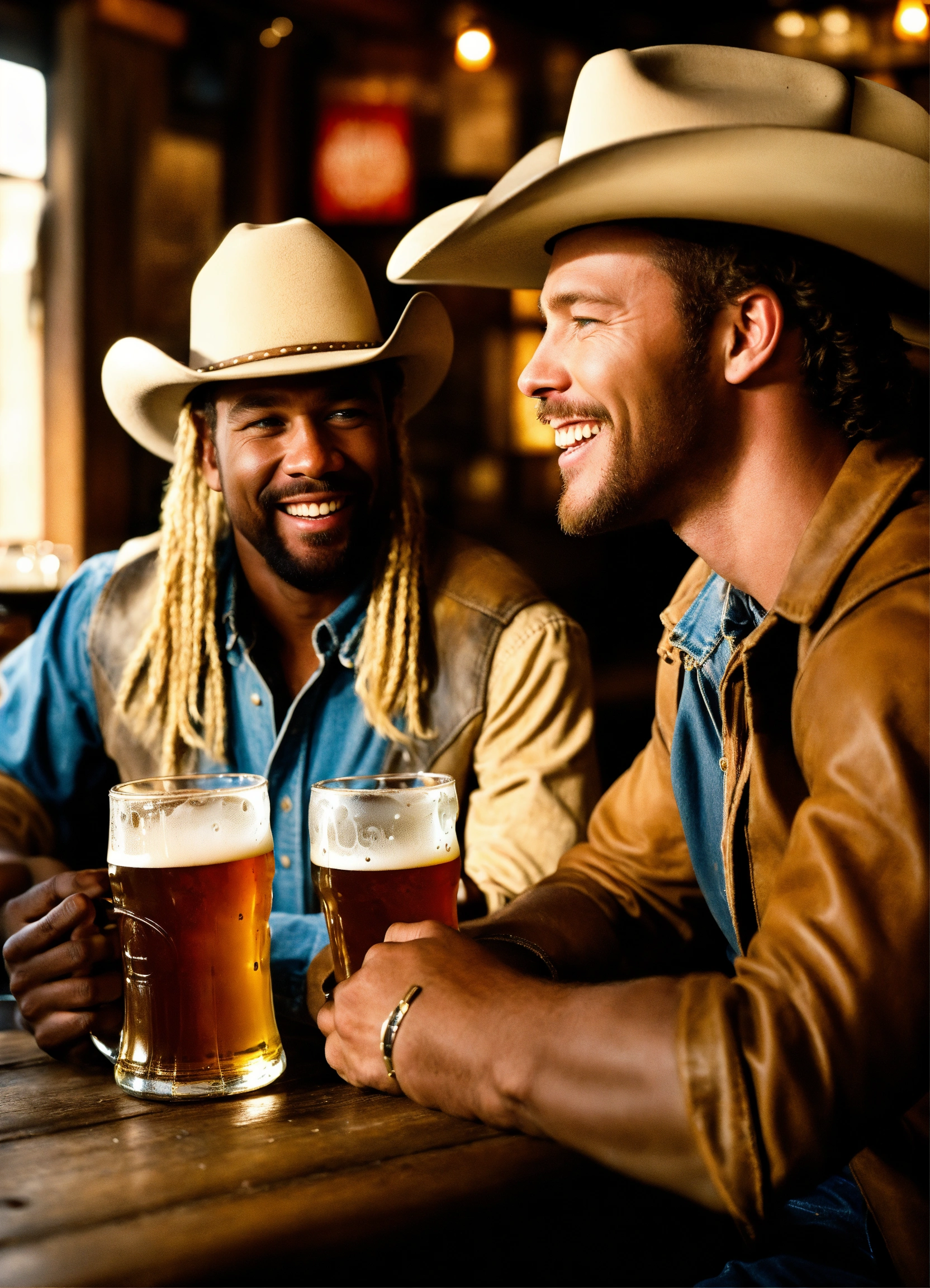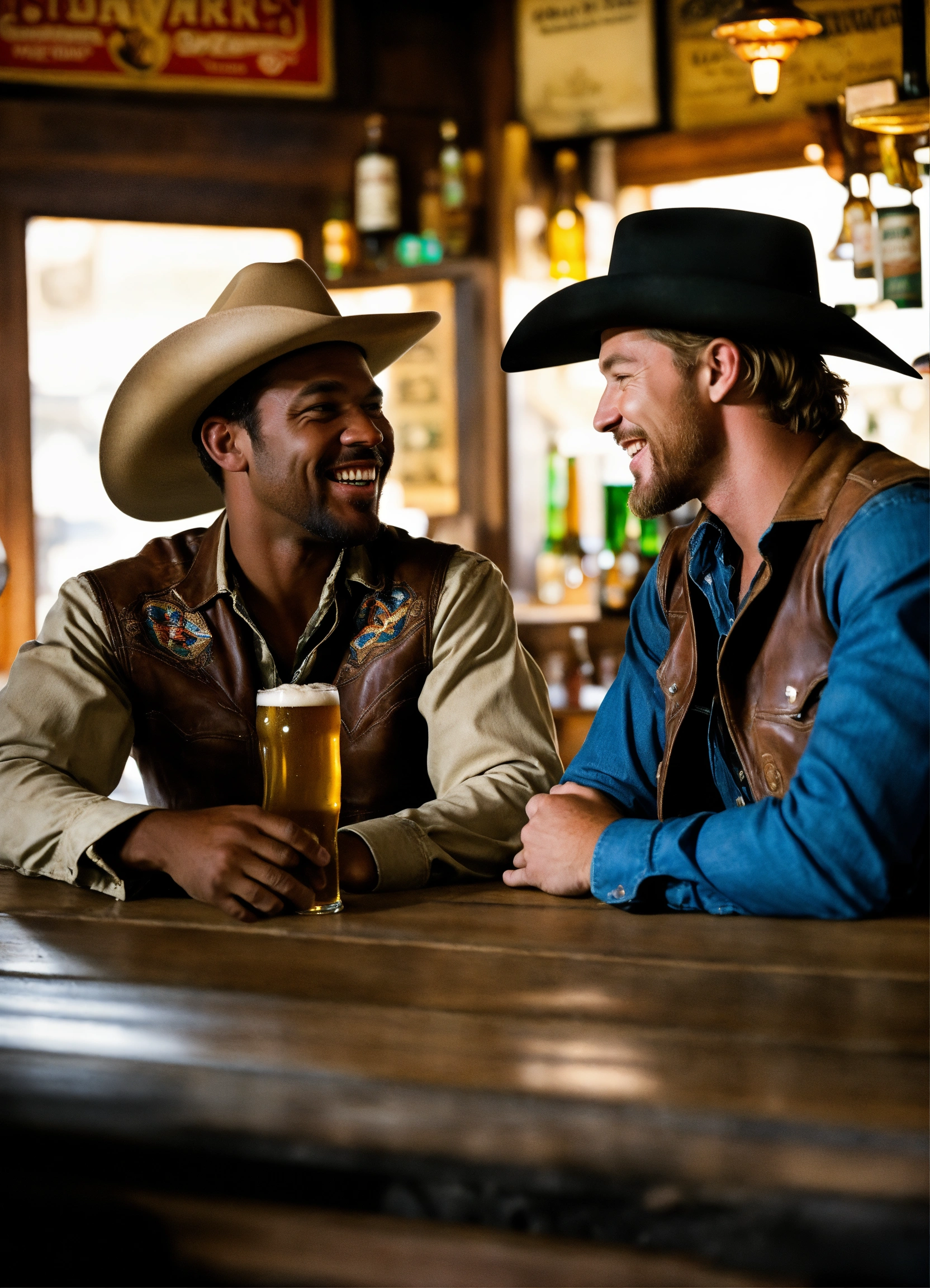 An african american cowboy, and a white skinned, blond haired, blue eyed caucasian cowboy, sit at a old western bar together as friends, they are talking and laughing while they have a beer together.