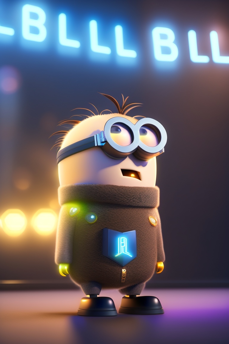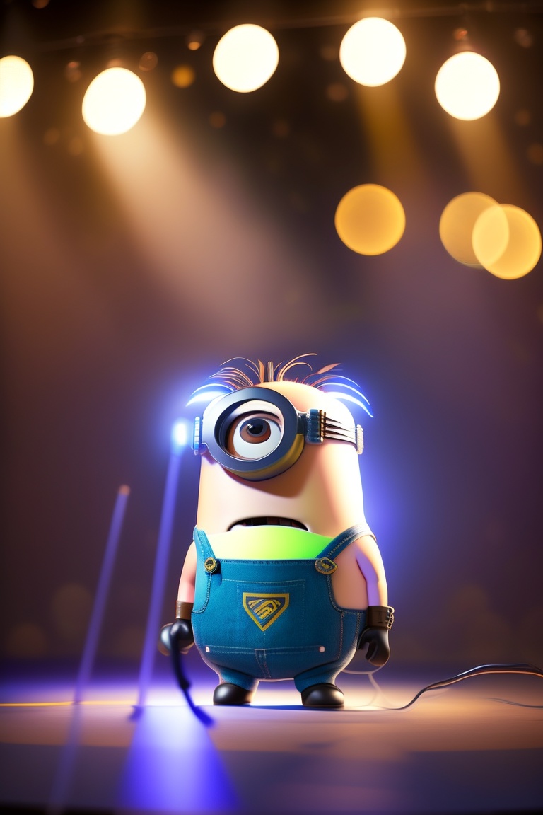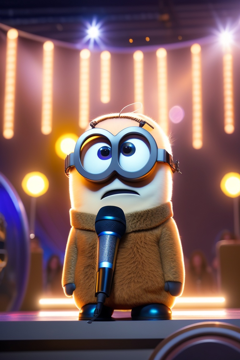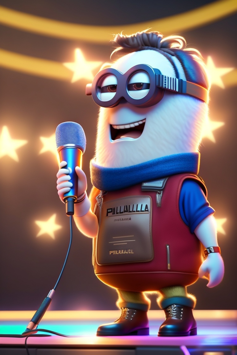 I want a minion, with long curly brown hair, freckles on his face, glasses and a microphone in his hand, stands on a stage decorated with lots of lights. in the background there is a sign that reads ''pilar brualla''.