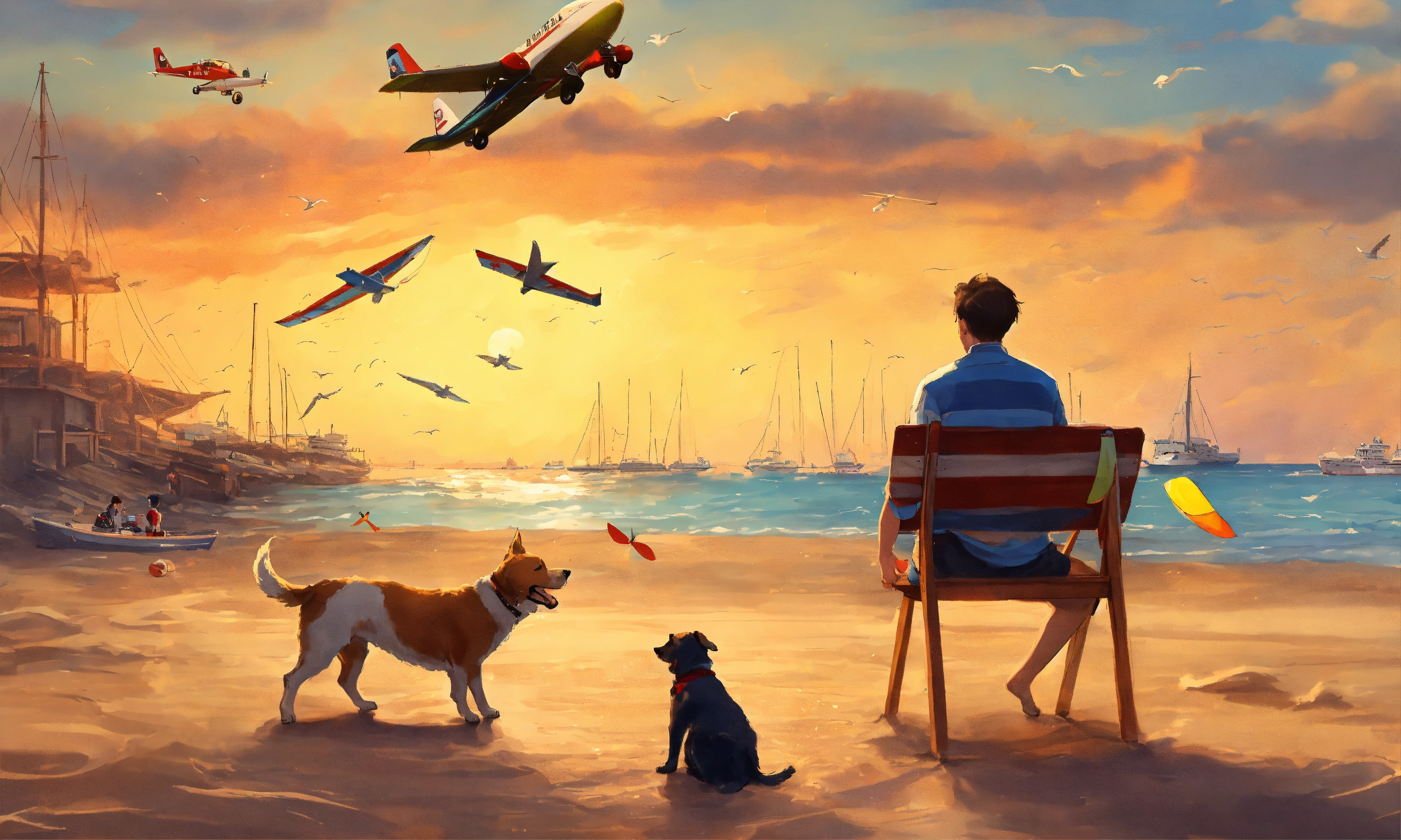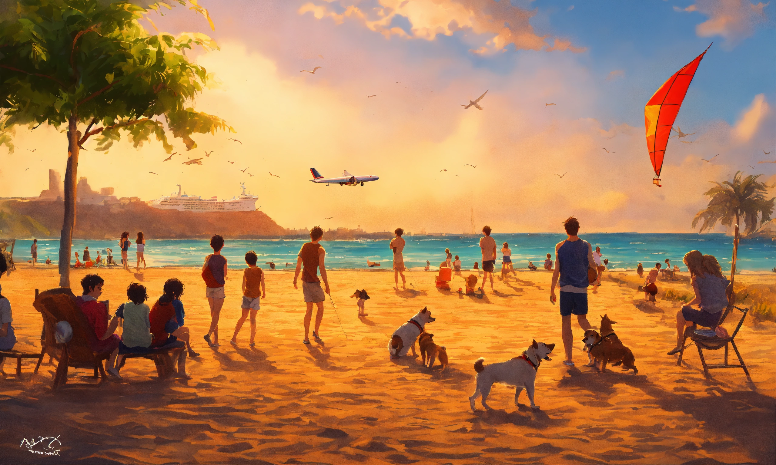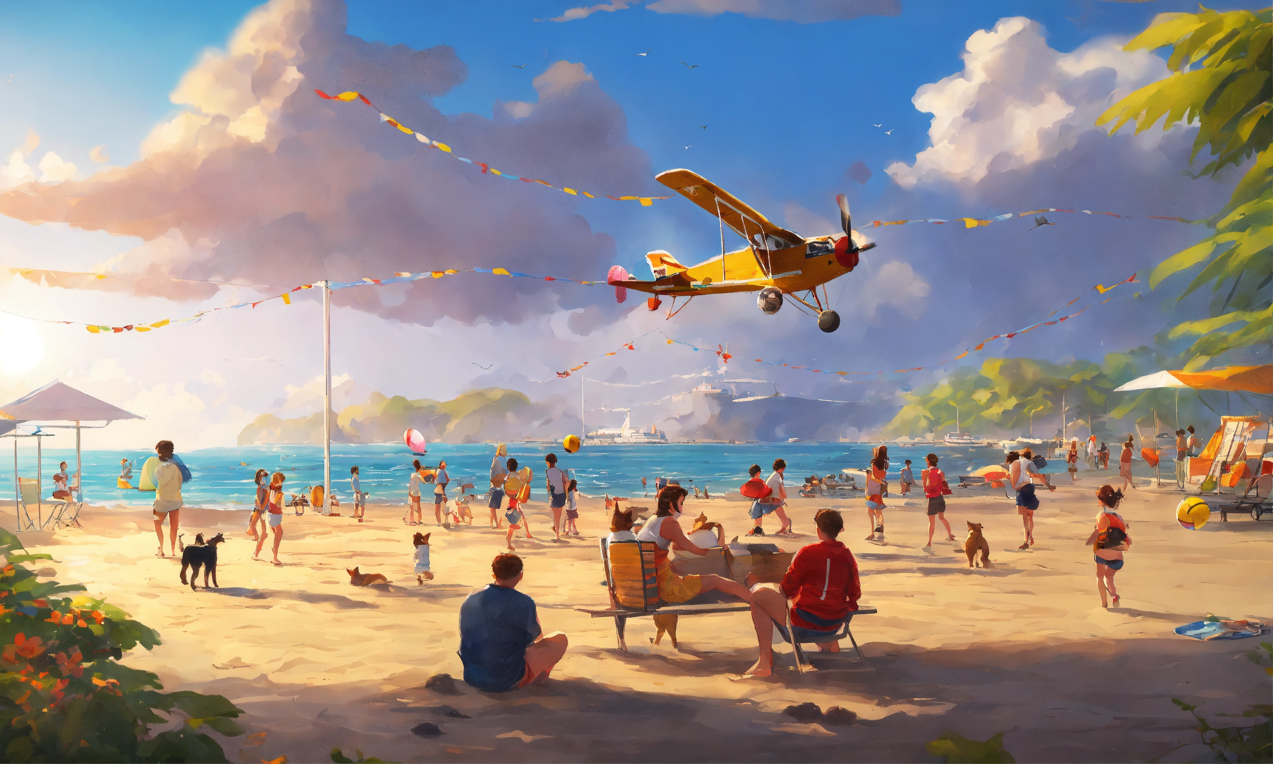 You are sitting on the public beach. meet random dog that came to you, listen how wind become stronger and playing with a small kite, seagulls screaming for food and people walking on the sand. there is cruise ship going to the port and kids playing in arcades behind you. it's already noon and beach is full. kids are playing and big boat coming by. some people behind playing volleyball and small plane fly by near you. you are still sitting. it's evening already and pretty quiet except distant party and crickets. you started a bonfire. and there is distant thunder in the sea. but don't worry it will pass by.