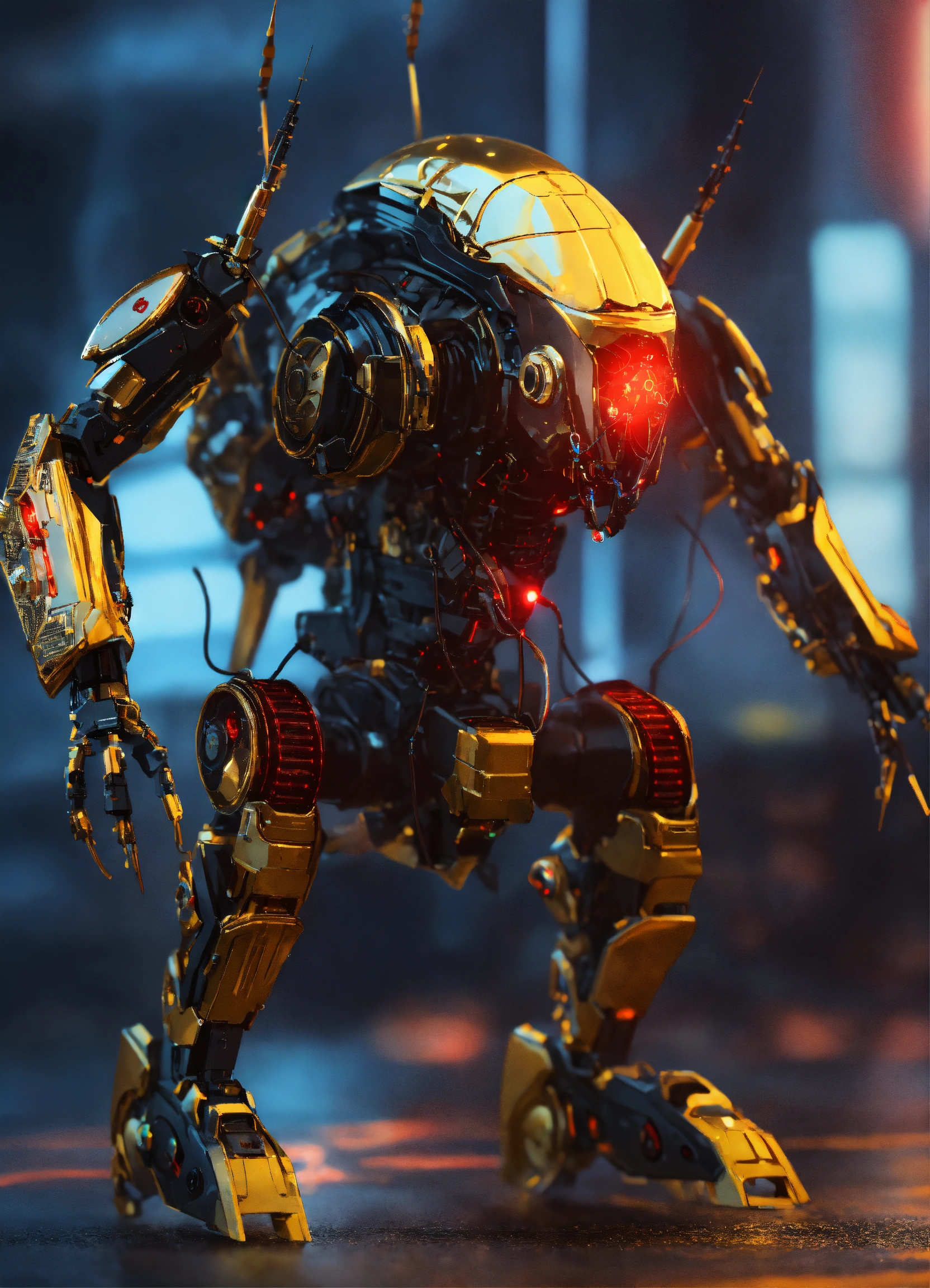 Zoom out of black cockroach faced humanoid biobot with red glowing eyes, detailed gold circuitry on it's armor. standing and shooting electricity from his powerful antenna attacking, realistic, 8k