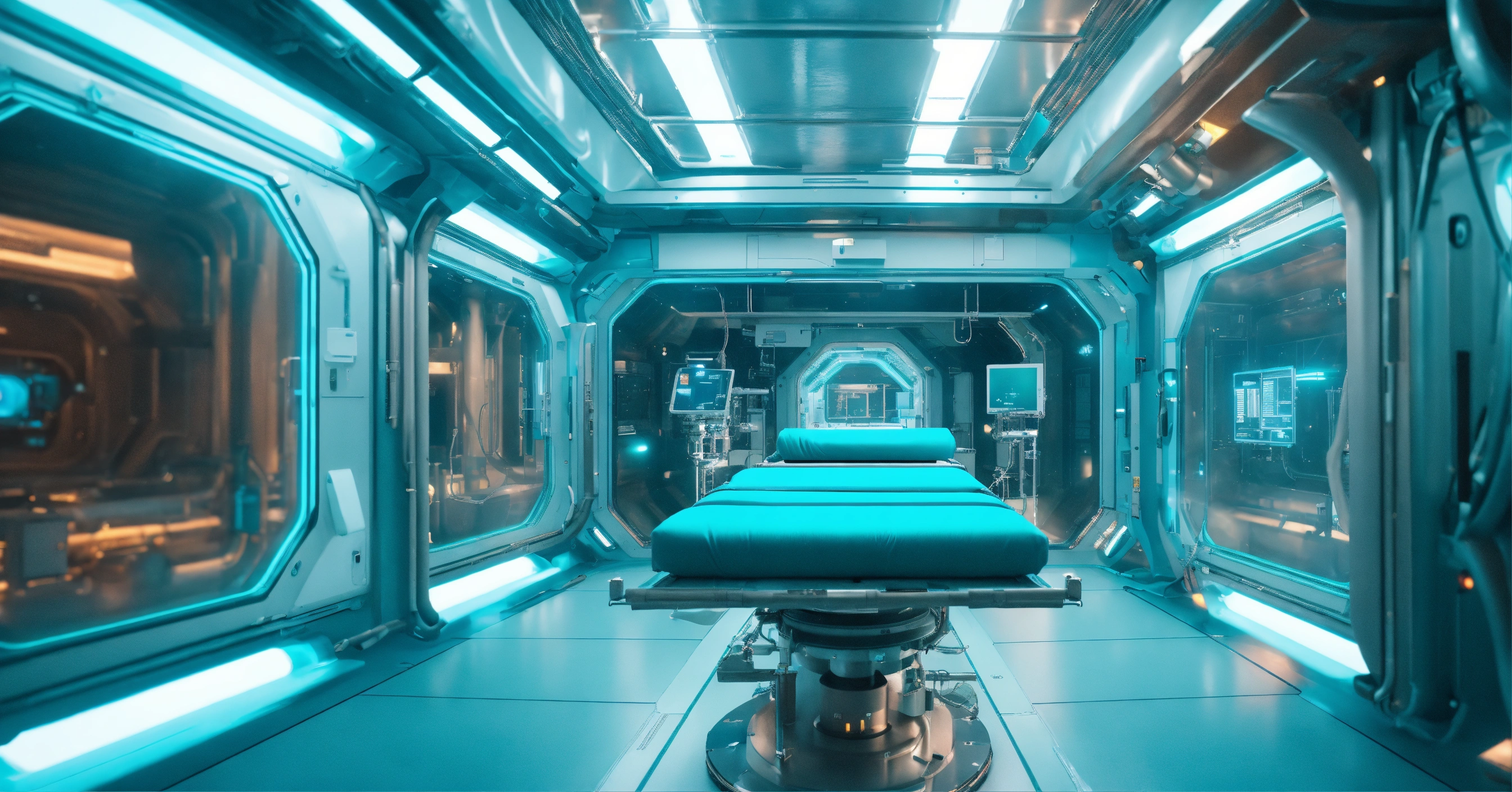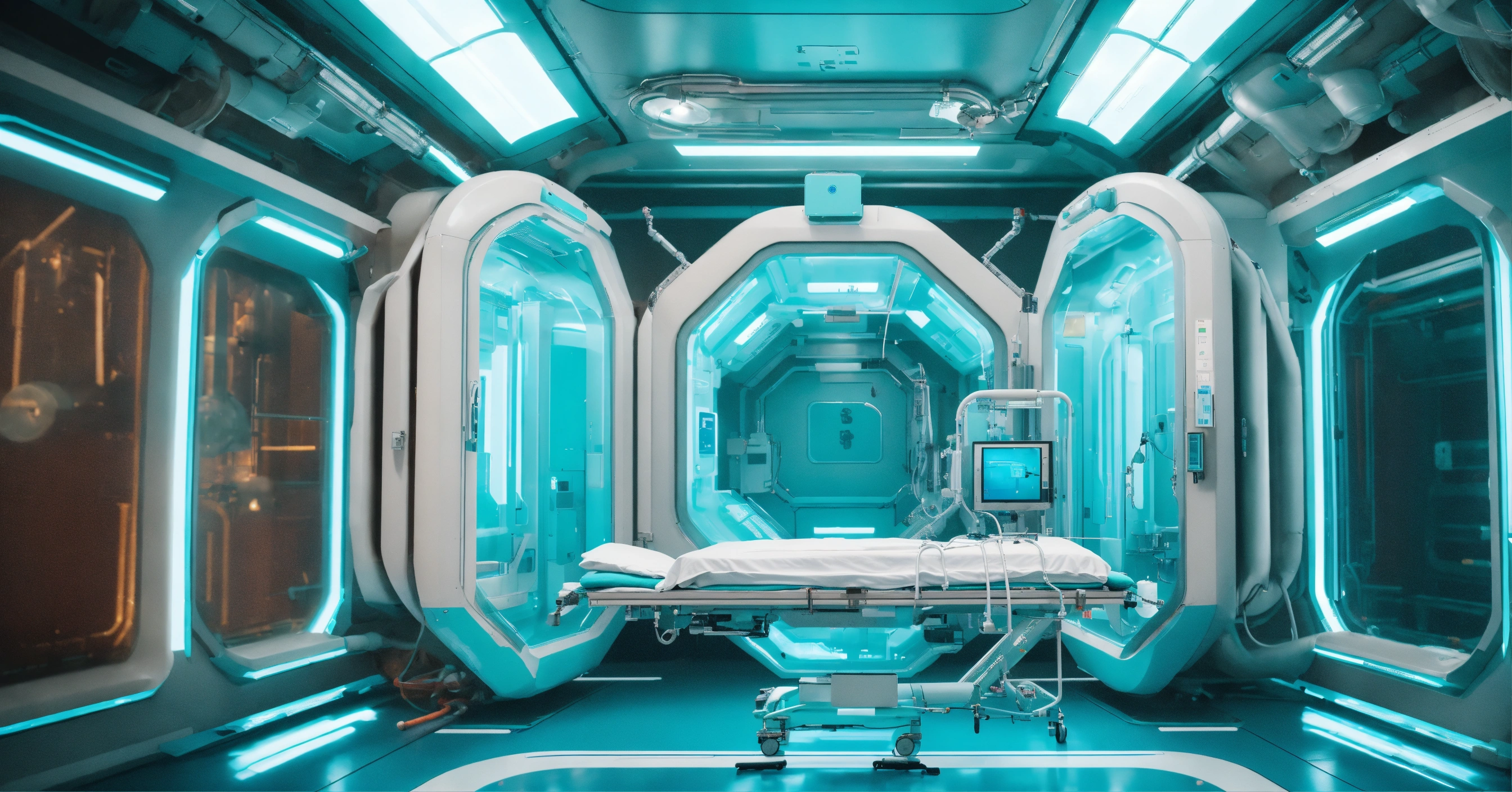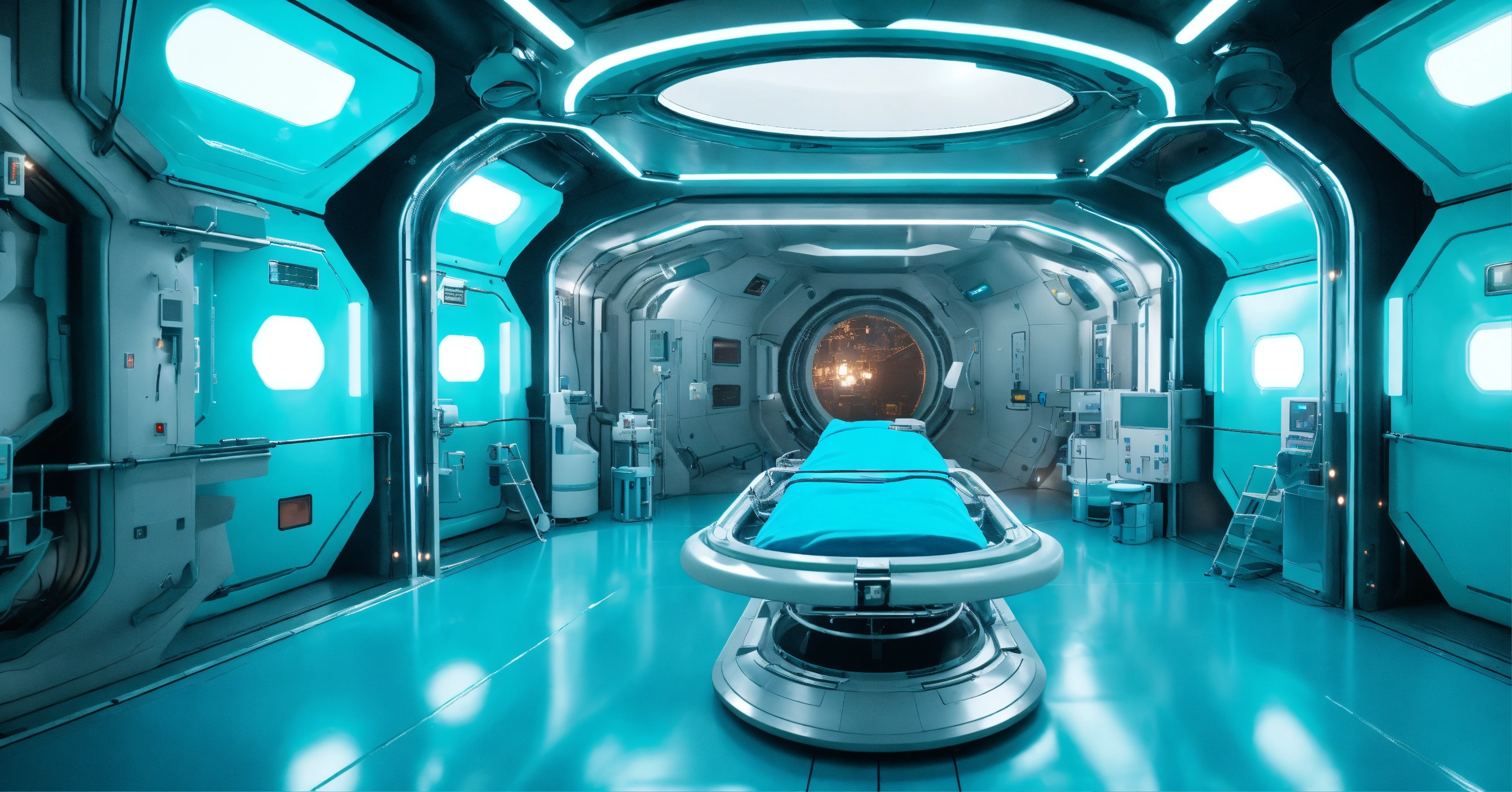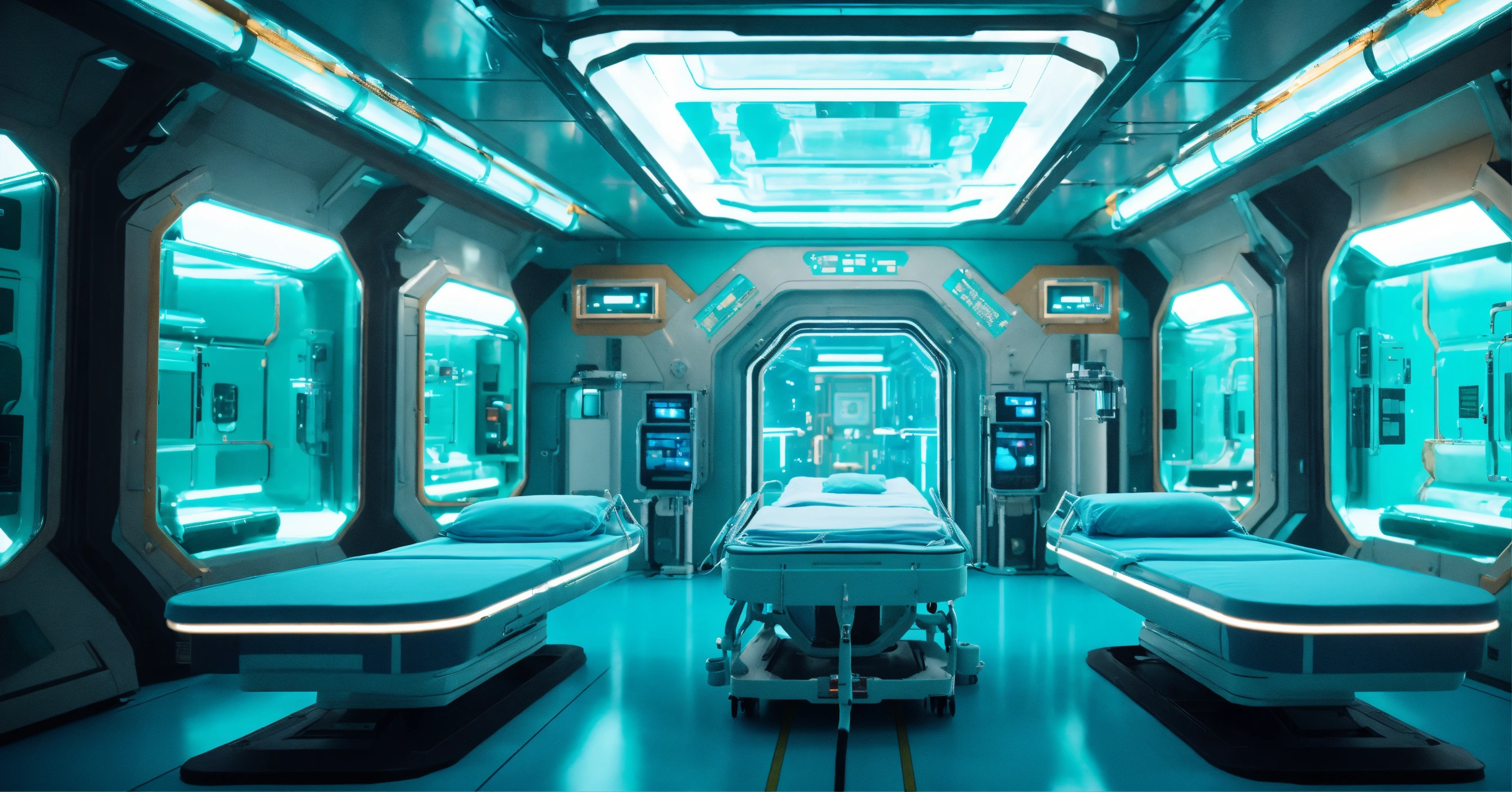 A realistic photo of an advanced medical facility, with stretchers on the sides, with large cylindrical tanks filled with a turquoise liquid, sci-fi, in the interior of space station, hyperdetailed, hyperrealistic, 8k