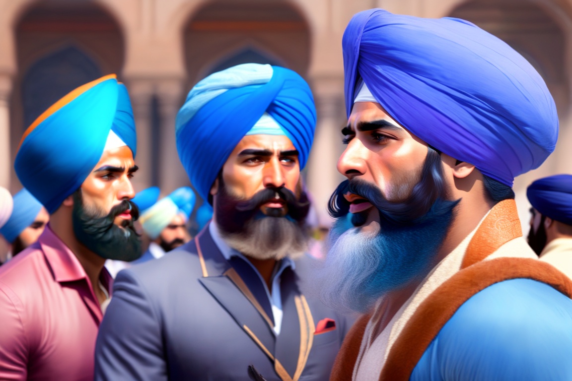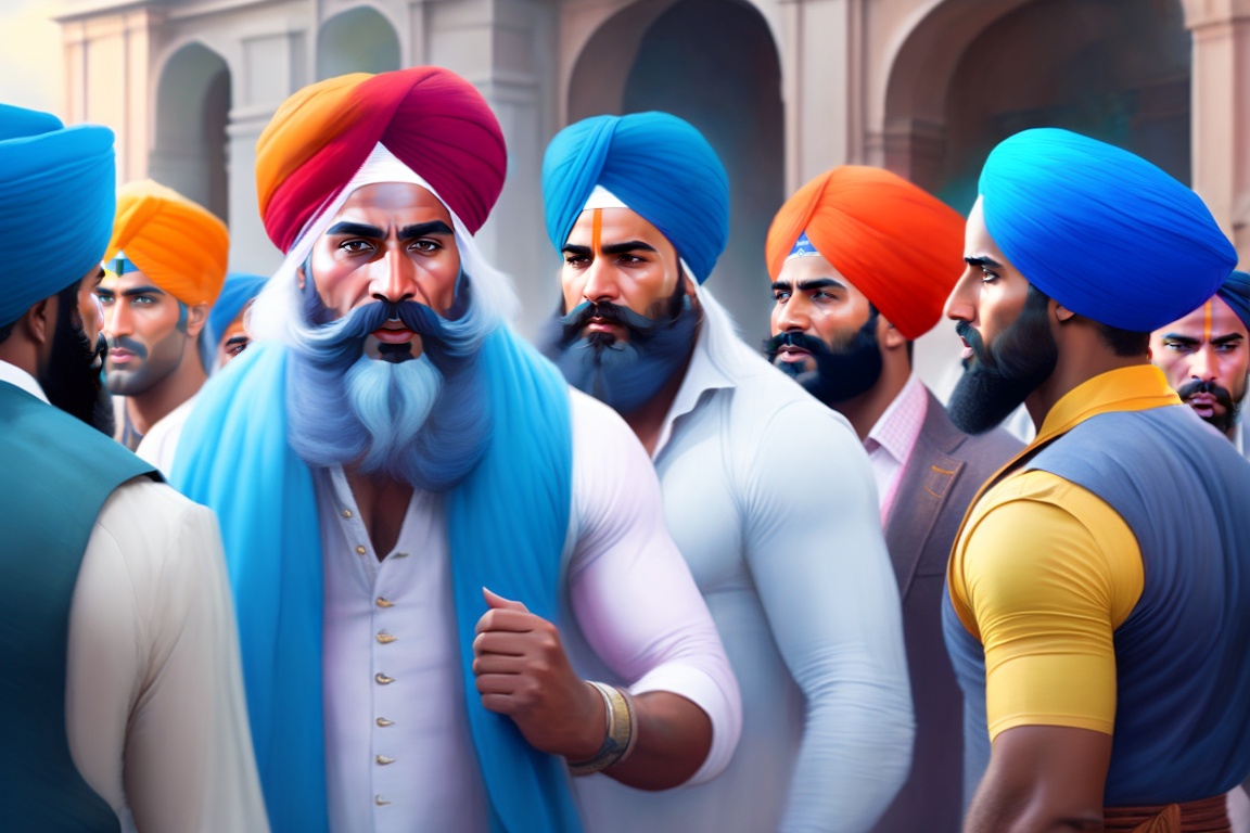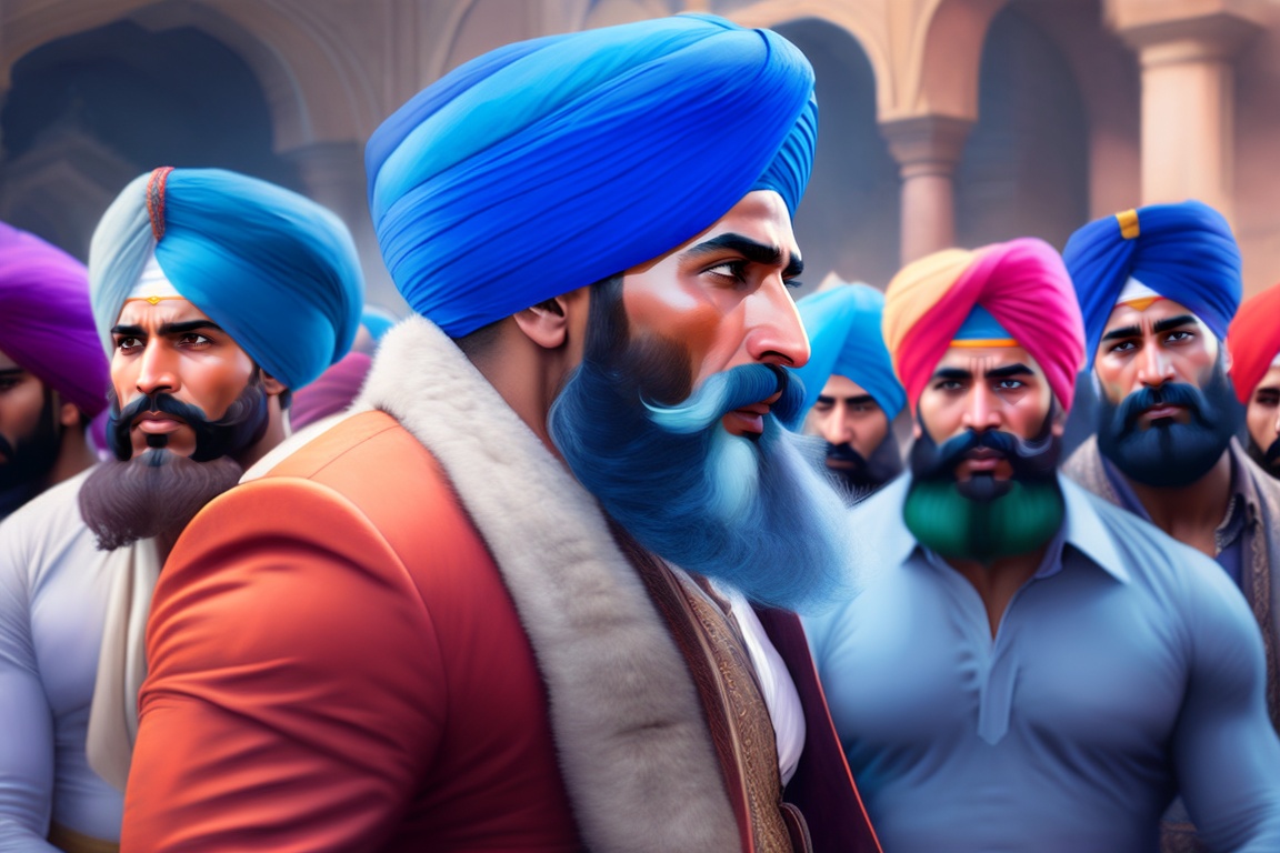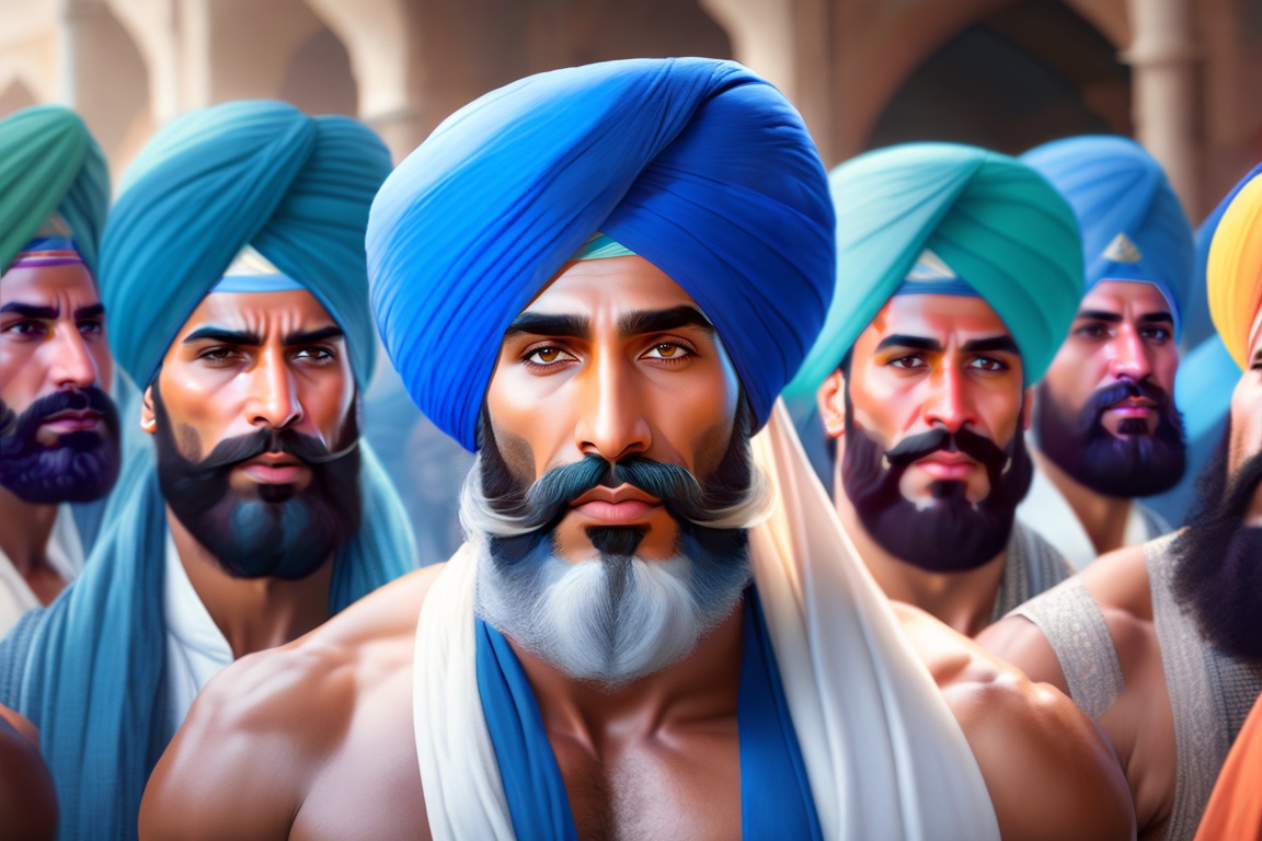 Indian man (sikh) wearing a blue turban and sporting a beard, resembling christopher lee, addressing a group of other indian men. the scene of ancient india. no jewelry, no bindi. hyper realistic, mega b00ty, ultra hd! editorial, iso 400, 8k, character design, digital painting, trending on artstation, sharp focus, illustration, art by artgerm, viktoria gavrilenko, steve zheng, terry rogers.