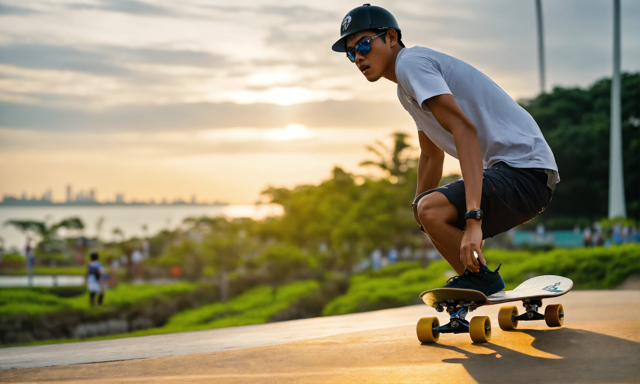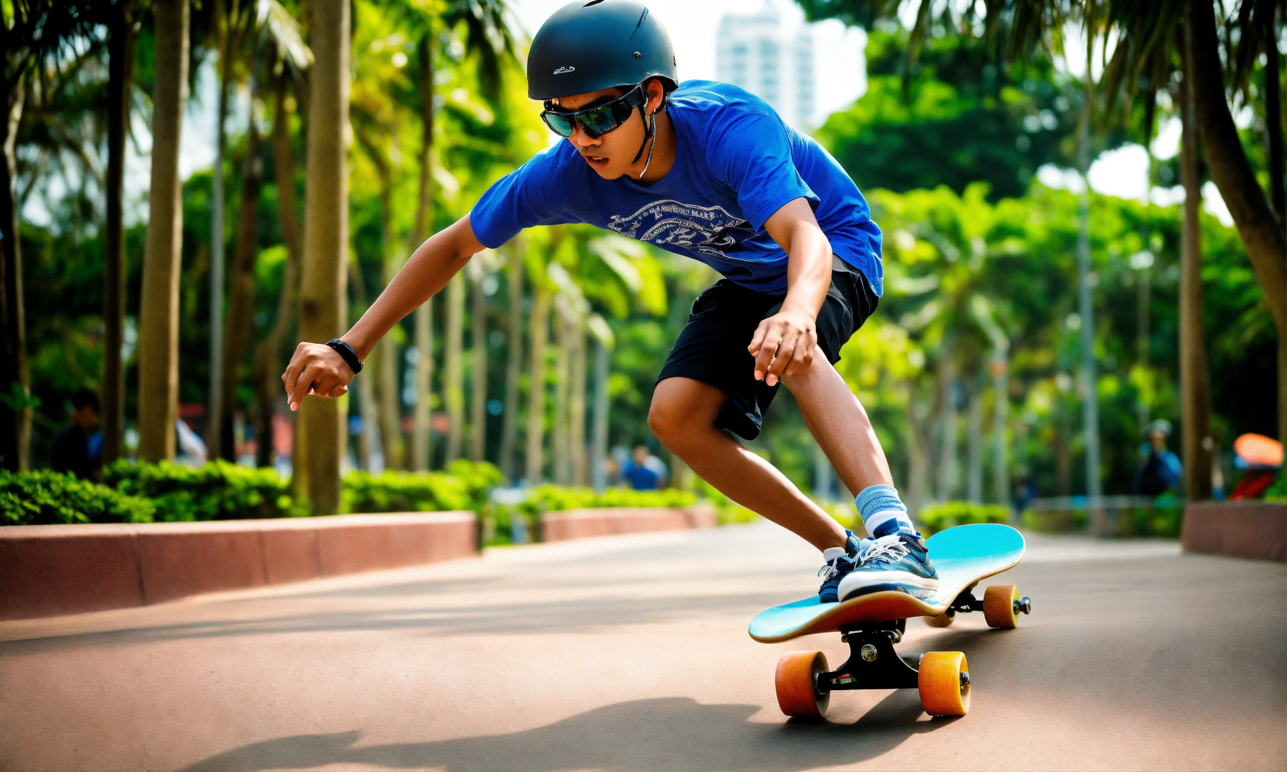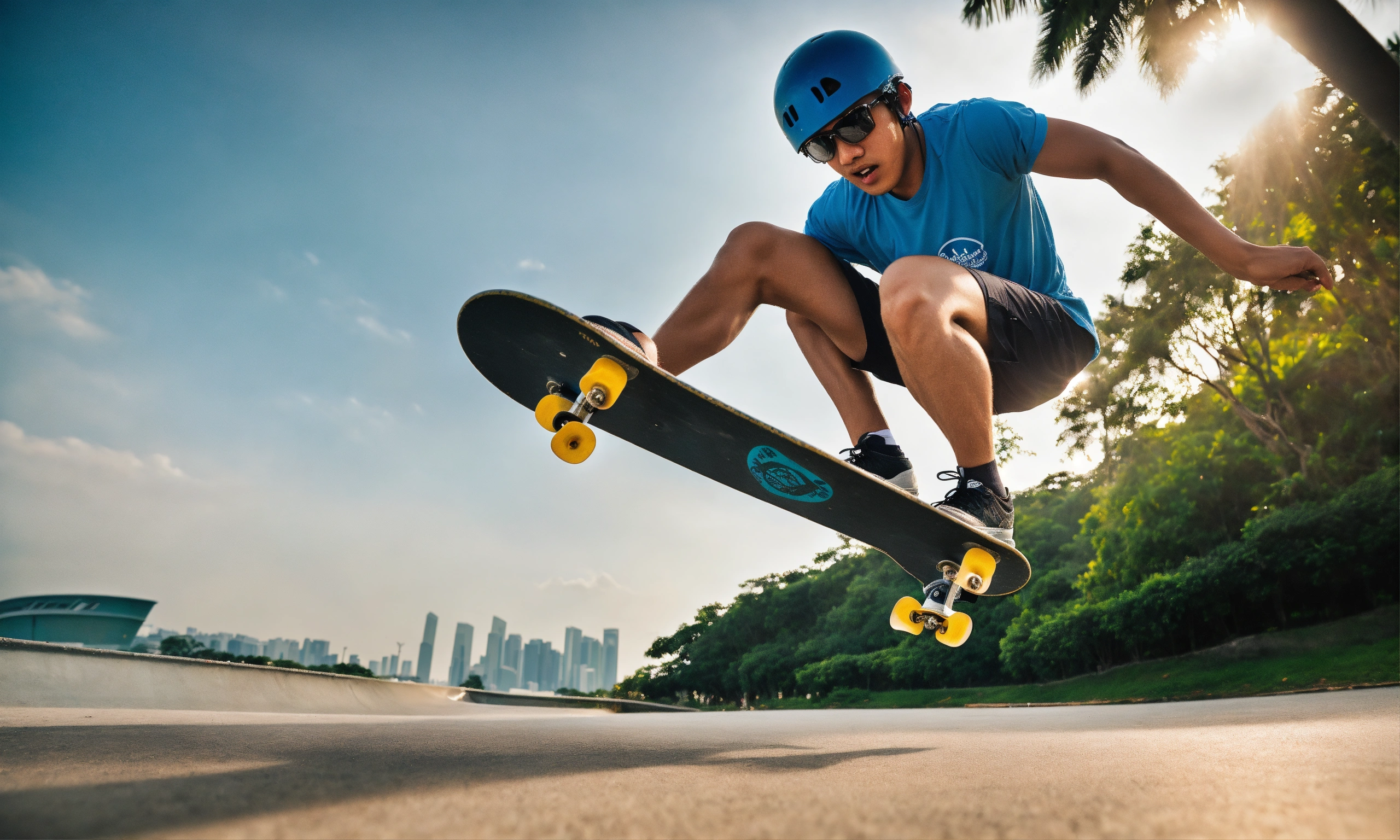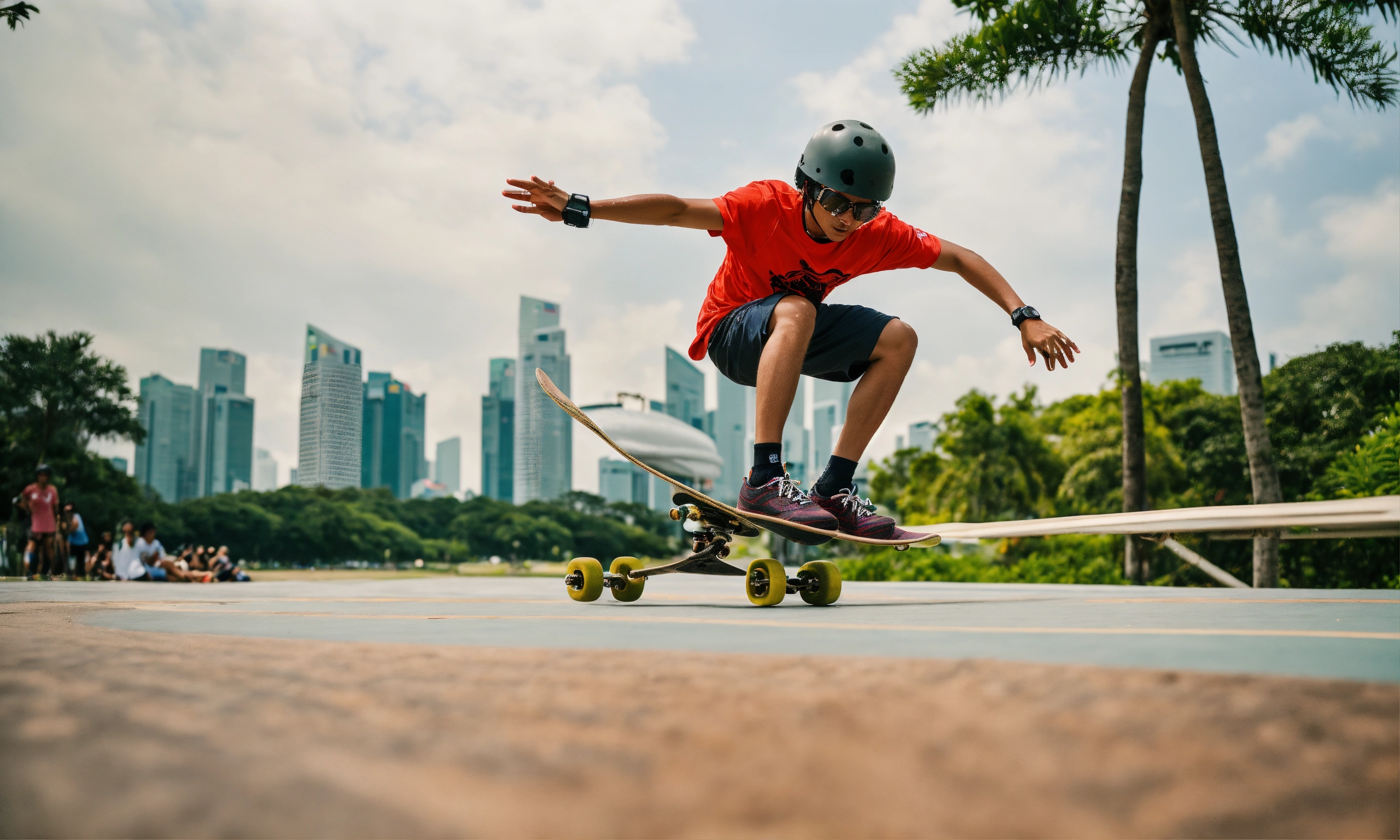 Day, ultra-realistic photo, cinematic quality, close-up action shot at singapore's east coast park, singapore, the backdrop showcases the iconic scenery of the park. main focus a 18-year-old malay skateboarder with helmet and sunglasses in mid-air executing a challenging trick, his body contorted in concentration. intense focus radiates from his eyes, sweat glistening on his brow, exuding raw passion and unyielding perseverance; clothing contemporary skateboarding attire including protective gear, a t-shirt, shorts, and sneakers. expression grit and determination, a testament to his dedication to the sport. themes modern nostalgia, overcoming adversity, dynamic lighting emphasizes the contours of his face and body against the backdrop of east coast park, 50mm camera lens producing sharpness with a blurred background, portra 400 film, subtle film grain adding depth and emphasizing the raw energy of the moment.