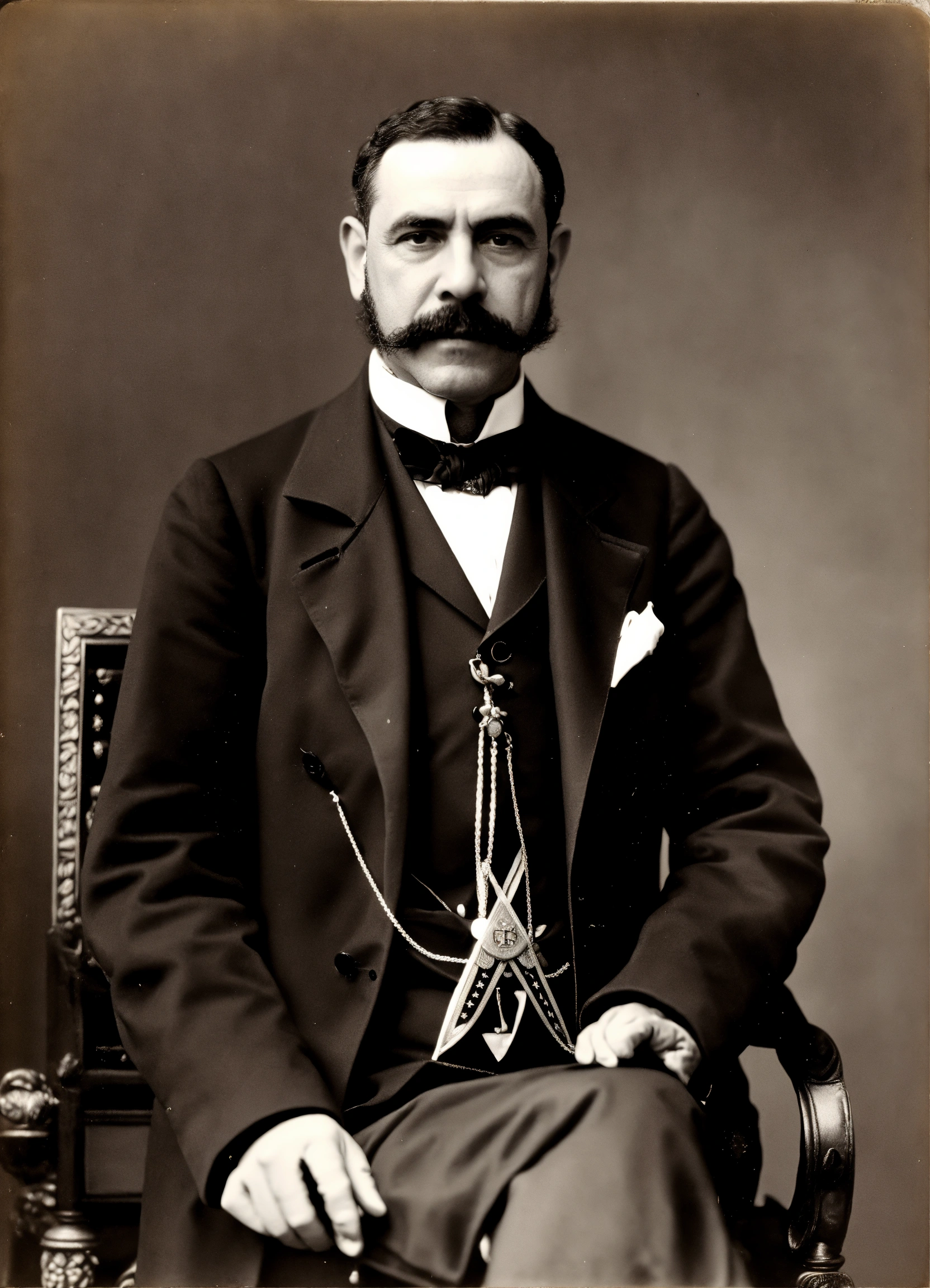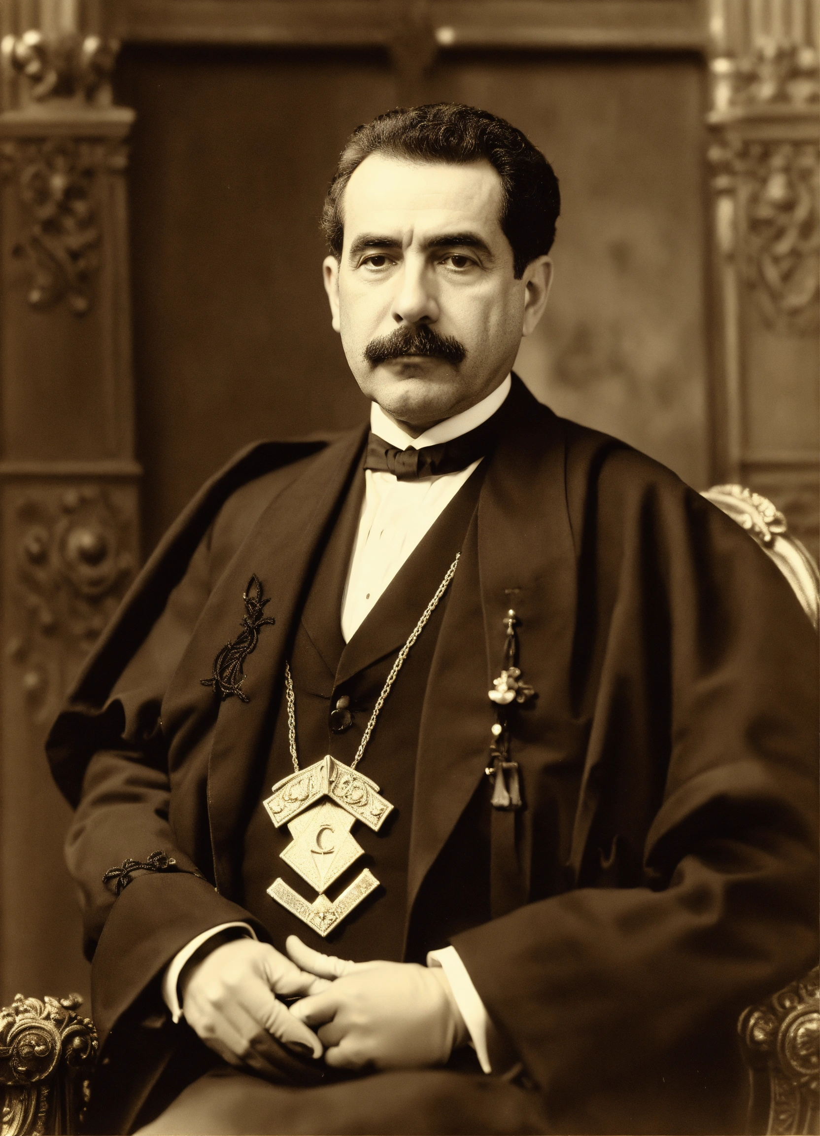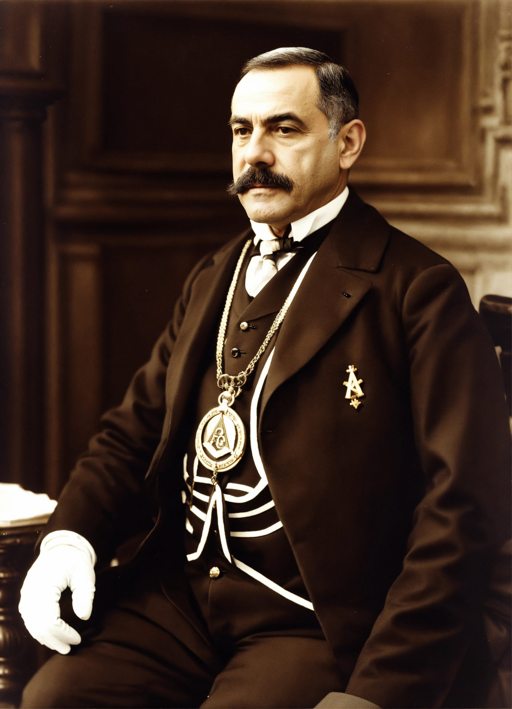 Félix crespo, the psychiatrist from murcia, standing, wearing a masonic apron, as a freemason of the grand orient of france, dressed in a black suit and white gloves, in a black and white photograph.