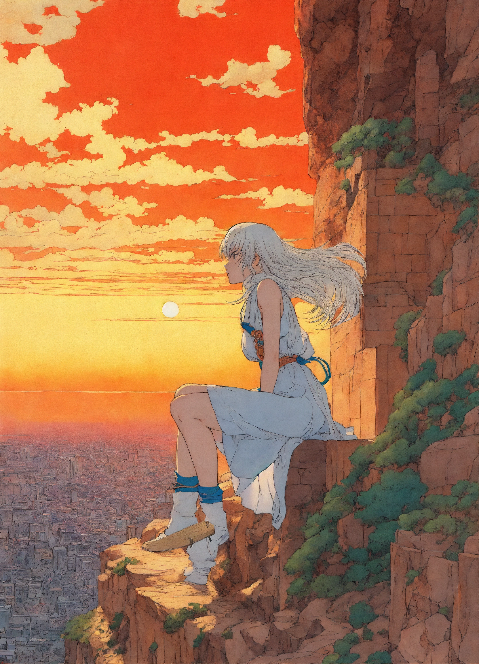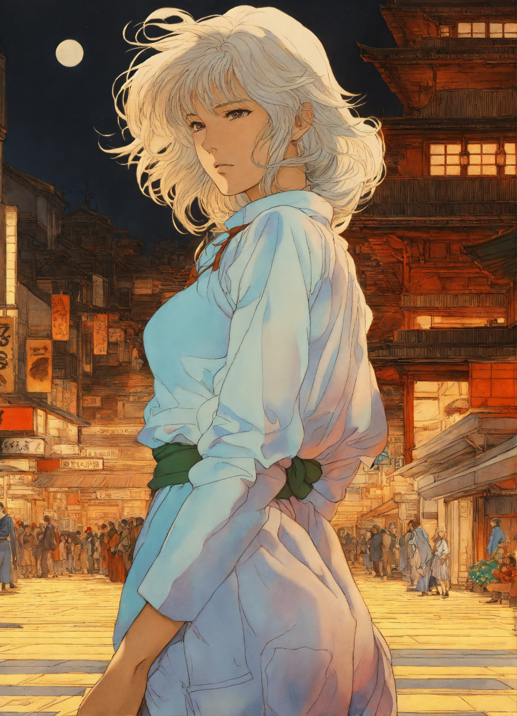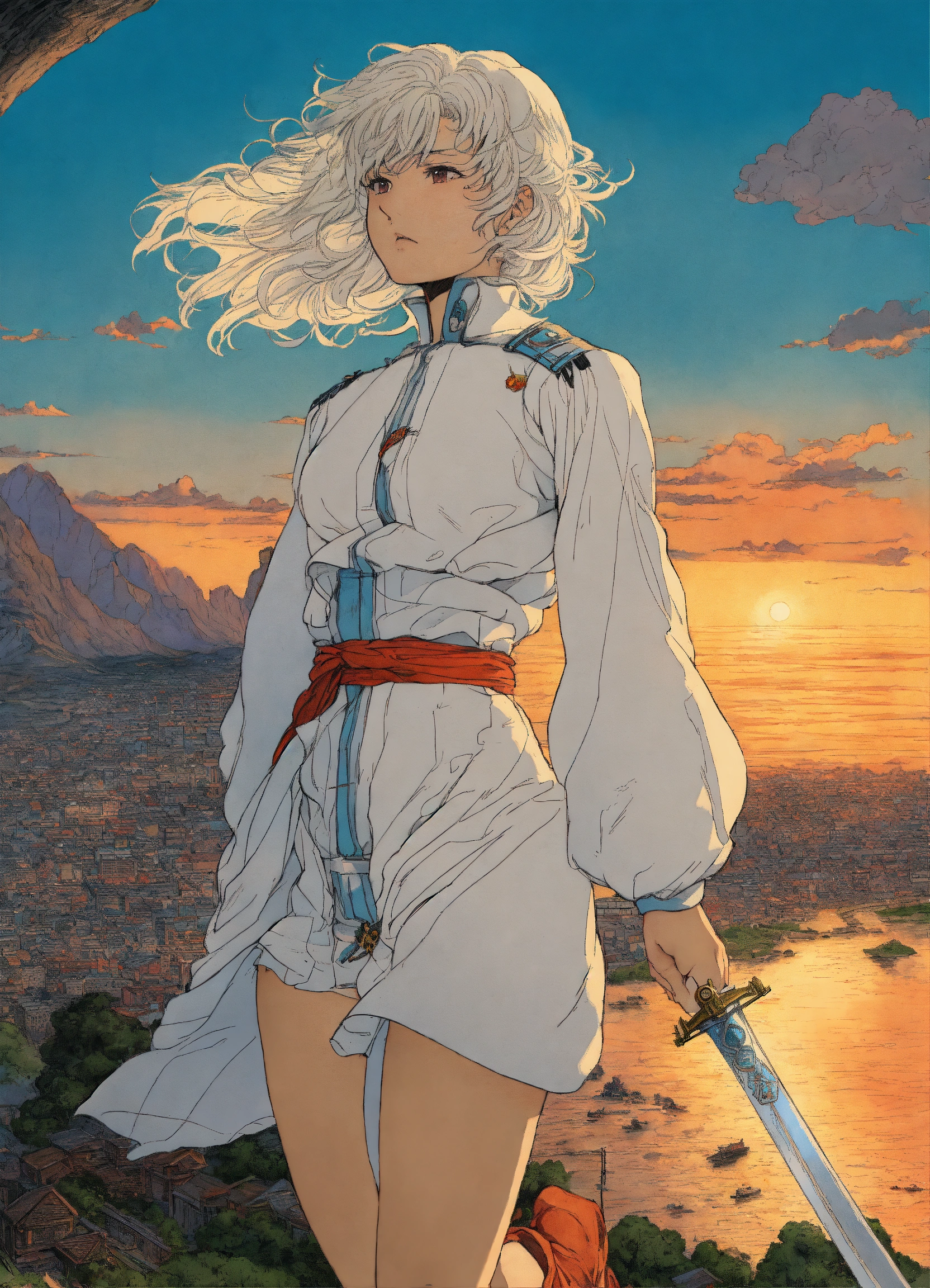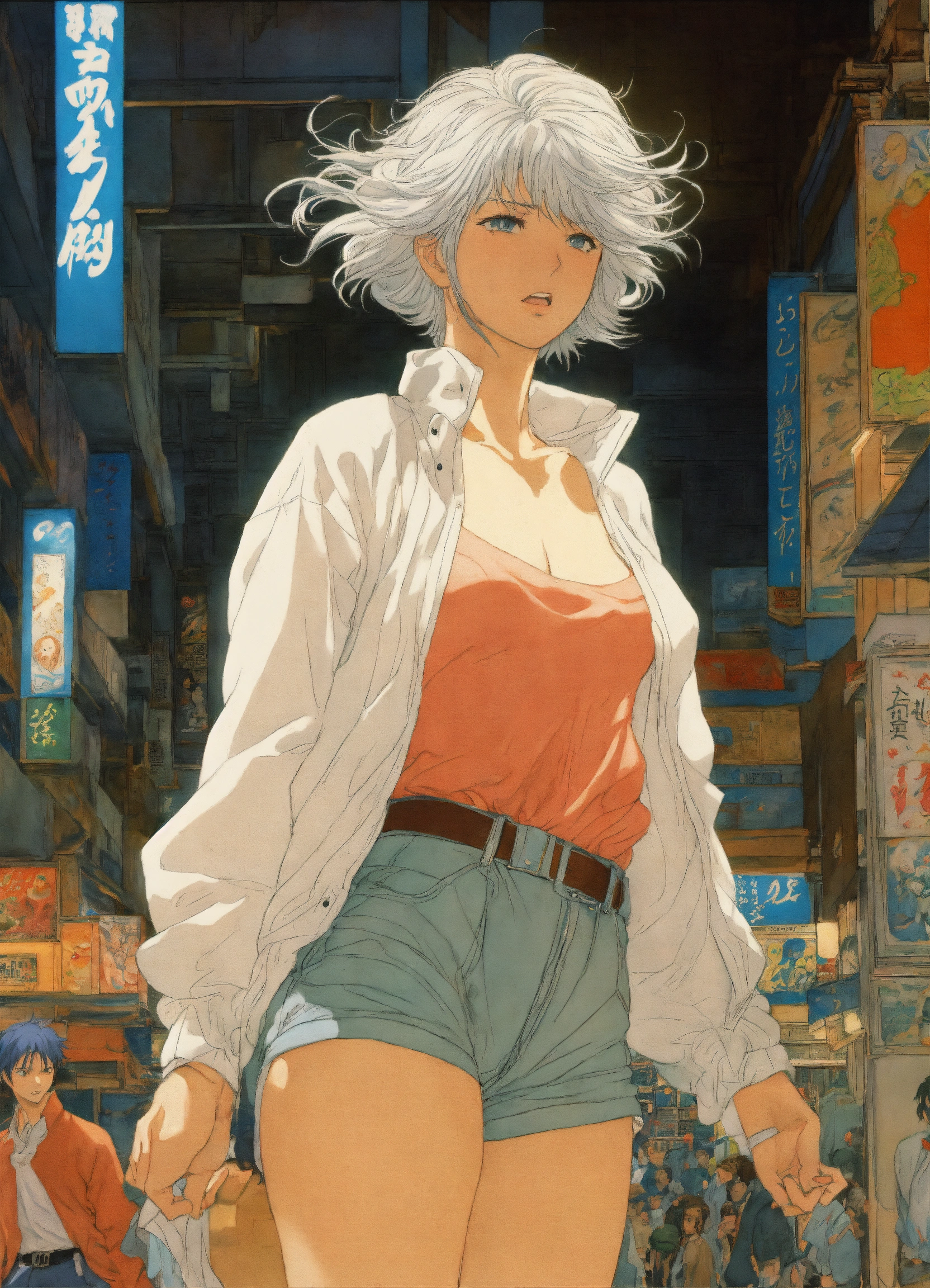 Body shot, dynamic pose, hyper detailed manga anime cel art, final fantasy fanart, young woman, griffith, abducted identity, geek, 80s, by hasui kawase, moebius, epic scenes, action scenes, emotional scenes, inspired by yoshitaka amano and takato yamamoto, vivid and vibrant, anti