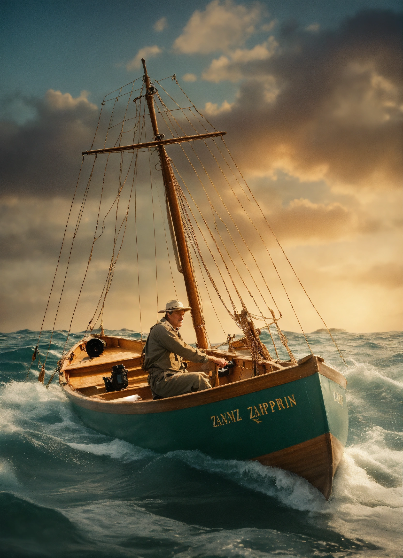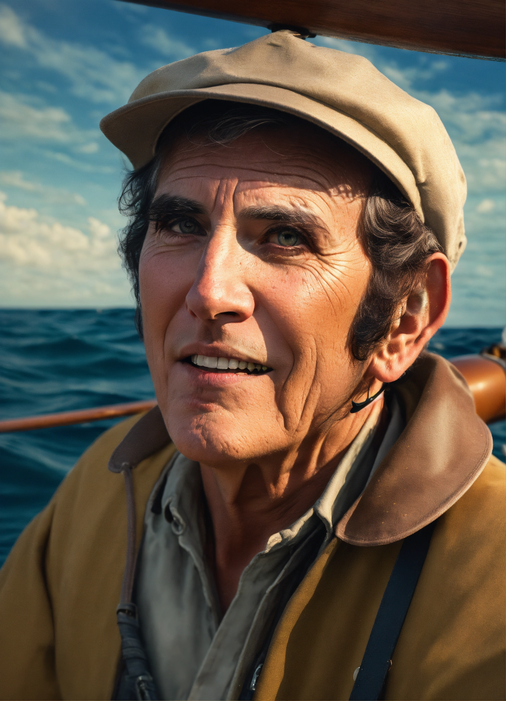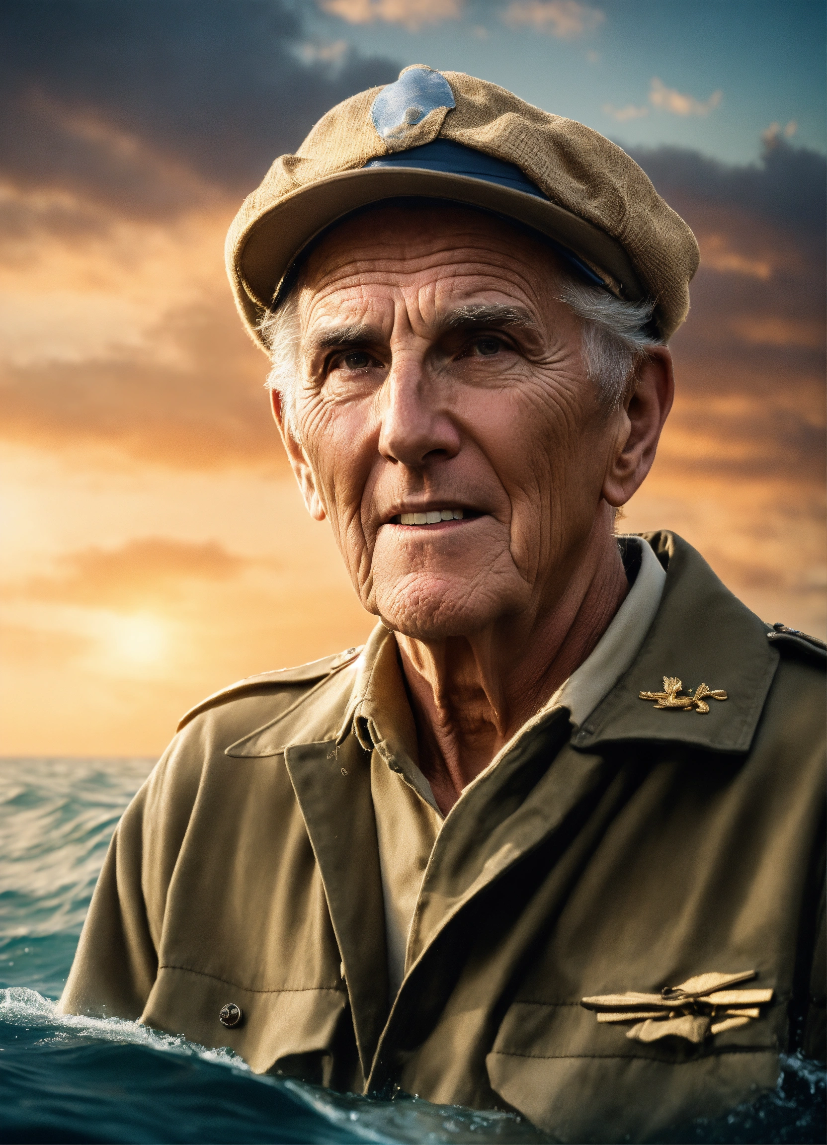 "louis zamperini, in a boat in the middle of the ocean for 47 days. type of image photograph, art styles photorealistic, art inspirations getty images archives, camera close-up, lens ee 70mm, shot frontal view, render related information 4k resolution, studio lighting focusing on the subject, sharp focus with a slightly blurred background."