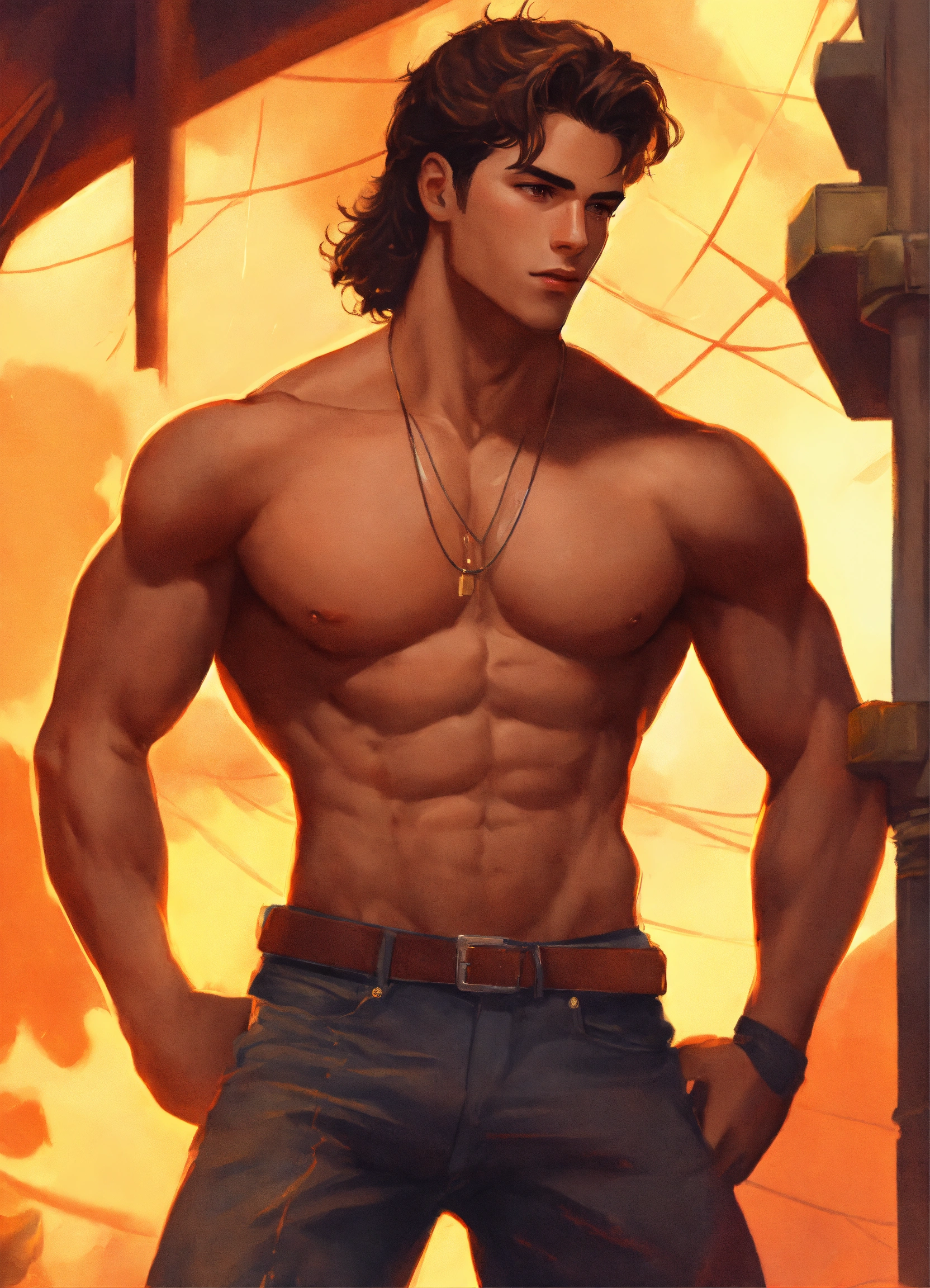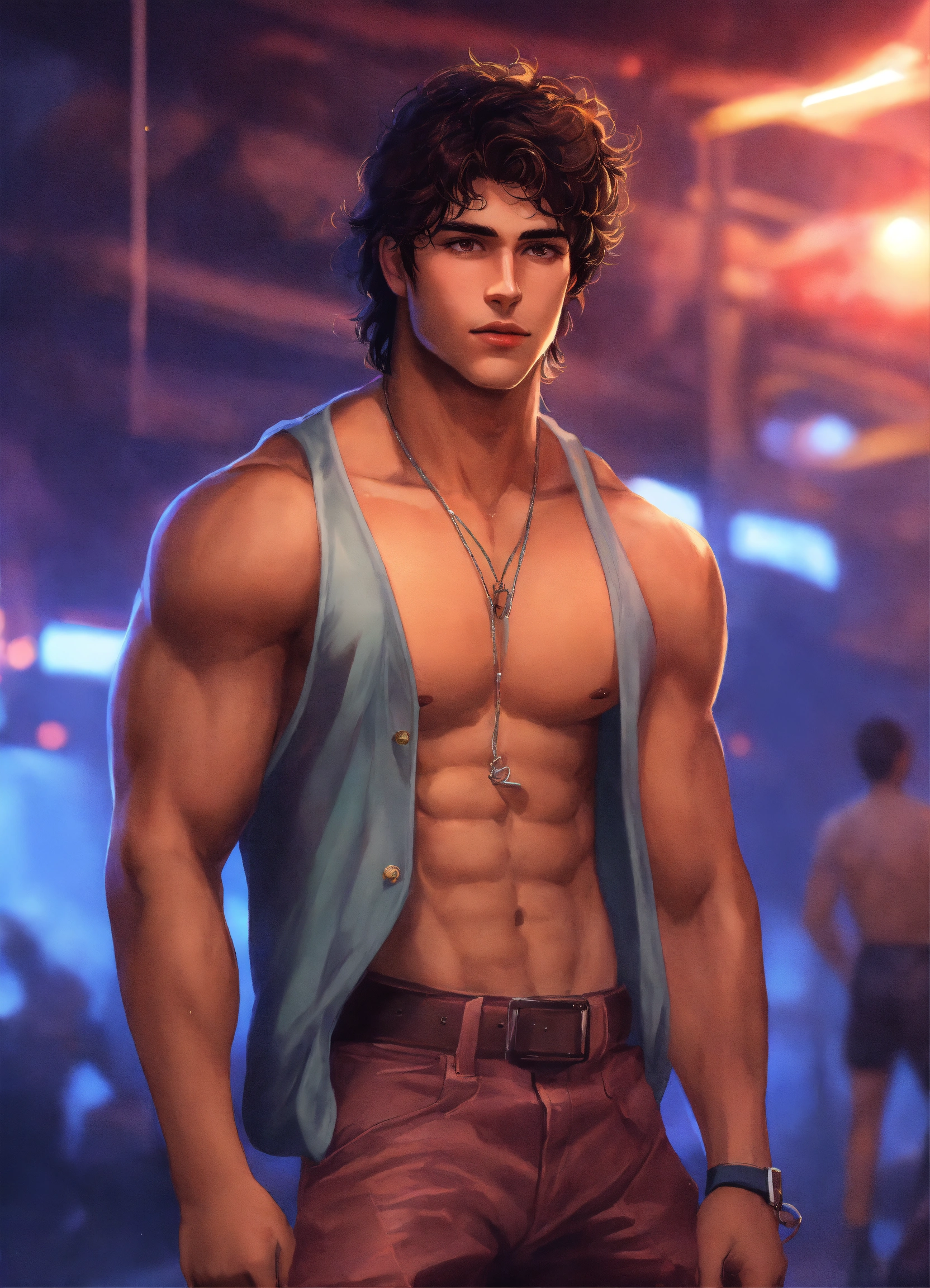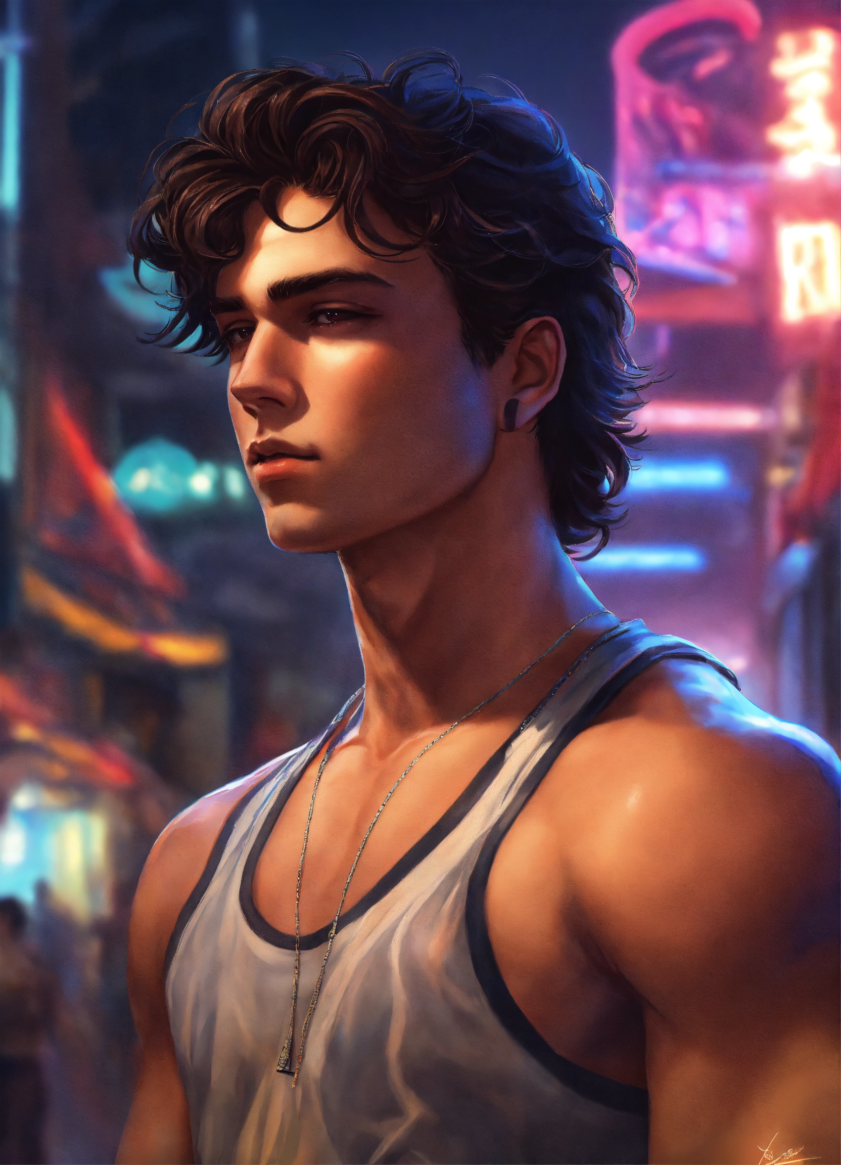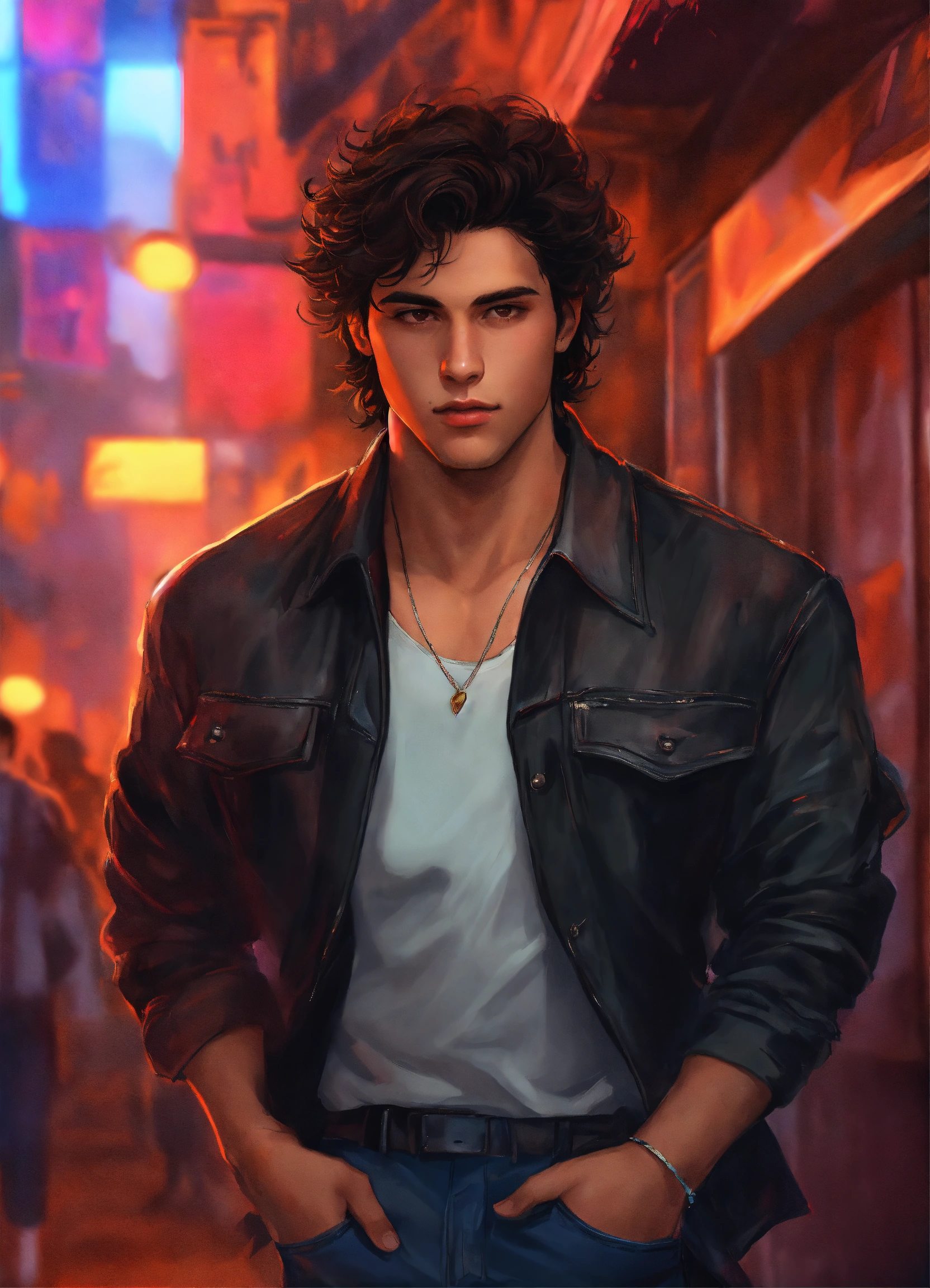 22-year-old man with dark brown hair, athletic body type, late 80s bad-boy fashion, himbo energy, realistic digital art, fantasy