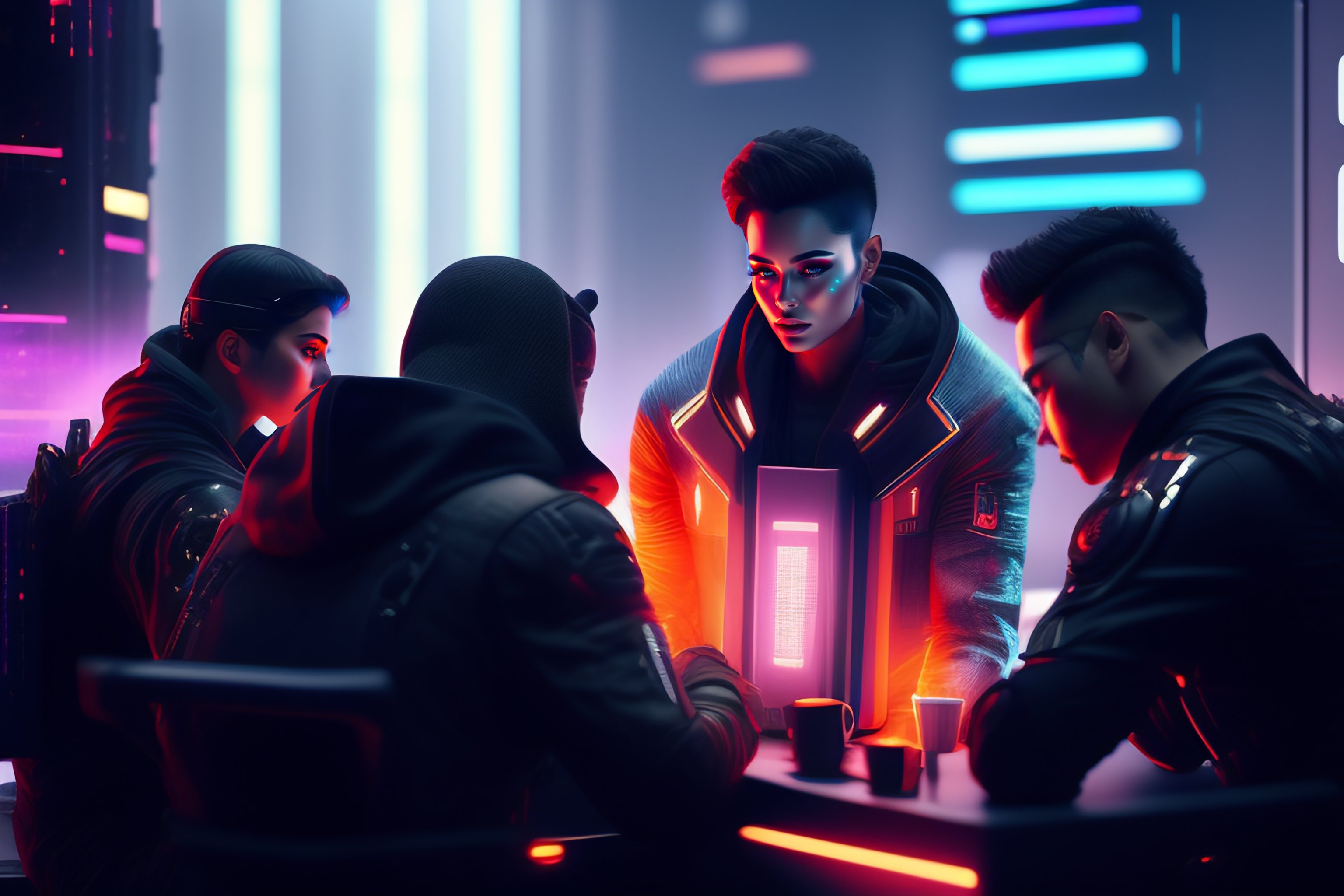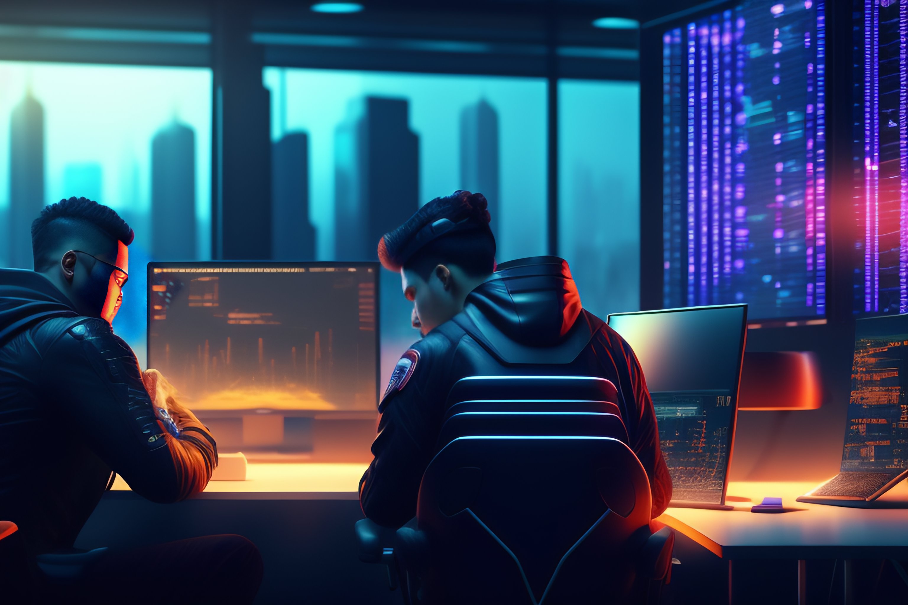 Hackers team working with computers, technology, holograms, youngs, woman and mans, futurist, cyberpunk city, render hq, 8k