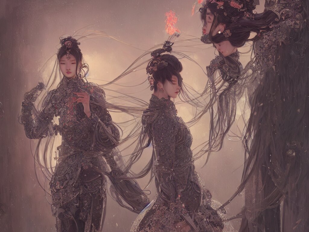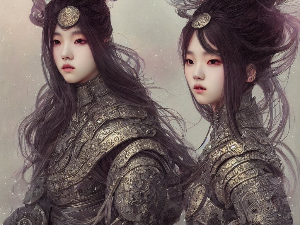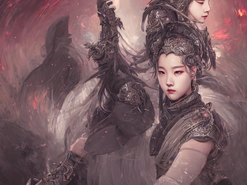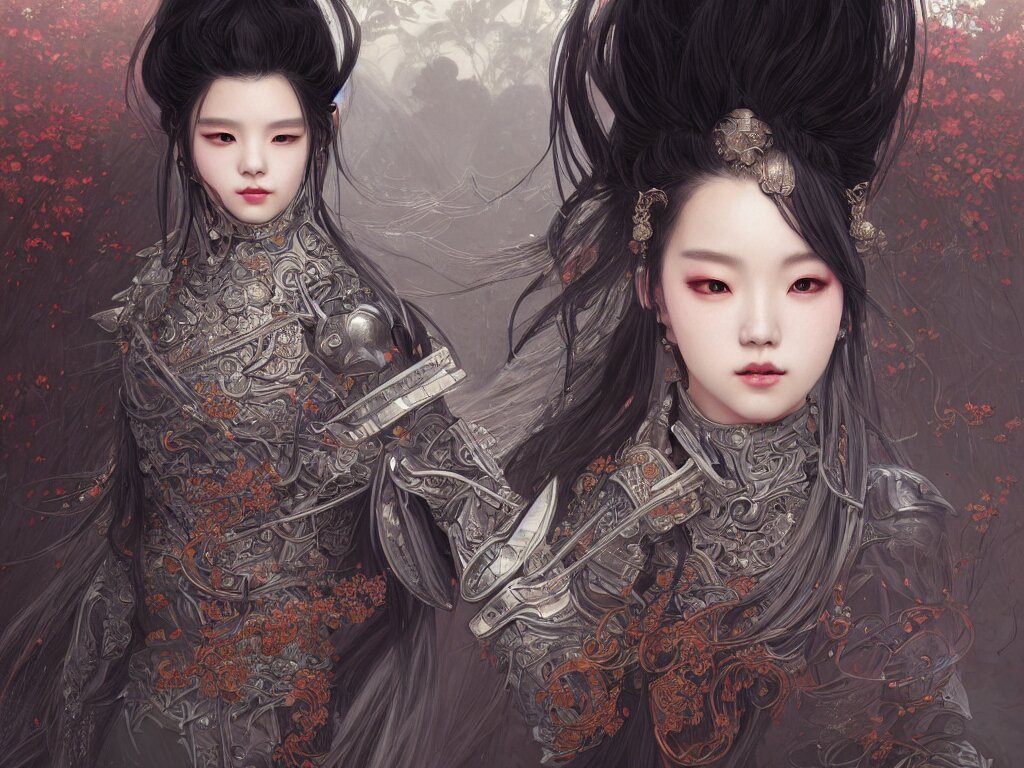 Portrait jisoo blackpink, grey hair armored samurai clothes, in fire japanese temple wet night, ssci - fi and fantasy, intricate and very very beautiful and elegant, highly detailed, digital painting, artstation, concept art, smooth and sharp focus, illustration, art by tian zi and wlop and alphonse mucha