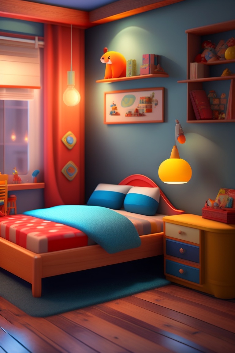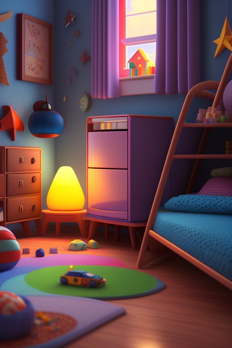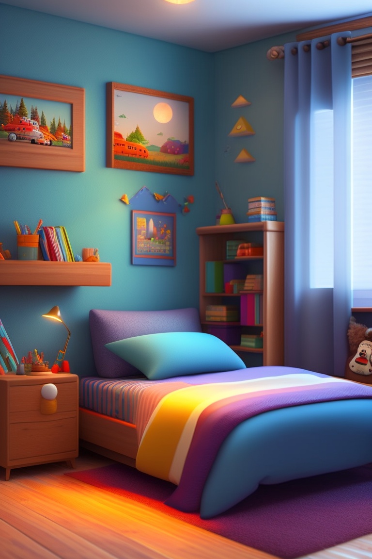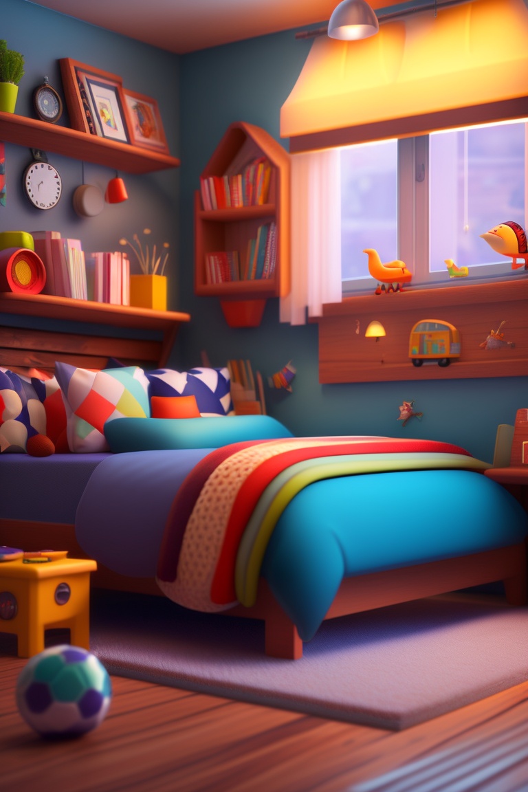 Cozy messy bedroom inspired by pixar's visual style, with designs and colors that evoke his most iconic films, such as toy story or finding nemo. highly detailed.