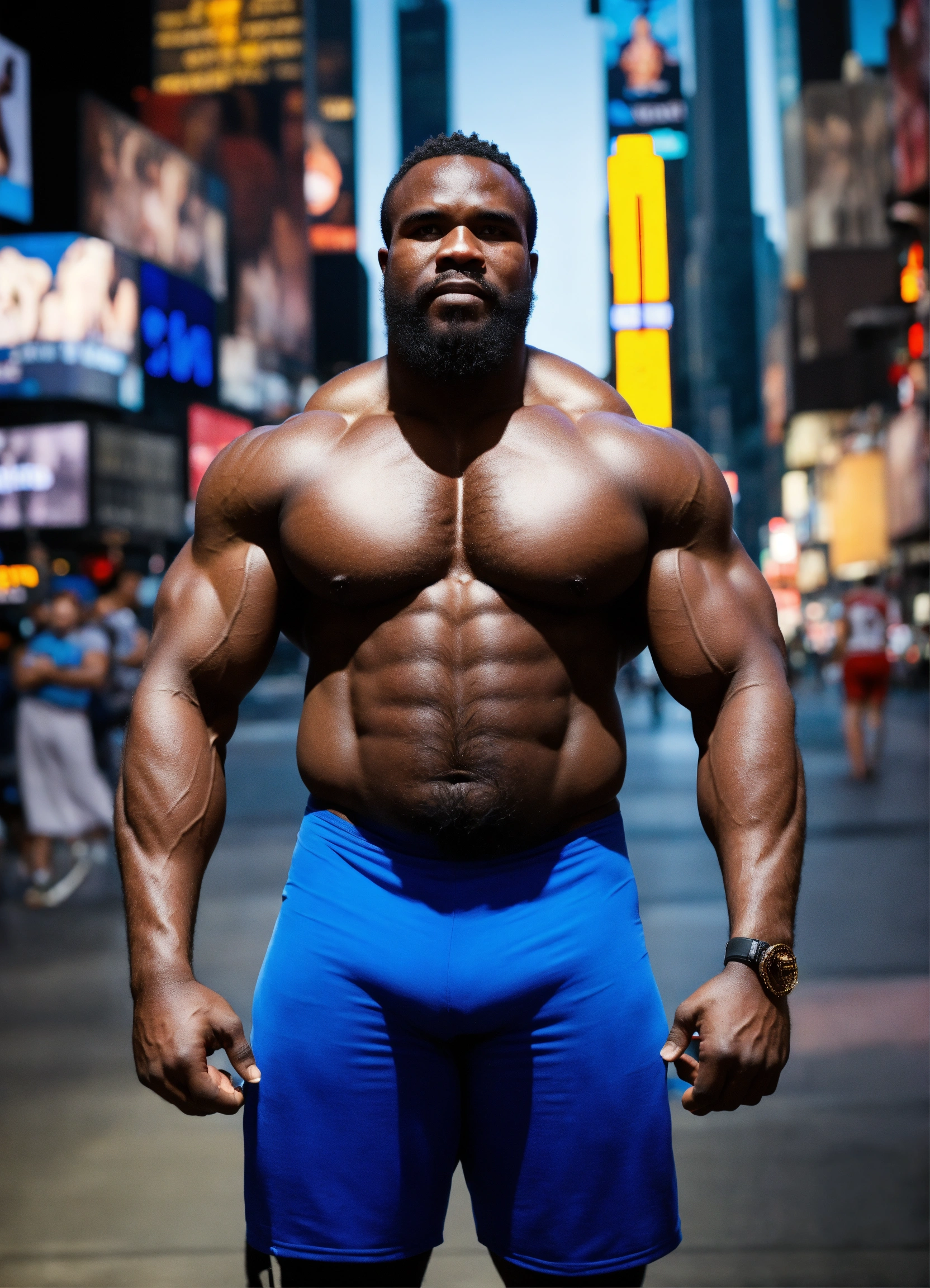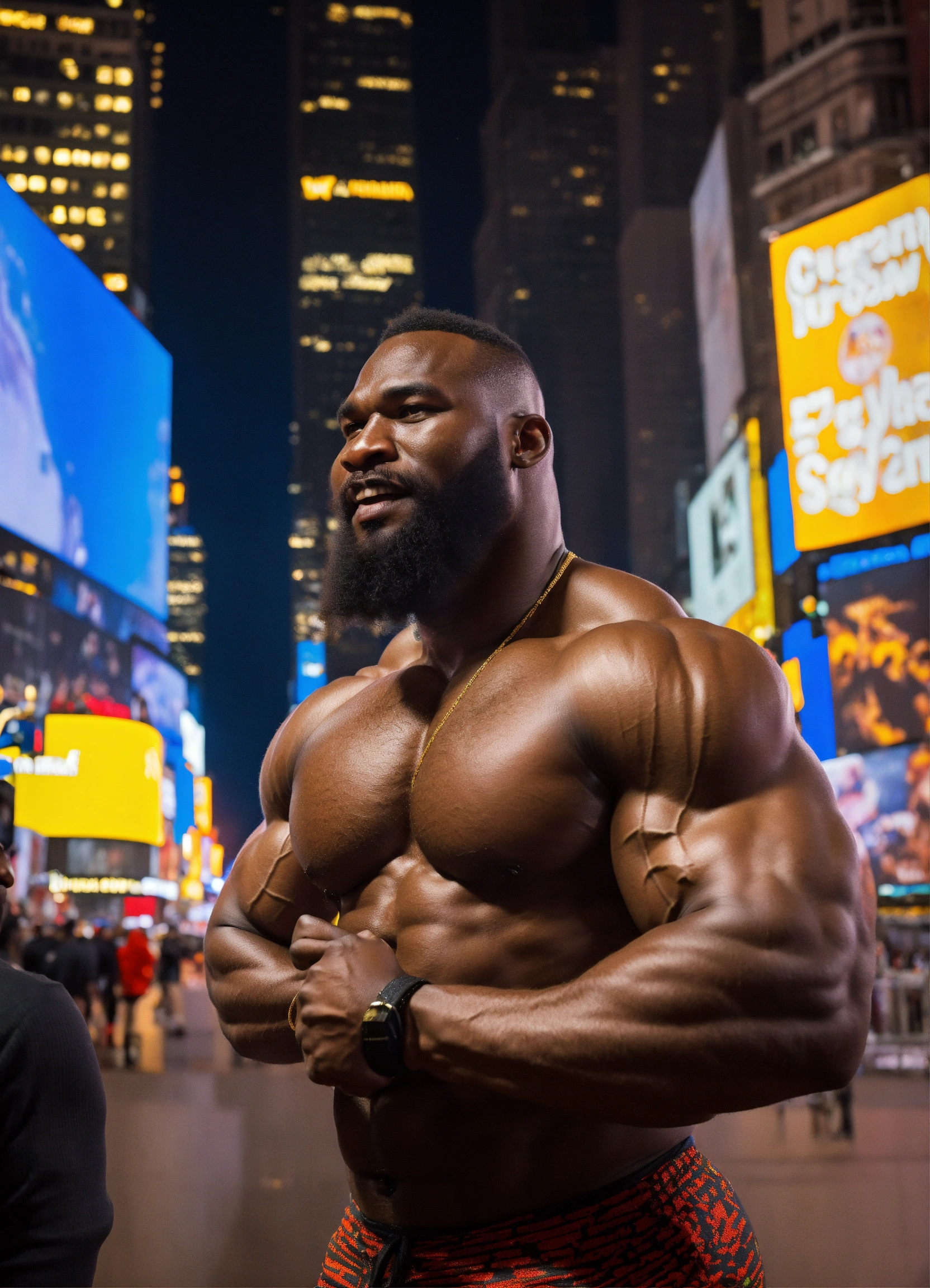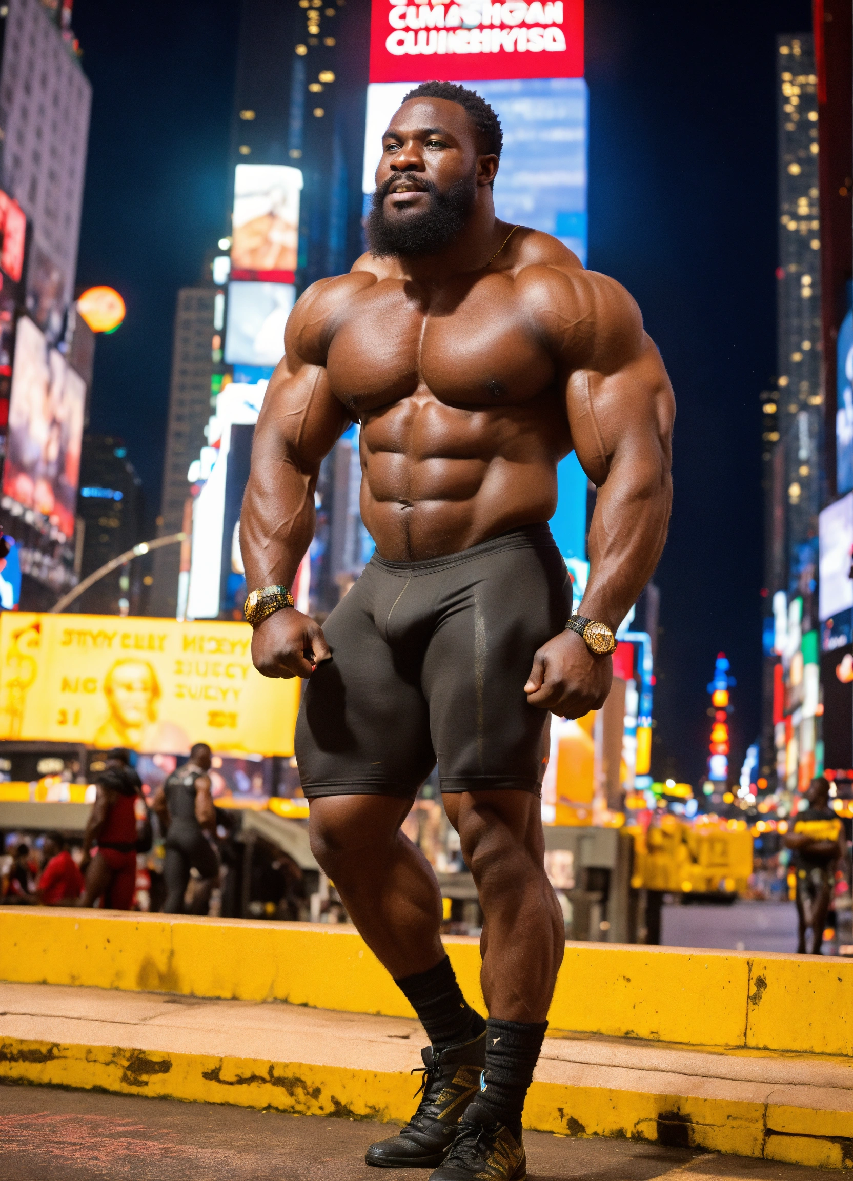 30-year-old hairy zimbabwean man with big muscles, big bodybuilder, body like a wrestler, in times square at night