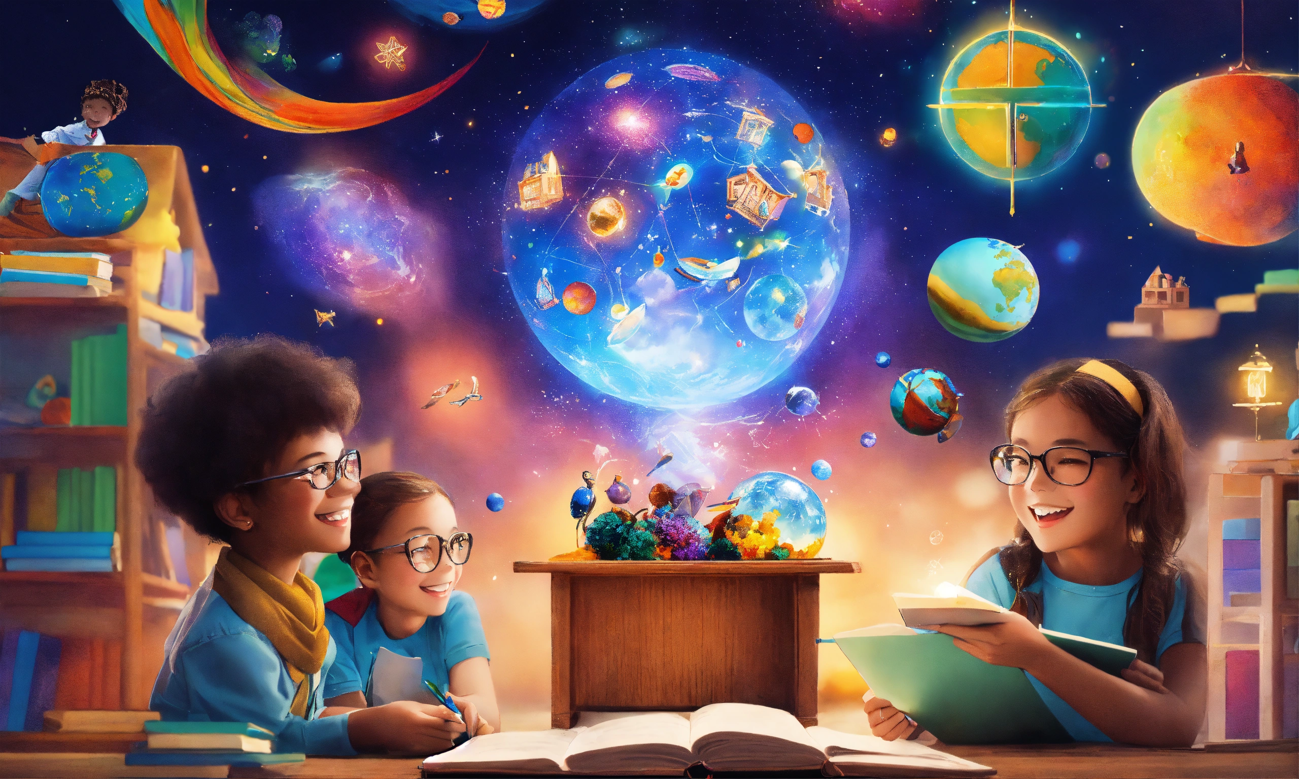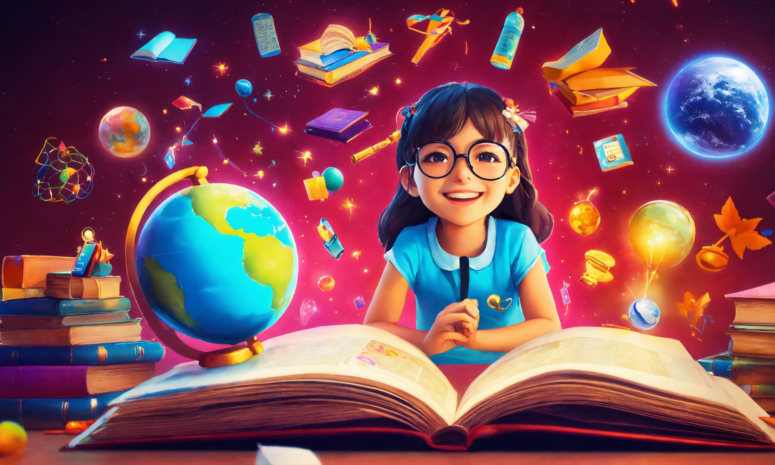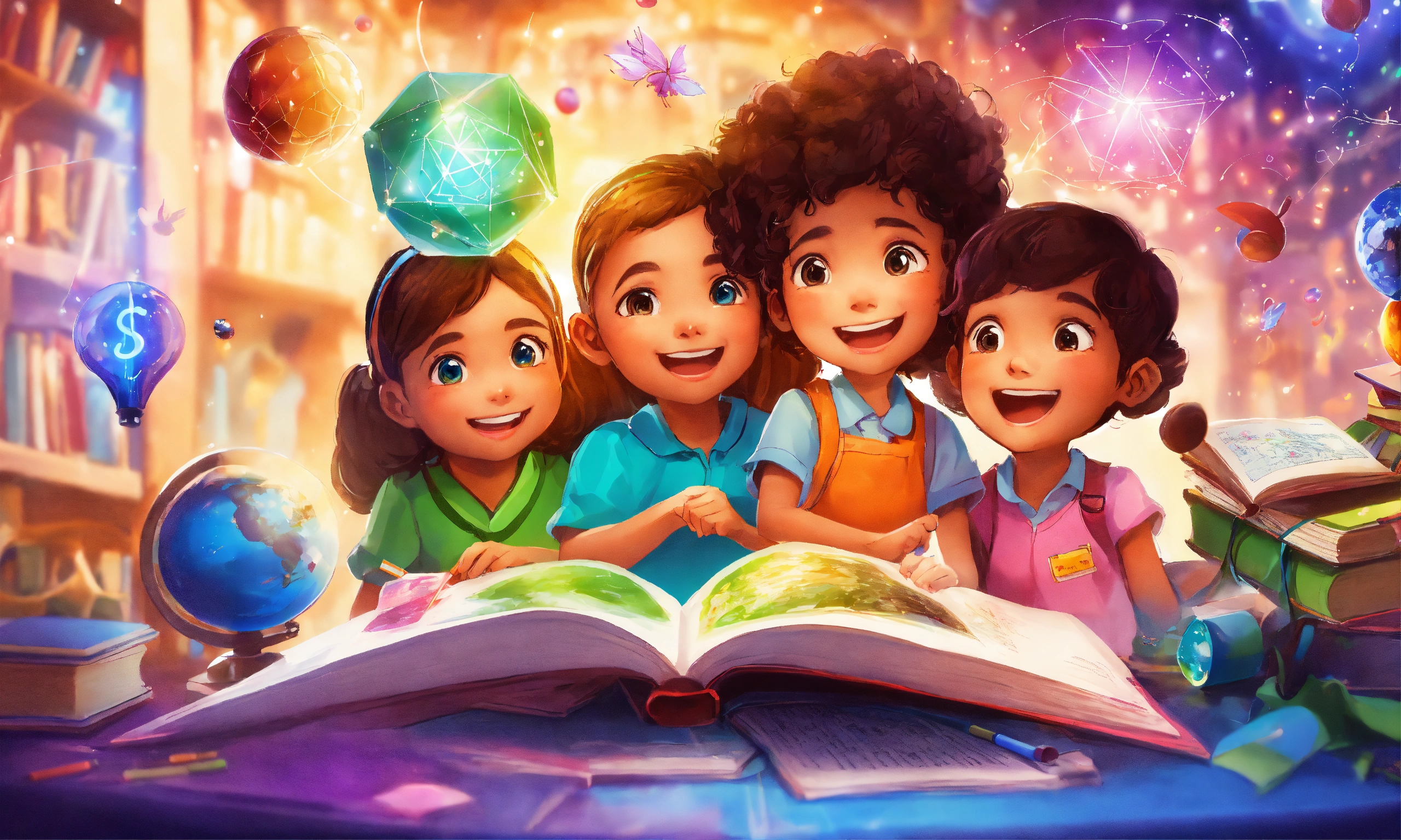 A magical image inspired by the world of education and learning! use vibrant colors, images of educational materials, smiling children, and symbols of knowledge