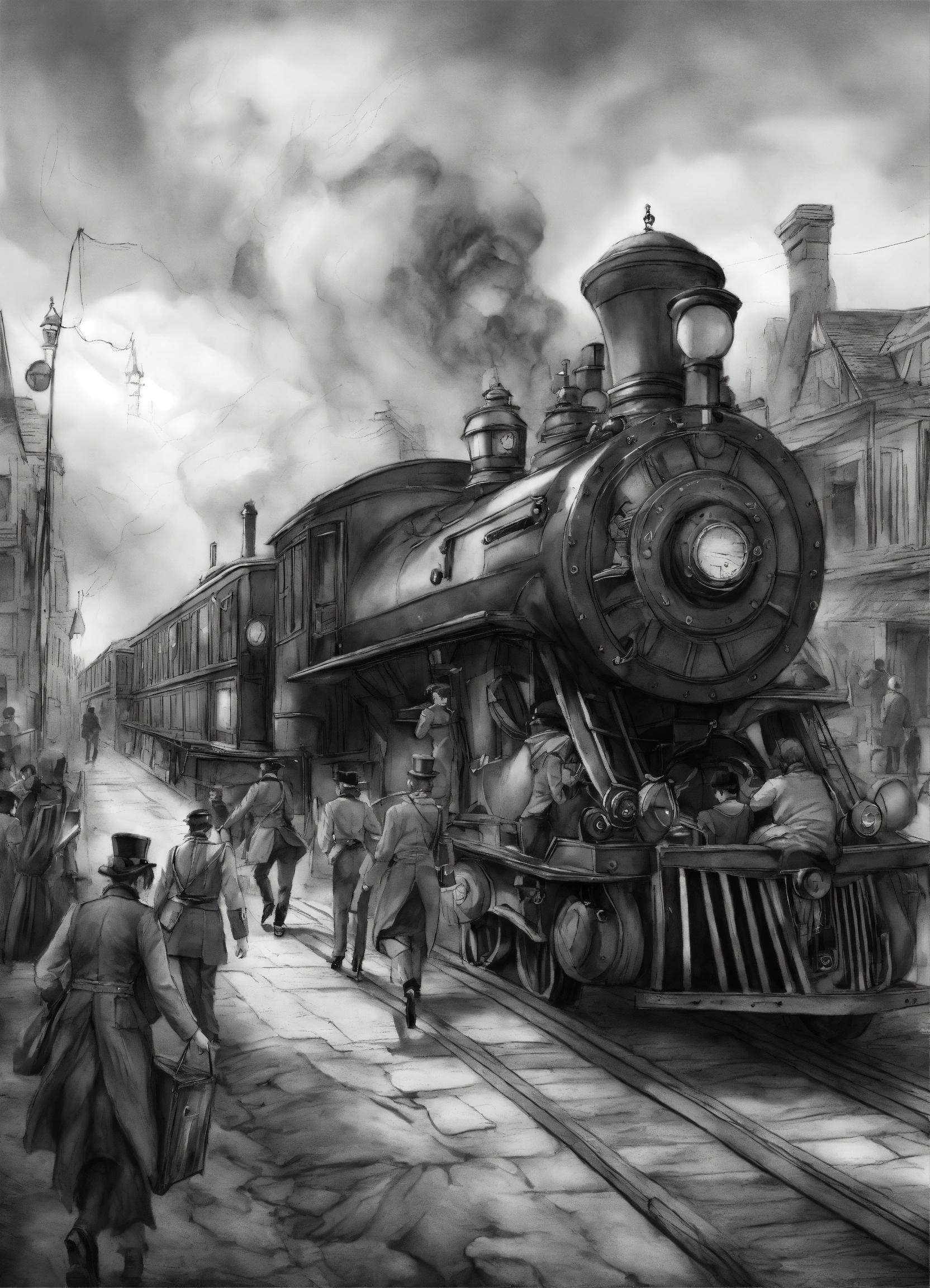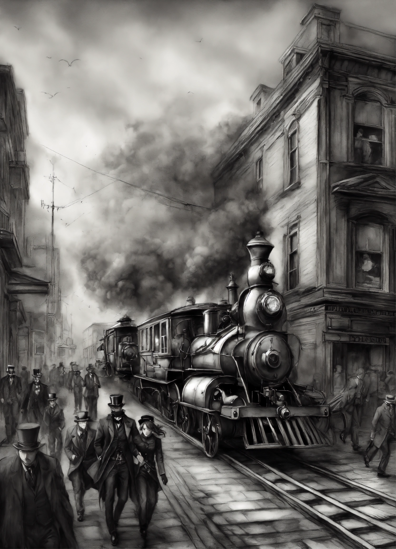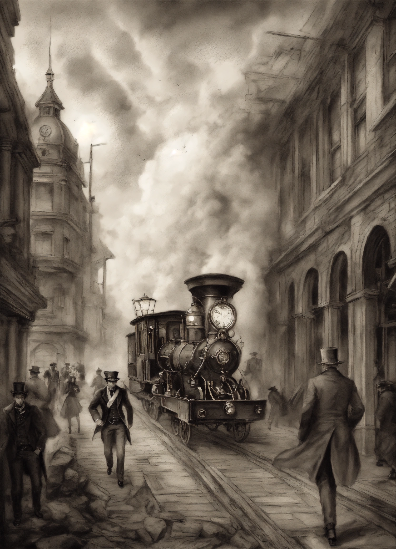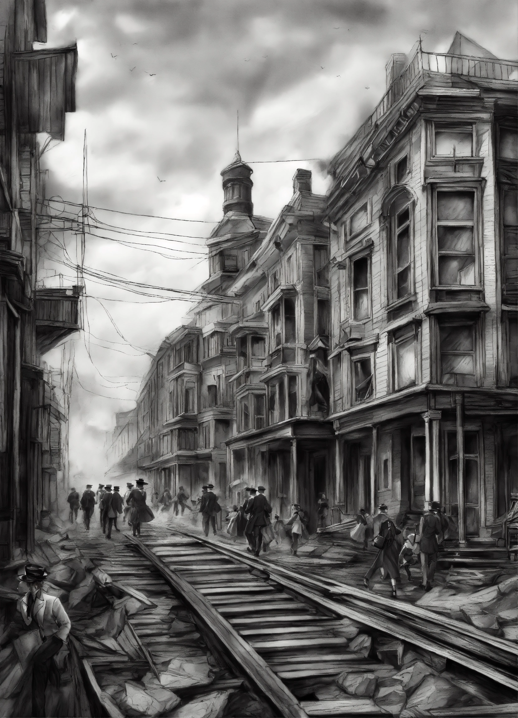 A sketch people flee from a devastating earthquake in a steampunk style, victorian, greyscale, realistic, pencil effect. realistic.