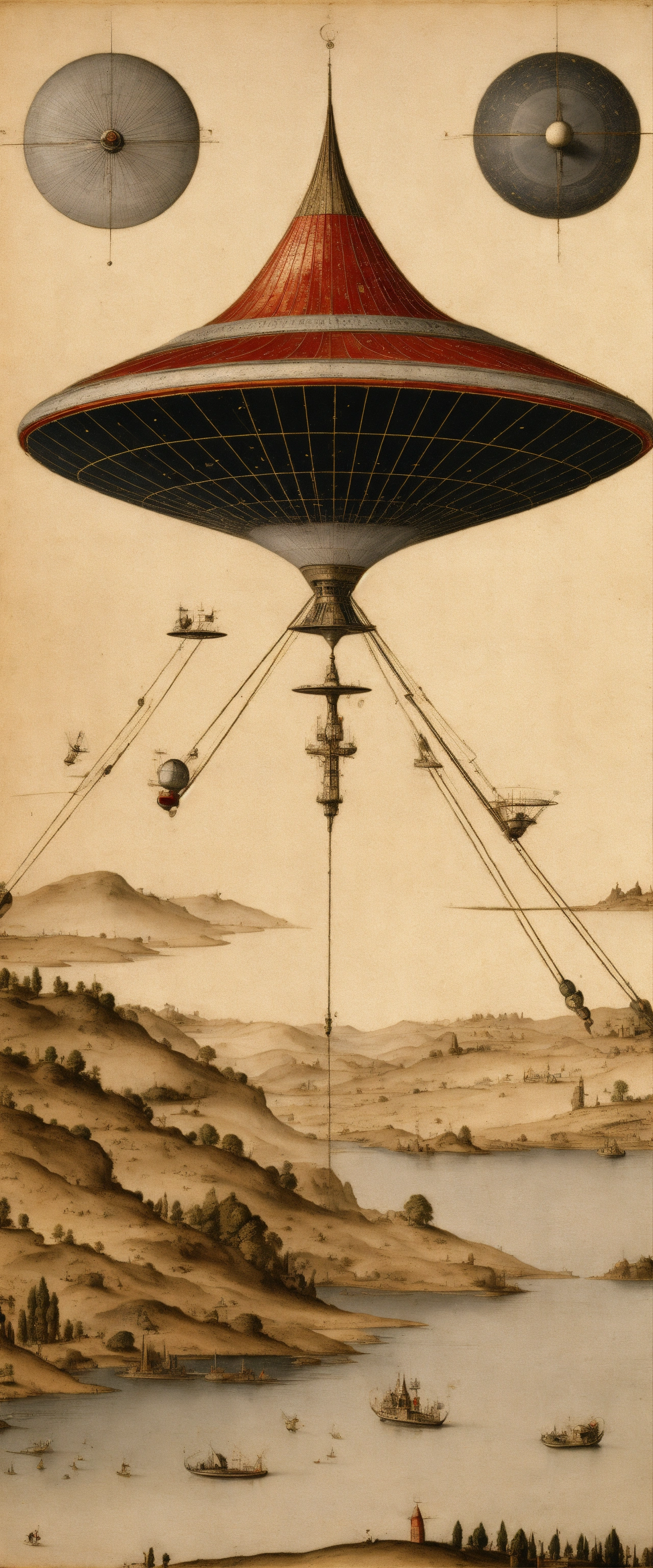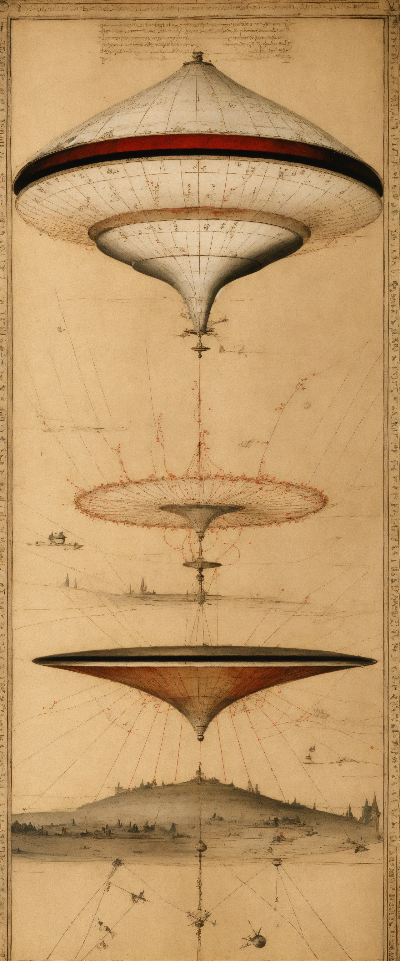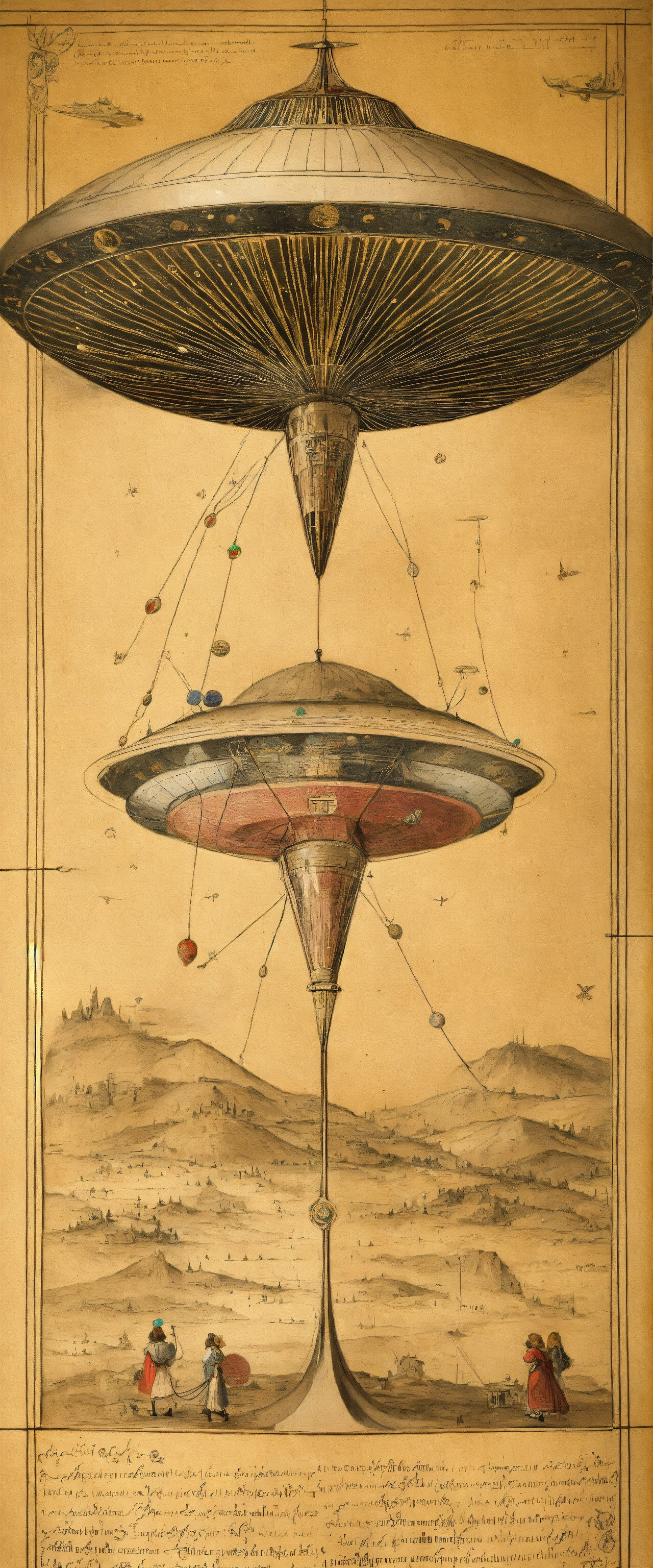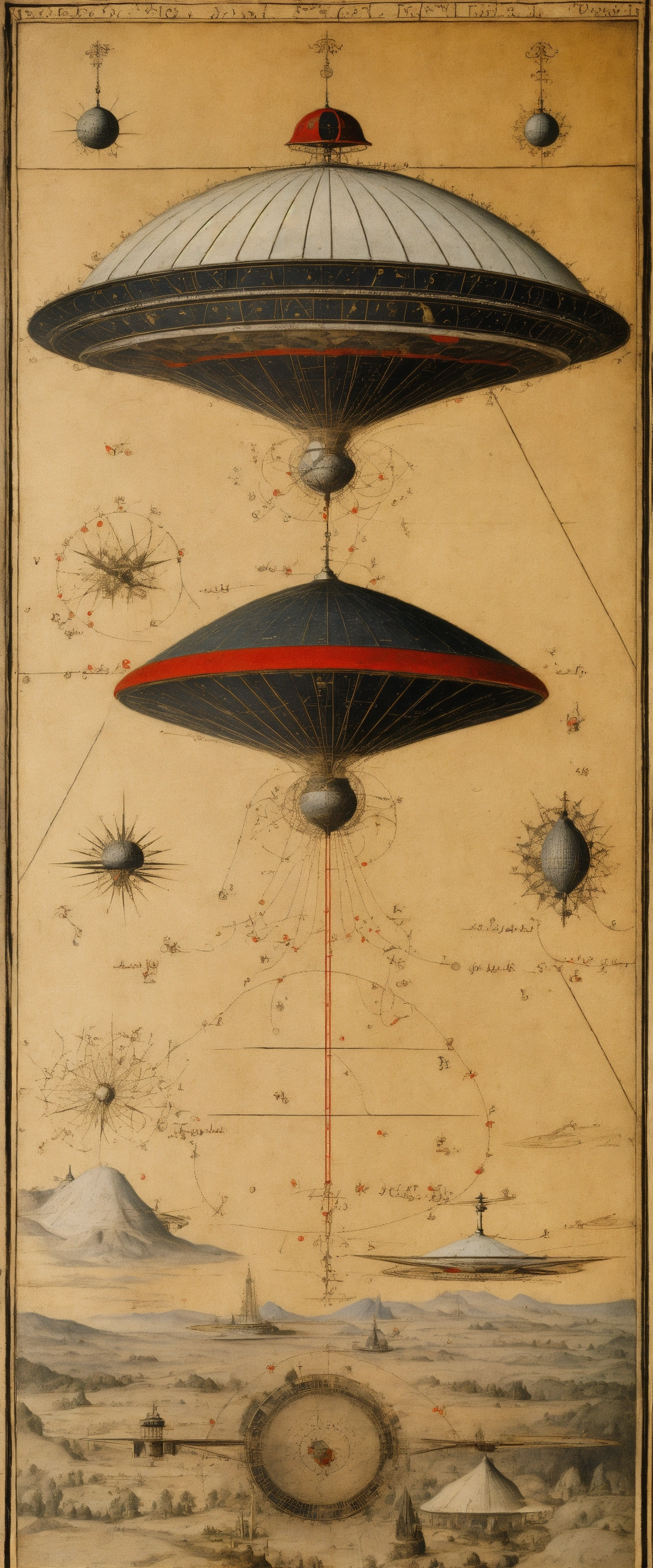 A ufo in silver, black, gold, and red with accurate lines, from different perspectives designed by leonardo da vinci in the voynich manuscript, 256k highest resolution, surreal, very sharp, vintage paper, very accurate lines.