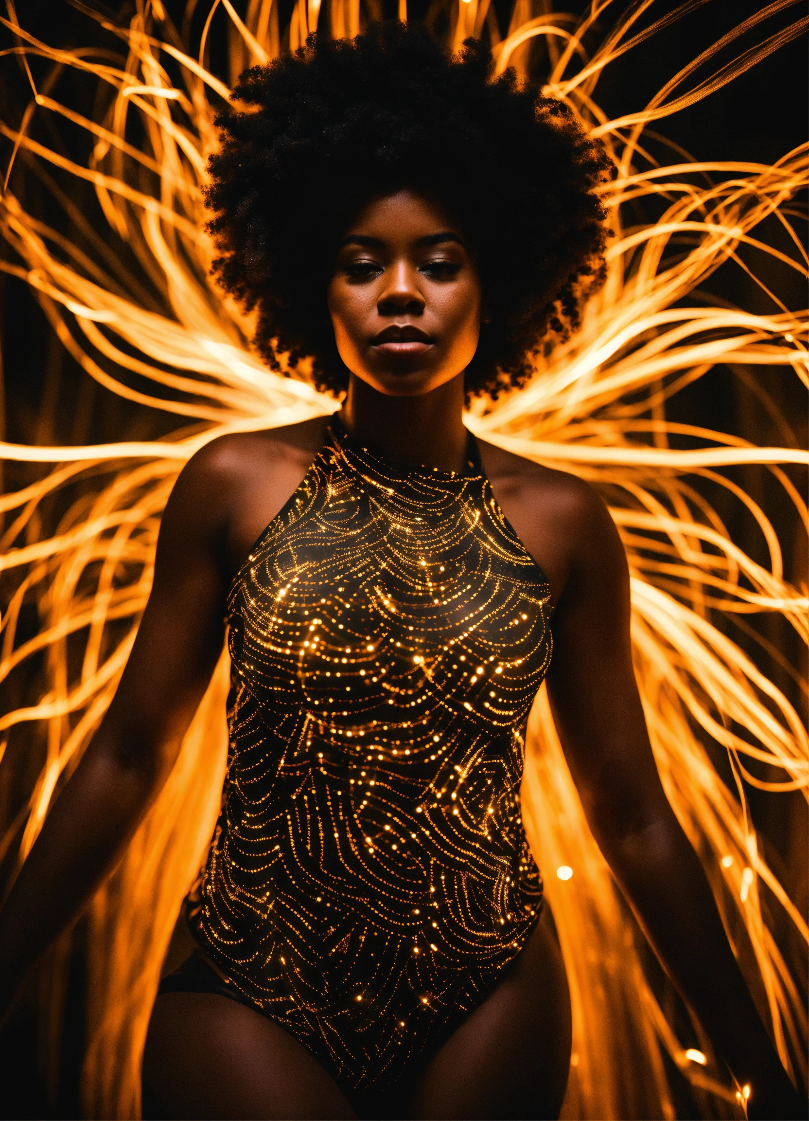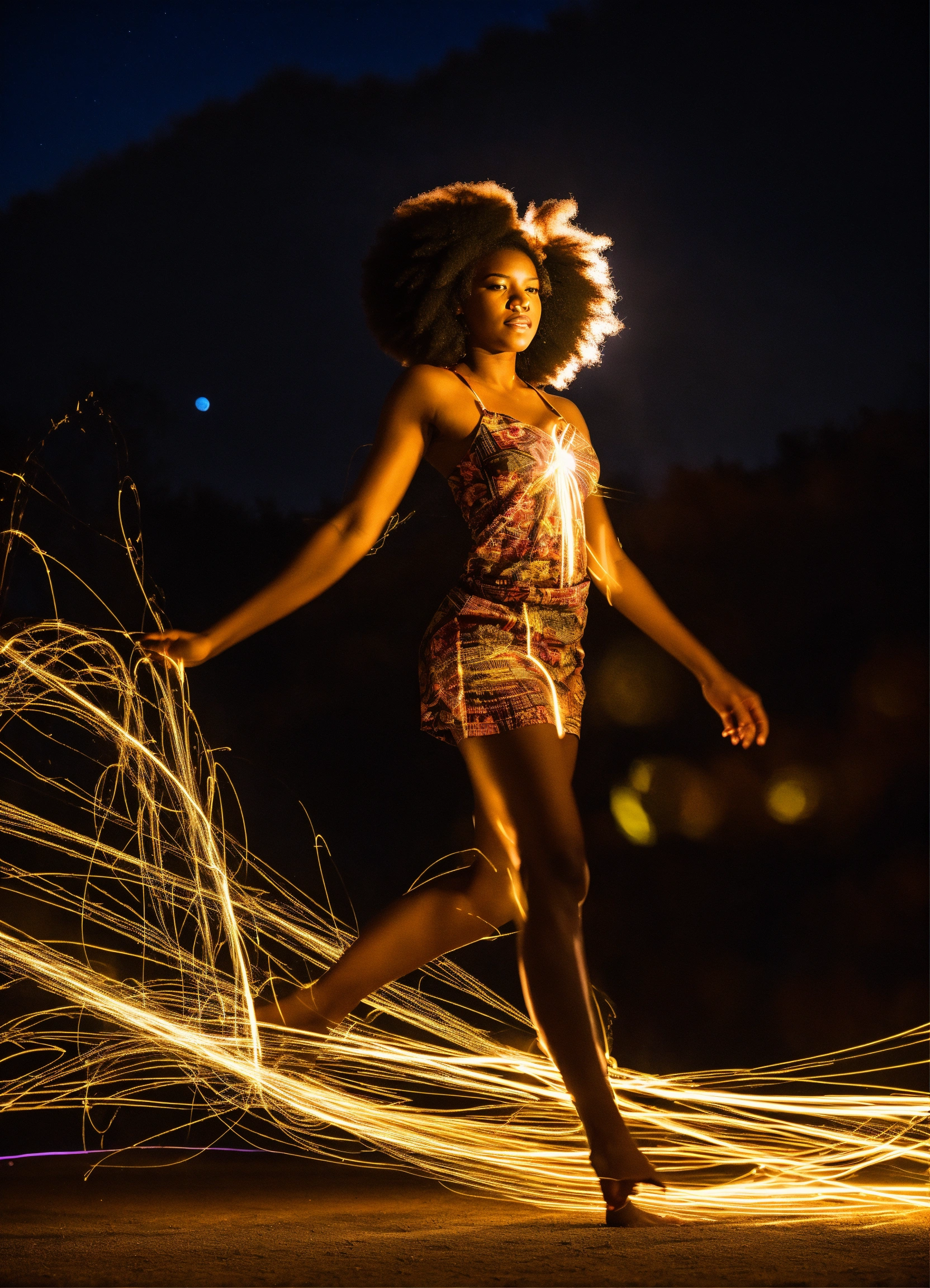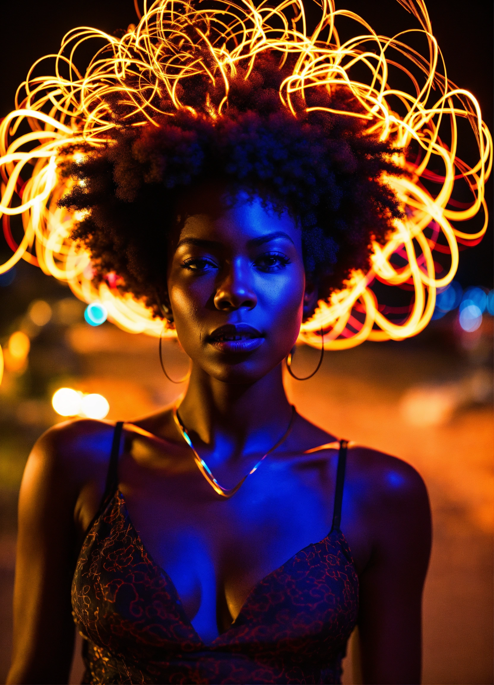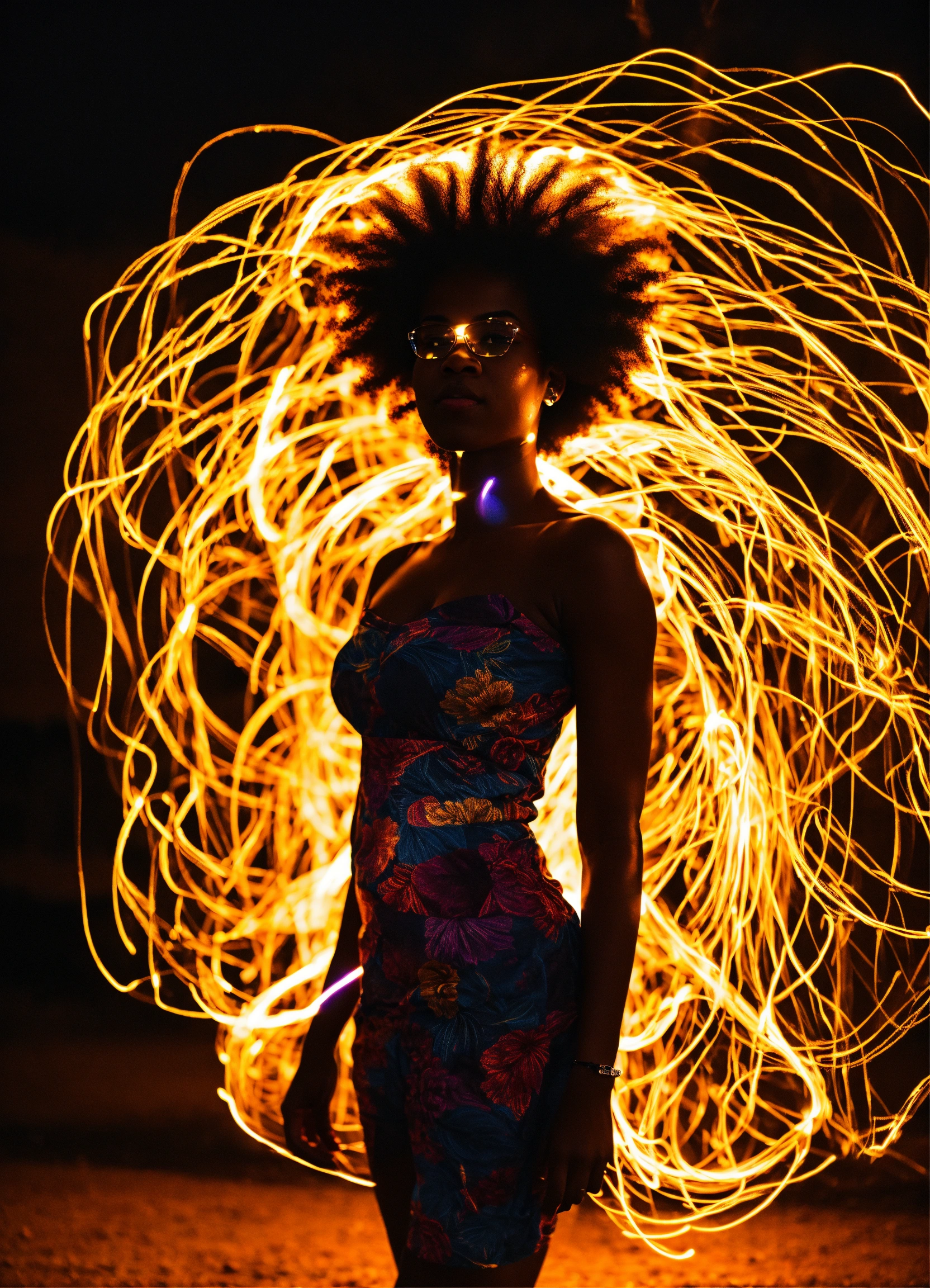 Light painting of black woman with afro, her entire body and afro completely outlined in light, long exposure, light trails, night photography, light drawing, light graffiti, luminescent trails, motion of light, light sketches, kinetic light art