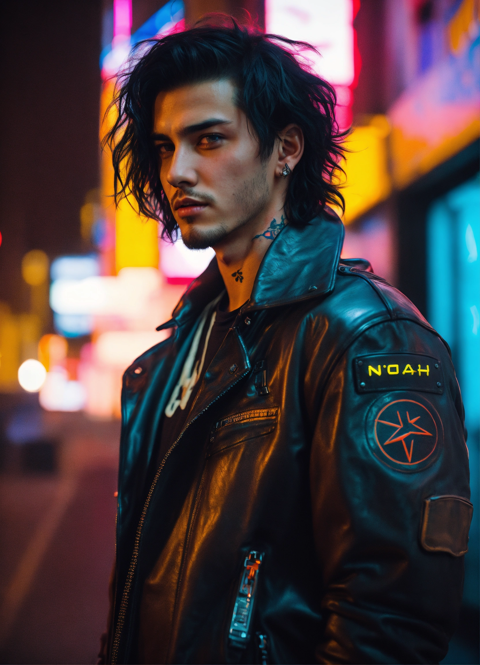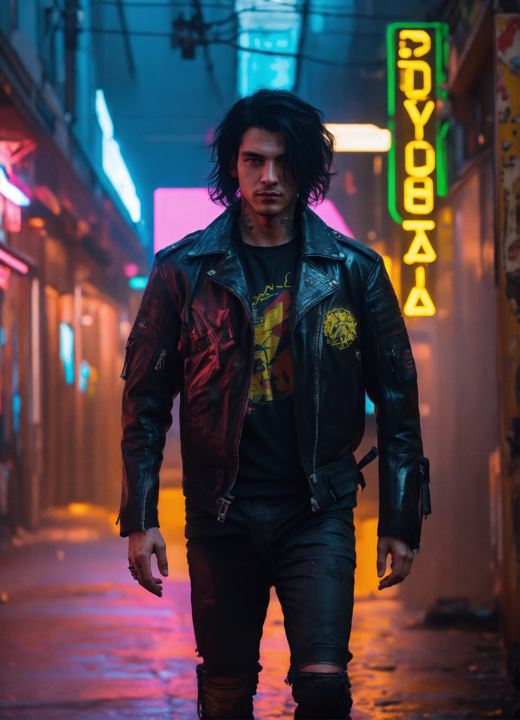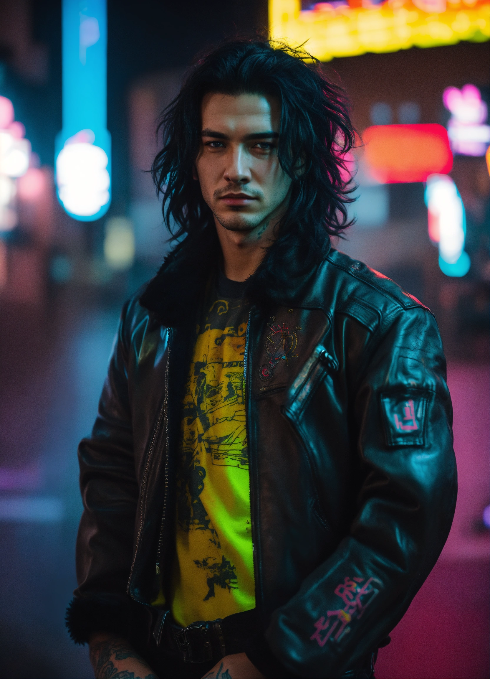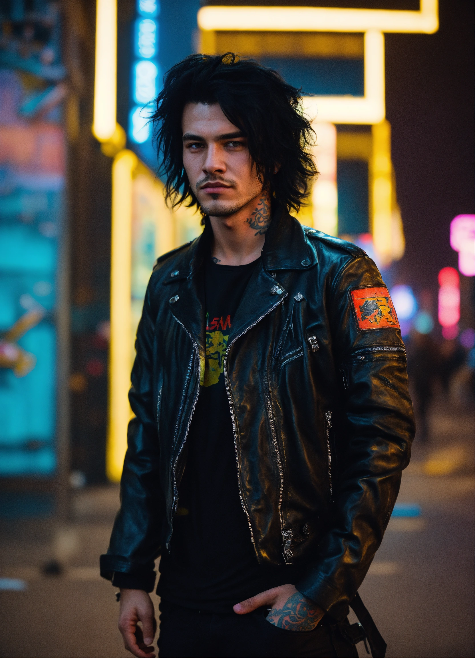 25 year old man, black fluffy hair, fair skin, russian, brown eyes, calm, cyberpunk, neon, street kid, cyberpunk 2077, tech, black leather jacket, handsome, grunge, tattoos, noah sebastian