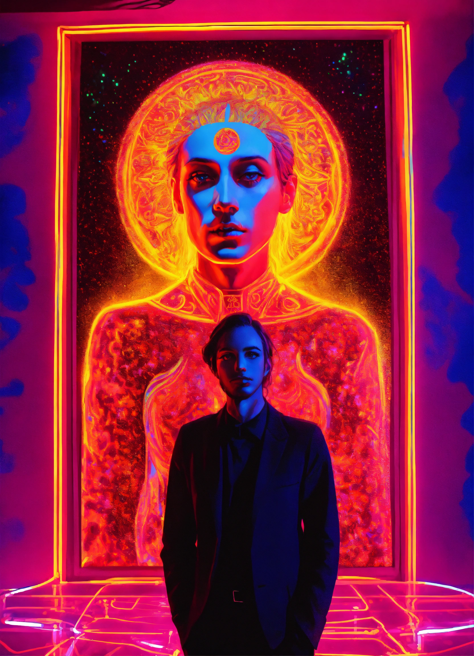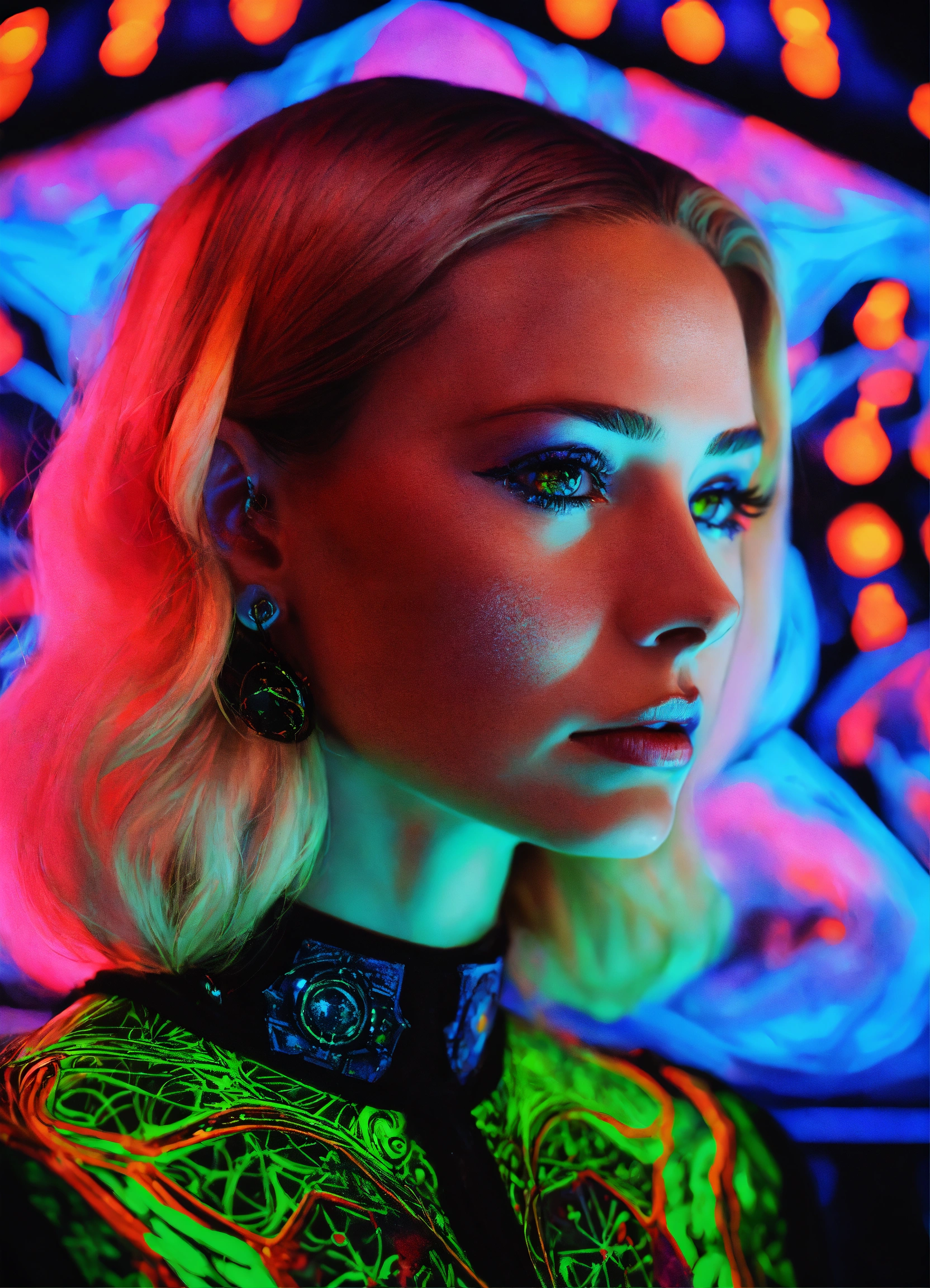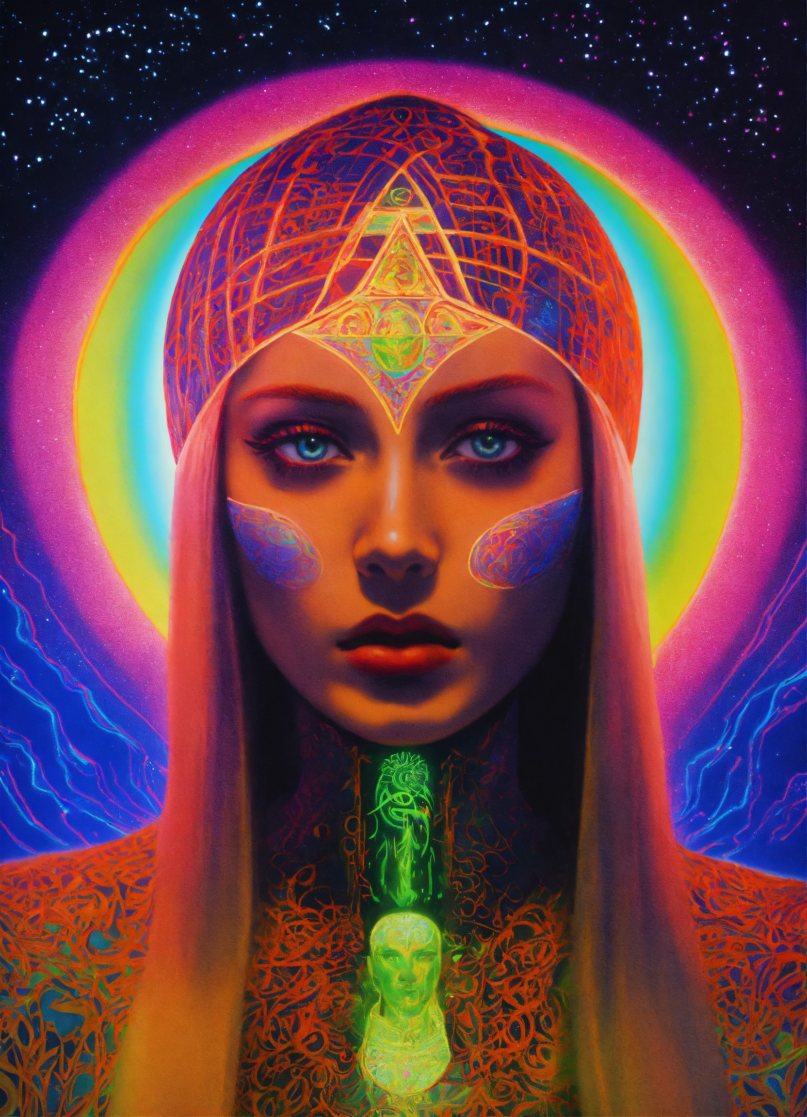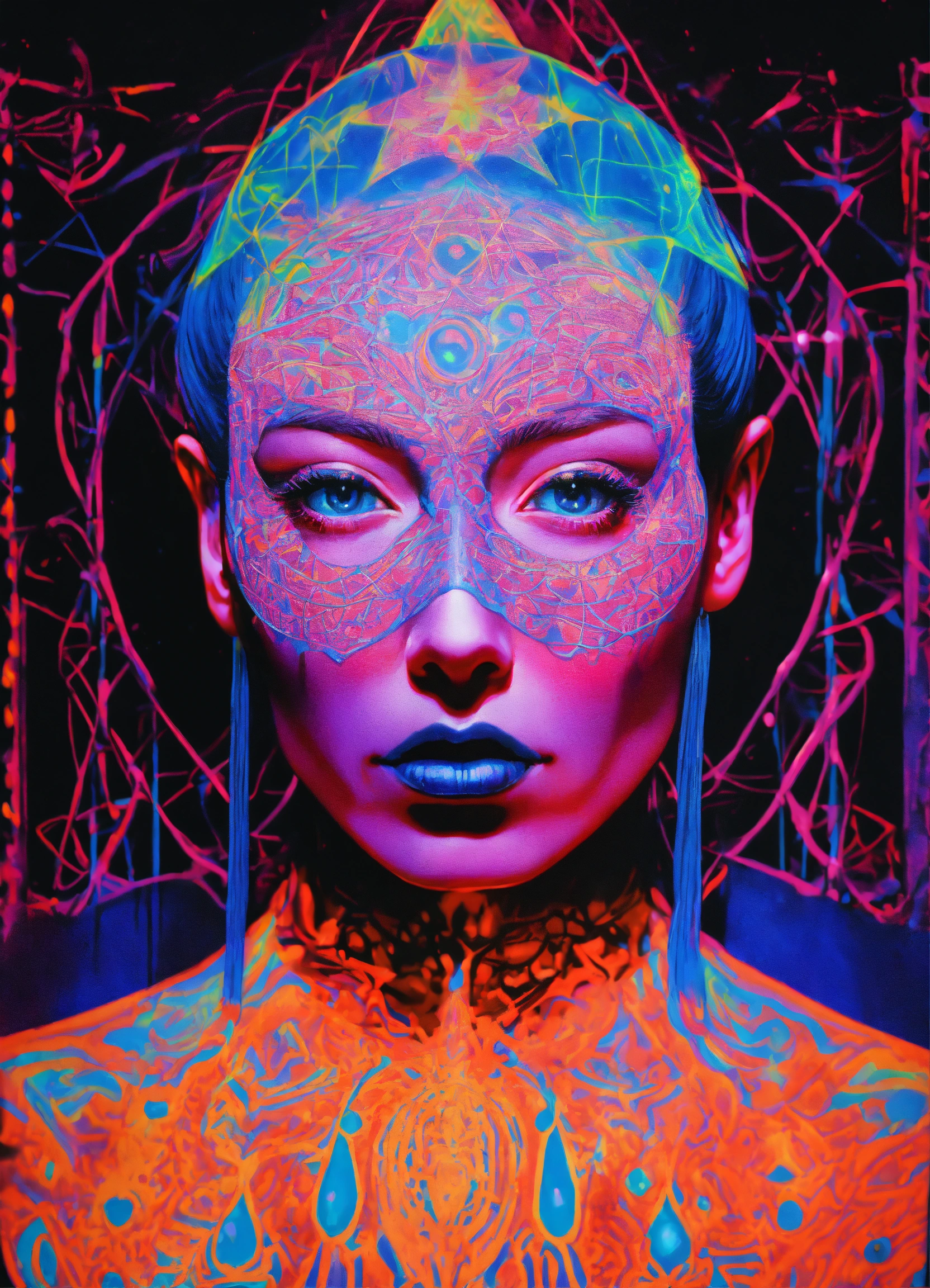 Photorealistic portrait gothic fashion, of cosmic alex grey painting in a dmt black light glitter neon tokyo 35mm film, art by salvador dali and holy mountain the movie