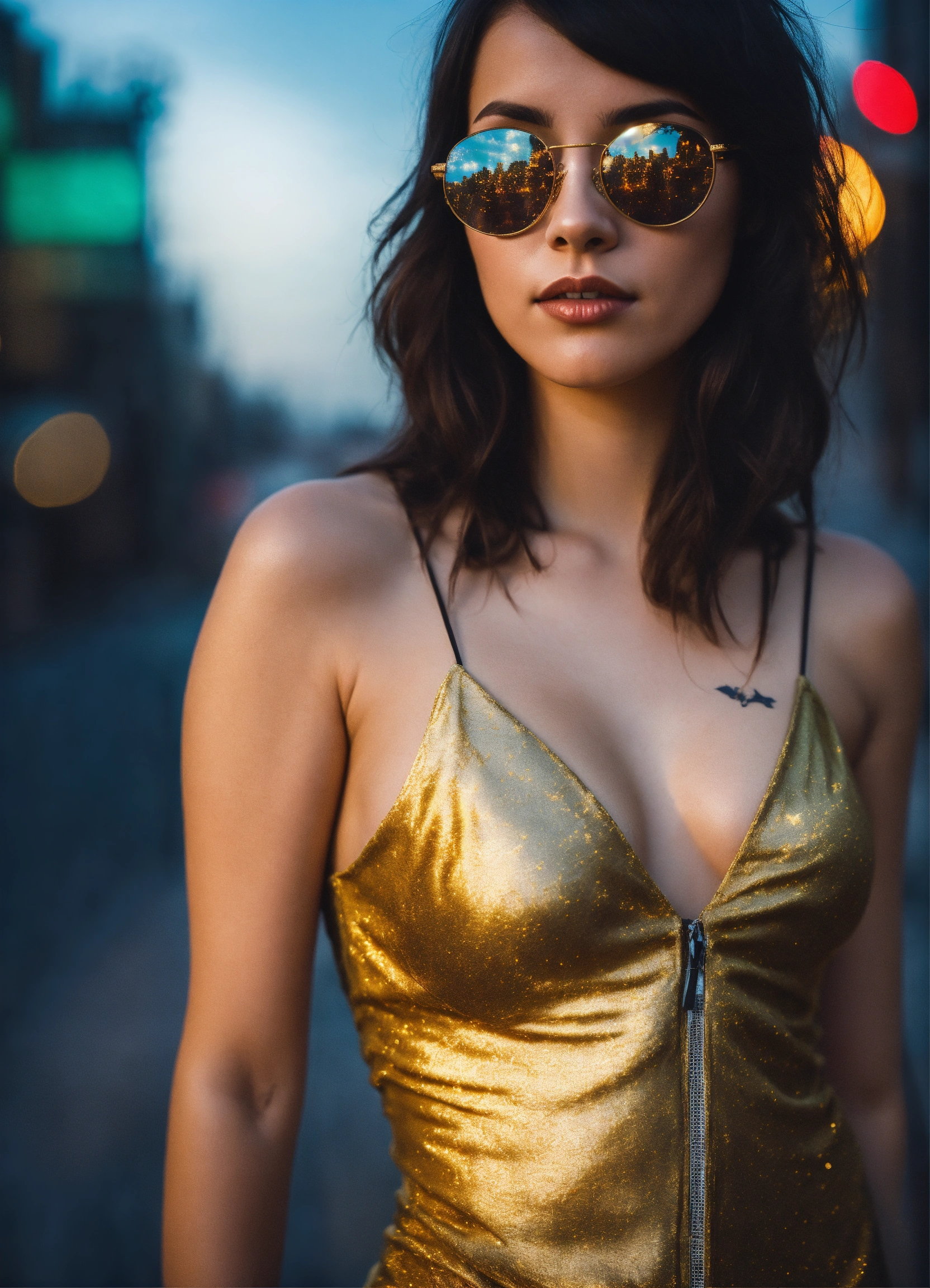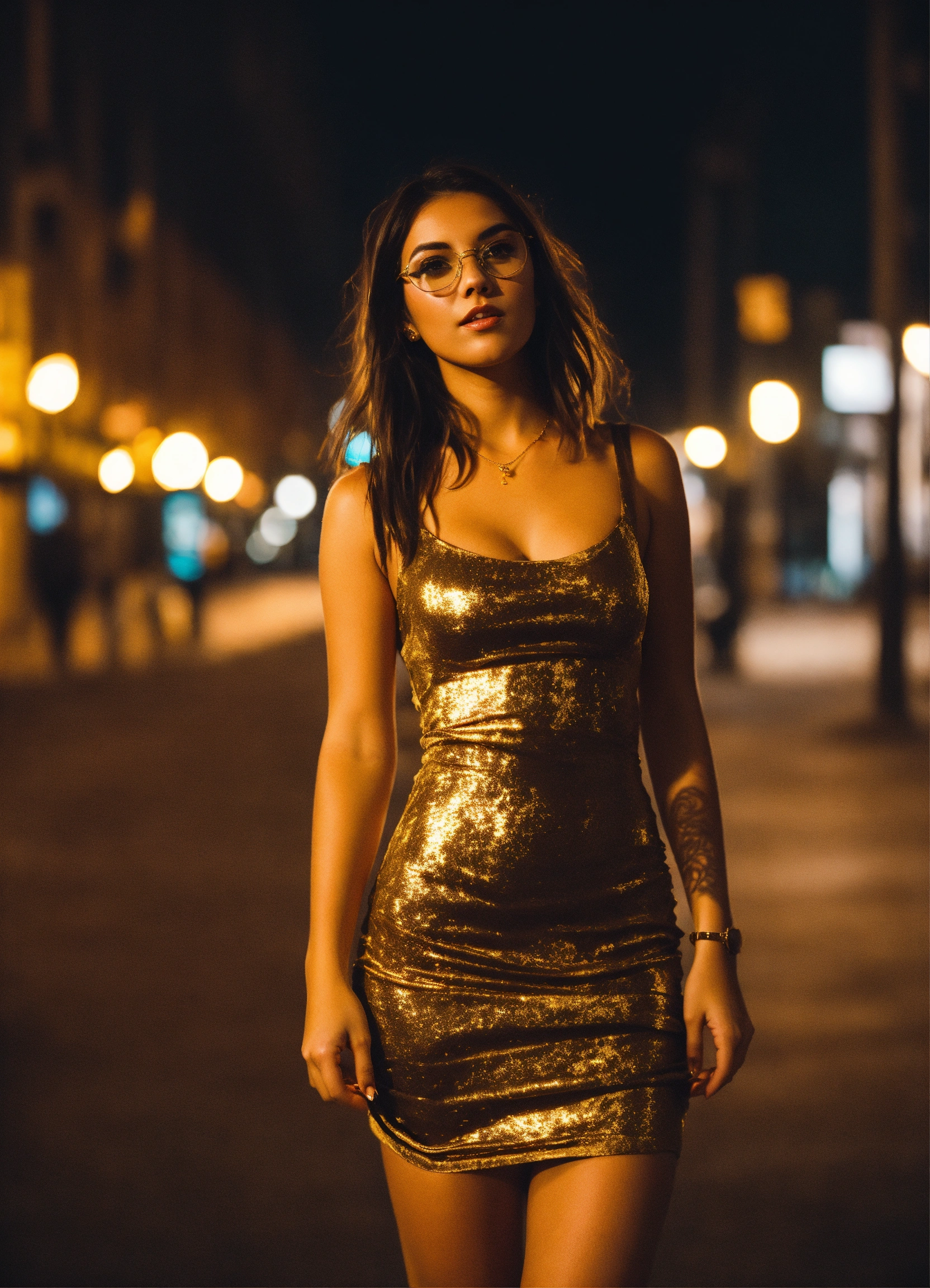 A real photo of a cute 28 year old hot brunette emo girl wearing a tight golden silk open dress and hot glasses standing in a city, in the sky we see the milky-way