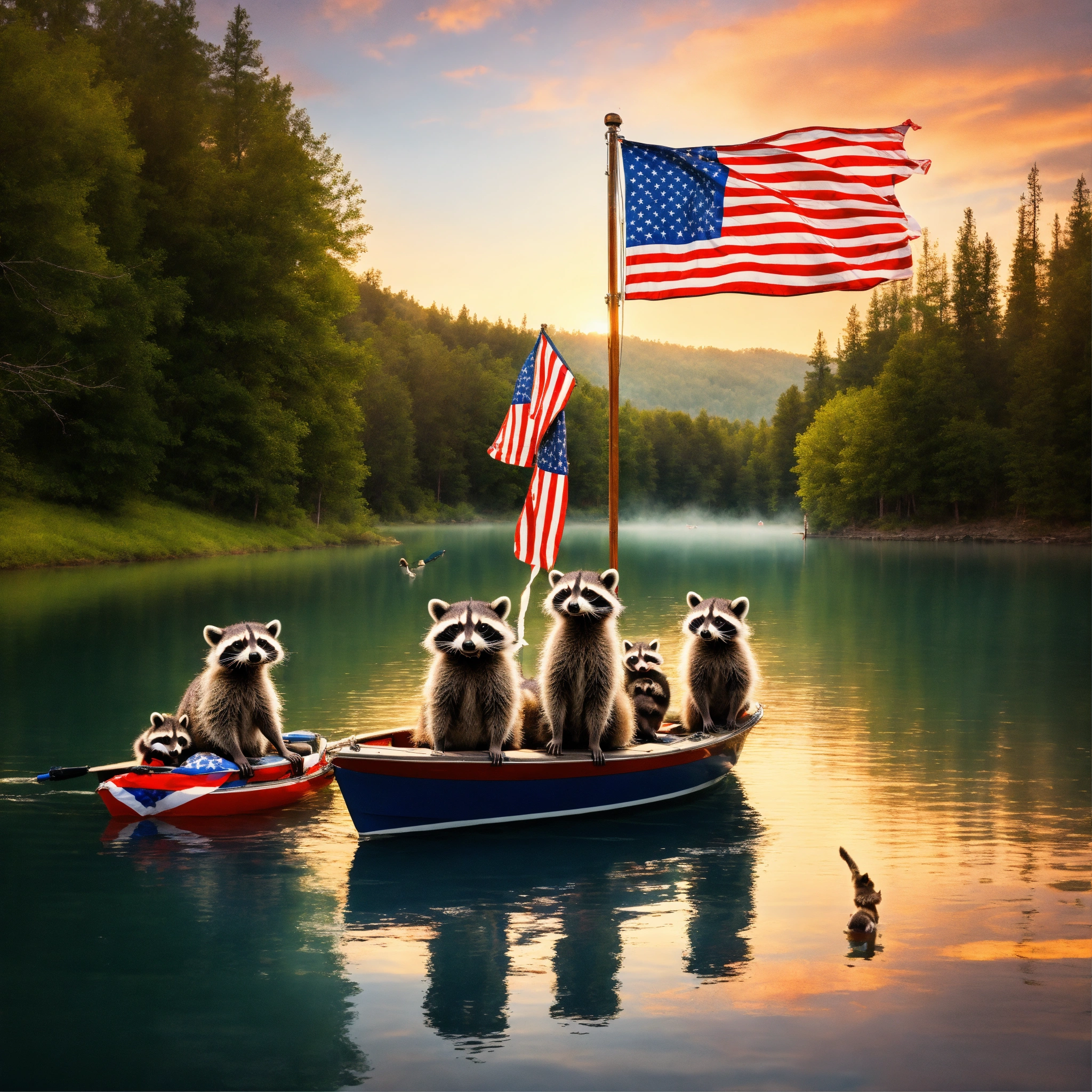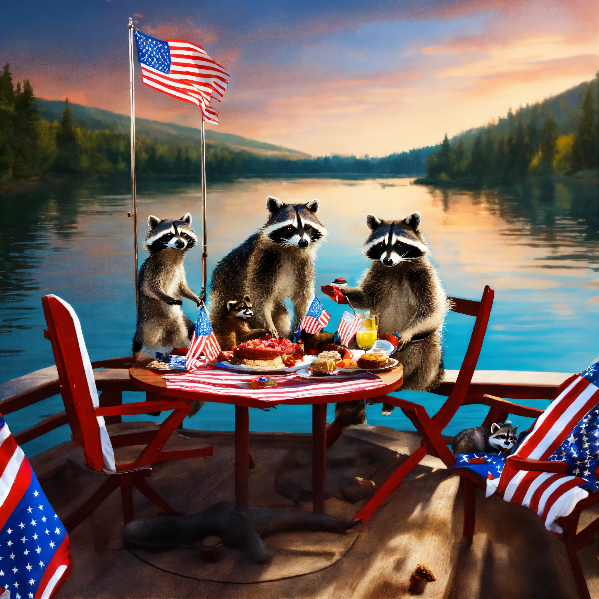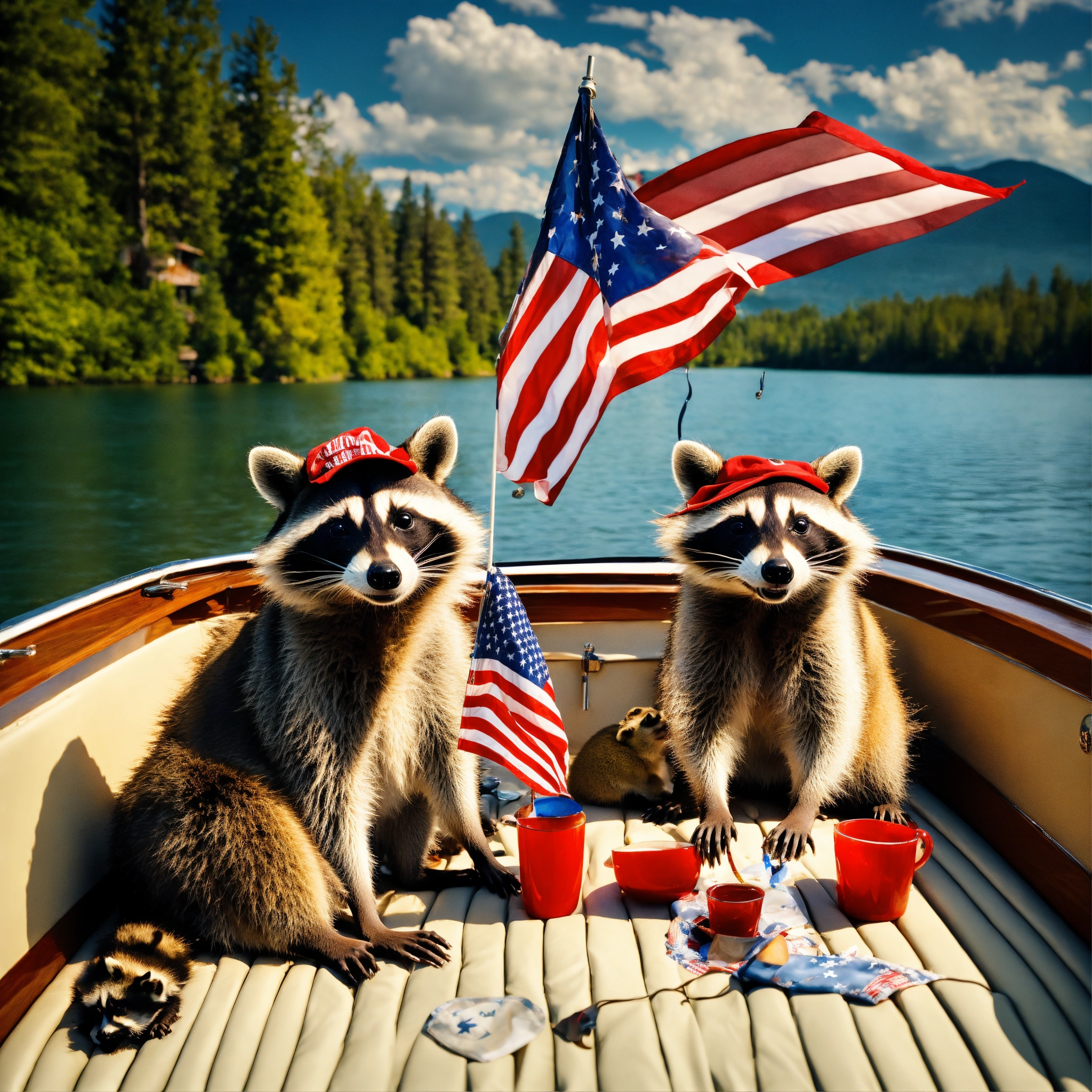 A raccoon family celebrating american labor day on a yacht in a gorgeous lake with the american flag, surreal
