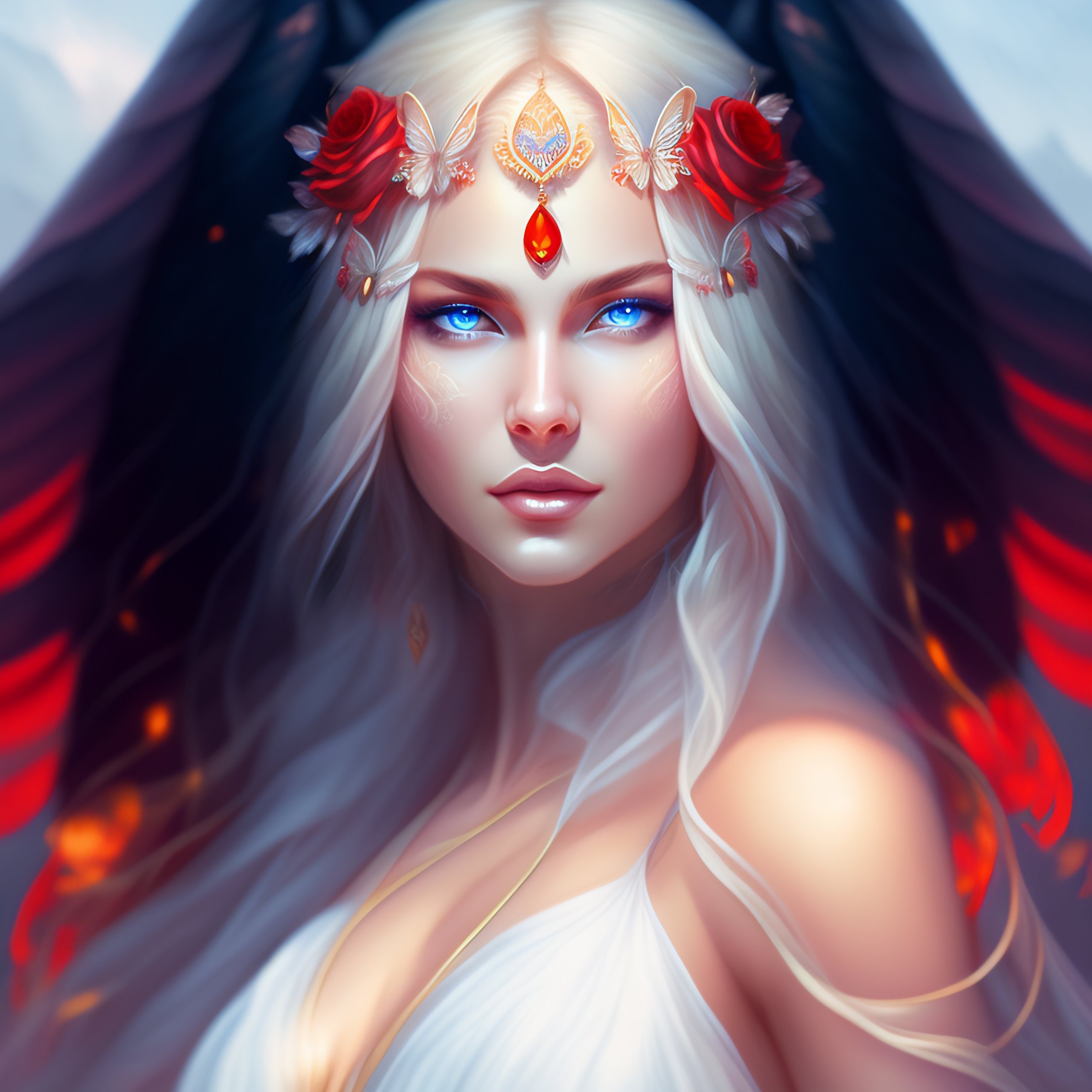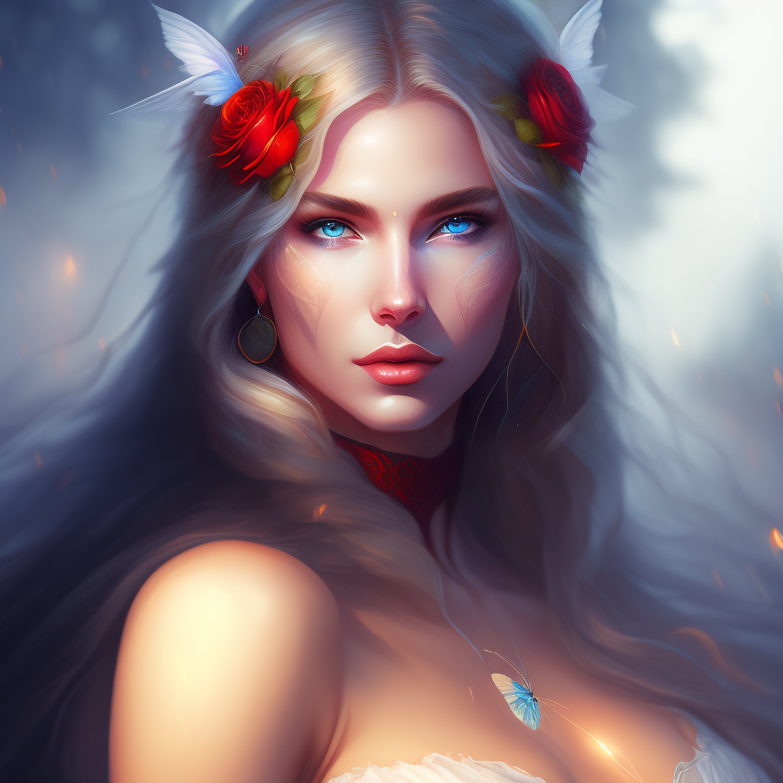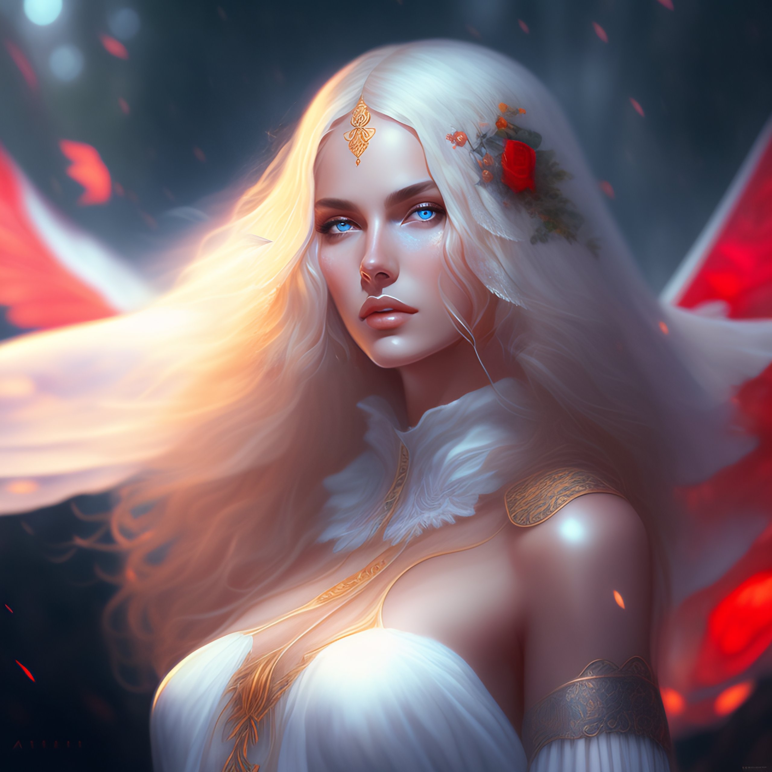 Long shot of a beautiful mystical unknown blond slavic balkan blue eyed transparent ghost woman spirit with insect like wings dancing on fire in a balkan village at night on moonlight while foggy and raining wearing a transparent white dress with red and white balkan style patterns and motives and also roses ring on her head, moonlight only mystical, digital painting, artstation, concept art, smooth, sharp focus, illustration, art by artgerm and greg rutkowski