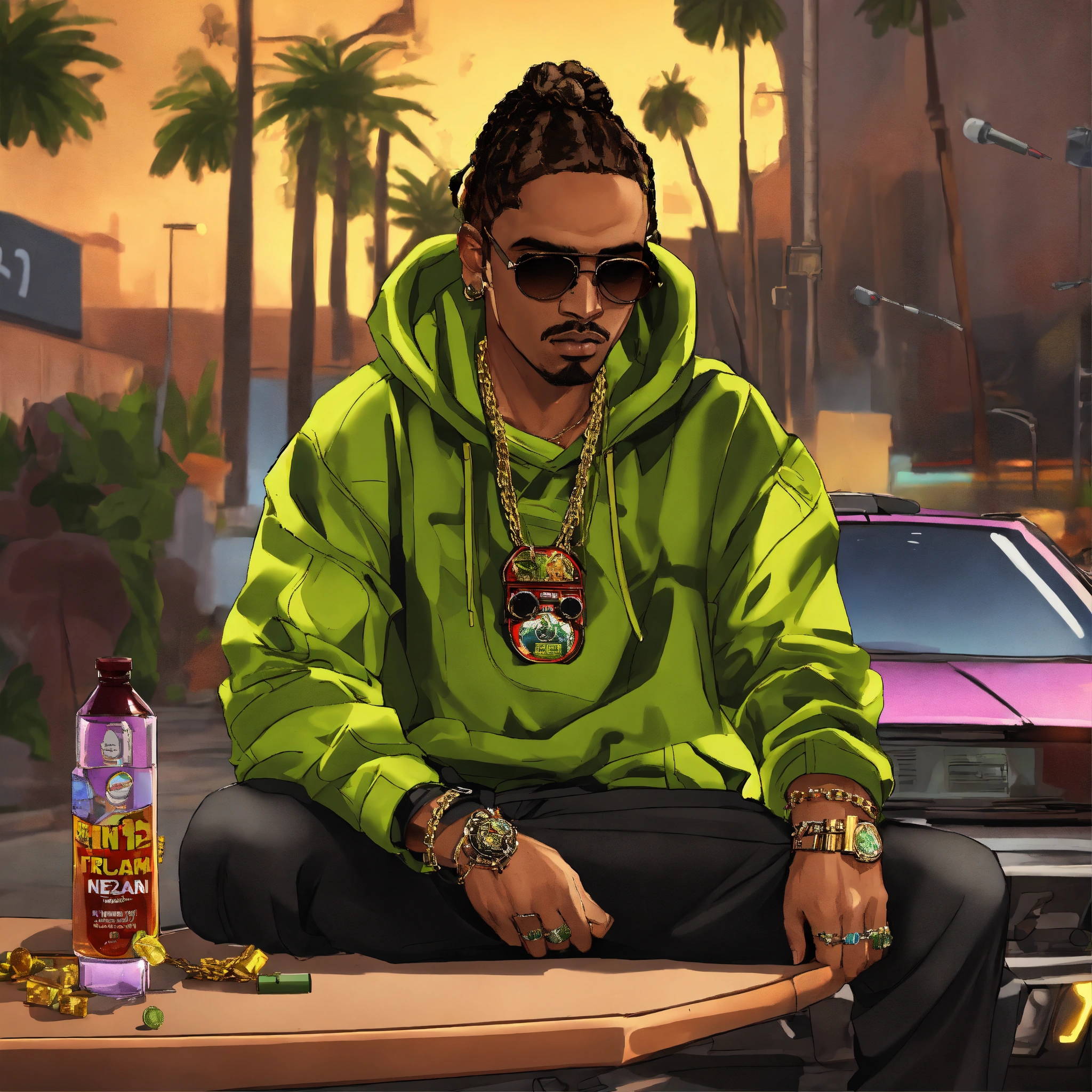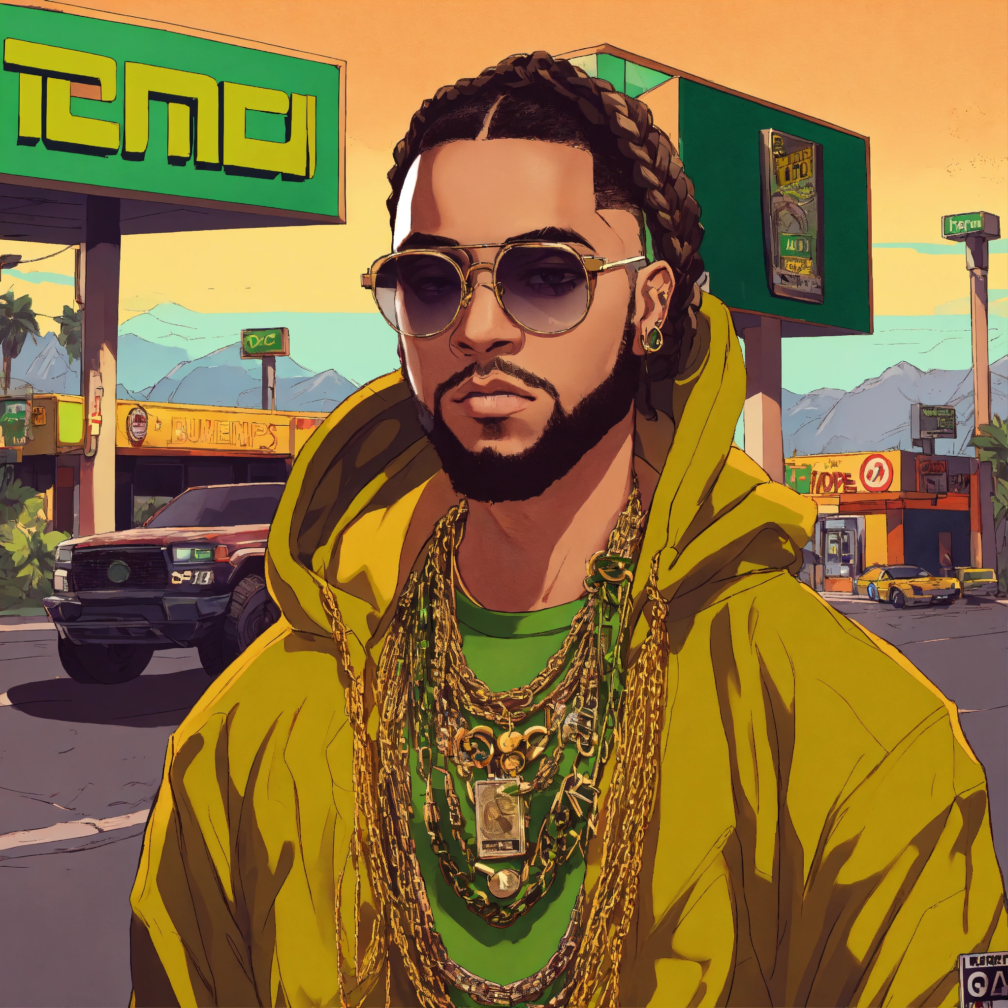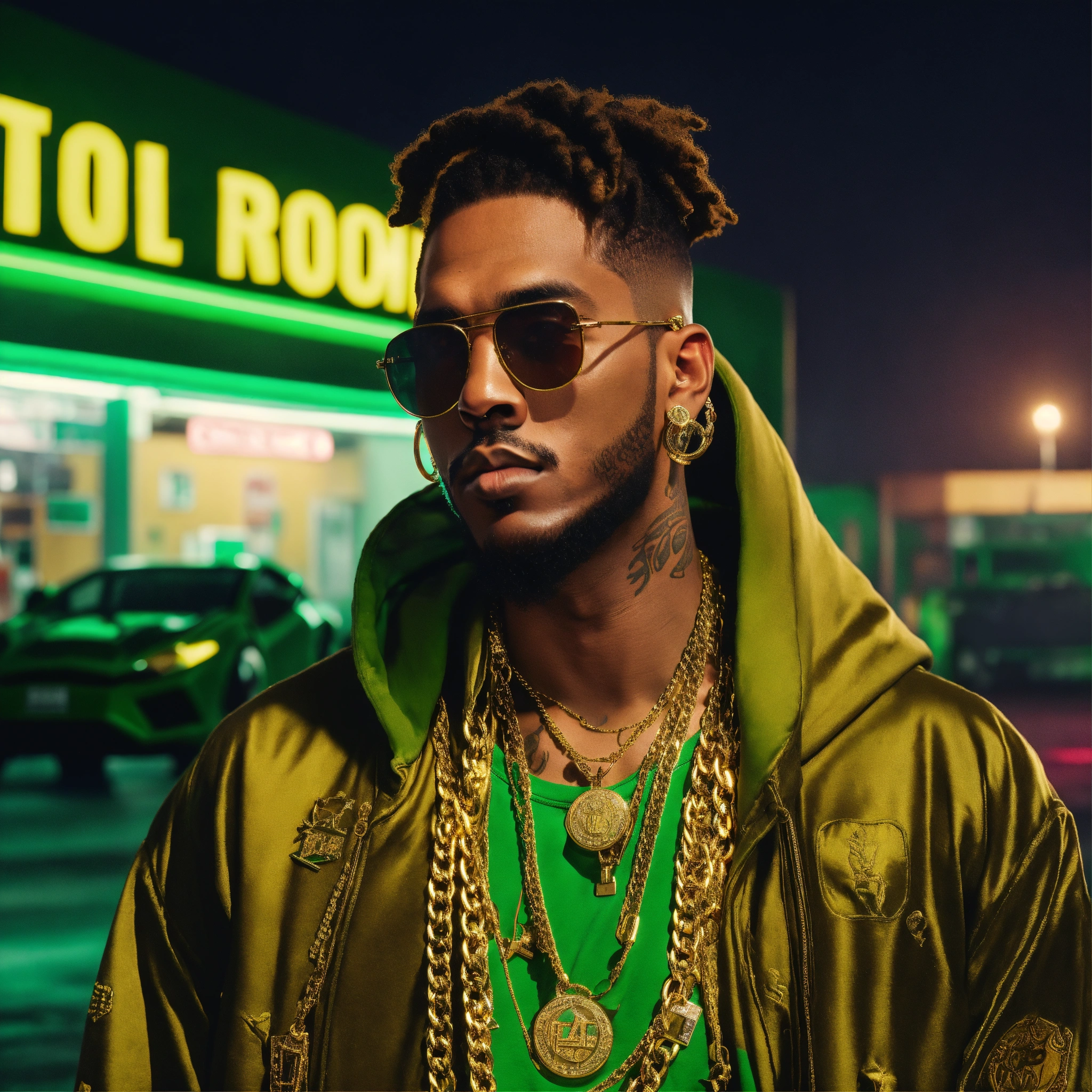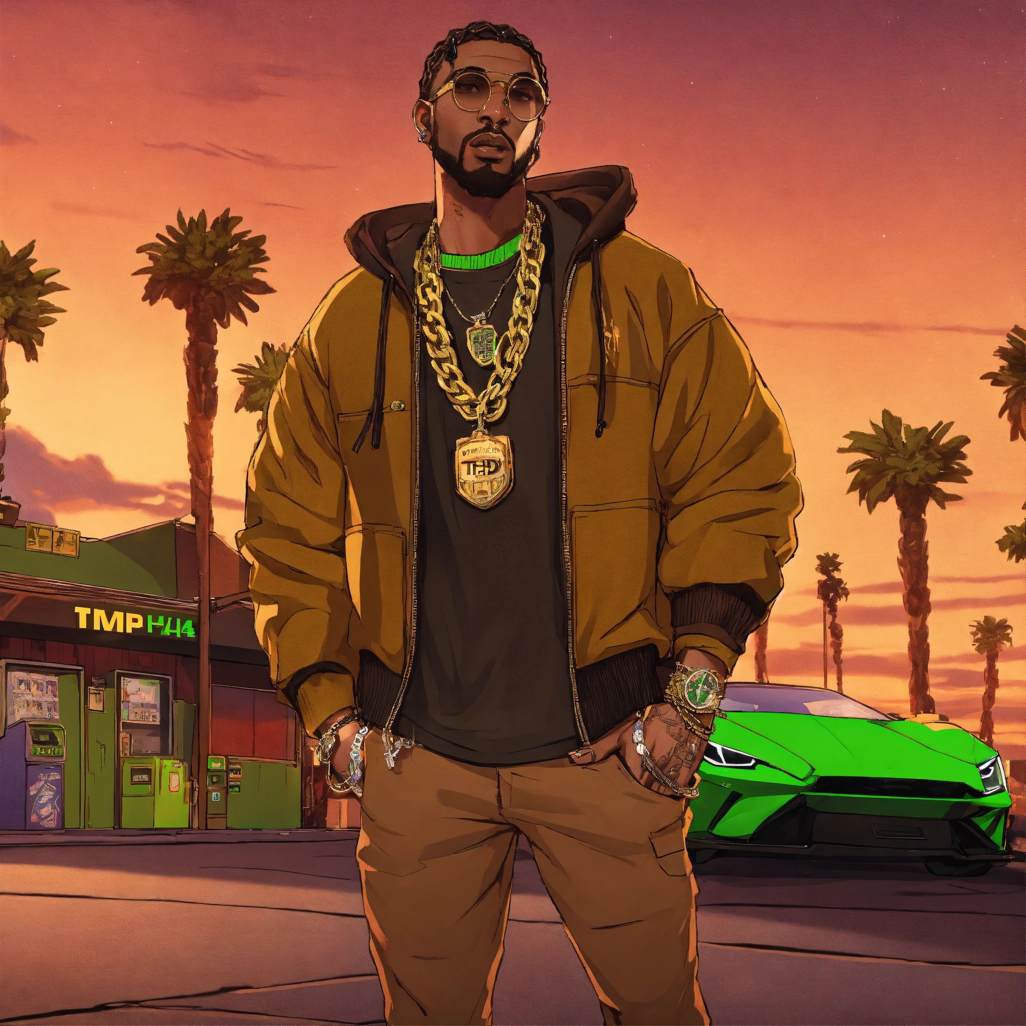 Hd, 4k, background is a gas station with luxury trap scene like grand theft auto in the background of trap rapper-type images (guns & bullets, cough syrup, cash, weed, people shooting dice, lime green lambo etc). rapper who is mexican light skin. he is wearing a fendi brown hoodie. he has 2 chains on. one chain has a pendant that says "tmh" and the other is a circle pendant. he is the rapper known as ramzydaplug. nose hoop ring in. dolce and gabana glasses. braided hair to chest. he has braided hair down to his stomach. black bread, but no mustache.