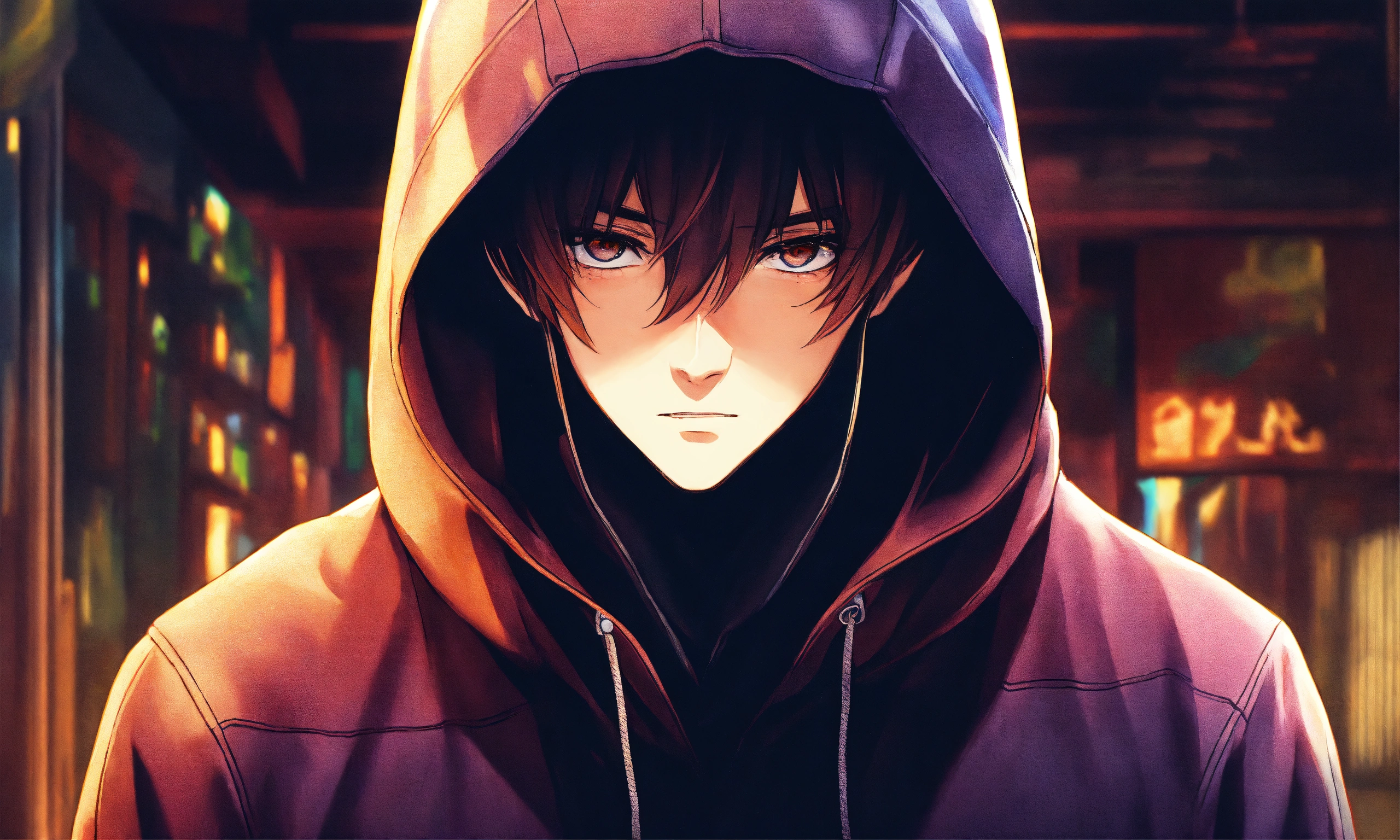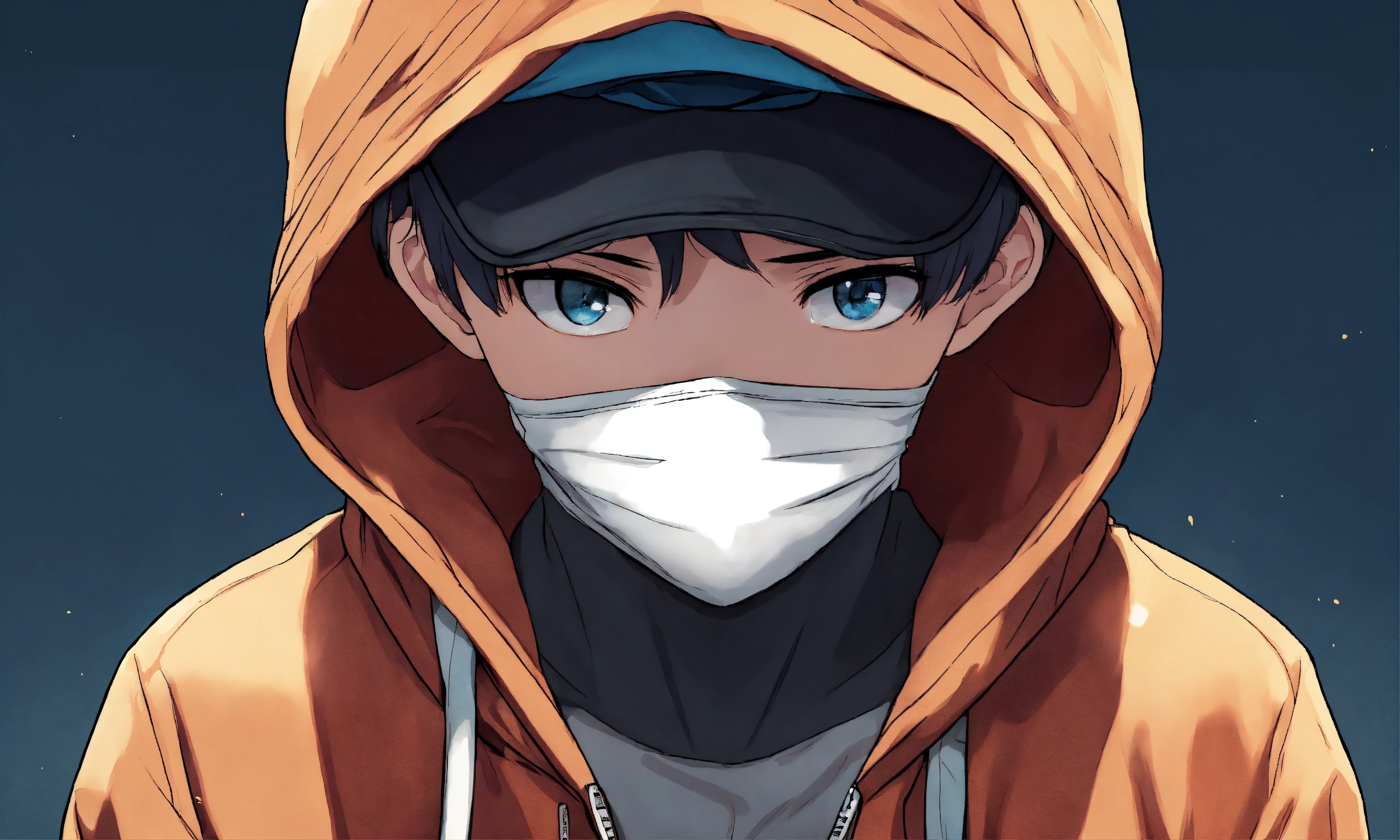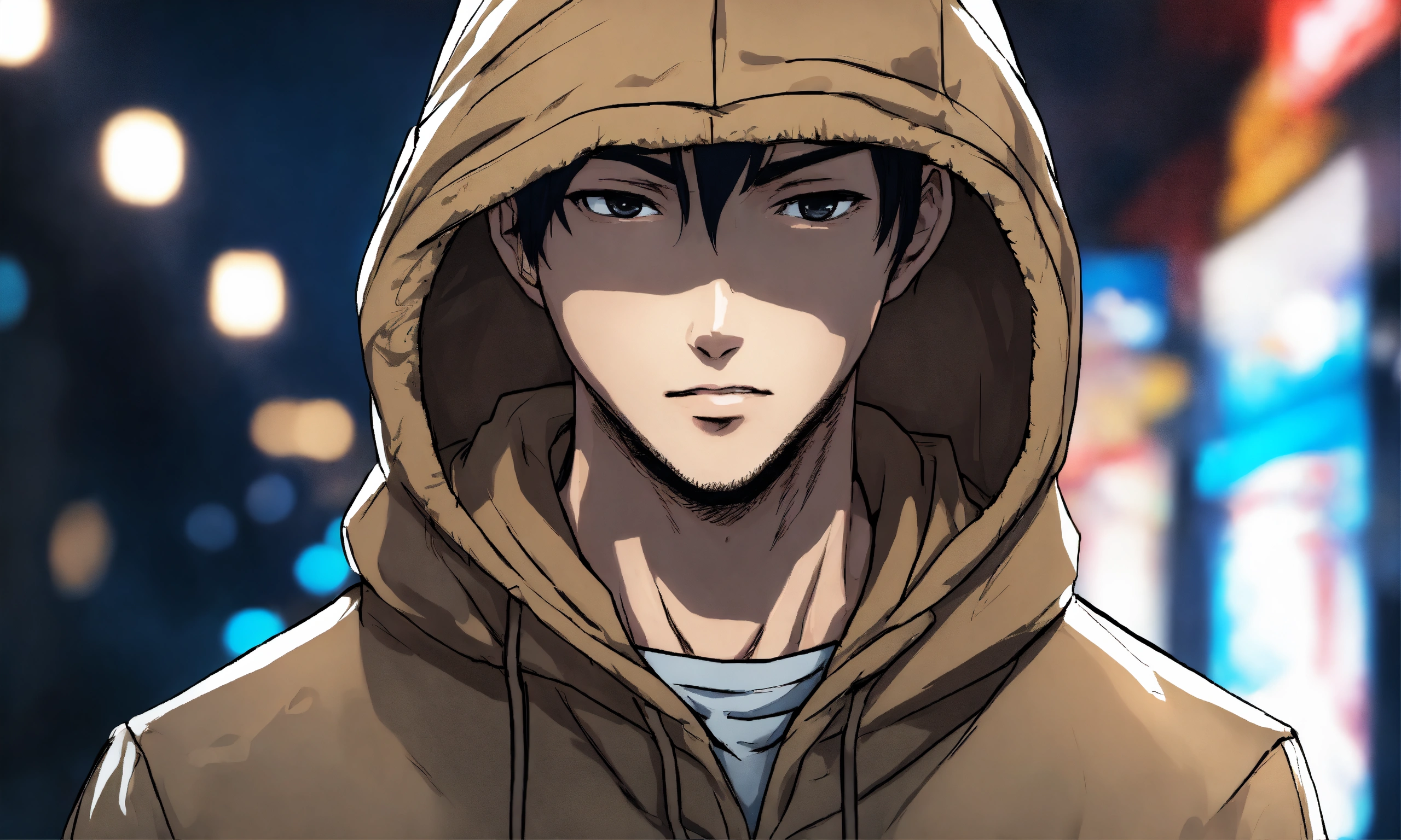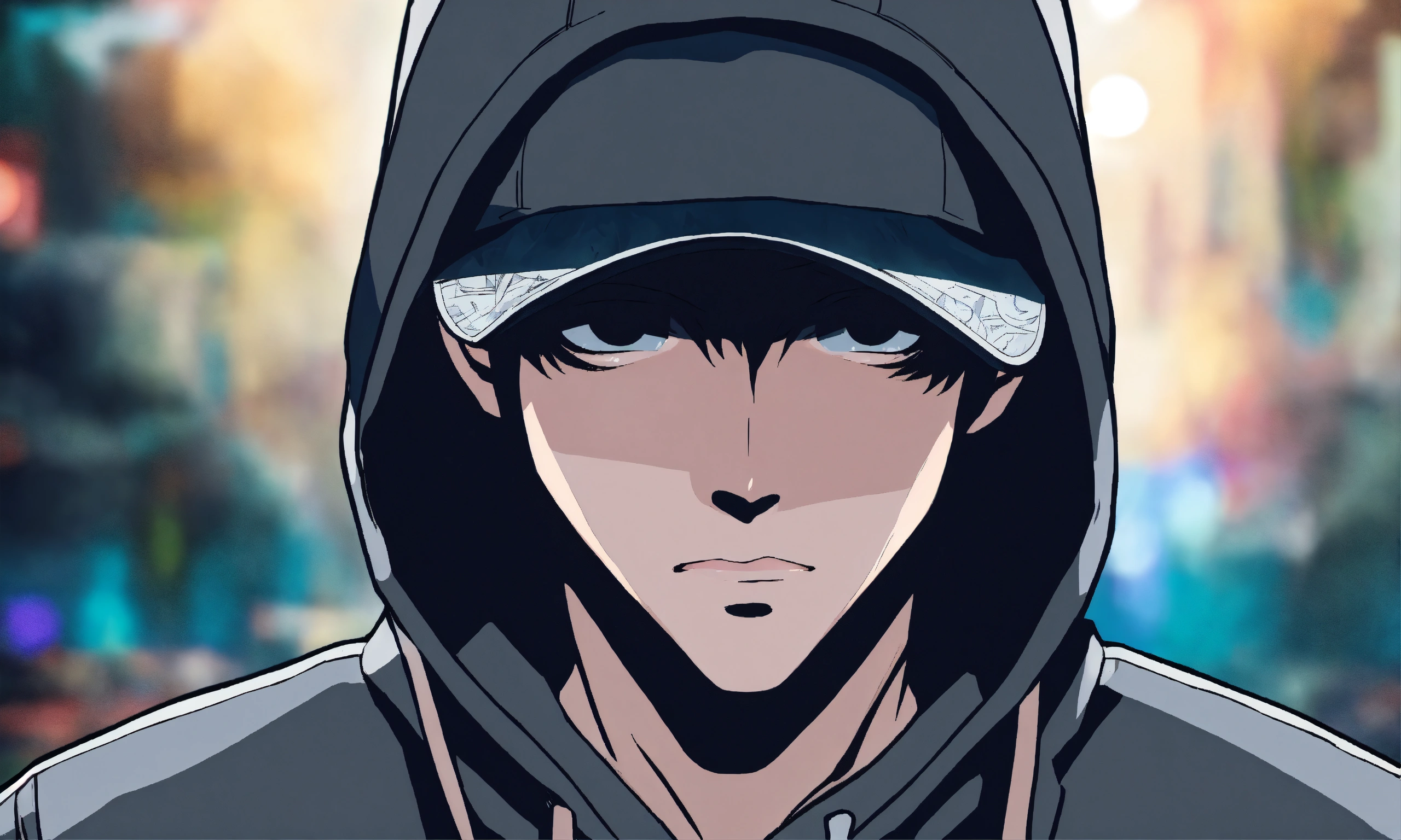 Man wearing hoodie and cap hiding upper face in anime manga style