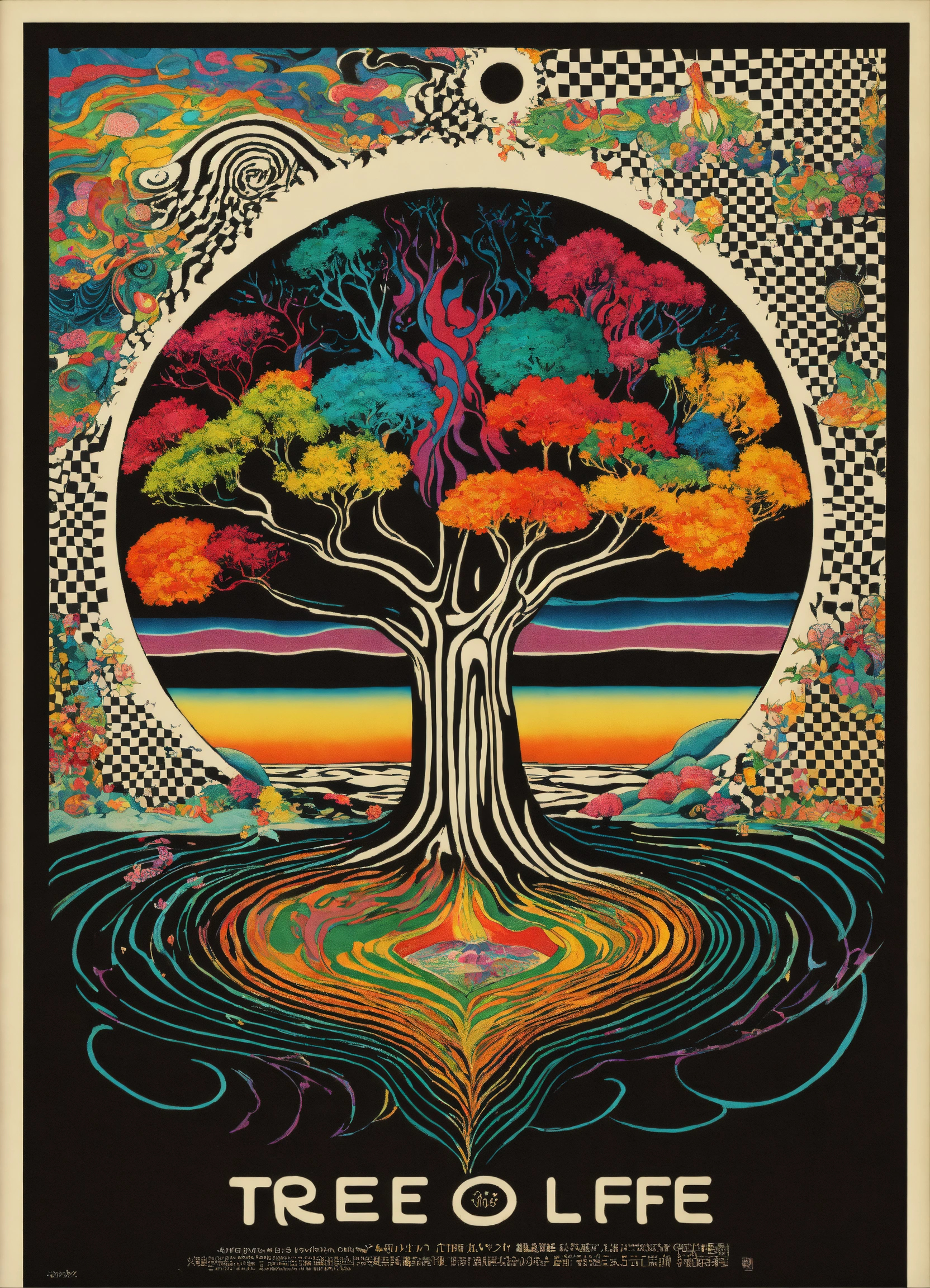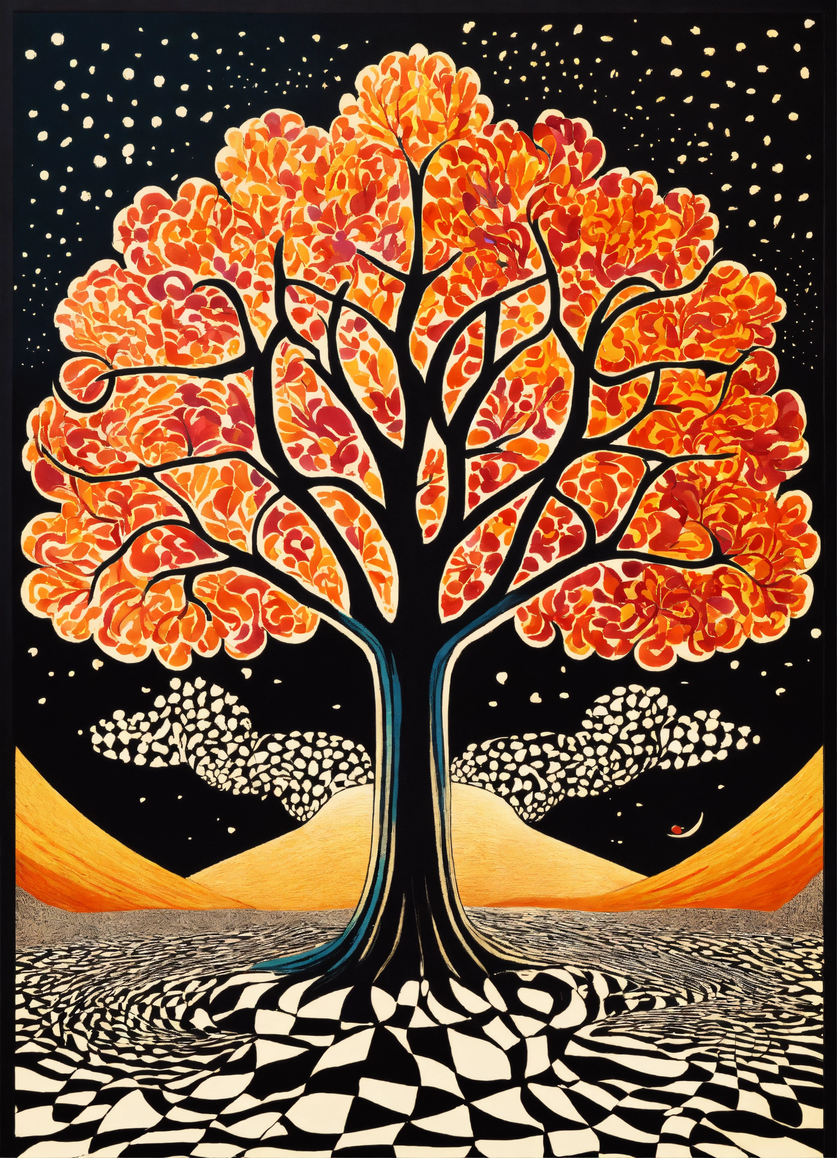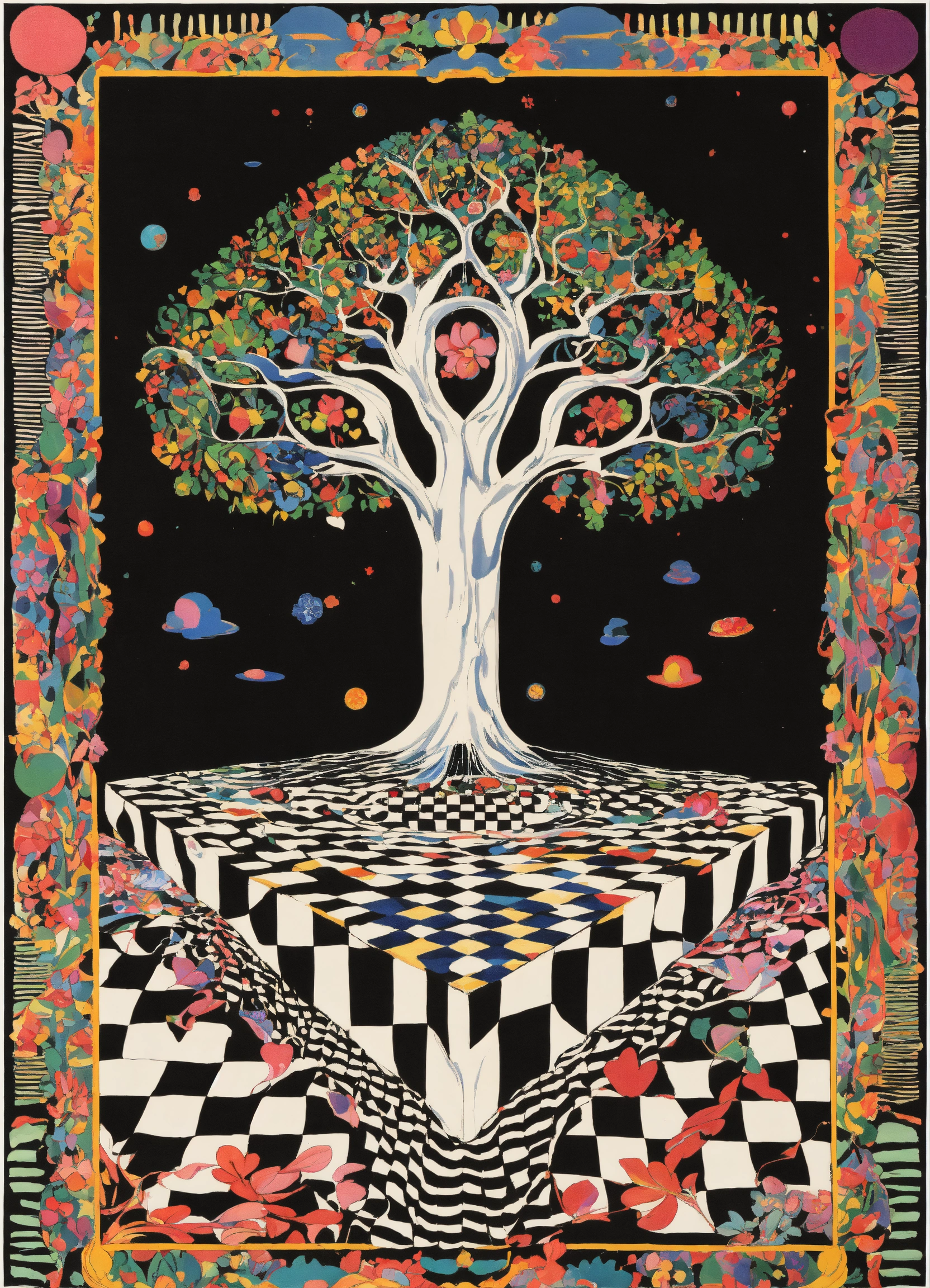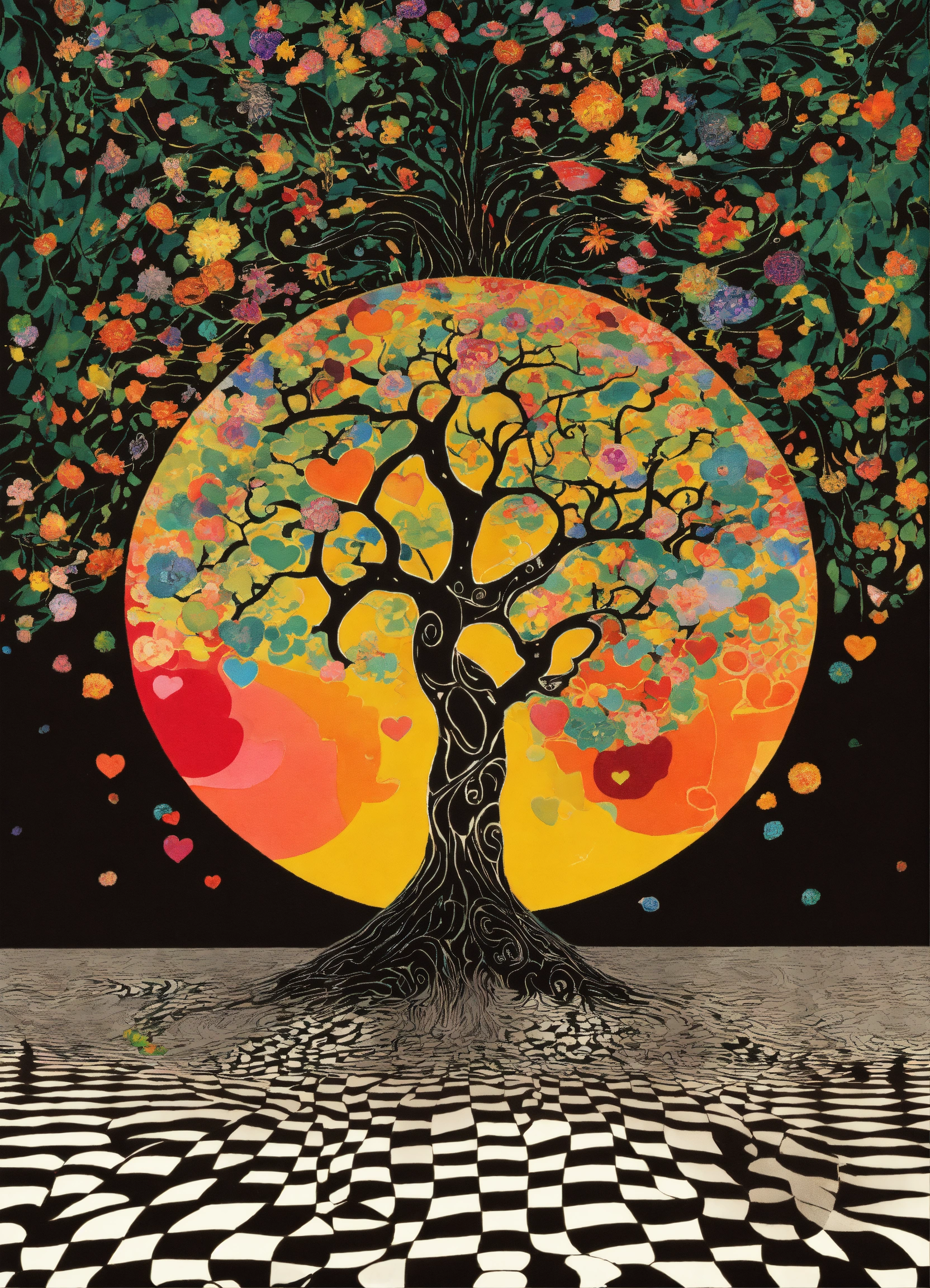 Japanese vintage retro poster, tree of life merging with love heart melting merging with oriental the most beautiful cosmos, coogi abstract psychedelic vortex background by henri matisse, human body containing symmetrical grid patterns, psychedelic patterns melting merging into dripping love-heart by coogi pattern mount, 5d outline, wavy dream dimension, chevron florescent geometrical clouds dripping, dense jungle melting into four corners of universe, black and white checkerboard patterns dripping by maurits cornelis escher
