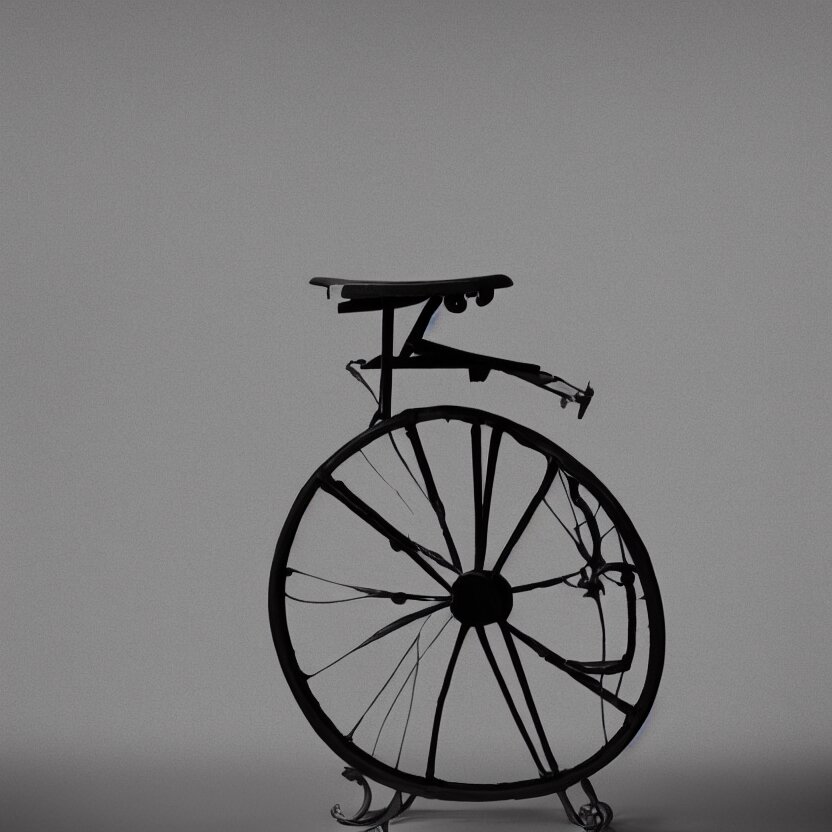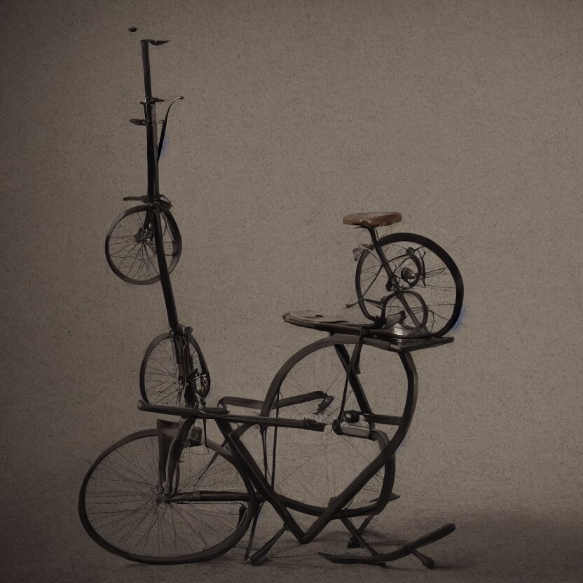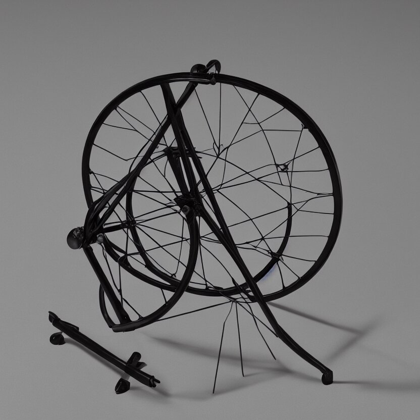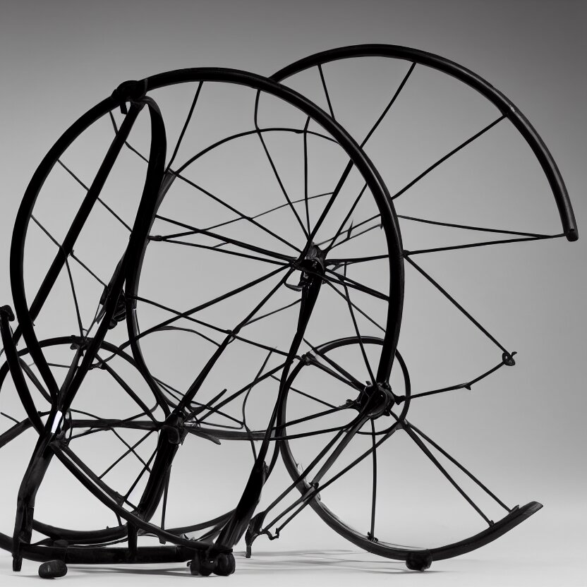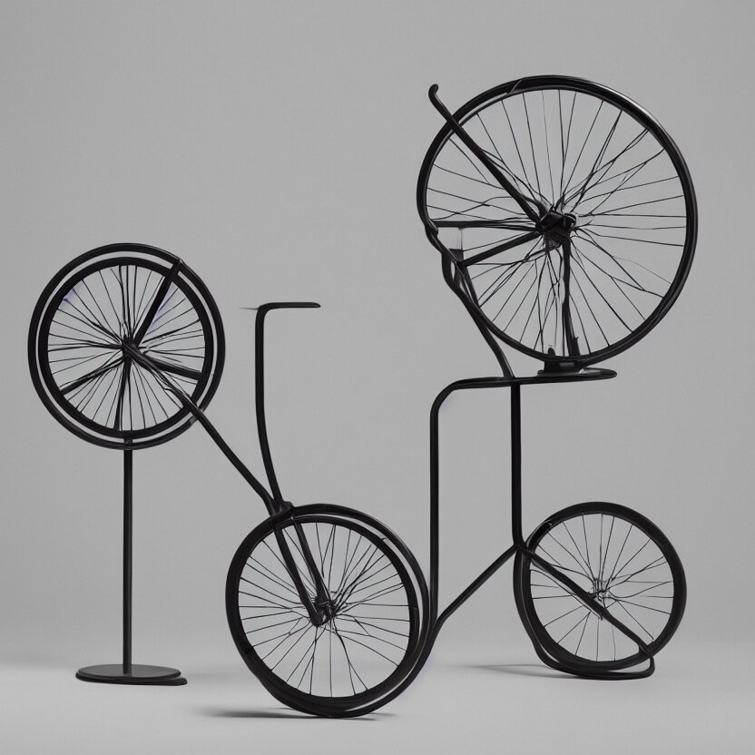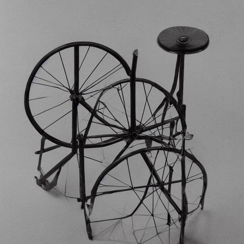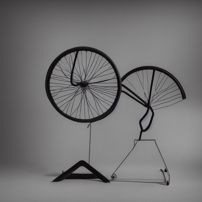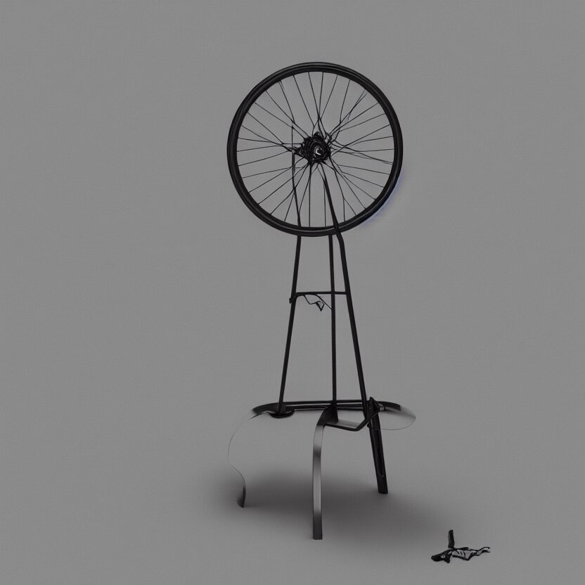 A single readymade object on a pedestal named roue de bicyclette, tabouret, banal but mysterious, by marcel duchamp, studio packshot, 4k, hyperdetailed