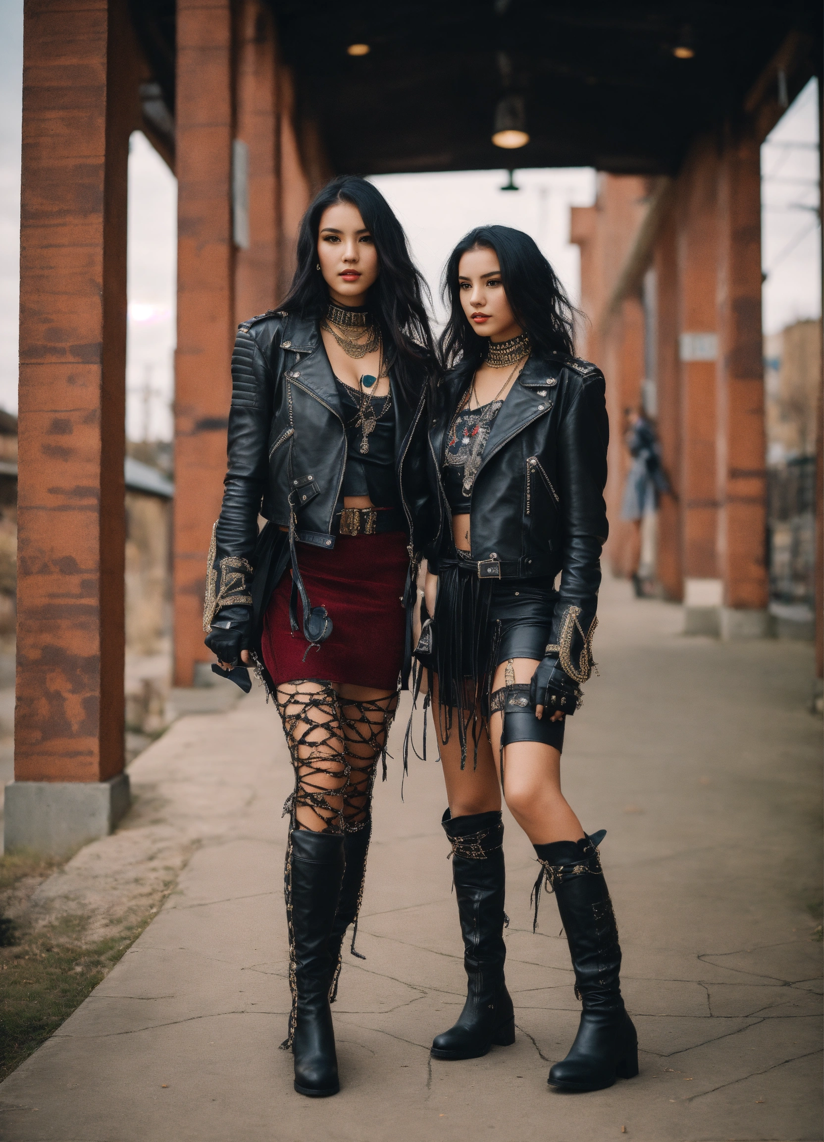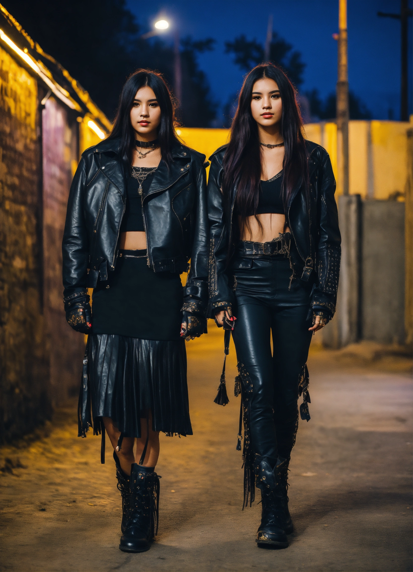 Two 20 year old native heavy metal girls wearing a black leather jacket and gloves and traditional dress, juwelry, urban enviroment full body walking