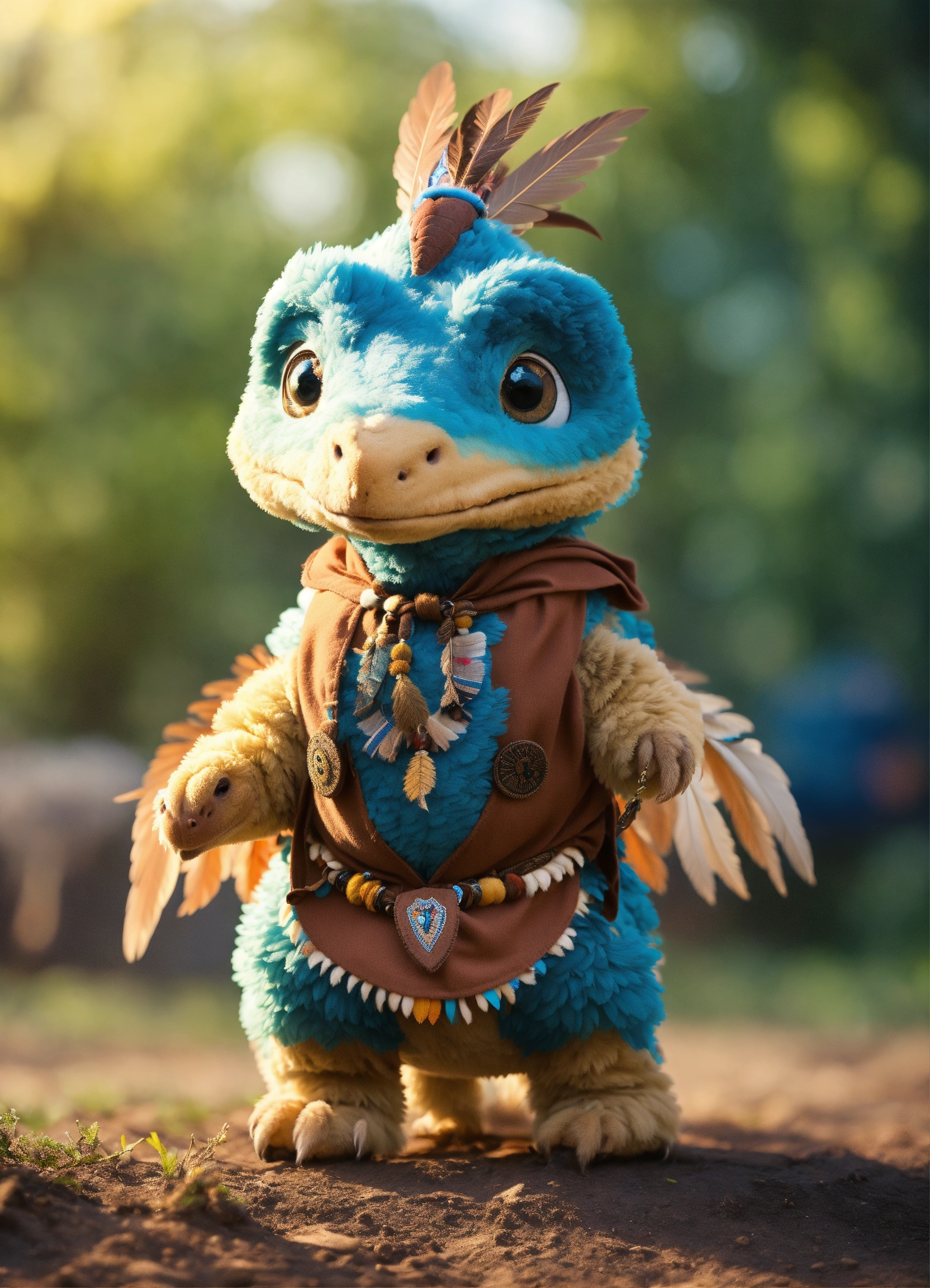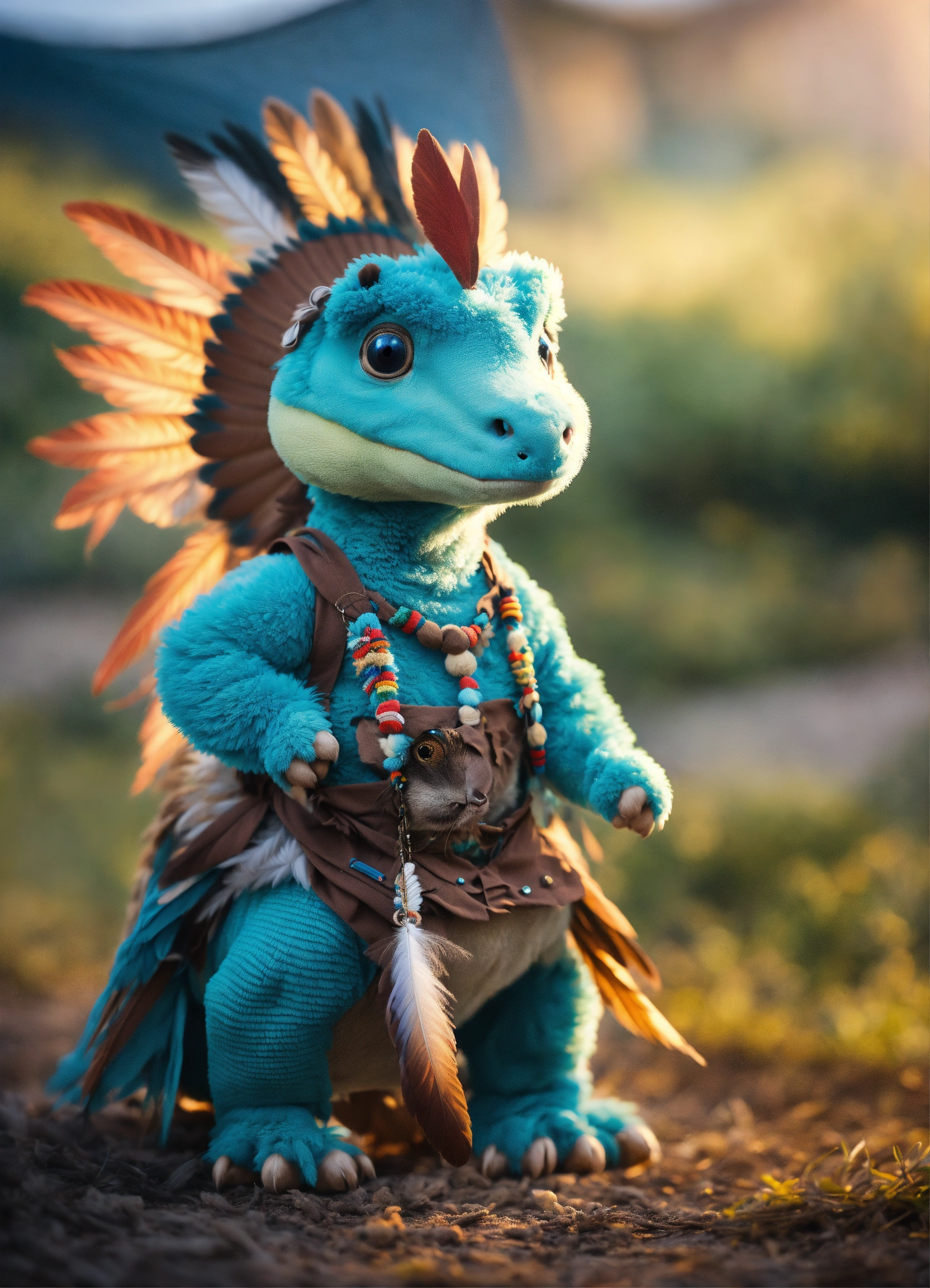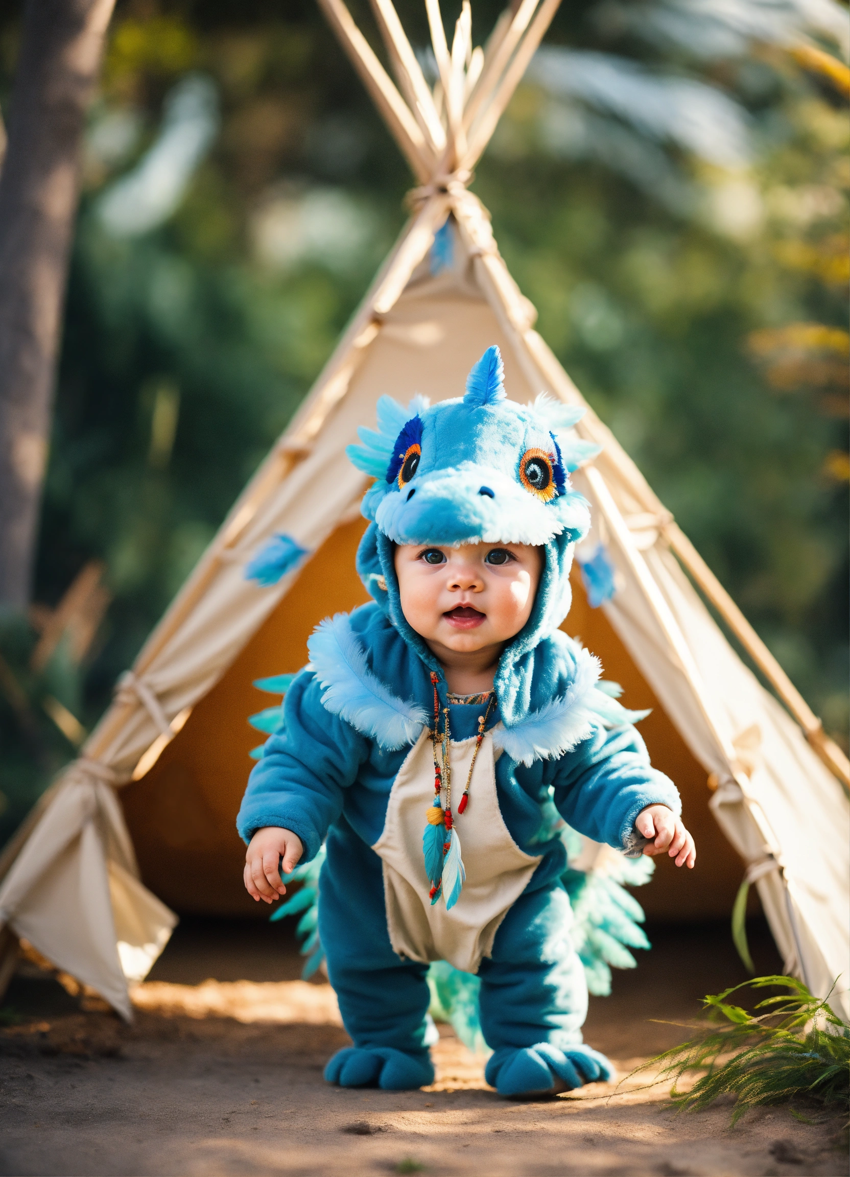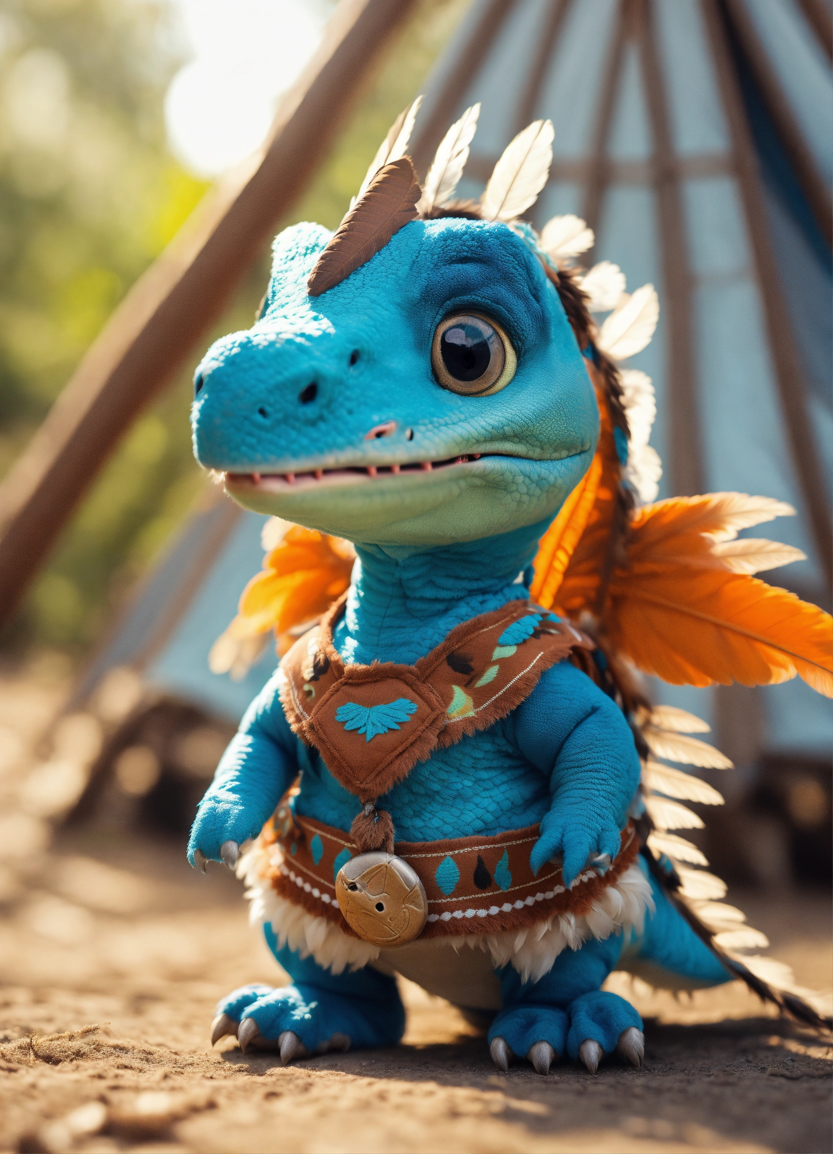 An adorable and fluffy baby dinosaur with big blue color eyes and indiana clothes, with soft feathers and wings flying, indian dress, native american theme, teepee, with blur background, high quality, 8k