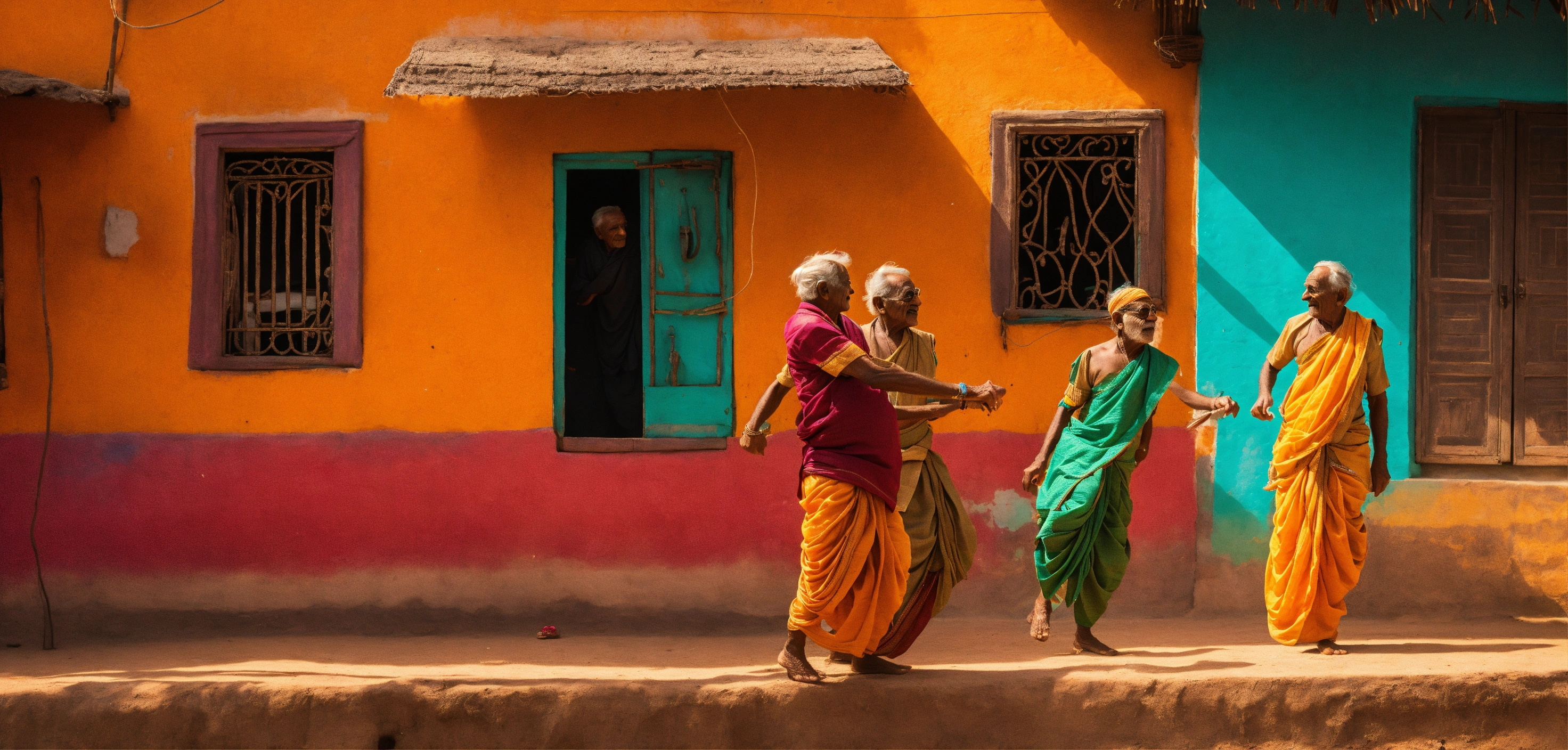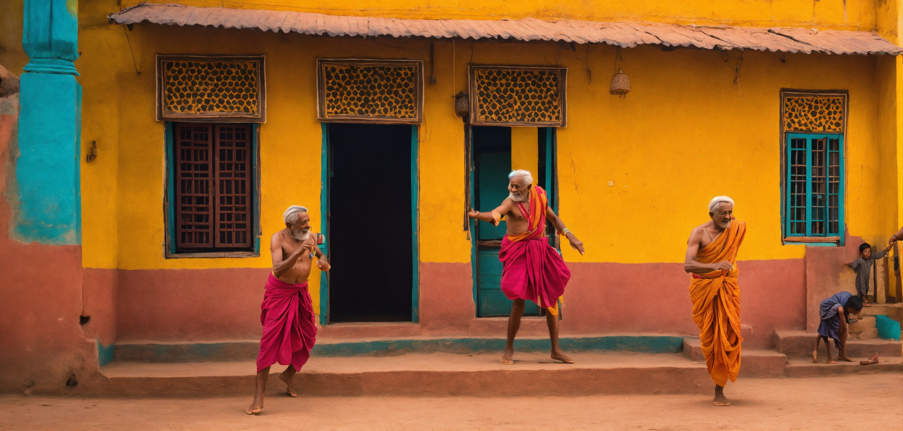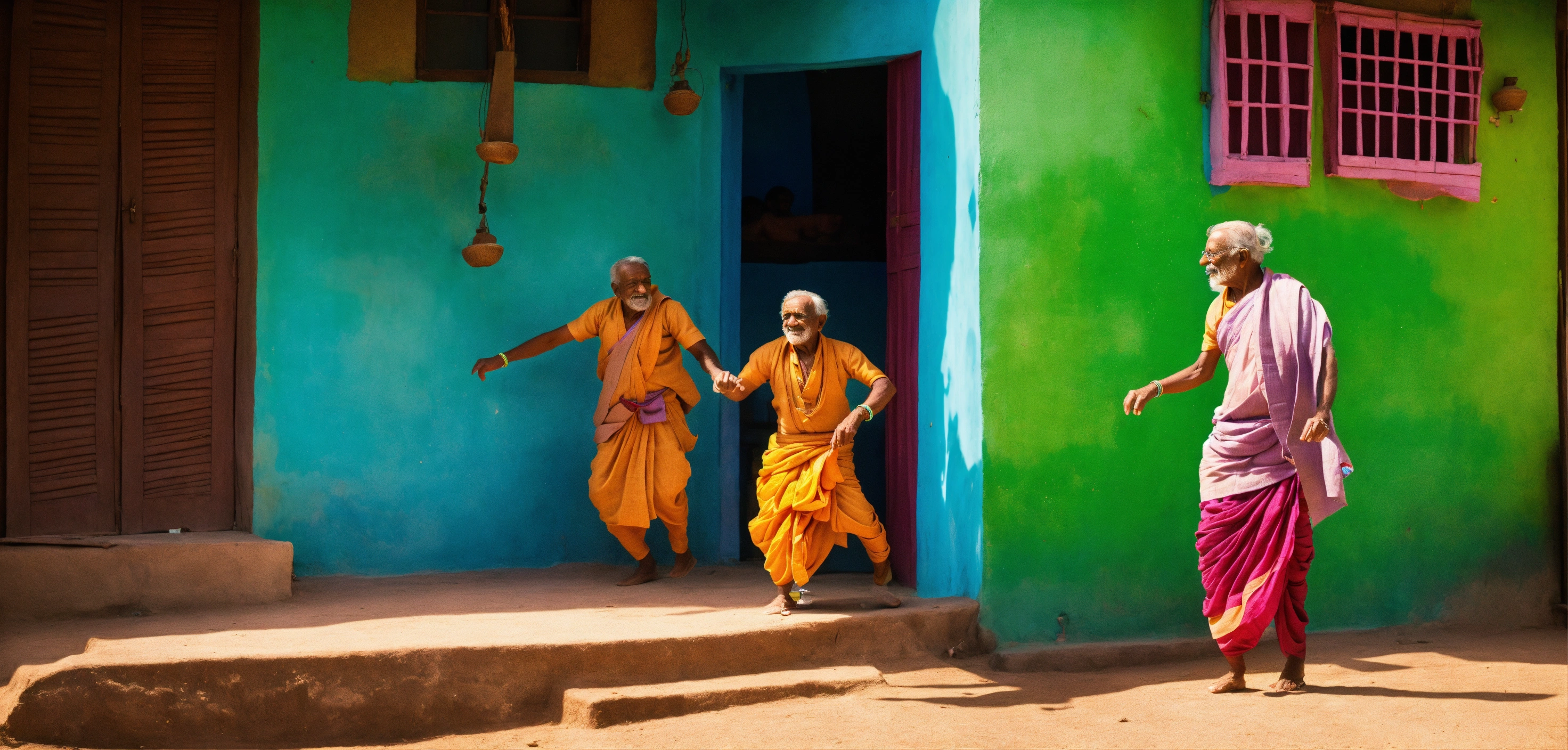3 kids playing on the left side of a house while an elderly blind man wearing a dhoti is dancing with vibrant colors